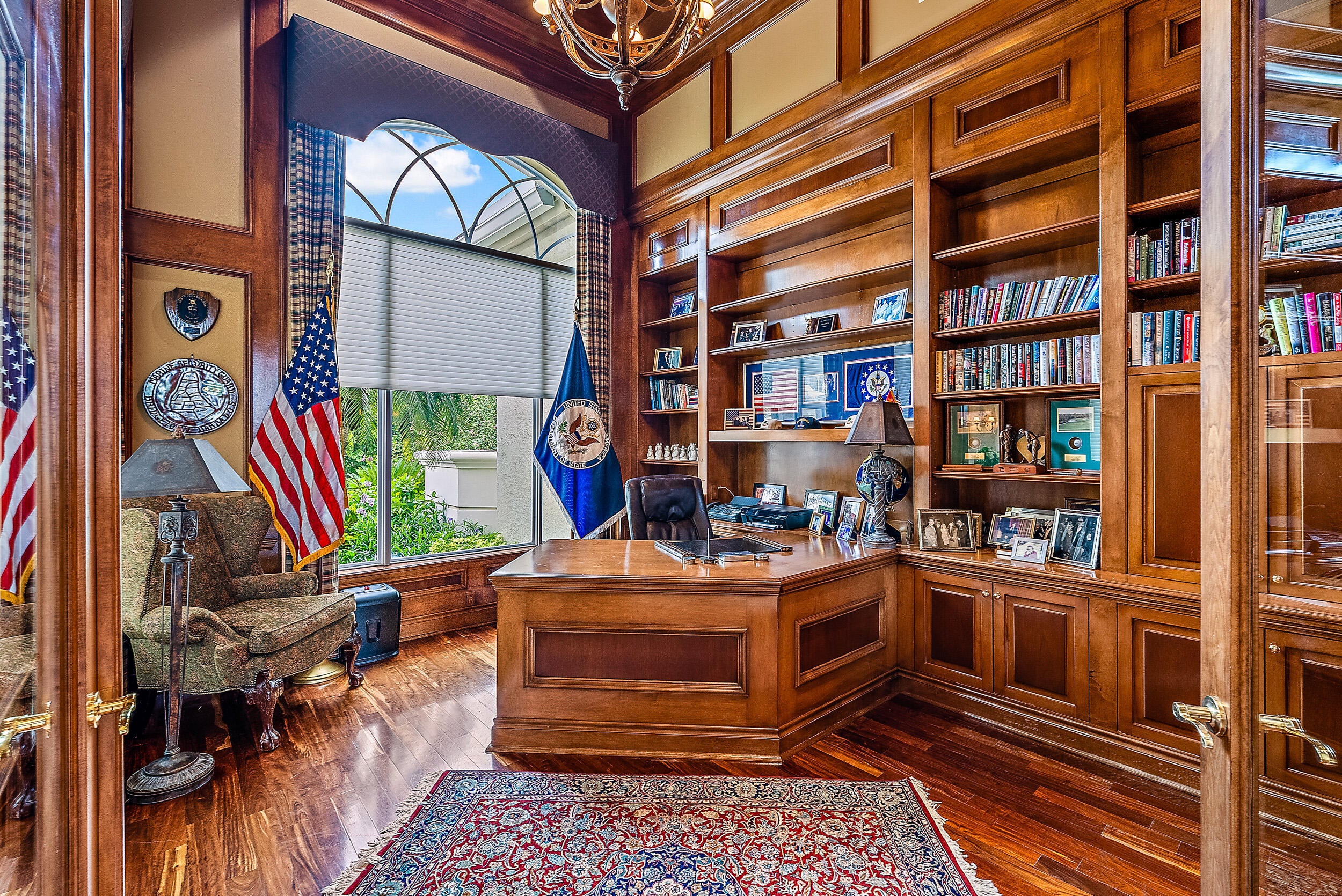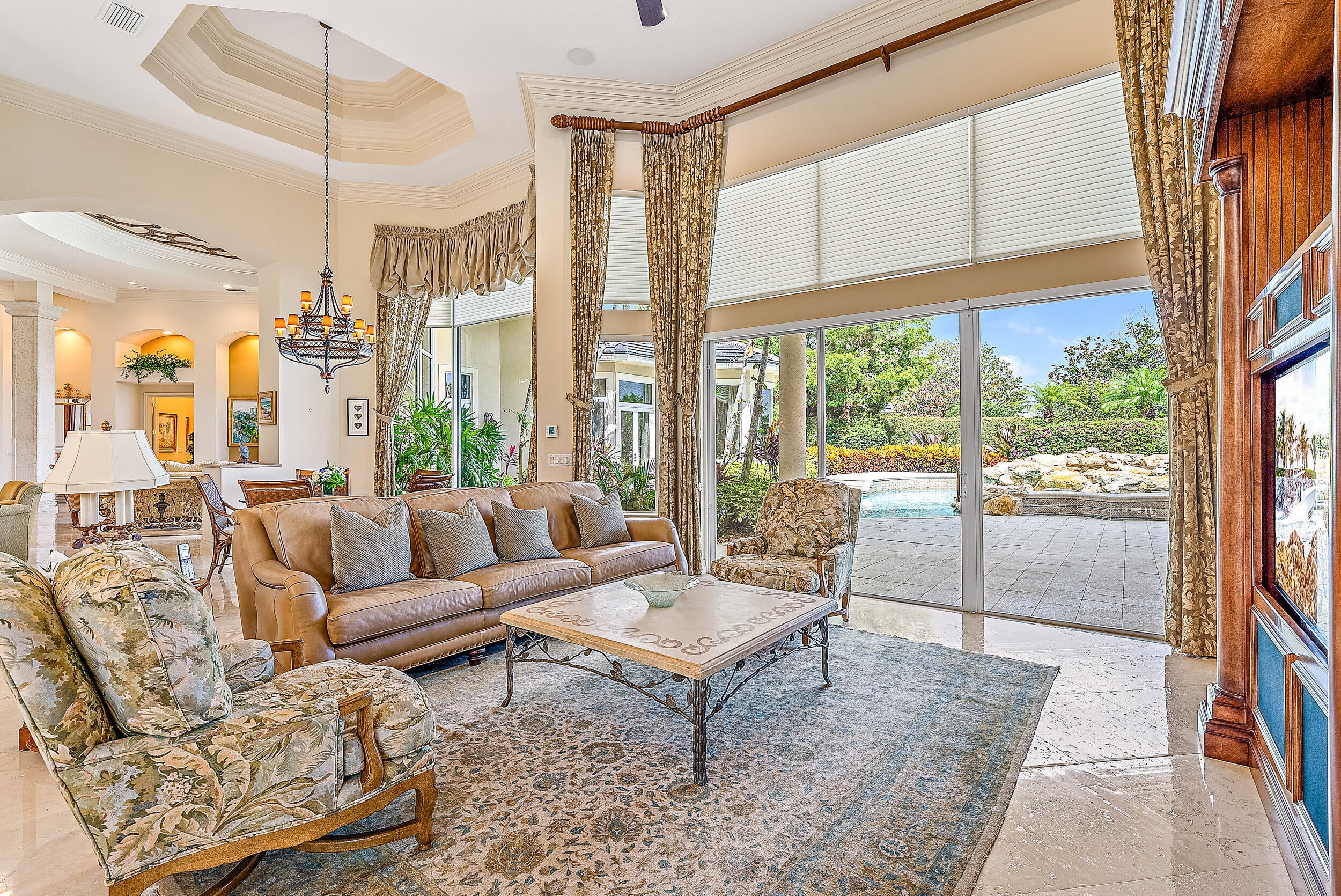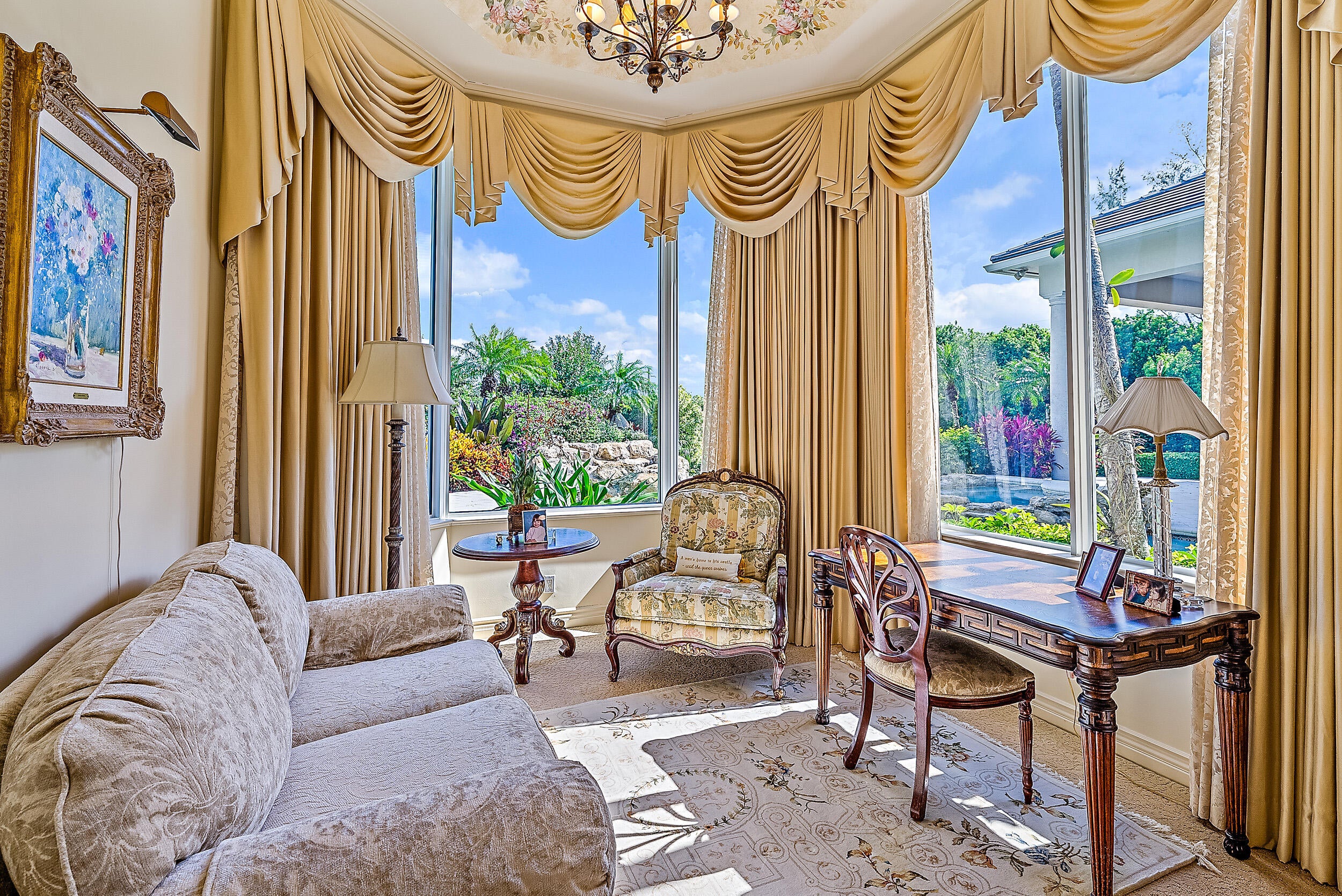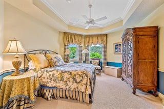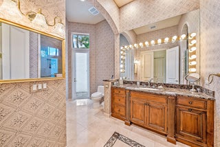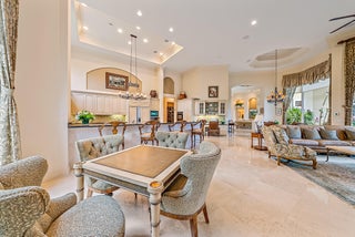 Situated on Intracoastal Terrace in a unique private setting, this home offers a new family endless opportunity. Every option for entertaining family and friends can be accommodated in this fabulous enclave. With more than 7,700 sq. ft. under air there is space for the largest of family gatherings and reunions. The ground level offers three ensuite bedrooms. The primary suite is an oasis of tranquility, tucked away in its own wing. Presenting a lovely sitting room, his and her baths and enchanting views of the gardens and pool. Two very large walk-in closets complete the suite. The common space, formal living room, family room and dining room boast light-filled rooms and sparkling views.A large richly paneled library is perfect for reading a book, paying the bills or watching golf. Two additional ensuite bedrooms are located on the second level for a total of five ensuite bedrooms. A large three car garage and expansive storage make this home complete. All this just a short golf cart ride to the first tee, fitness center and practice tee. Come home to the Jupiter Hills lifestyle!