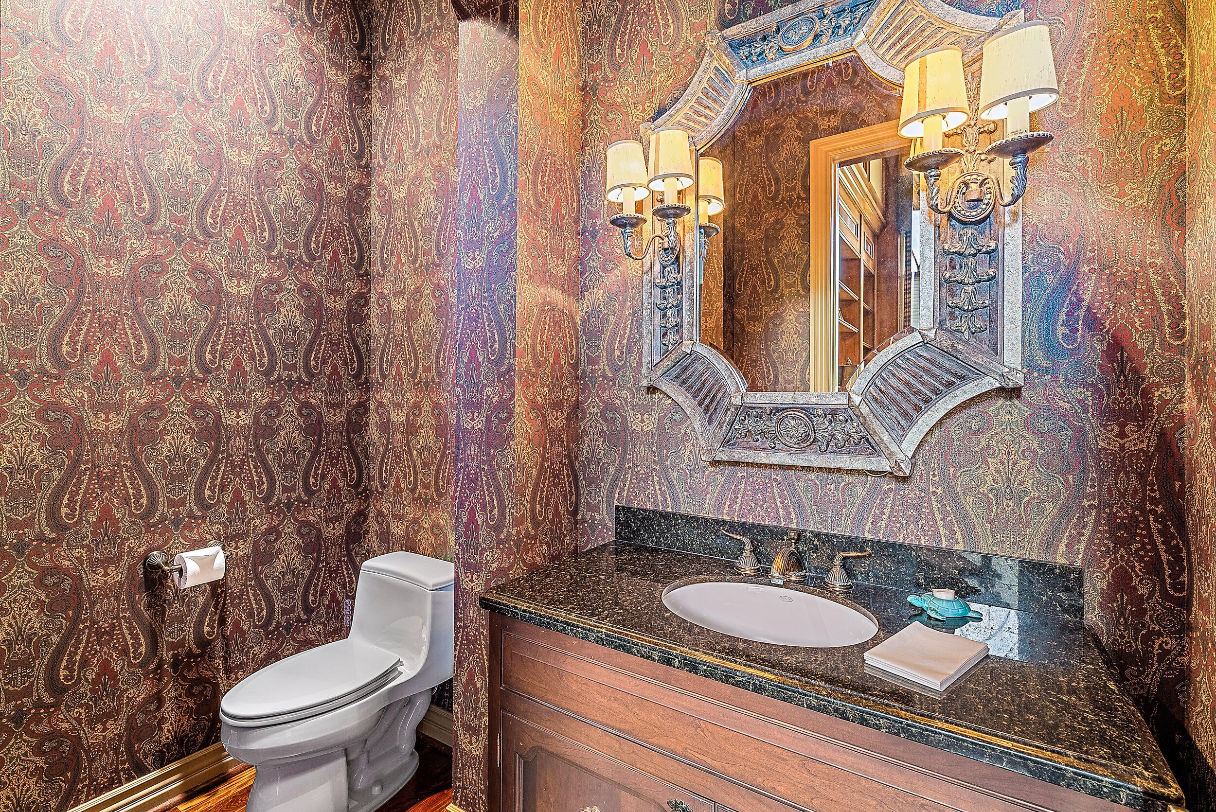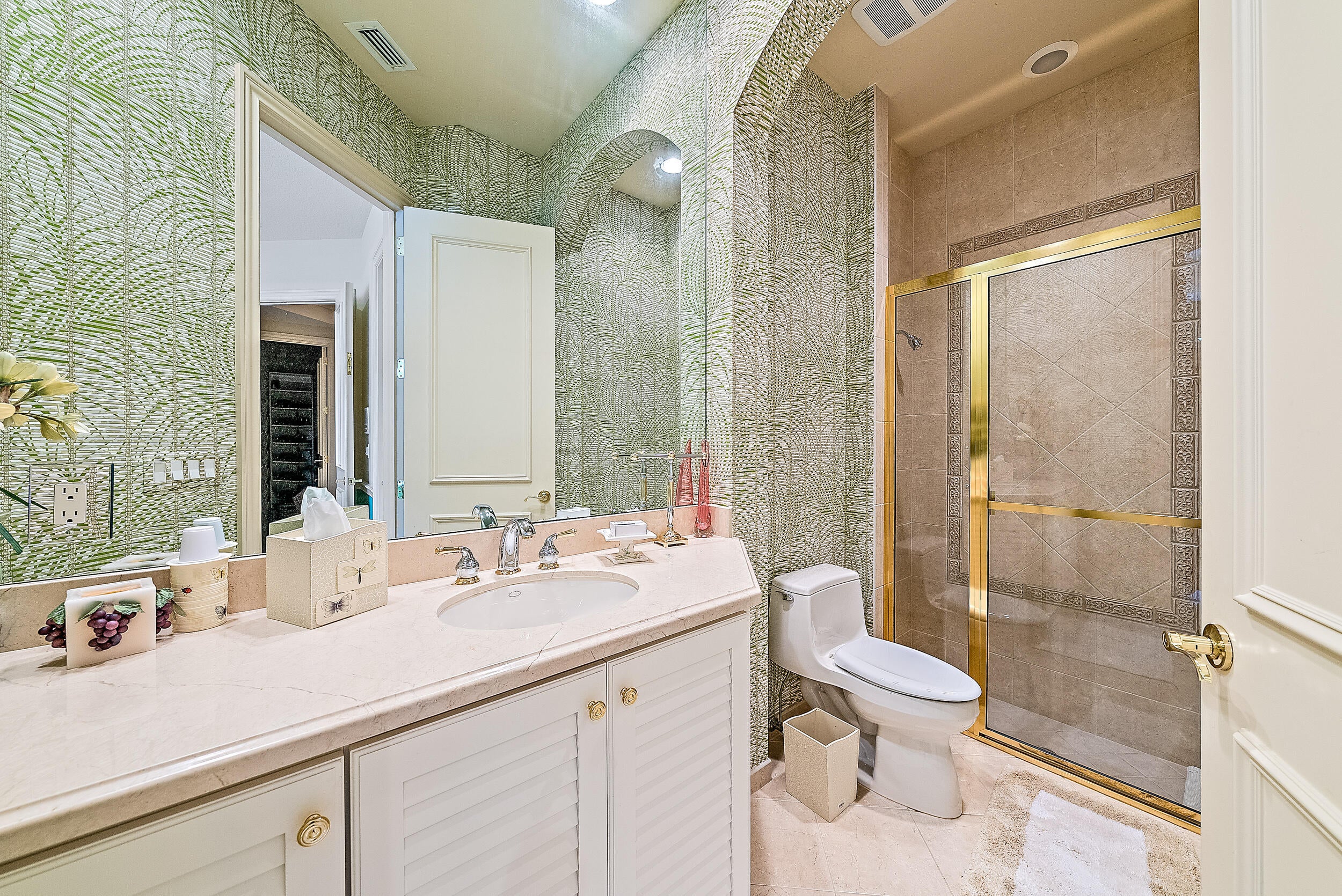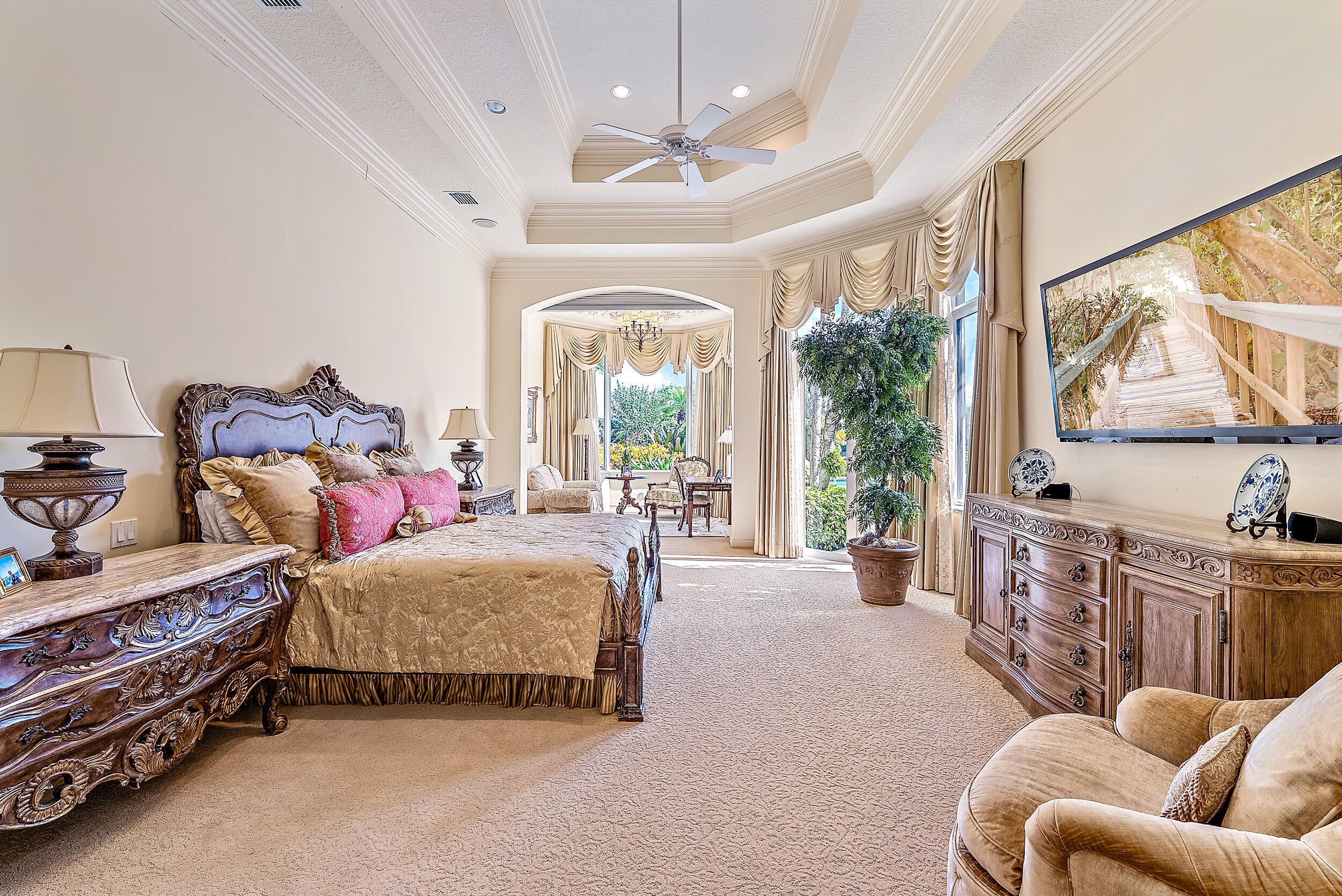 Situated on Intracoastal Terrace in a unique private setting, this home offers a new family endless opportunity. Every option for entertaining family and friends can be accommodated in this fabulous enclave. With more than 7,700 sq. ft. under air there is space for the largest of family gatherings and reunions. The ground level offers three ensuite bedrooms. The primary suite is an oasis of tranquility, tucked away in its own wing. Presenting a lovely sitting room, his and her baths and enchanting views of the gardens and pool. Two very large walk-in closets complete the suite. The common space, formal living room, family room and dining room boast light-filled rooms and sparkling views.A large richly paneled library is perfect for reading a book, paying the bills or watching golf. Two additional ensuite bedrooms are located on the second level for a total of five ensuite bedrooms. A large three car garage and expansive storage make this home complete. All this just a short golf cart ride to the first tee, fitness center and practice tee. Come home to the Jupiter Hills lifestyle!
