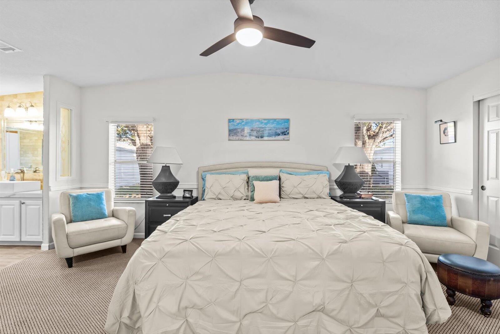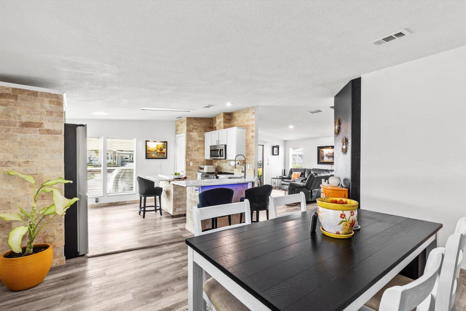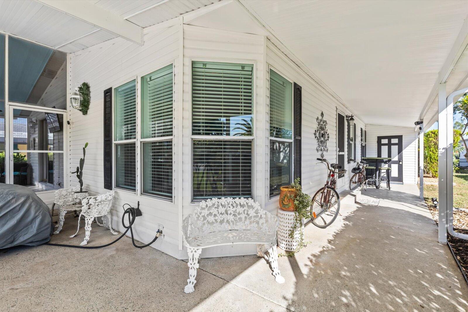 This Jacobsen built beautifully fully furnished, move-in-ready home offers the perfect blend of comfort, style, and functionality. Featuring 2 spacious BR's, 2 BA's, and a versatile den/office (or 3rd bedroom), it's ideal for guests or remote work. Custom stone and tile work throughout adds elegance and charm. Enjoy an eat-in kitchen, plus a formal dining room for entertaining. The large primary suite boasts an ensuite with dual sinks and a walk-in shower. The two-car carport and large storage shed provide ample space for your vehicles and belongings and the lushly landscaped yard and tropical greenery create a serene, private retreat. This tastefully updated home has a 2025 roof, 2023 A/C & HWH and is ready for you to move in and start enjoying the Savanna Club lifestyle.