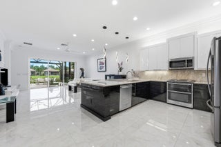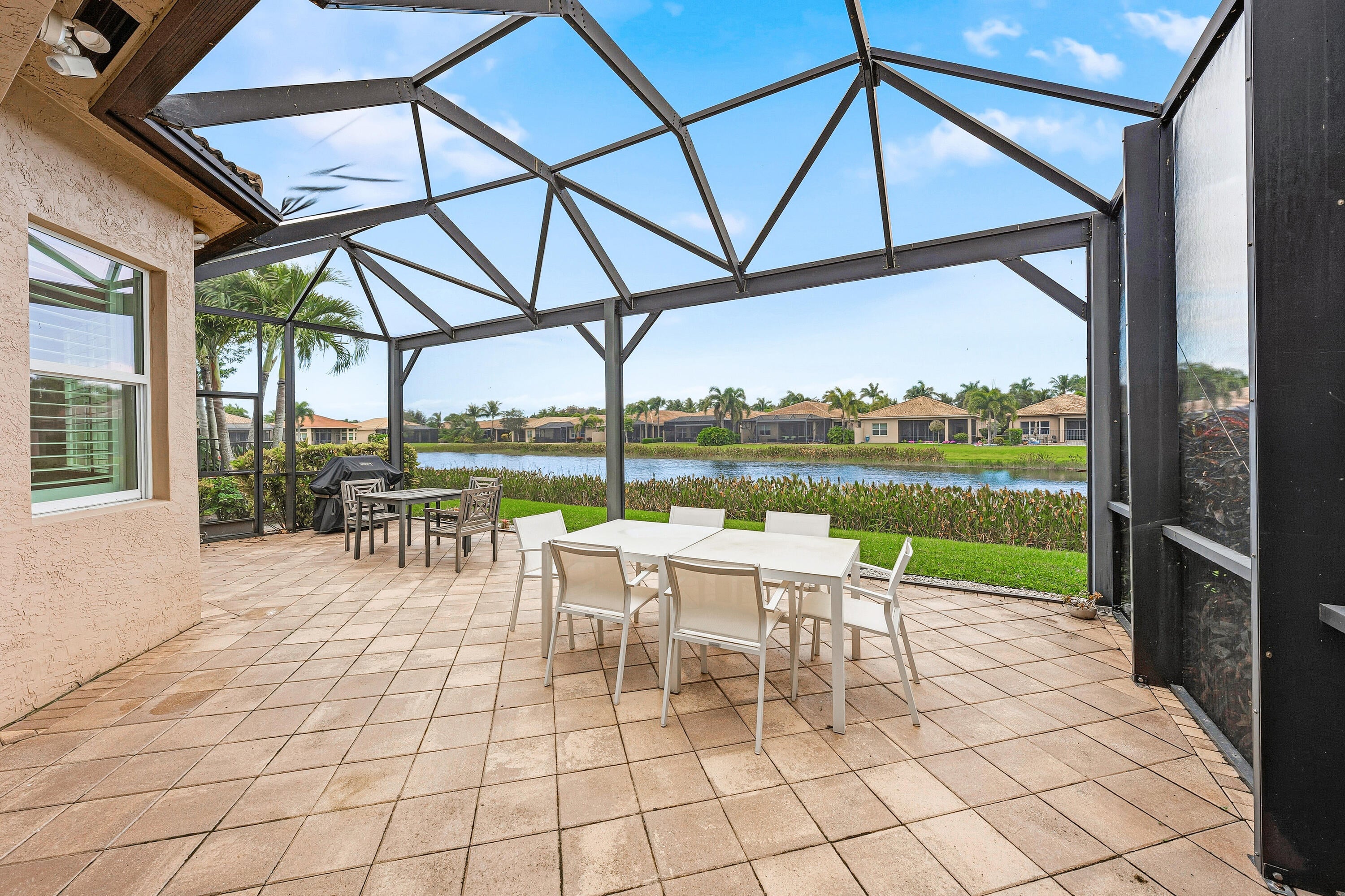 This beautifully appointed home (2/2+den) sits on a lakefront lot. Features include lush landscaping w/lighting, impact windows, decorative glass entry door, porcelain floors, wood look tile plank floors in bedrooms, crown moldings, built-in closets, LED hi-hats, designer light fixtures, plantation shutters, fans, upgraded baths & more! Gourmet kitchen with sleek European cabinetry, marble countertops with full height backsplash and all the bells & whistles! There is a large counter height breakfast bar with pendant lights and a formal dining room. Large primary suite with luxurious bath. The den has etched glass double doors and a custom built-in desk unit. The covered area of extended rear patio has screen with remote. You'll love the ''birdcage'' with picture frame screen & lake views.Valencia Cove is a premier 55+ lifestyle community featuring a spectacular 39,000 square-foot clubhouse and 10 acre outdoor recreational facility. Endless activities and opportunities for fun abound - there are activities, trips, shows, and clubs of all types. The clubhouse features an expansive foyer and lobby, grand ballroom with raised stage and dance floor, four spacious card rooms, Cafe with indoor/outdoor seating, Arts and crafts room with kiln, Internet/Billiards room, Office, Catering kitchen with separate demonstration cooking studio, Yoga & exercise studio with ping pong, fully equipped fitness center and men's and women's locker rooms with steam rooms, massage room and showers. There are four pools - a beautiful Resort-style pool and Shade Pavilions, Lap pool with Swimmers' Lap Lanes, Resistance walking pool, Grandchildren's wading pool, and an Outdoor whirlpool spa. There are eight har-tru tennis courts with shade pavilions and lighting for night play, tennis pro shop, tennis pro, league play, six pickleball courts, pickleball pro, league play, 2 bocce courts, league play, half-court basketball and walking/jogging/biking paths throughout and just outside the community. Valencia Cove is conveniently located near shopping, restaurants, houses of worship and major highways!