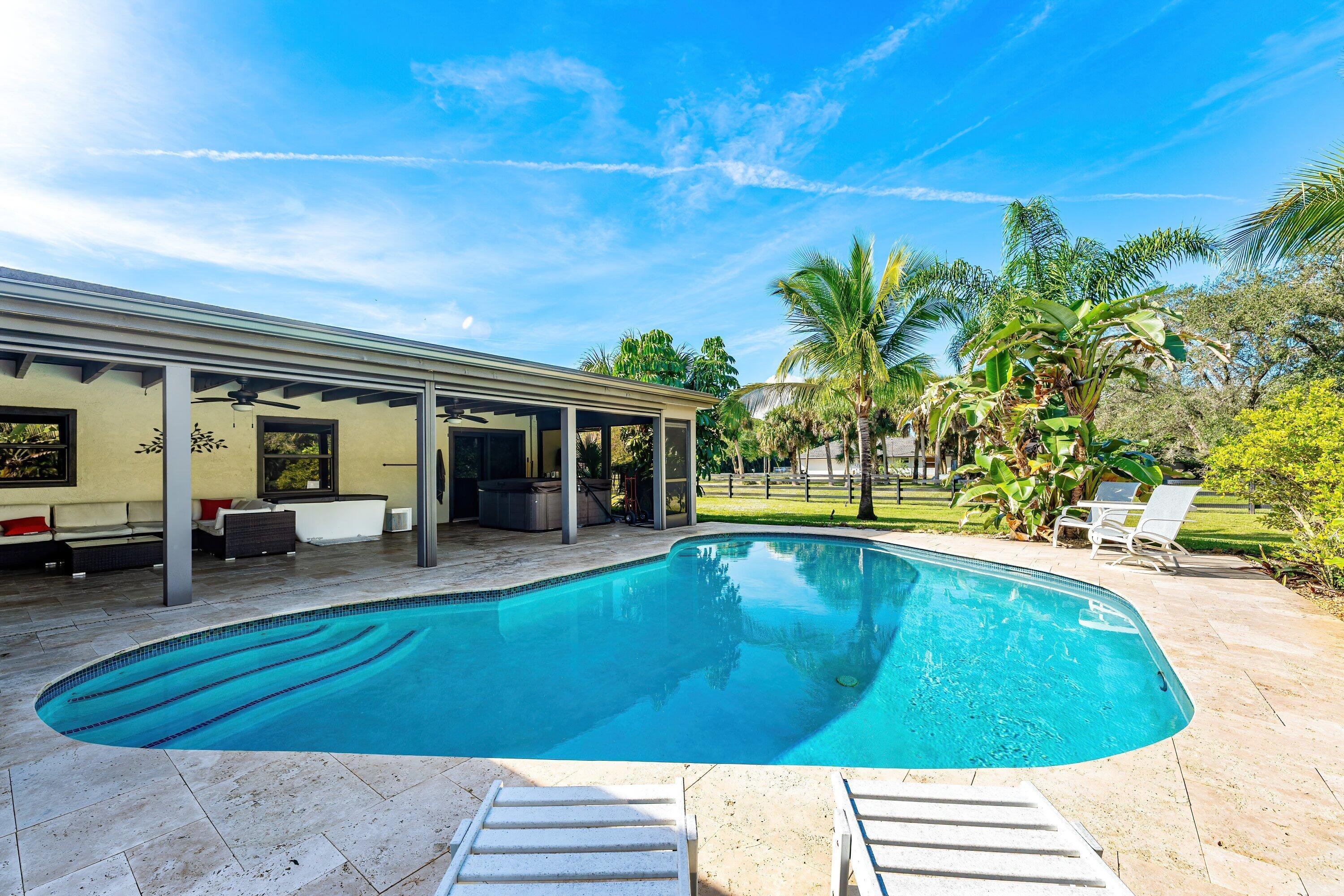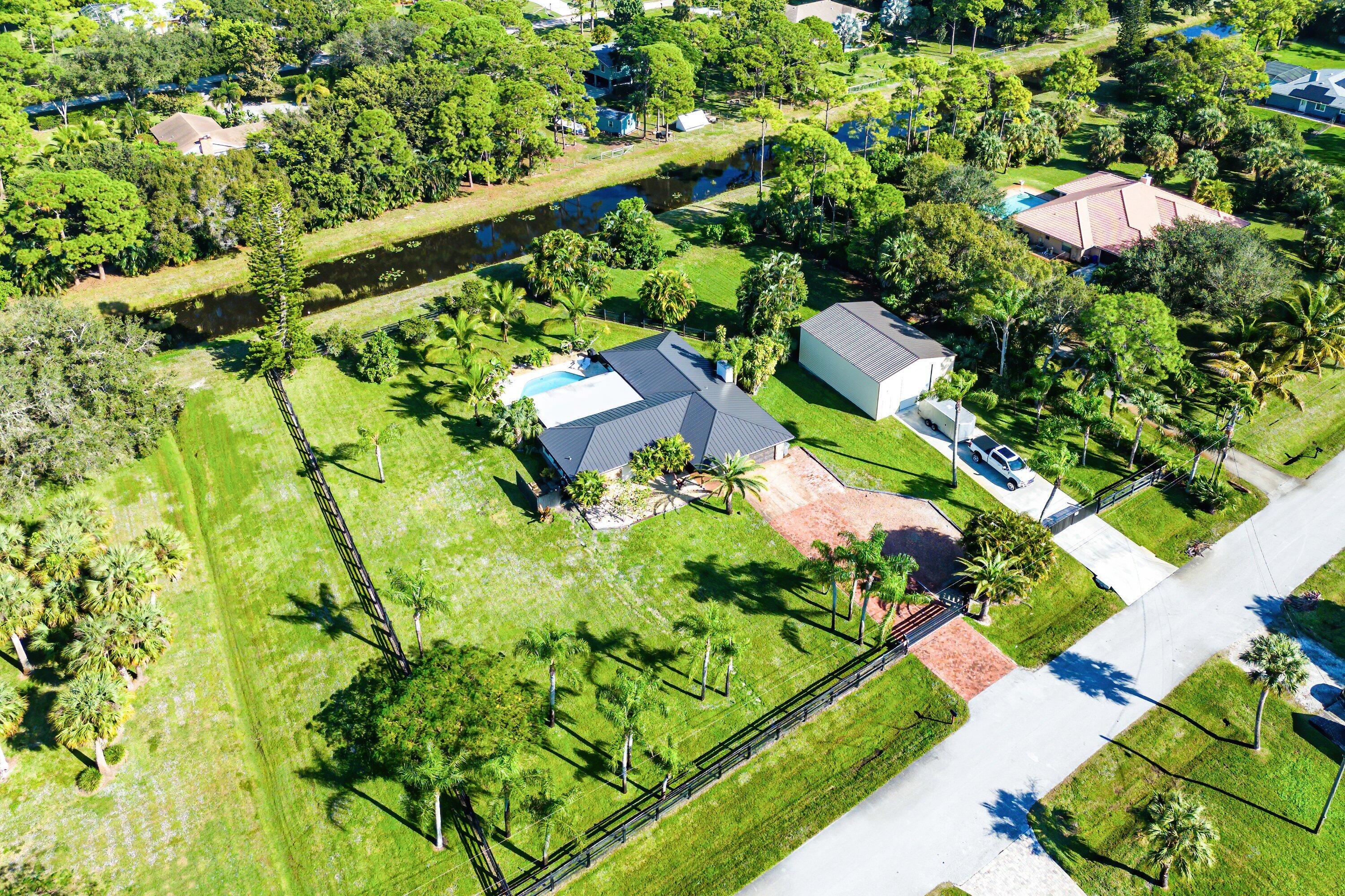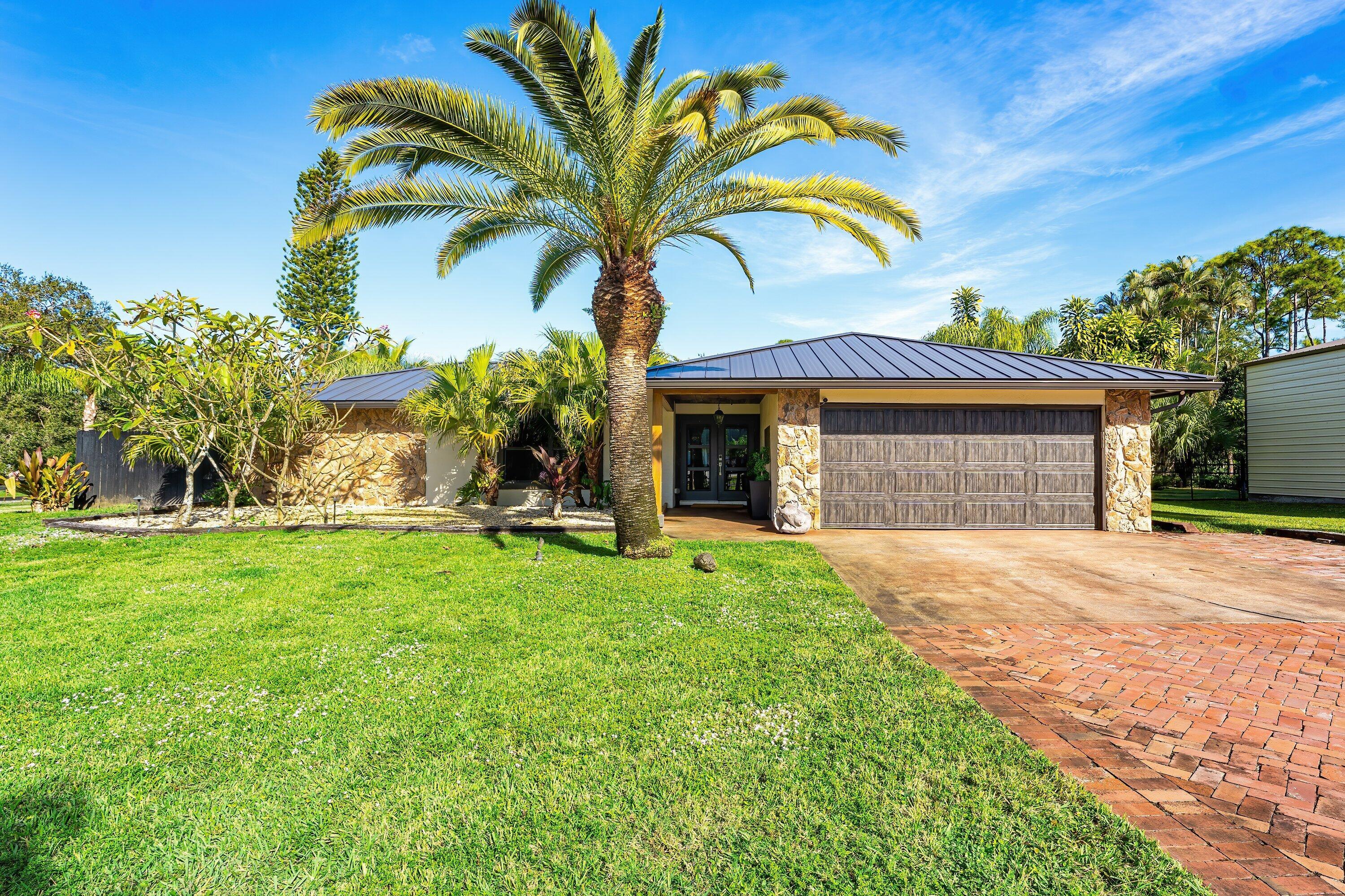 A truly rare front-section gem in one of Palm Beach Gardens' most coveted communities -- where peace, privacy, and prestige all meet. This single-story masterpiece sits on nearly an acre and a half of fully fenced, beautifully landscaped grounds with lush tropical gardens, fruit trees, and hard-wired landscape lighting that transforms the property at night. Highlights: 4 Bedrooms | 2 Baths | Office/Flex Room New 2022 Metal Roof + Full Impact Windows & DoorsCity Water, Paved Roads, Prime Front-Section Location,Spray-Foam Insulation for maximum energy efficiency,2021 Saltwater Pool with new paver deck & custom landscape lighting, 2024 1,200 SQ FT Detached Hangar Garage w/ 14' bay door ideal for RVs, Boats or Car collections along with paved driveway, Custom Kitchen w/ quartzcounters and SS appliances, Luxurious Master Bath w/ floating vanity and designer lighting, Travertine tile pool deck and patio along with electric roll down screens. Enjoy the best of Florida living - A modernized, hurricane-ready, move-in ready retreat just mins to Alton, Abacoa and pristine Jupiter Beaches.