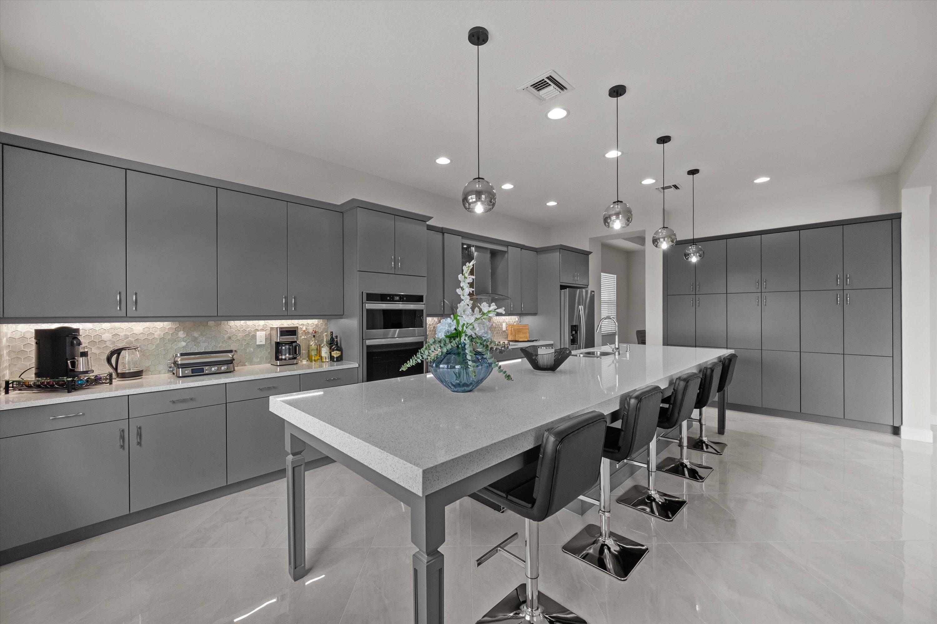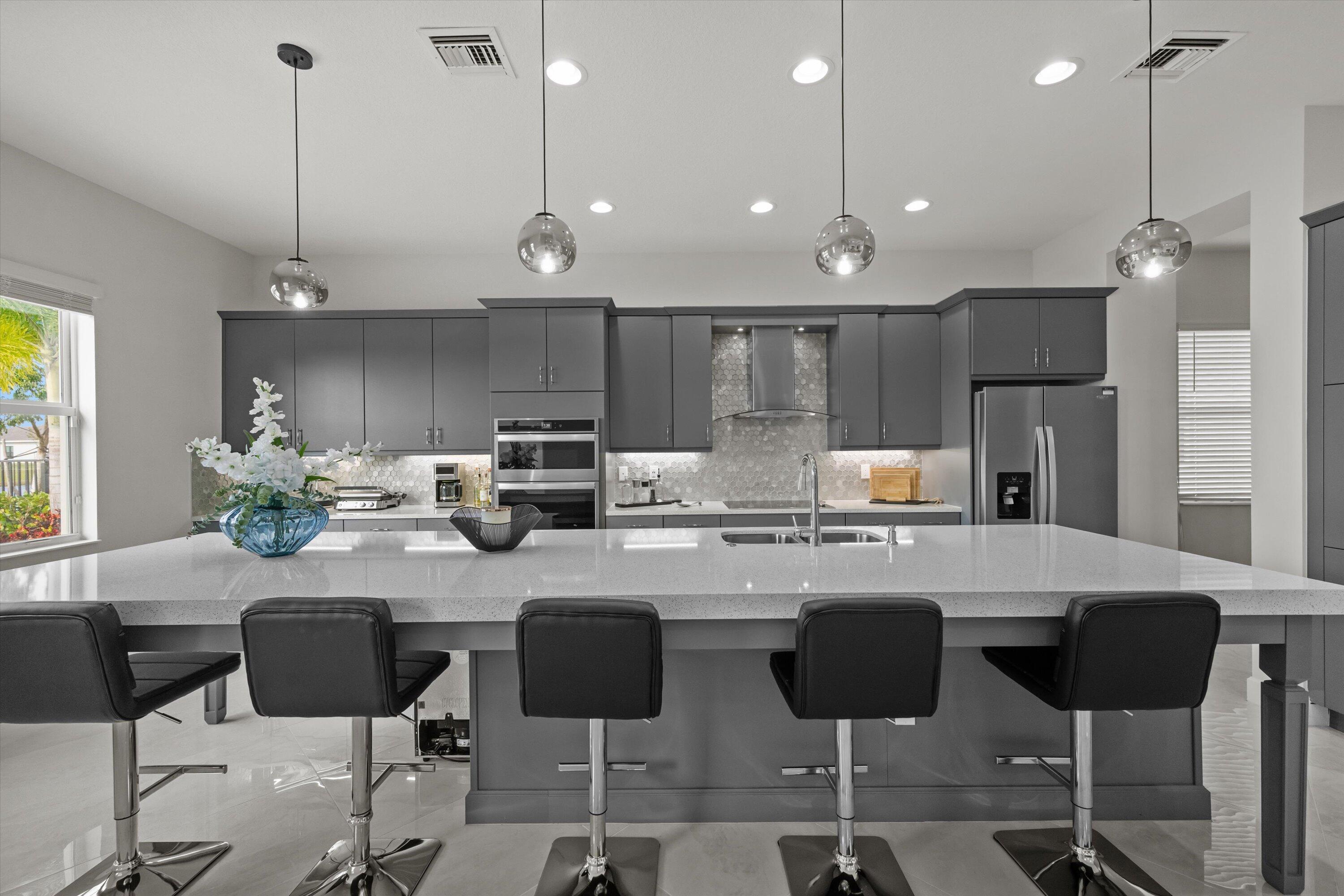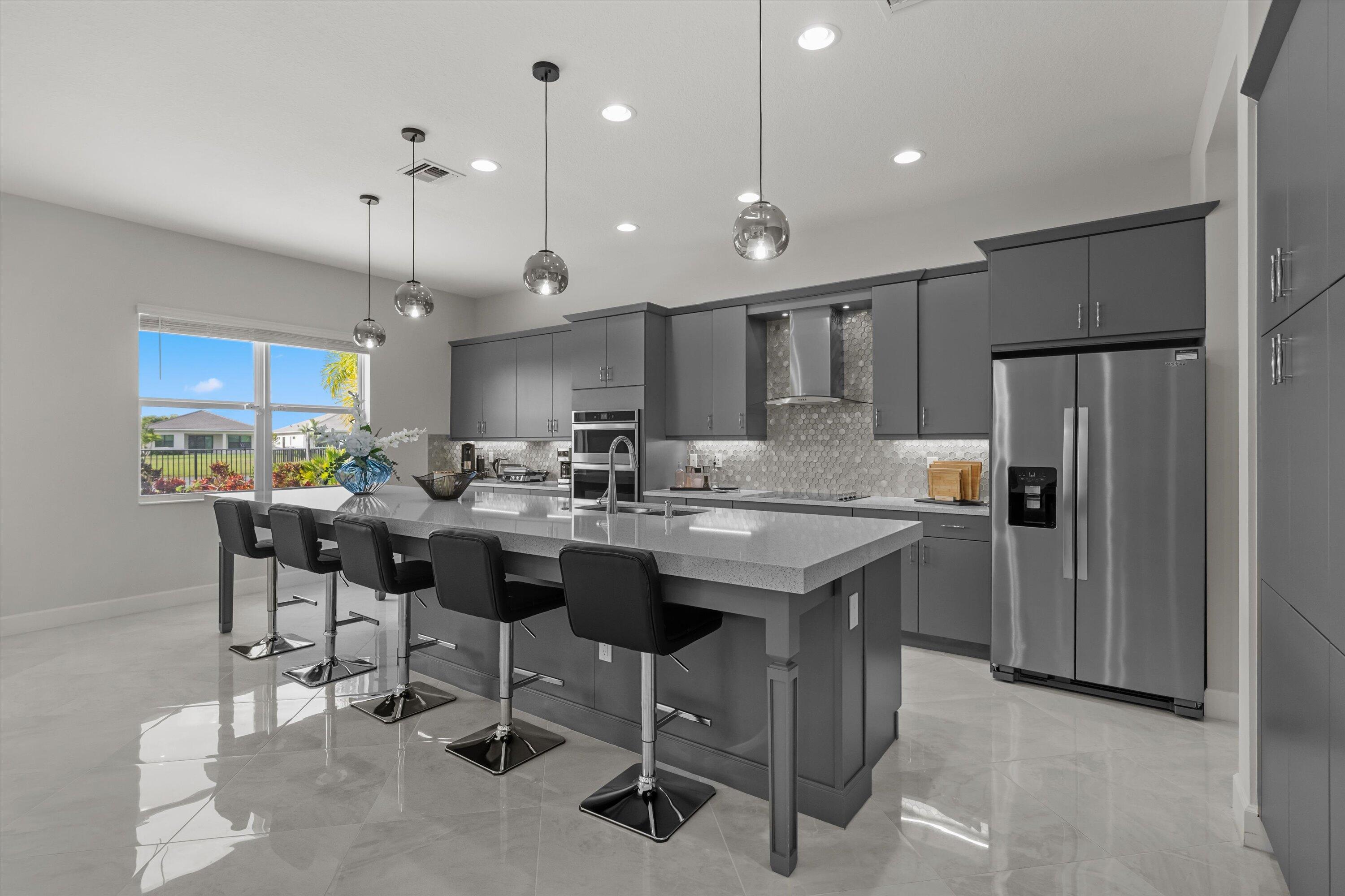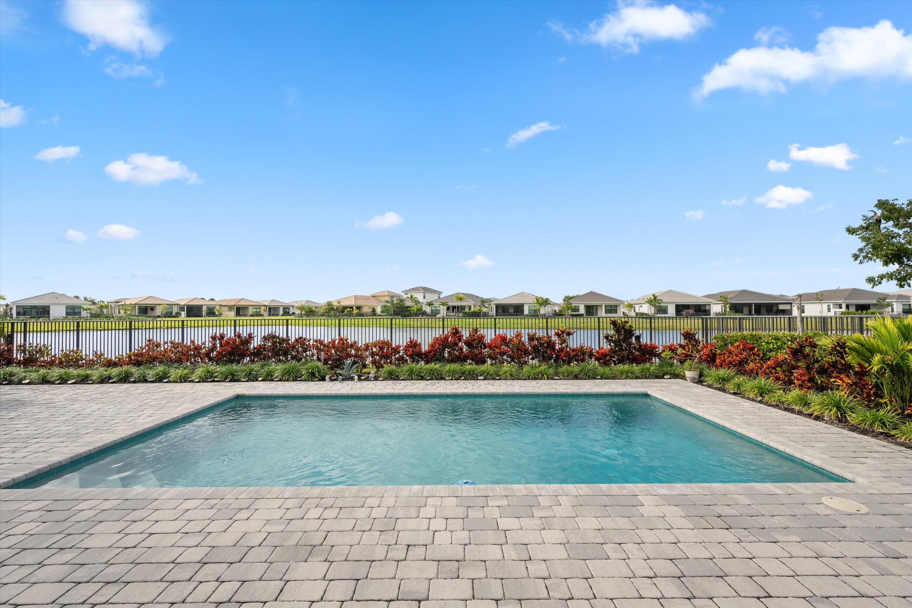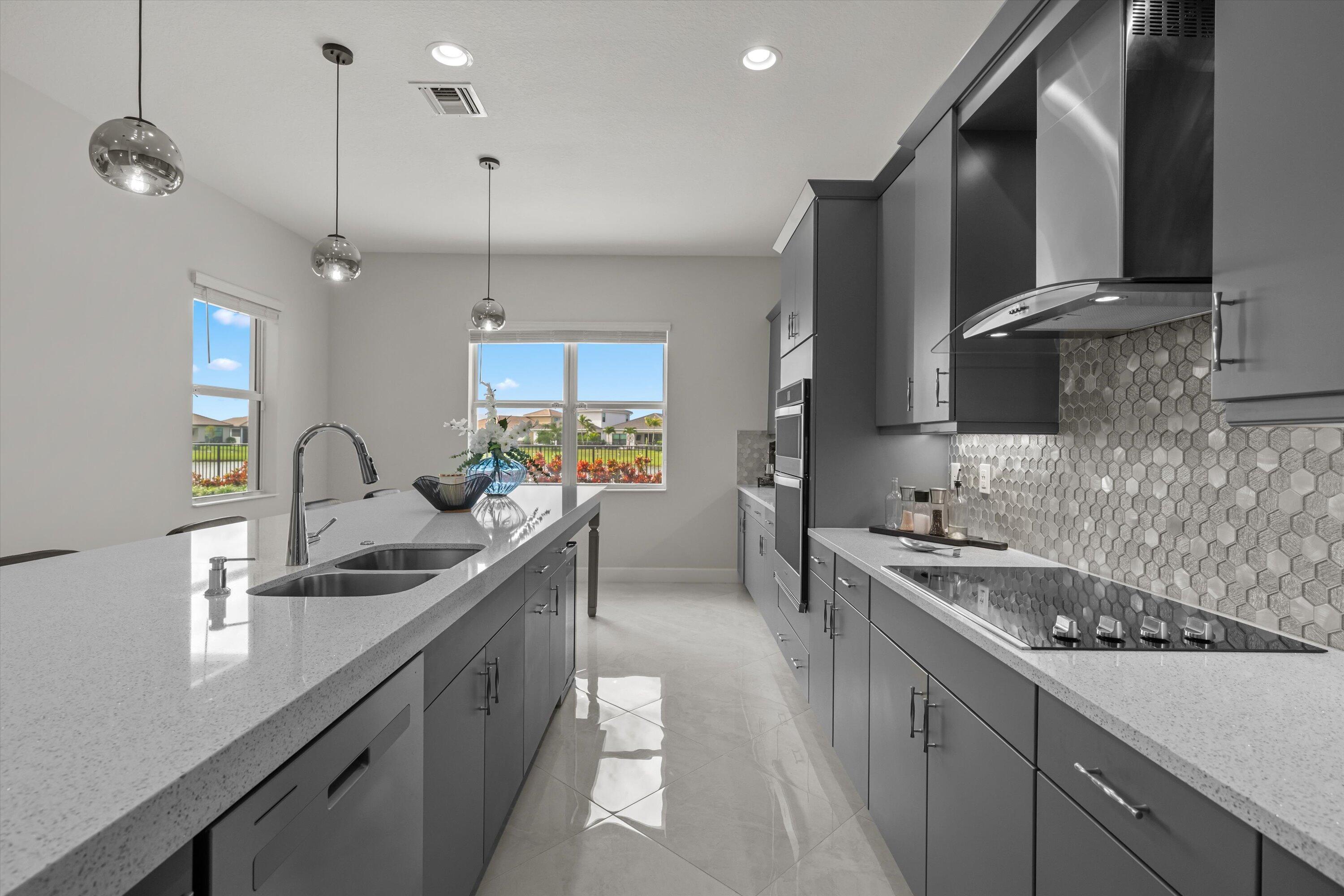 Step into luxury in this stunning Sandhill model located in The Orchards at Westlake--a beautifully designed 3-bedroom PLUS an office, 3-bath home with show-stopping curb appeal, a large driveway, 2-car garage, bold red double entry doors, and a private backyard oasis featuring a paver patio and chlorine pool--perfect for Florida living and entertaining.As you enter, you're welcomed directly into a spacious, open living area that flows effortlessly into the heart of the home bright, airy, and ideal for hosting. The main living spaces feature sleek, glossy white/gray tile flooring that enhances the home's crisp, modern feel. The chef's kitchen is truly the centerpiece, featuring gray cabinetry, sparkling quartz countertops, a statement stainless hood, built-in wall oven and microwave, and a striking gray hexagon tile backsplash. The oversized island is massive comfortably seating up to 10 and is accented by three pendant lights, making it ideal for gatherings. Enjoy stainless steel appliances, generous pantry space, and abundant storage throughout the extended kitchen layout. Just off the kitchen, the home also offers a formal dining room, perfectly positioned for easy entertaining and everyday meals. The primary suite is a private retreat with tray ceilings, tons of natural light from multiple windows, and elegant gray tile flooring. The spa-inspired primary bathroom offers dual sinks, white shaker cabinetry, white quartz countertops, and a large enclosed glass shower, all complemented by matching modern tilework. A spacious walk-in closet completes the owner's suite. Two additional bedrooms are impressively sized and offer excellent storage with walk-in closets. One bedroom is an ensuite, and both secondary bathrooms feature glass-enclosed showers with beautiful hexagon shower flooring, crisp white wall tile, and white shaker vanities creating a clean, high-end finish throughout. A dedicated den provides the perfect flex space for a home office, playroom, or lounge. You'll also love the large laundry room with plenty of room for storage, conveniently located near the 2-car garage. Step outside through bright sliding glass doors to enjoy your paver patio and refreshing chlorine pool, all set against a beautiful fenced backdrop for added privacy and relaxation. Located in the sought-after Orchards community of Westlake, this home blends modern finishes, functional space, and resort-style outdoor living ready to impress from the moment you arrive.