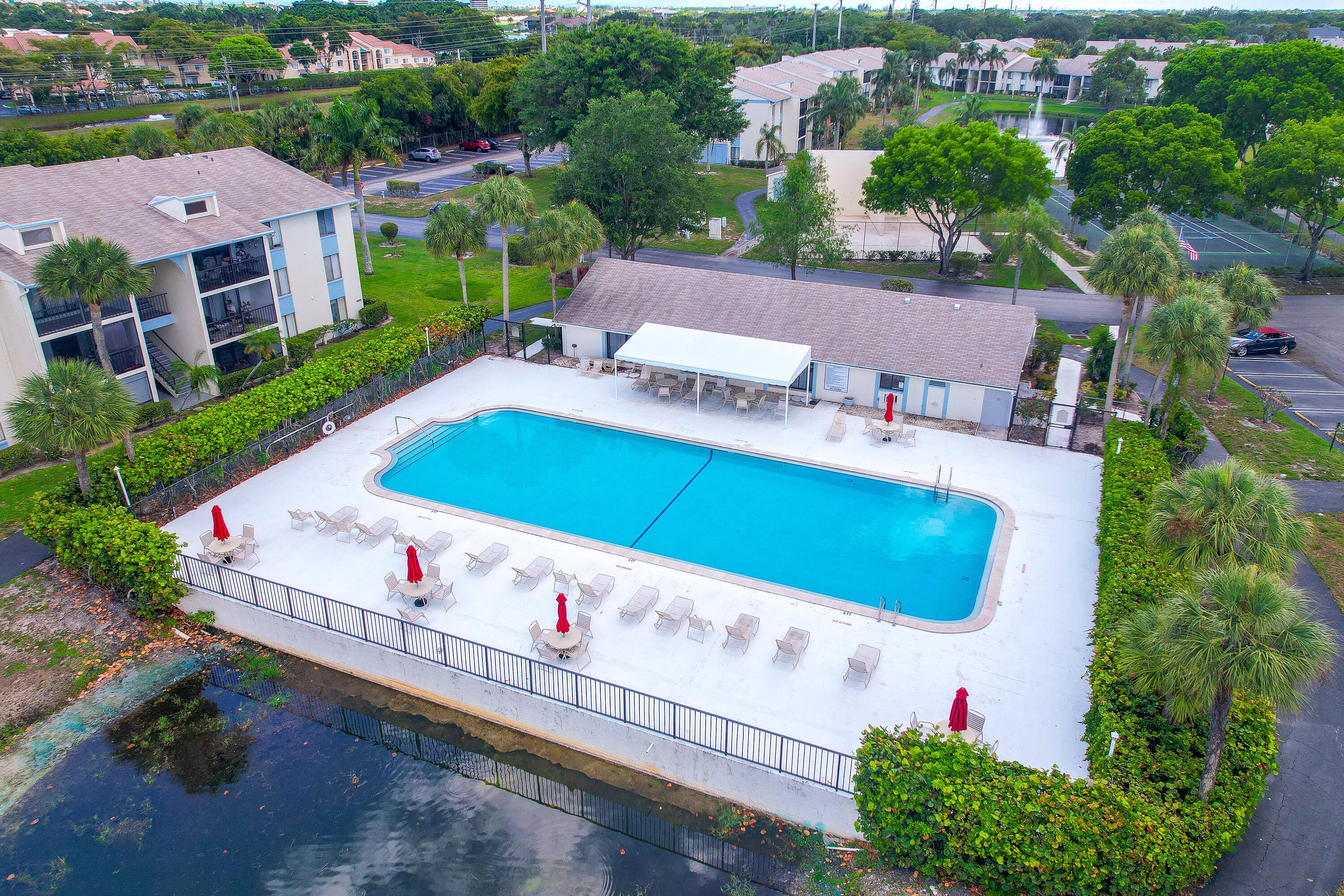 This move-in-ready 2-bedroom, 2-bath condo is located in the gated Palm Club Village II community and offers comfort, convenience, and a peaceful setting. Situated on the third floor, the home features a skylight that fills the space with natural light, along with an exterior storage closet for added functionality. The interior has been partially renovated and includes new waterproof flooring, quartz kitchen counters, stainless steel appliances, and a washer and dryer in the unit. The living area opens to a balcony overlooking the canal, creating a relaxing place to unwind. A mounted 65-inch TV and all furnishings currently in the unit are included. Community amenities include a pool, clubhouse, tennis courts, and a scenic path around the lake with fountains, benches, and grills.Conveniently located near PBI Airport, I-95, the Florida Turnpike, shopping, dining, and West Palm Beach.