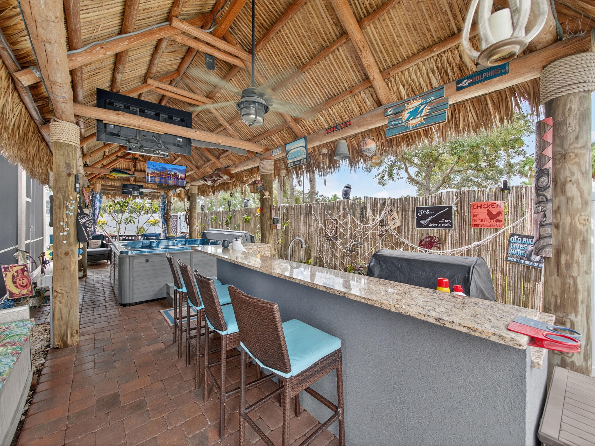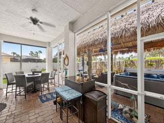An entertainer's DREAM awaits in Victoria Parc at Tradition! Step into your own private backyard oasis, featuring a spacious tiki hut with ample seating, a fully equipped outdoor summer kitchen (grill, sink, refrigerator, and ice machine), a custom 6-person ThermaSpa, and over $7,500 in upgraded electrical for TVs, lighting, and more. The fully fenced, pie-shaped lot offers generous side yards--perfect for play, pets, or gardening--and includes a complete French drain system, allowing you to truly enjoy the outdoor space year-round. This exceptional home showcases over $85,000 in owner upgrades, making it completely move-in ready from day one. Designed for seamless indoor/outdoor living, the home features extended pavers, with both the front porch and rear patio fully screened.Tinted impact windows and doors enhance energy efficiency while keeping the interior cool. Inside, you'll find an oversized primary suite with custom closets and shelving, adding both style and functionality. Ideally located in the heart of Tradition, this home is just minutes from shopping, dining, parks, entertainment, and the Cleveland Clinic Tradition Medical Center, with quick access to I-95 for easy commuting.