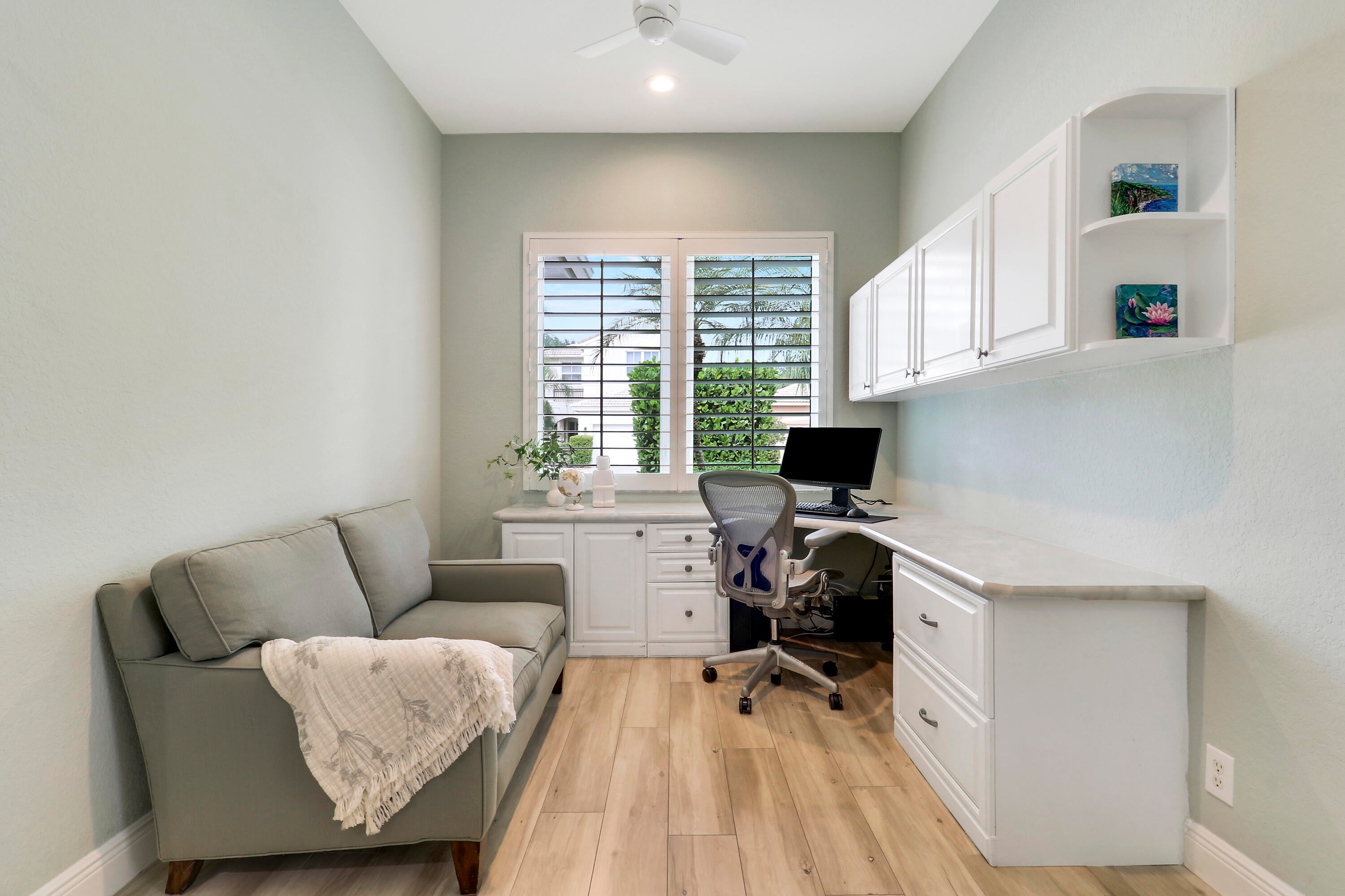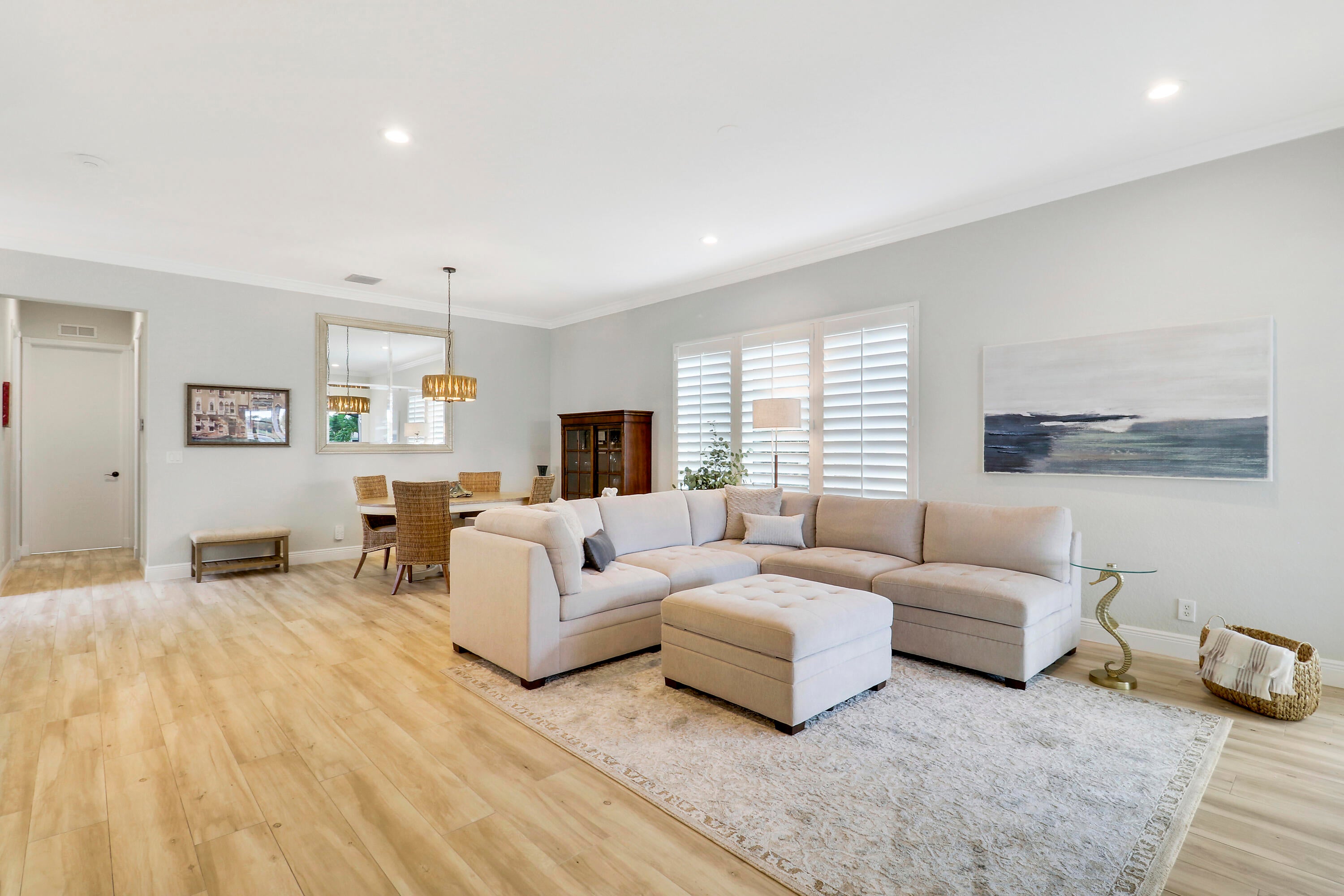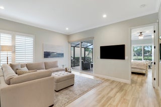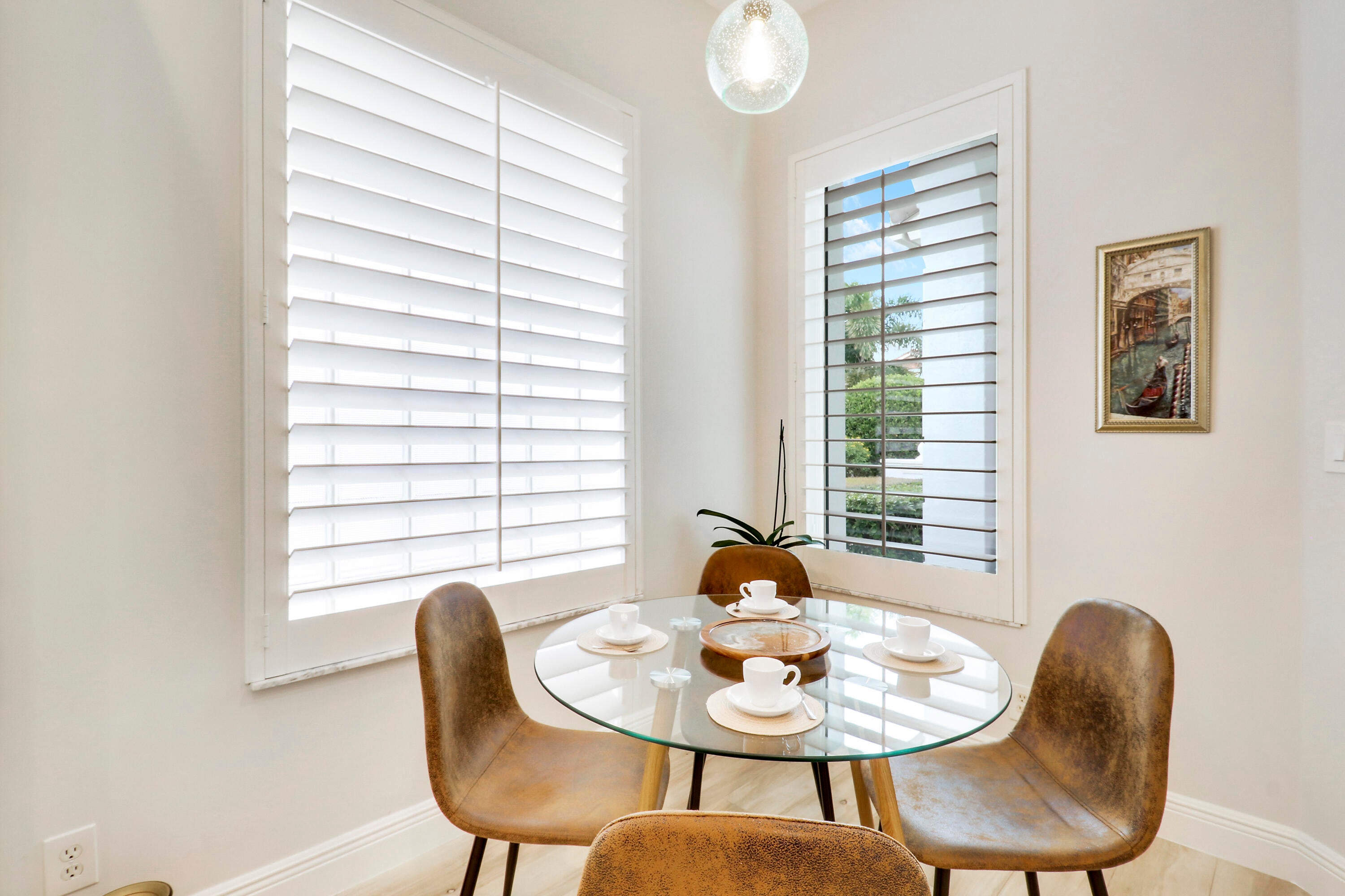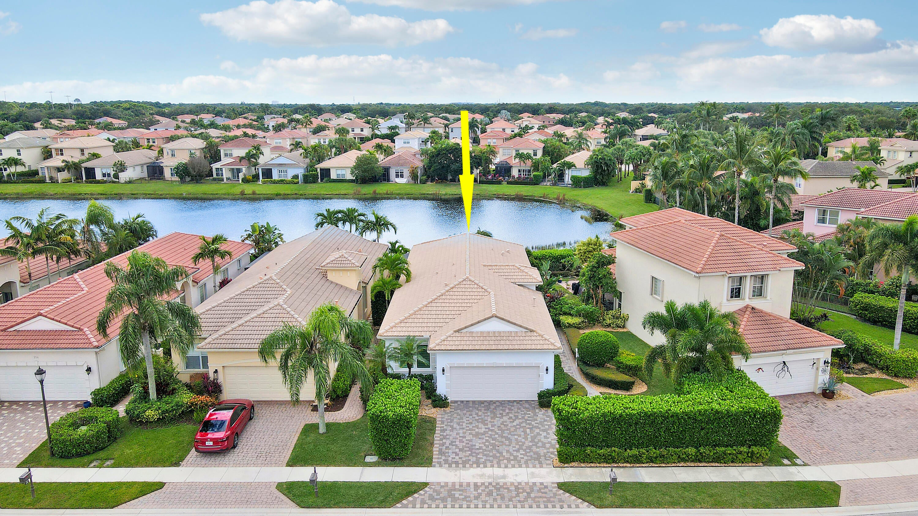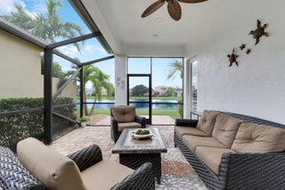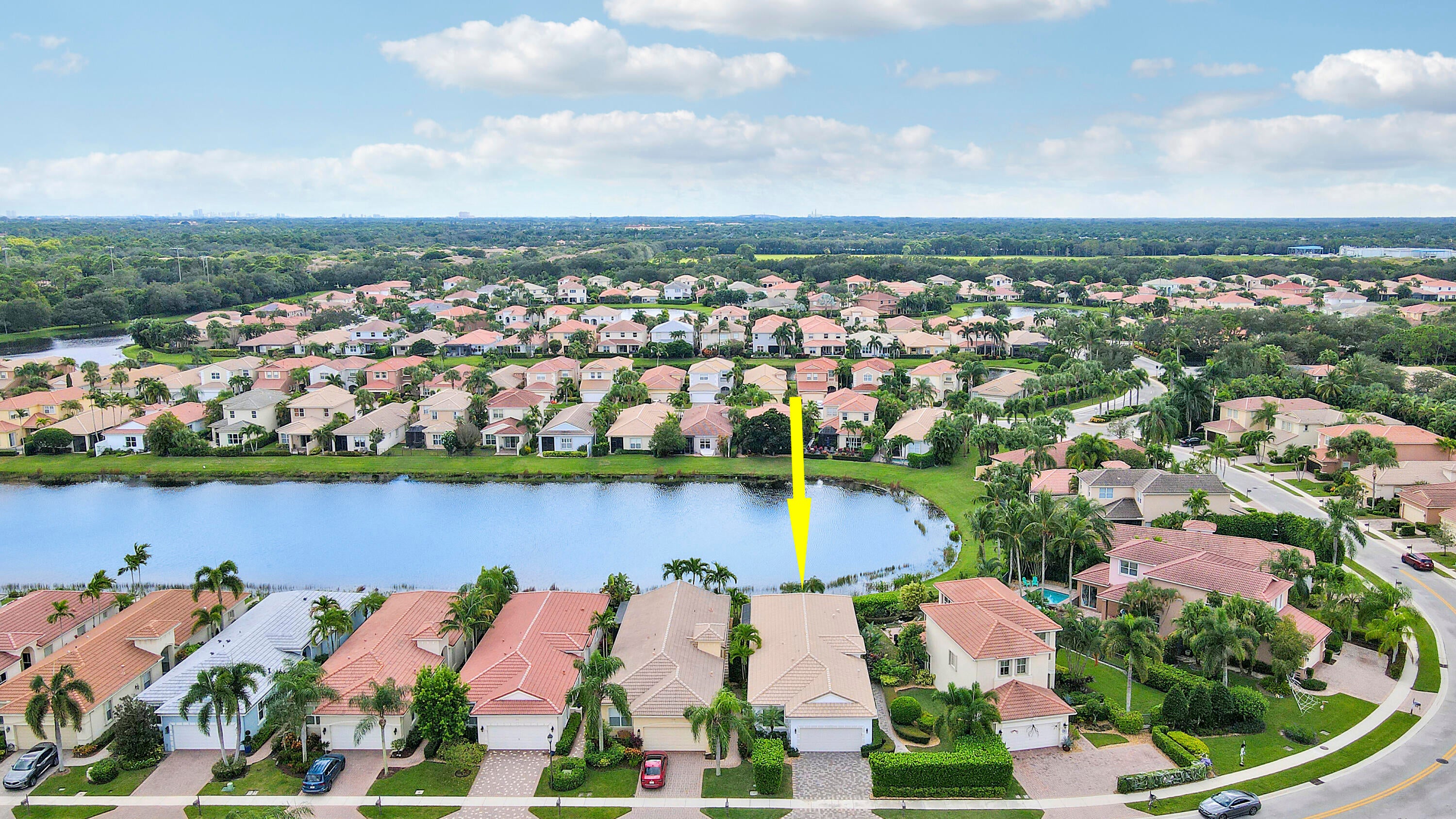 This fully remodeled 3-bedroom, 2-bath CBS Bella model in guard-gated Mirabella is set on an oversized pie-shaped lot with southern rear exposure and lake views, offering exceptional light, privacy, and ease of living. It is the most extensively upgraded Bella model in the community and has been meticulously maintained by long-term owners. Ideal for retirees, couples, or a small family seeking quality, security, and low-maintenance living. The interior features imported wood-look porcelain tile from Spain and plantation shutters throughout, creating a refined, timeless aesthetic. The chef's kitchen is designed for everyday enjoyment and entertaining, featuring a high-end Wolf dual-fuel range that runs on natural gas with electric oven precision, Taj Mahal quartzite countertops, customcabinetry, a cabinet-faced Sub-Zero refrigerator, Miele dishwasher, copper-finish ceramic and marble backsplash, and reverse-osmosis water filtration. Mirabella is one of the very few Palm Beach Gardens communities with true natural gas, and the home also includes a natural-gas water heater, gas or electric dryer hookup, an outdoor grill connected to natural gas, and a dedicated natural-gas connection ready for a future whole-home generator. Comfort and efficiency are elevated by a Trane XV variable-speed A/C system installed in 2024, designed for quieter operation, superior humidity control, and consistent temperatures. Additional upgrades include NEW PGT impact windows and doors and a whole-home water softener. Technology and infrastructure were thoughtfully integrated with ceiling-mounted Wi-Fi access points throughout, hardwired internet connections to every room for seamless streaming and remote work, a Rachio smart irrigation controller, and a professionally integrated security system with UniFi 4K cameras and a doorbell camera, with alarm monitoring covered by the HOA. The two-car garage has been extensively upgraded with a LiftMaster side-mount garage door opener, ceiling-mounted storage racks, and custom cabinetry, providing exceptional storage while preserving full parking functionality. Bathrooms have been redesigned with spa-inspired finishes, and a flexible den offers space for a home office, media room, or additional living area. The exterior features fresh paint, upgraded coach lighting, and an expanded three-car driveway. Mirabella offers a quiet, resort-style lifestyle with 24-hour manned security, premium cable and internet, an elegant clubhouse, resort pool, fitness center, children's clubhouse, and Har-Tru tennis courts. The location is exceptionally convenient, just minutes from I-95 and the Florida Turnpike, Publix, Whole Foods, Trader Joe's, Costco, The Gardens Mall, and Downtown at the Gardens, with approximately 15 minutes to the beach and easy access to Palm Beach International Airport.