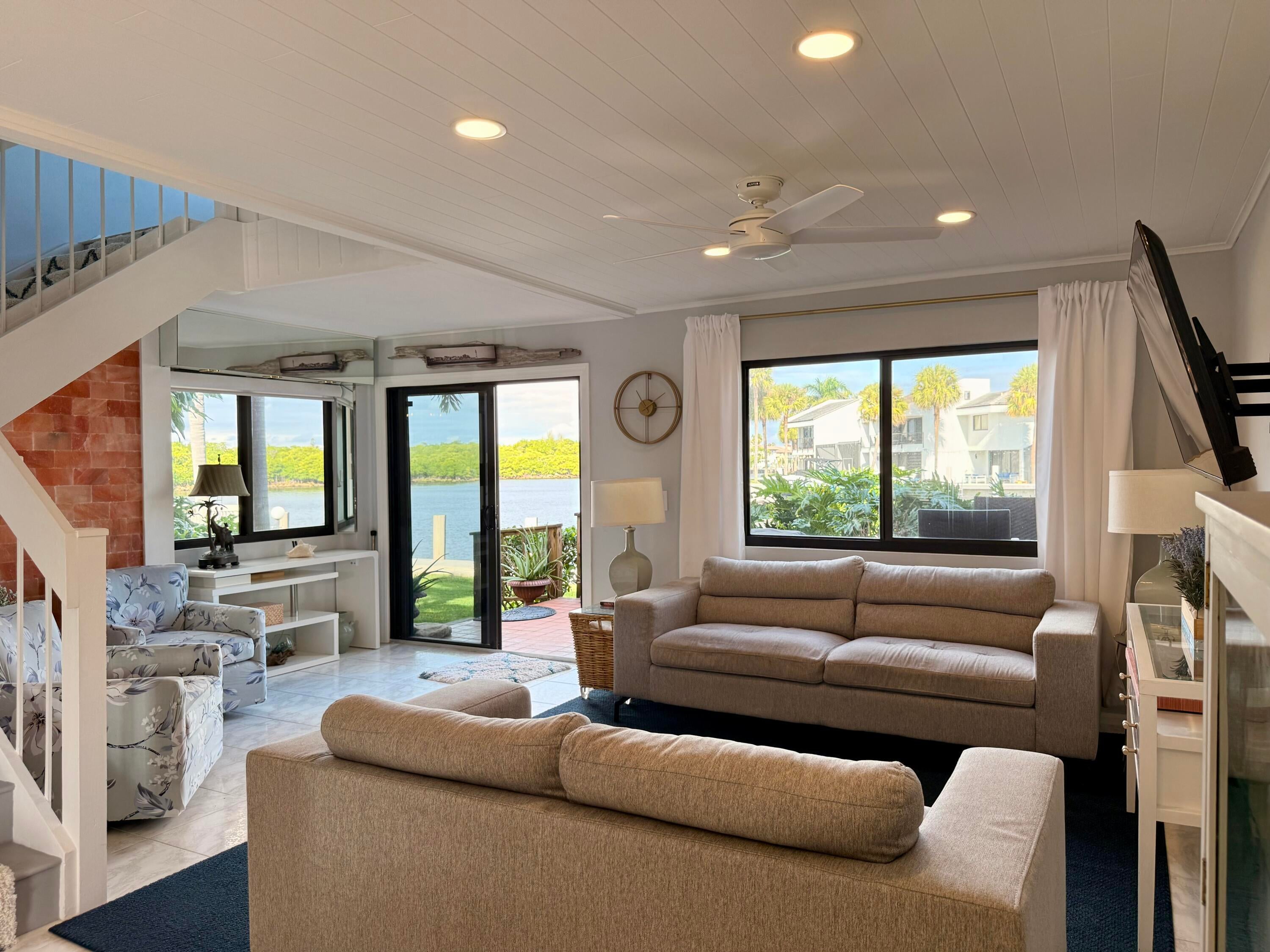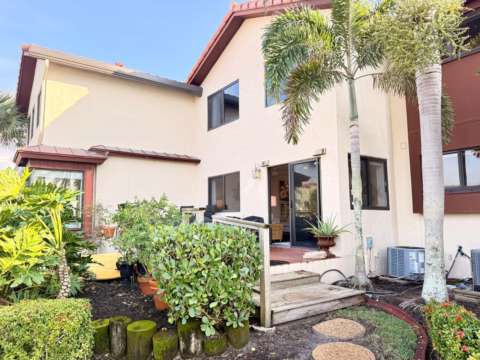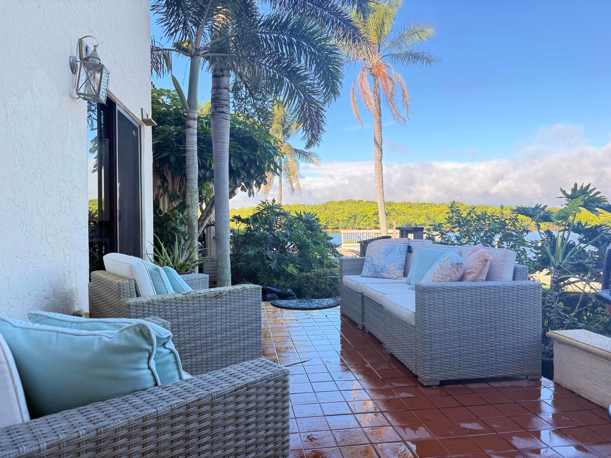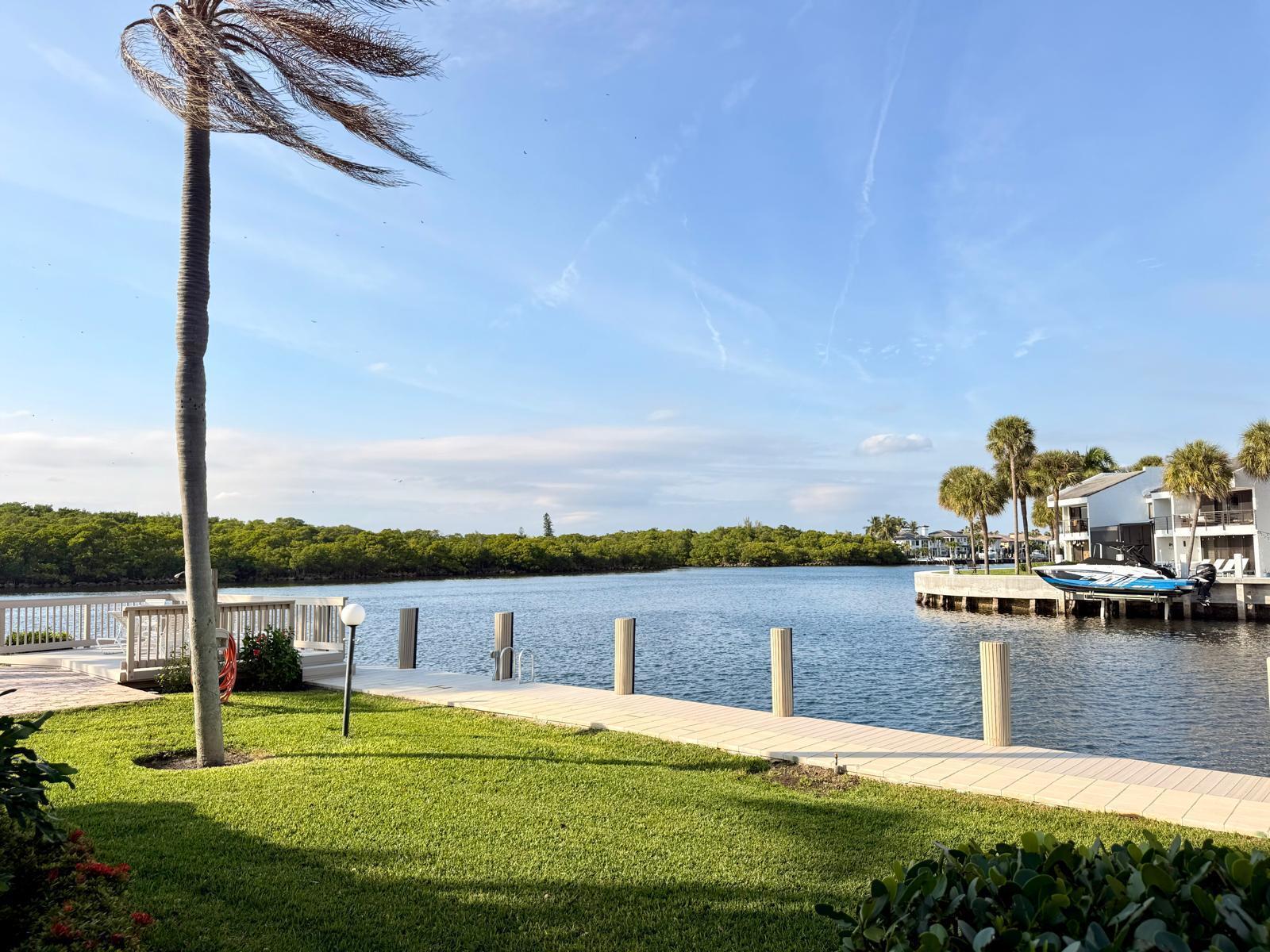 Turnkey waterfront townhouse with major infrastructure upgrades, including a reinforced seawall and new docks, set on a wide-water Intracoastal point lot with no fixed bridges. Located in Villa Del Alto, a boutique six-unit community at the end of a quiet cul-de-sac in Highland Beach, this fully furnished 2-bedroom, 2-bath, two-story residence offers Intracoastal and preserve views with direct ocean access.Recent improvements include a new roof, reinforced seawall, new dock around the boat slips, new dock near the pool, new landscaping, complete new AC system. The main level features an open living and dining area, updated kitchen with white cabinetry and stainless steel appliances, a full bedroom and bath, and direct access to a waterfront patio overlooking the Intracoastalideal for outdoor living and entertaining. Upstairs, the primary suite functions as a private living space with a sitting area, walk-in closet, and a completely renovated bath featuring dual vanities, glass-enclosed shower, and freestanding tub. Impact glass throughout.