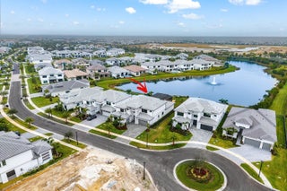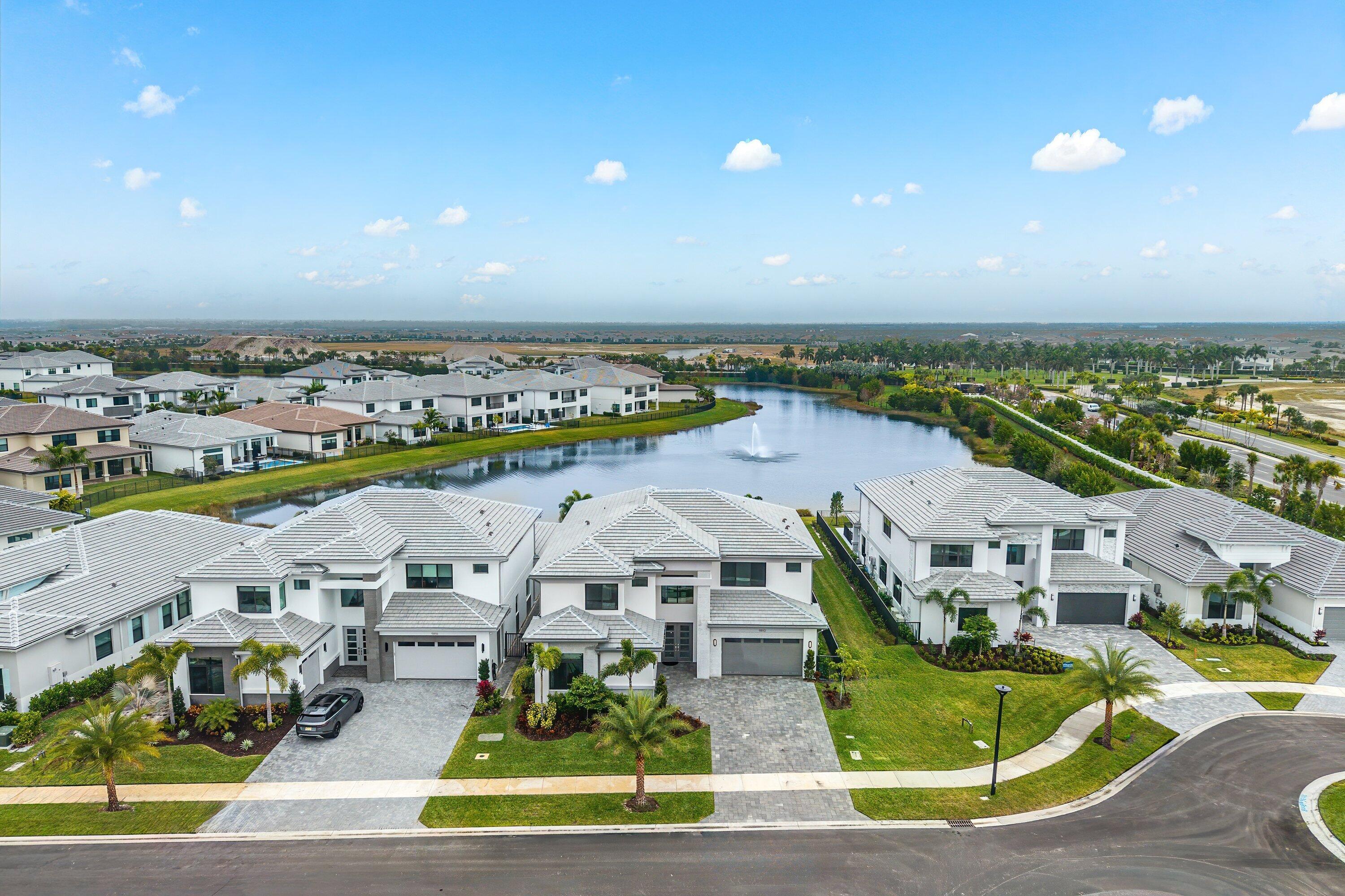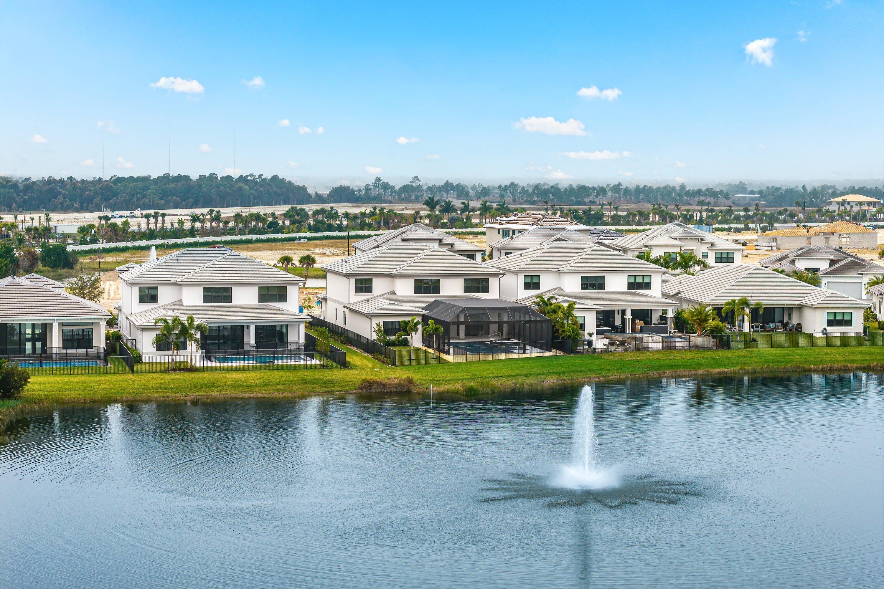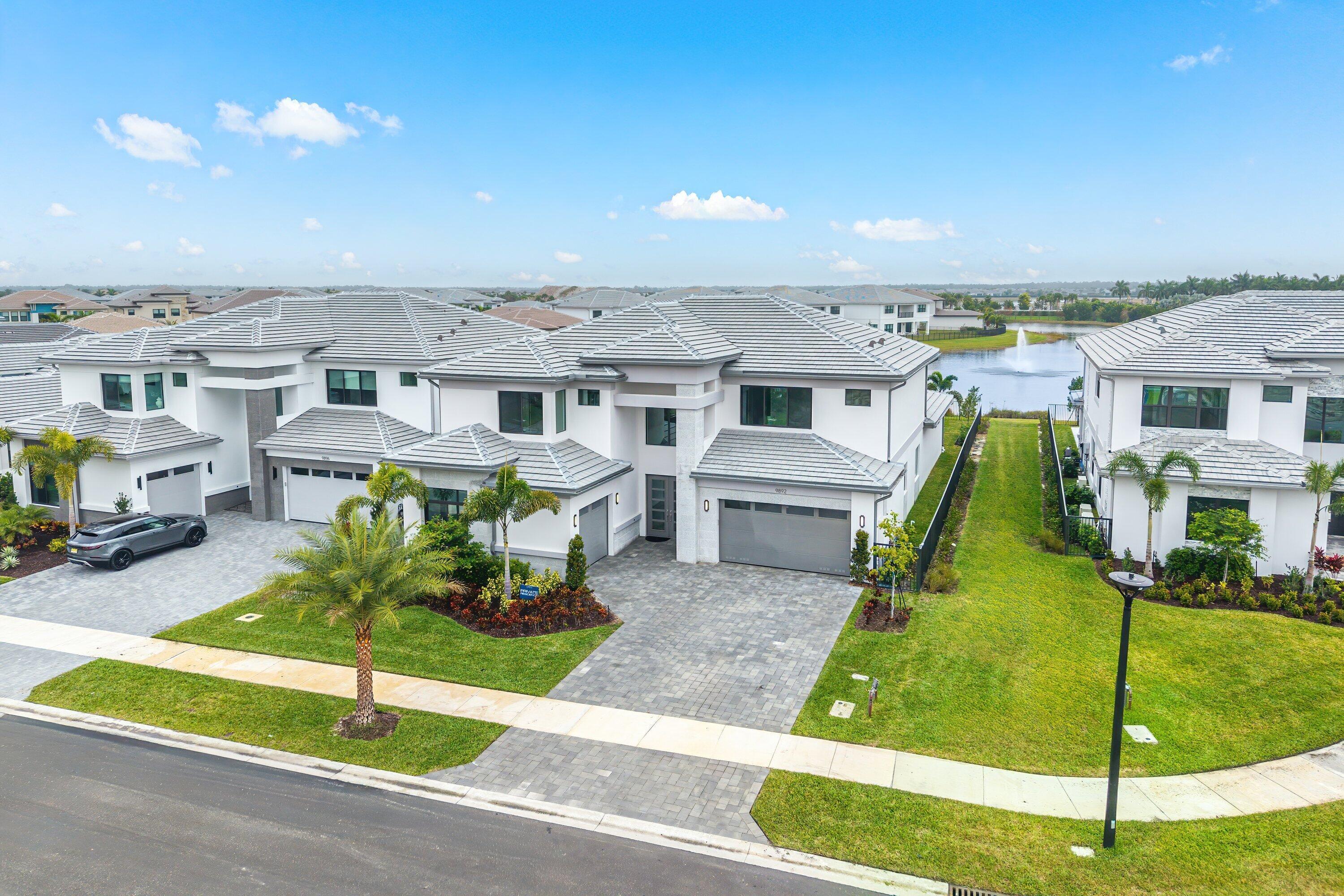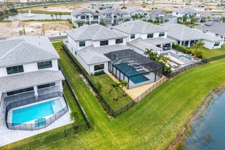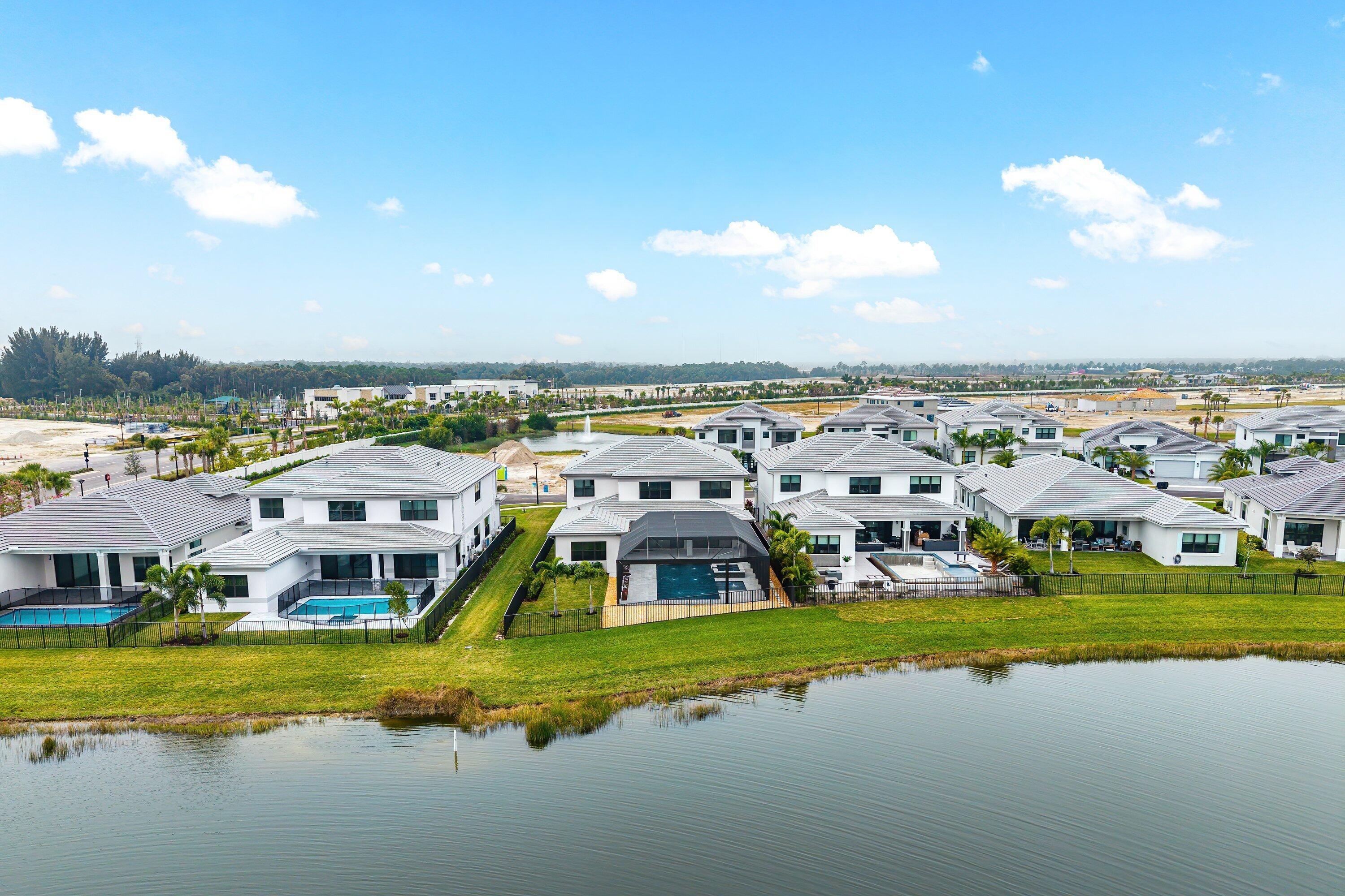 BRAND NEW Luxury residence in Apex at Avenir. This striking modern two-story 5 bedroom, 5.5 bath home offers over 5,136 square feet of impeccably designed living space, perfectly positioned on a premium lakefront homesite with beautiful water views. Exceptional upgrades and top-of-the-line finishes are showcased throughout, creating a truly elevated living experience.Upon arrival, an expansive foyer sets the tone with custom LED light fixtures, a sleek designer staircase with custom railing, and elegant panel molding extending to the second floor. Be impressed by flawless Level 5 finished walls complemented by custom paint throughoutThe chef's kitchen is a showpiece, offering custom floor-to-ceiling Kabco wood cabinetry with Designers trendy Walnut combo modern Gola design pairingeffortlessly with a dramatic Quartzite Taj Mahal waterfall island, offering ample storage and inviting snack-bar seating. A seamless quartzite backsplash with concealed outlets, maintains clean architectural lines, while gold hardware adds a touch of warmth. Professional grade Sub-Zero and Wolf appliances - including, steam and convection ovens, a 5-burner gas cooktop, and a statement hood. Two pantry options include a dedicated kitchen pantry and a spacious walk-in pantry tucked beneath the staircase. The kitchen opens effortlessly to the dining area and family room, ideal for entertaining. The family room features a custom built in with display cabinetry, remote access Linear LED electric heated fireplace and a dry bar with beverage refrigerator, blending style and function. The primary suite conveniently located on the first floor impresses with custom lighting, dual walk in custom closets, and a spa inspired bath with dual vanities, soaking tub, separate private water closets with ADA accessible sink and ADA accessible glass walk in shower showcasing three shower heads and built in seating. The home features European engineered white oak flooring and 2 x 4 porcelain tile throughout. A custom, private ADA-accessible elevator leads to the 4 upstairs bedrooms, media room and loft. A wall of glass spans the rear of the home, unveiling the grand outdoor living space. Enjoy a screened-in patio and an oversized gas heated salt water pool and spa with sun shelf framed by marble stone pavers. Built-in planters include water bibs and power sources for convenience, and the home is pre-plumbed for a future summer kitchen. Additional highlights include two laundry rooms (one on each floor) with large-capacity Electrolux appliances, a second-floor wet bar in the loft space, impact glass throughout, and a 3-car garage with epoxy flooring, workspace, and storage. Get excited for the exclusive Apex at Avenir brand new clubhouse featuring lush landscaping, picturesque walking trails, pickleball and tennis courts, state-of-the-art fitness center, elegant lobby and lounge with bar and expansive sun deck with shaded cabanas surrounding the lap pool and whirlpool spa. Additionally, a new Town Center, now under development offering shopping and dining options. Enjoy peace of mind with a 24 hr manned gate at Apex. This exceptional home is a rare offering where modern design, premium finishes, and thoughtful craftsmanship come together to create a truly elevated lifestyle in Avenir.
