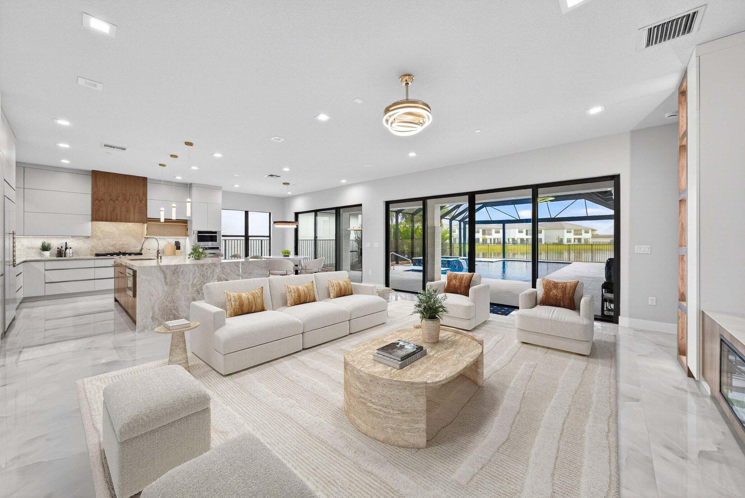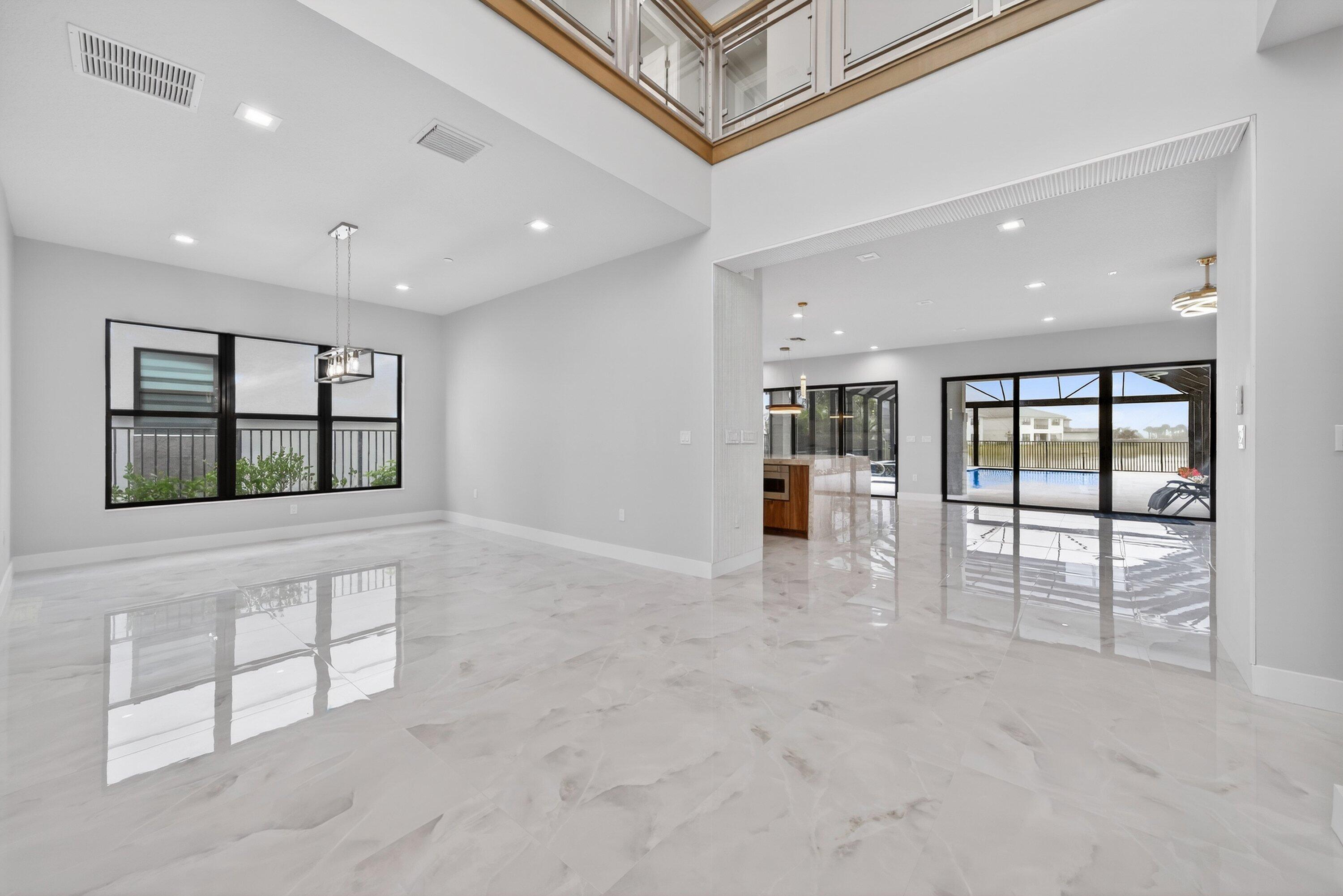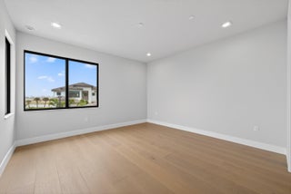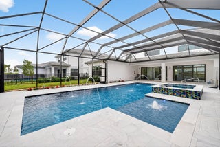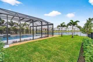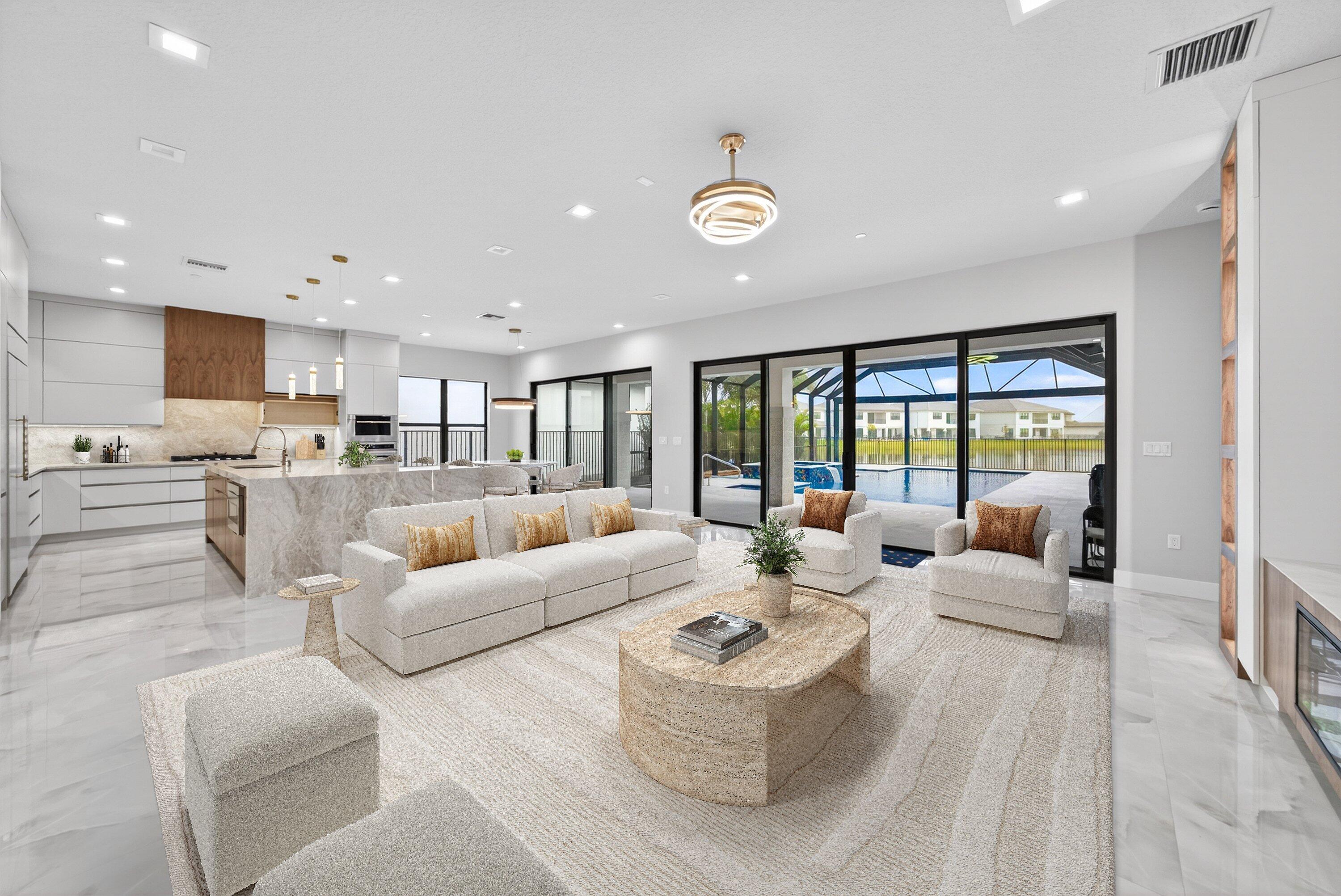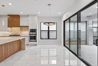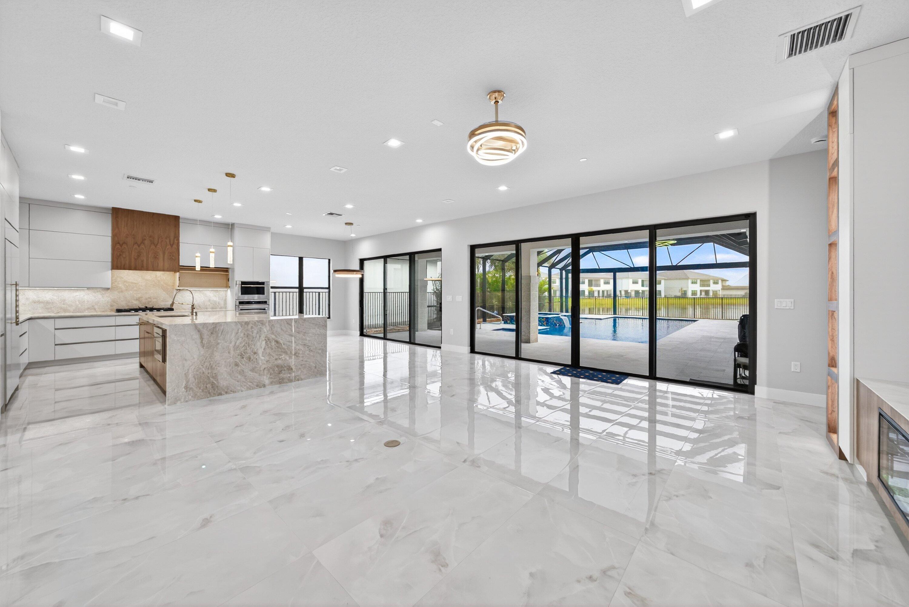 BRAND NEW Luxury residence in Apex at Avenir. This striking modern two-story 5 bedroom, 5.5 bath home offers over 5,136 square feet of impeccably designed living space, perfectly positioned on a premium lakefront homesite with beautiful water views. Exceptional upgrades and top-of-the-line finishes are showcased throughout, creating a truly elevated living experience.Upon arrival, an expansive foyer sets the tone with custom LED light fixtures, a sleek designer staircase with custom railing, and elegant panel molding extending to the second floor. Be impressed by flawless Level 5 finished walls complemented by custom paint throughoutThe chef's kitchen is a showpiece, offering custom floor-to-ceiling Kabco wood cabinetry with Designers trendy Walnut combo modern Gola design pairingeffortlessly with a dramatic Quartzite Taj Mahal waterfall island, offering ample storage and inviting snack-bar seating. A seamless quartzite backsplash with concealed outlets, maintains clean architectural lines, while gold hardware adds a touch of warmth. Professional grade Sub-Zero and Wolf appliances - including, steam and convection ovens, a 5-burner gas cooktop, and a statement hood. Two pantry options include a dedicated kitchen pantry and a spacious walk-in pantry tucked beneath the staircase. The kitchen opens effortlessly to the dining area and family room, ideal for entertaining. The family room features a custom built in with display cabinetry, remote access Linear LED electric heated fireplace and a dry bar with beverage refrigerator, blending style and function. The primary suite conveniently located on the first floor impresses with custom lighting, dual walk in custom closets, and a spa inspired bath with dual vanities, soaking tub, separate private water closets with ADA accessible sink and ADA accessible glass walk in shower showcasing three shower heads and built in seating. The home features European engineered white oak flooring and 2 x 4 porcelain tile throughout. A custom, private ADA-accessible elevator leads to the 4 upstairs bedrooms, media room and loft. A wall of glass spans the rear of the home, unveiling the grand outdoor living space. Enjoy a screened-in patio and an oversized gas heated salt water pool and spa with sun shelf framed by marble stone pavers. Built-in planters include water bibs and power sources for convenience, and the home is pre-plumbed for a future summer kitchen. Additional highlights include two laundry rooms (one on each floor) with large-capacity Electrolux appliances, a second-floor wet bar in the loft space, impact glass throughout, and a 3-car garage with epoxy flooring, workspace, and storage. Get excited for the exclusive Apex at Avenir brand new clubhouse featuring lush landscaping, picturesque walking trails, pickleball and tennis courts, state-of-the-art fitness center, elegant lobby and lounge with bar and expansive sun deck with shaded cabanas surrounding the lap pool and whirlpool spa. Additionally, a new Town Center, now under development offering shopping and dining options. Enjoy peace of mind with a 24 hr manned gate at Apex. This exceptional home is a rare offering where modern design, premium finishes, and thoughtful craftsmanship come together to create a truly elevated lifestyle in Avenir.