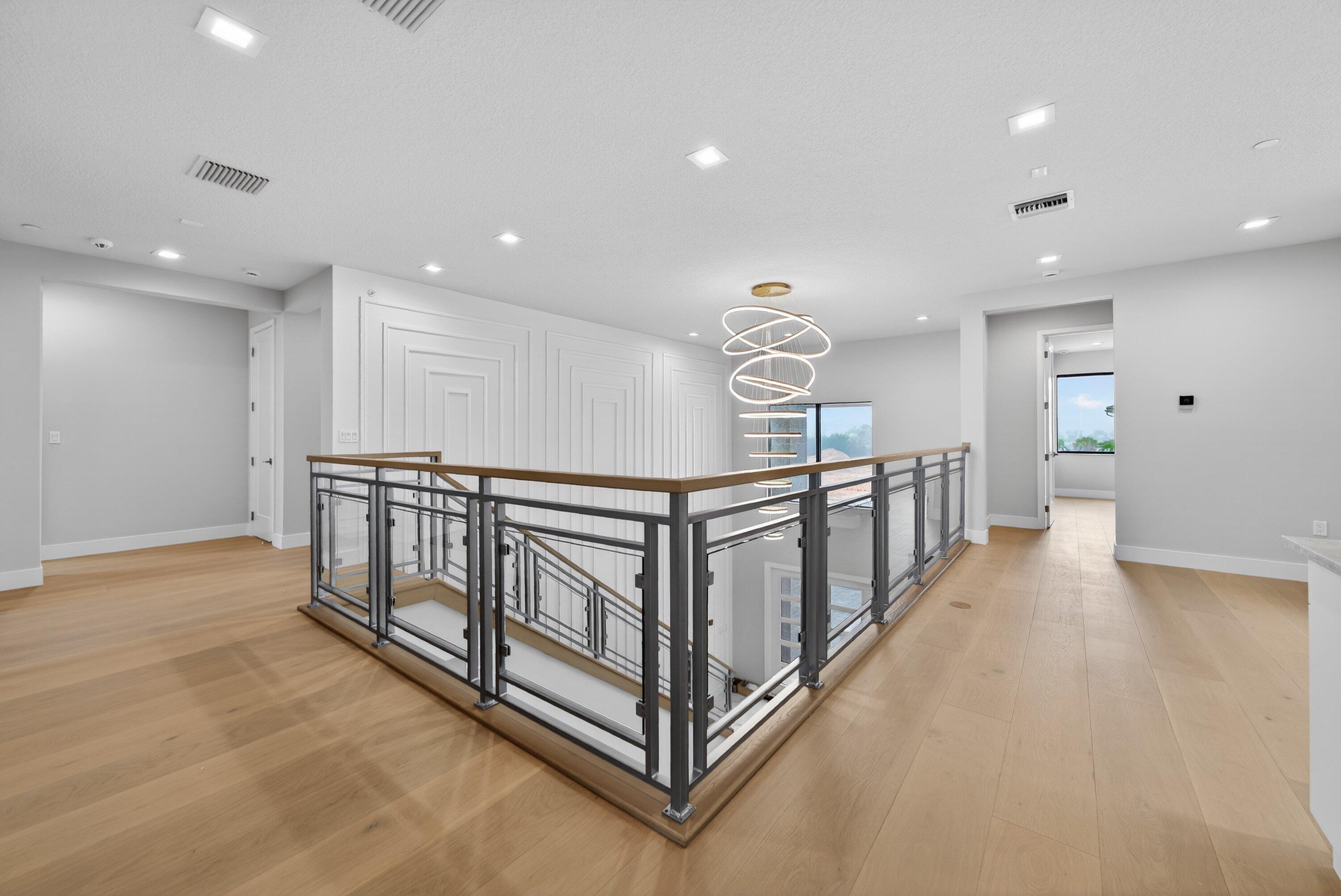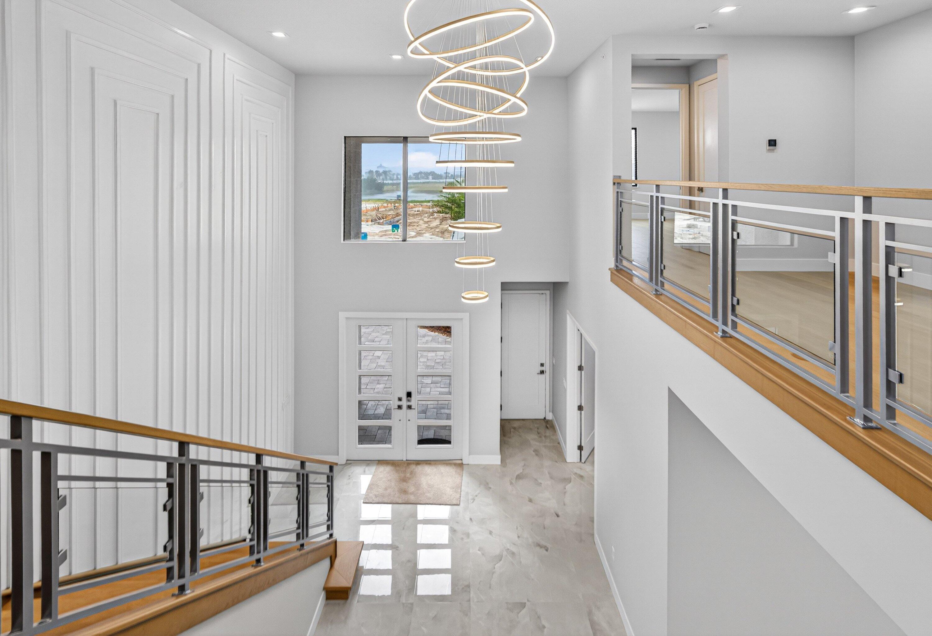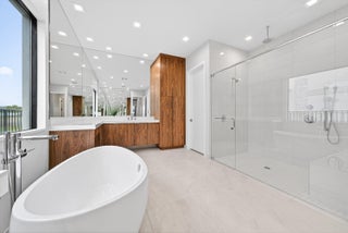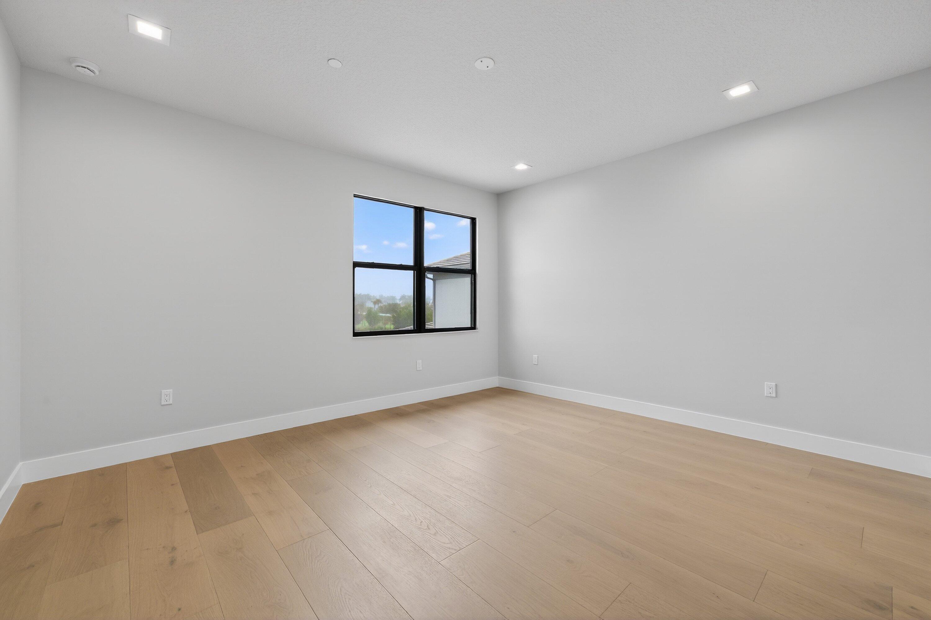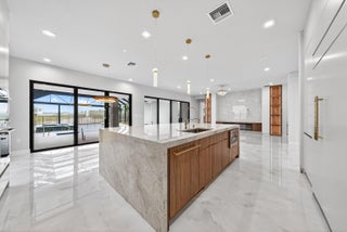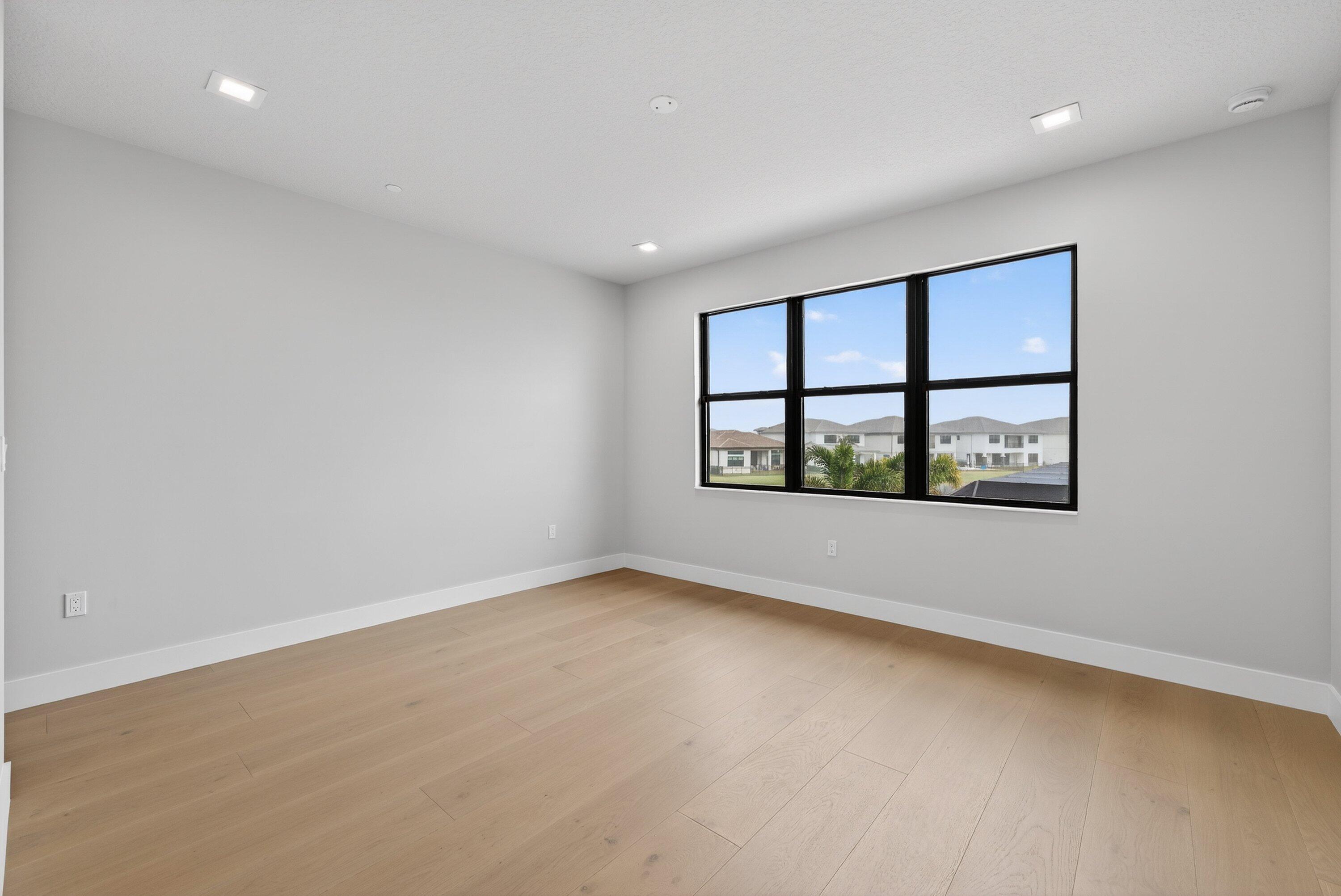 BRAND NEW Luxury residence in Apex at Avenir. This striking modern two-story 5 bedroom, 5.5 bath home offers over 5,136 square feet of impeccably designed living space, perfectly positioned on a premium lakefront homesite with beautiful water views. Exceptional upgrades and top-of-the-line finishes are showcased throughout, creating a truly elevated living experience.Upon arrival, an expansive foyer sets the tone with custom LED light fixtures, a sleek designer staircase with custom railing, and elegant panel molding extending to the second floor. Be impressed by flawless Level 5 finished walls complemented by custom paint throughoutThe chef's kitchen is a showpiece, offering custom floor-to-ceiling Kabco wood cabinetry with Designers trendy Walnut combo modern Gola design pairingeffortlessly with a dramatic Quartzite Taj Mahal waterfall island, offering ample storage and inviting snack-bar seating. A seamless quartzite backsplash with concealed outlets, maintains clean architectural lines, while gold hardware adds a touch of warmth. Professional grade Sub-Zero and Wolf appliances - including, steam and convection ovens, a 5-burner gas cooktop, and a statement hood. Two pantry options include a dedicated kitchen pantry and a spacious walk-in pantry tucked beneath the staircase. The kitchen opens effortlessly to the dining area and family room, ideal for entertaining. The family room features a custom built in with display cabinetry, remote access Linear LED electric heated fireplace and a dry bar with beverage refrigerator, blending style and function. The primary suite conveniently located on the first floor impresses with custom lighting, dual walk in custom closets, and a spa inspired bath with dual vanities, soaking tub, separate private water closets with ADA accessible sink and ADA accessible glass walk in shower showcasing three shower heads and built in seating. The home features European engineered white oak flooring and 2 x 4 porcelain tile throughout. A custom, private ADA-accessible elevator leads to the 4 upstairs bedrooms, media room and loft. A wall of glass spans the rear of the home, unveiling the grand outdoor living space. Enjoy a screened-in patio and an oversized gas heated salt water pool and spa with sun shelf framed by marble stone pavers. Built-in planters include water bibs and power sources for convenience, and the home is pre-plumbed for a future summer kitchen. Additional highlights include two laundry rooms (one on each floor) with large-capacity Electrolux appliances, a second-floor wet bar in the loft space, impact glass throughout, and a 3-car garage with epoxy flooring, workspace, and storage. Get excited for the exclusive Apex at Avenir brand new clubhouse featuring lush landscaping, picturesque walking trails, pickleball and tennis courts, state-of-the-art fitness center, elegant lobby and lounge with bar and expansive sun deck with shaded cabanas surrounding the lap pool and whirlpool spa. Additionally, a new Town Center, now under development offering shopping and dining options. Enjoy peace of mind with a 24 hr manned gate at Apex. This exceptional home is a rare offering where modern design, premium finishes, and thoughtful craftsmanship come together to create a truly elevated lifestyle in Avenir.