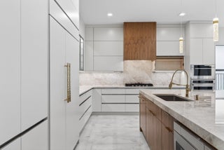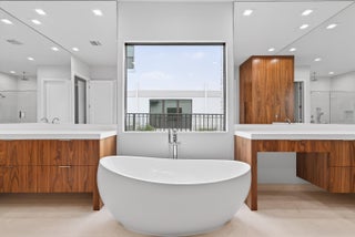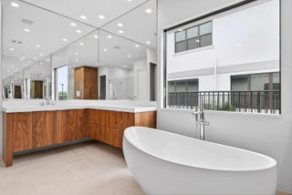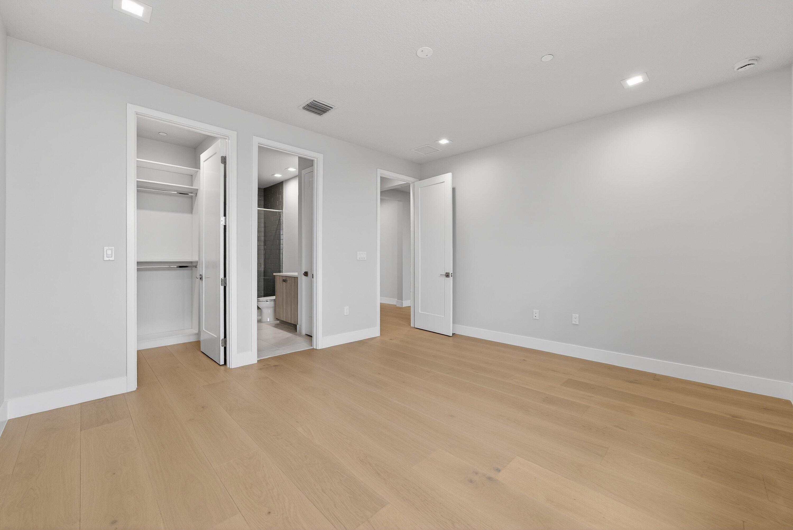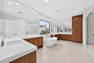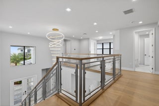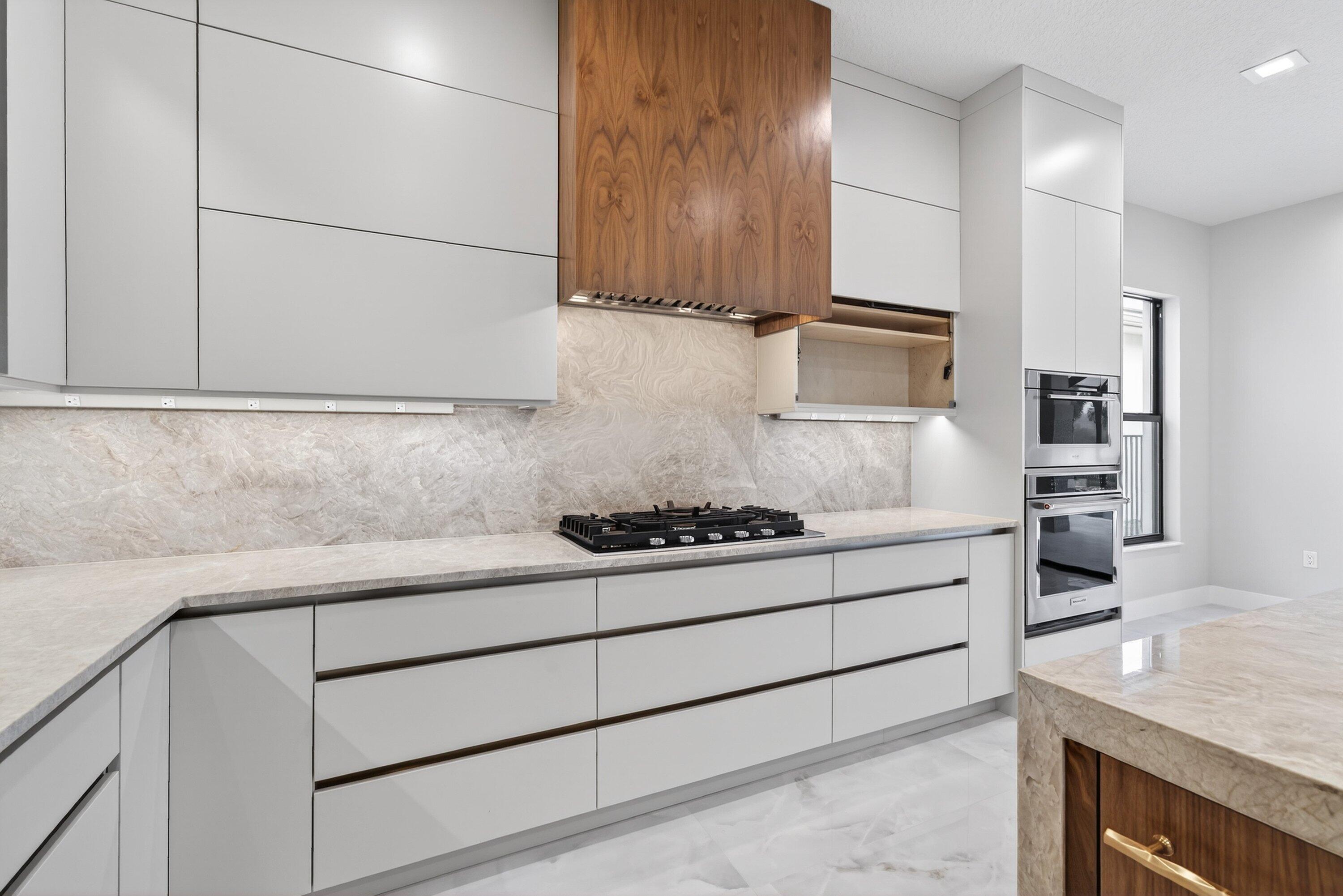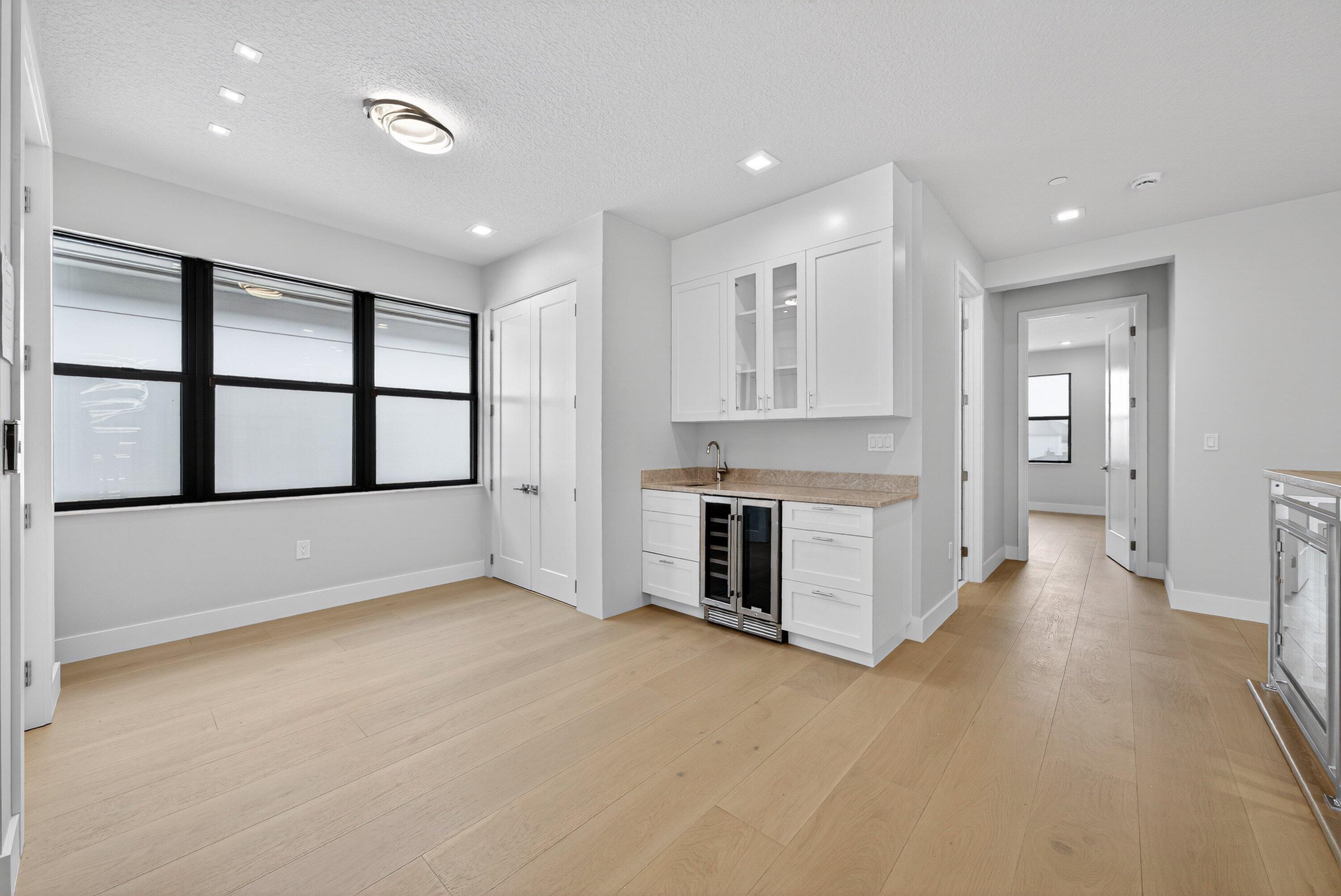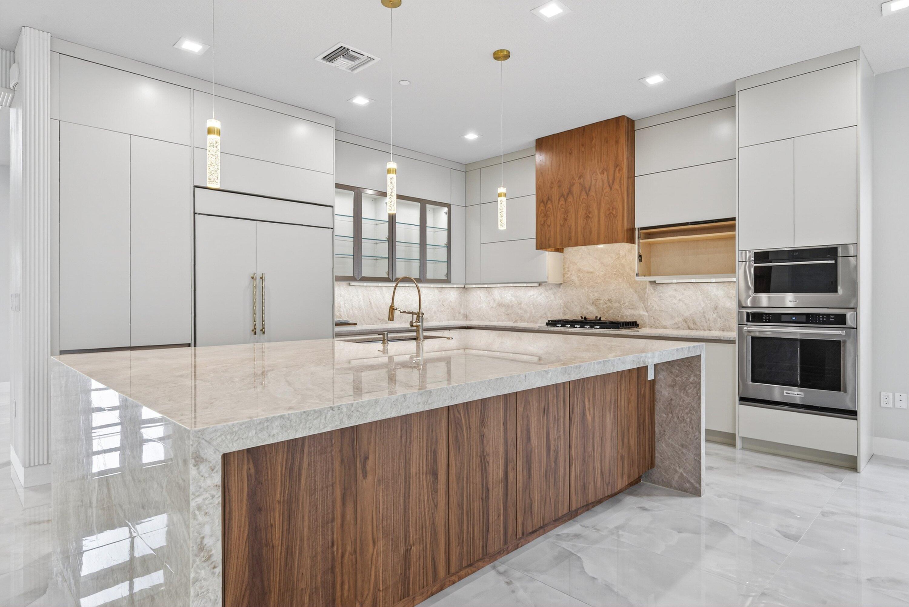 BRAND NEW Luxury residence in Apex at Avenir. This striking modern two-story 5 bedroom, 5.5 bath home offers over 5,136 square feet of impeccably designed living space, perfectly positioned on a premium lakefront homesite with beautiful water views. Exceptional upgrades and top-of-the-line finishes are showcased throughout, creating a truly elevated living experience.Upon arrival, an expansive foyer sets the tone with custom LED light fixtures, a sleek designer staircase with custom railing, and elegant panel molding extending to the second floor. Be impressed by flawless Level 5 finished walls complemented by custom paint throughoutThe chef's kitchen is a showpiece, offering custom floor-to-ceiling Kabco wood cabinetry with Designers trendy Walnut combo modern Gola design pairingeffortlessly with a dramatic Quartzite Taj Mahal waterfall island, offering ample storage and inviting snack-bar seating. A seamless quartzite backsplash with concealed outlets, maintains clean architectural lines, while gold hardware adds a touch of warmth. Professional grade Sub-Zero and Wolf appliances - including, steam and convection ovens, a 5-burner gas cooktop, and a statement hood. Two pantry options include a dedicated kitchen pantry and a spacious walk-in pantry tucked beneath the staircase. The kitchen opens effortlessly to the dining area and family room, ideal for entertaining. The family room features a custom built in with display cabinetry, remote access Linear LED electric heated fireplace and a dry bar with beverage refrigerator, blending style and function. The primary suite conveniently located on the first floor impresses with custom lighting, dual walk in custom closets, and a spa inspired bath with dual vanities, soaking tub, separate private water closets with ADA accessible sink and ADA accessible glass walk in shower showcasing three shower heads and built in seating. The home features European engineered white oak flooring and 2 x 4 porcelain tile throughout. A custom, private ADA-accessible elevator leads to the 4 upstairs bedrooms, media room and loft. A wall of glass spans the rear of the home, unveiling the grand outdoor living space. Enjoy a screened-in patio and an oversized gas heated salt water pool and spa with sun shelf framed by marble stone pavers. Built-in planters include water bibs and power sources for convenience, and the home is pre-plumbed for a future summer kitchen. Additional highlights include two laundry rooms (one on each floor) with large-capacity Electrolux appliances, a second-floor wet bar in the loft space, impact glass throughout, and a 3-car garage with epoxy flooring, workspace, and storage. Get excited for the exclusive Apex at Avenir brand new clubhouse featuring lush landscaping, picturesque walking trails, pickleball and tennis courts, state-of-the-art fitness center, elegant lobby and lounge with bar and expansive sun deck with shaded cabanas surrounding the lap pool and whirlpool spa. Additionally, a new Town Center, now under development offering shopping and dining options. Enjoy peace of mind with a 24 hr manned gate at Apex. This exceptional home is a rare offering where modern design, premium finishes, and thoughtful craftsmanship come together to create a truly elevated lifestyle in Avenir.