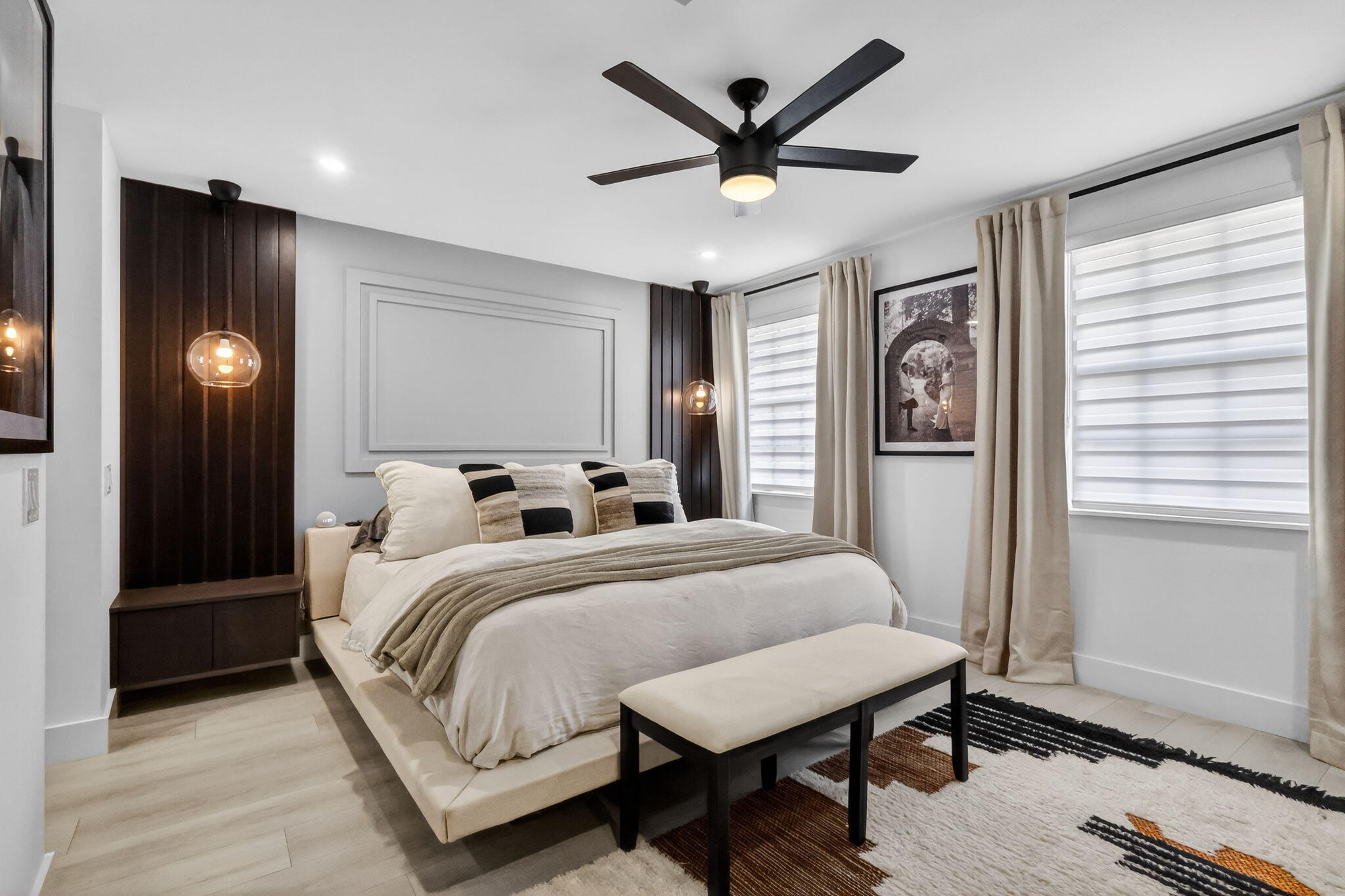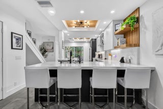WATCH the VIDEO attached to appreciate this beautifully updated and upgraded townhome in a waterfront community in east Delray Beach. A gated entrance, and intimate pet friendly community with waterfront amenities for residents.This beautiful home was Recreated from a three bedroom to 2 bedrooms creating a larger primary and a second bedroom. Renovated with high end finishes. A home with solid core doors, designer cabinetry with pull outs, Quartz countertops, custom lighting, and all new appliances. The Open kitchen and expanded dining area is a great place for entertaining and has a stunning Custom ceiling with wood coffers. Gorgeous 24 x 48 porcelain tile on first floor and high baseboard moldings. Luxury Laminate wood flooring upstairs. Relax outside and BBQ on your private patio. Bathrooms have new tile and vanities, the primary bedroom has a built-in wall unit, nightstands and decorative wall paneling. Hurricane Impact sliders on patio. New plumbing pipes added in kitchen and powder bath and both upstairs baths, Ac unit replaced in 2021. New light fixtures throughout. Some furnishings can be included. It's a wow of a home and fantastic location close to Downtown Delray, Atlantic Avenue, shopping, dining and the Beach! The current HOA fee is $531 and the rental restrictions are: rent once per year, cannot rent for the first year of ownership and can lease minimum of 6 months