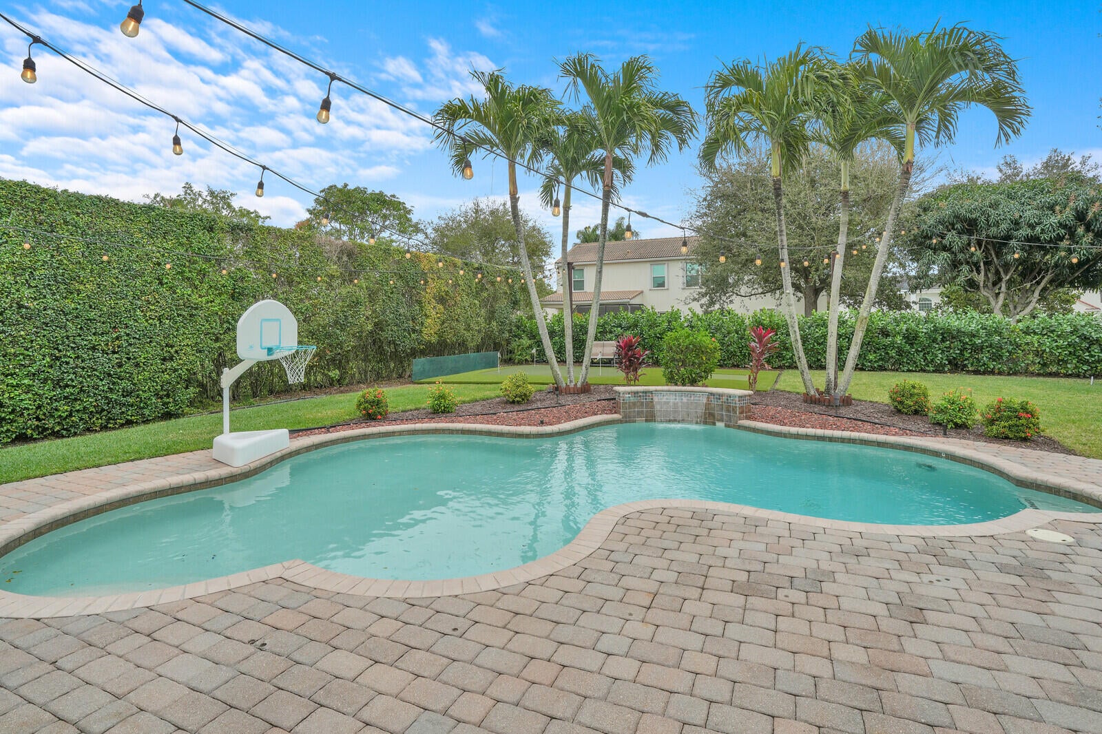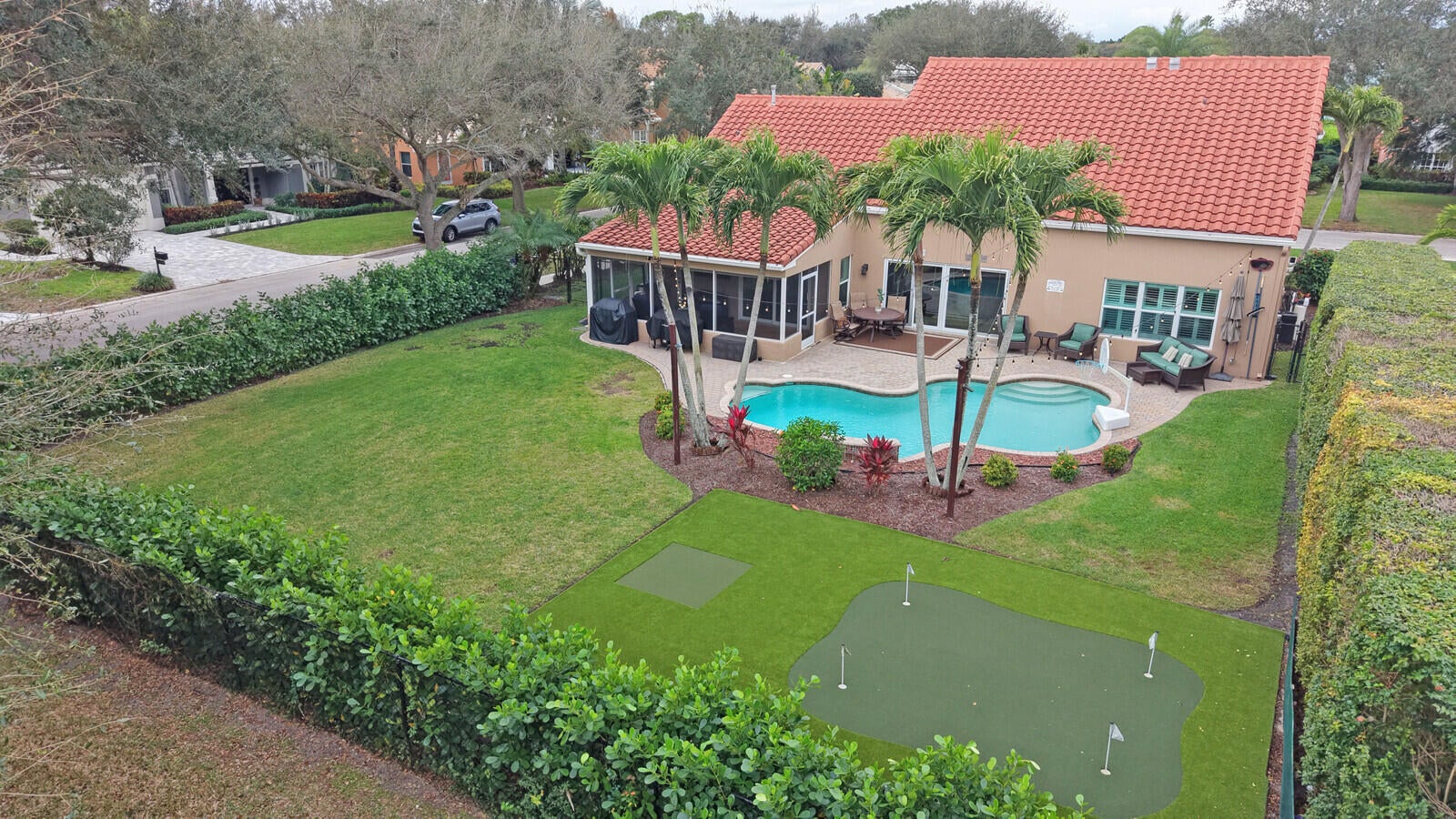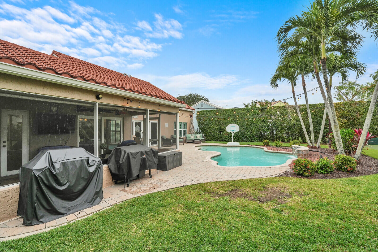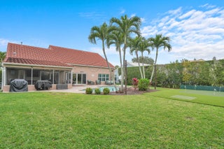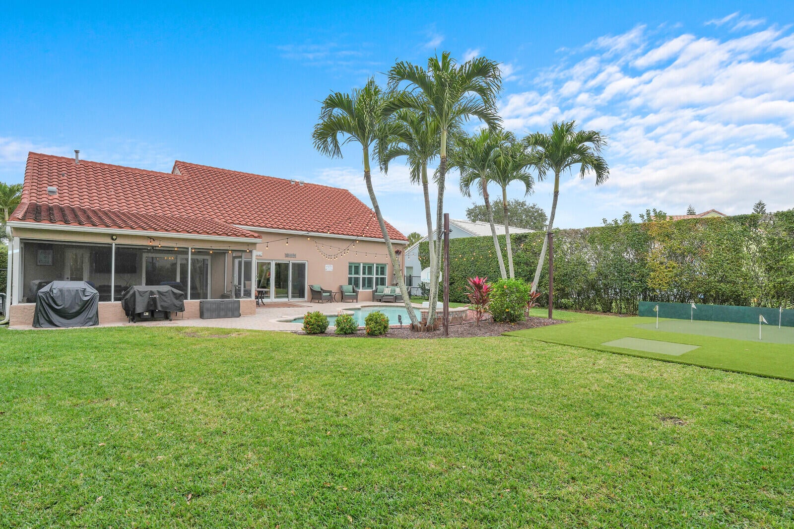 One of Palm Beach Gardens' best kept secrets, The Hunt Club. A community where neighbors connect and a true sense of community is felt. A beautiful gated community in the heart of town. This well-maintained home sits on a premium ⅓-acre corner lot at the end of a cul-de-sac, offering exceptional privacy and lush landscaping. The backyard is a true retreat with a resort-style pool featuring the relaxing sound of a waterfall, pool heater, landscape lighting, screened patio, putting green, and fenced yard, perfect for relaxing or entertaining.Inside, the home features PGT impact windows, high ceilings, plantation shutters, custom built-ins, and automated blinds at the rear slider. The open kitchen offers a gas stove and custom cabinetry, ready to be designed into your dream space.The primary suite is conveniently located on the first floor, along with full cabana bath ideal for guests or easy pool access, plus a flexible office or playroom. Upstairs offers three additional bedrooms and a spacious bonus room ideal for an office or playroom. Additional upgrades include a 2019 roof, paver driveway, and beautifully maintained clusia hedge. This home blends comfort, privacy, and location, an exceptional opportunity in Palm Beach Gardens.