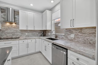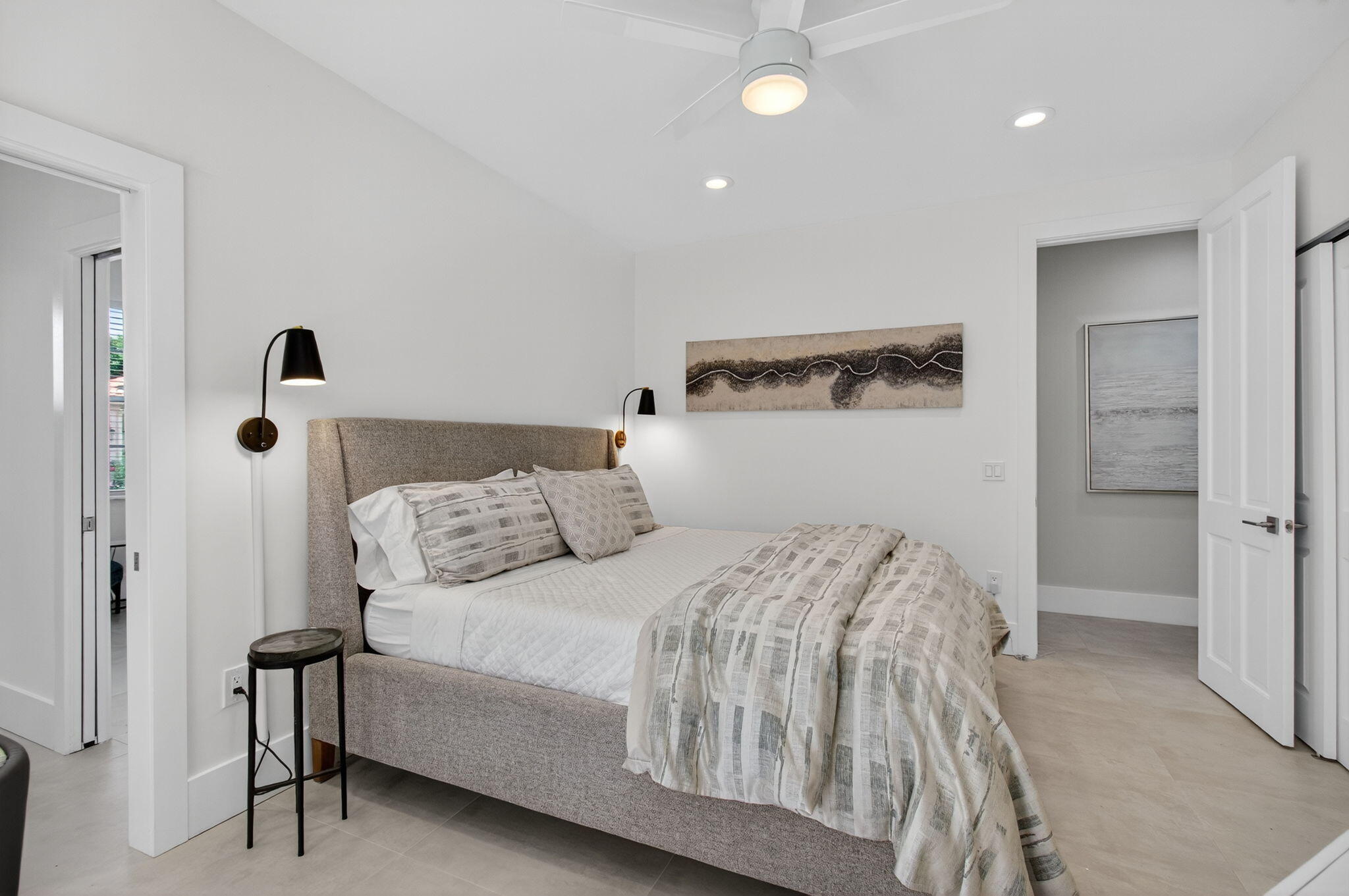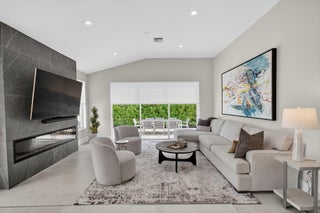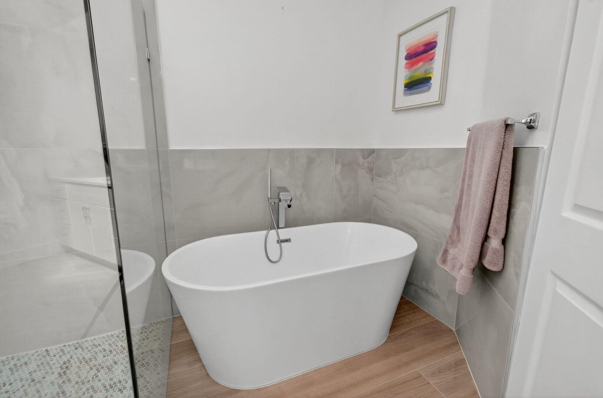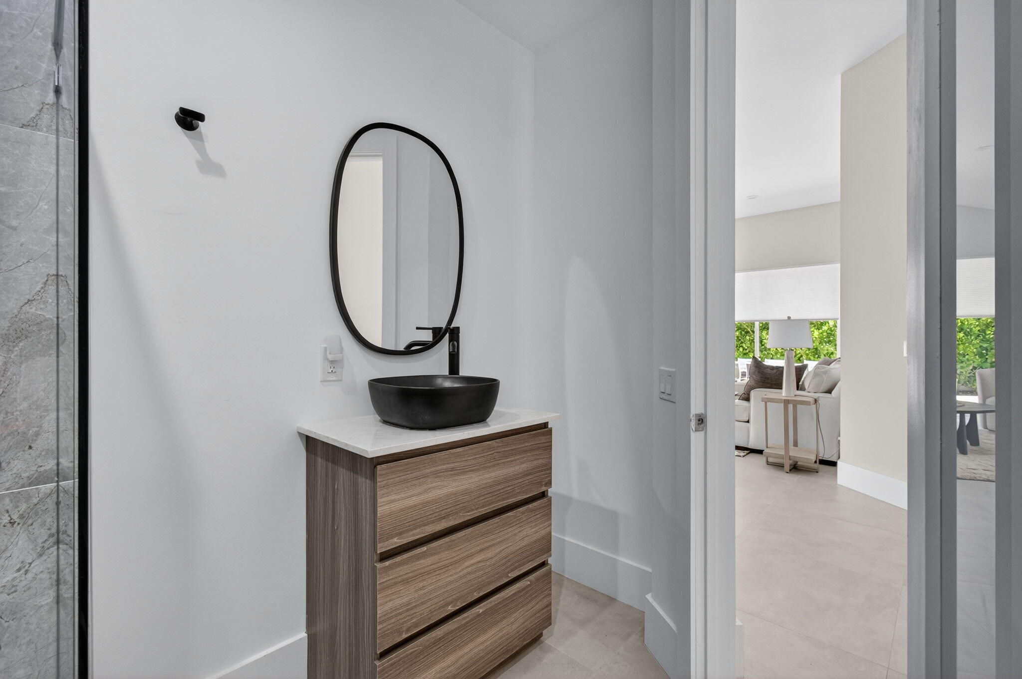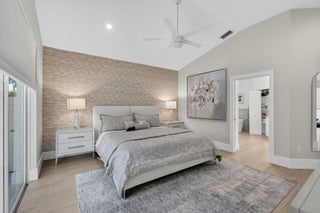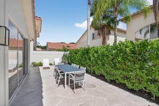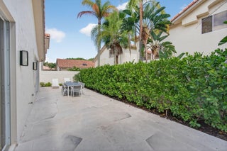 Discover this beautifully renovated single-story 3-bedroom, 3-bath home in the highly sought-after village of Laurel Pointe in Broken Sound Country Club. Designed with modern elegance, this residence features smooth walls, porcelain tile floors, and vaulted ceilings throughout. The open-concept kitchen and living room create a welcoming space for everyday living and entertaining. The kitchen showcases white cabinetry, a spacious center island with abundant storage, and a built-in beverage cooler. Retreat to the primary suite, complete with vaulted ceilings, a large walk-in closet, and a luxurious en suite bath featuring a large skylight, free-standing soaking tub, and frameless glass shower. Two additional bedrooms and baths offer comfort and privacy for family or guests. Stepoutside to your enclosed backyard oasis with fresh landscaping and newly finished patio decking, perfect for outdoor entertaining. Enjoy the convenience of being within walking distance to the recently renovated, heated community pool. This move-in-ready home combines sophisticated style, indoor-outdoor living, and an ideal location within Broken Sound Country Club.