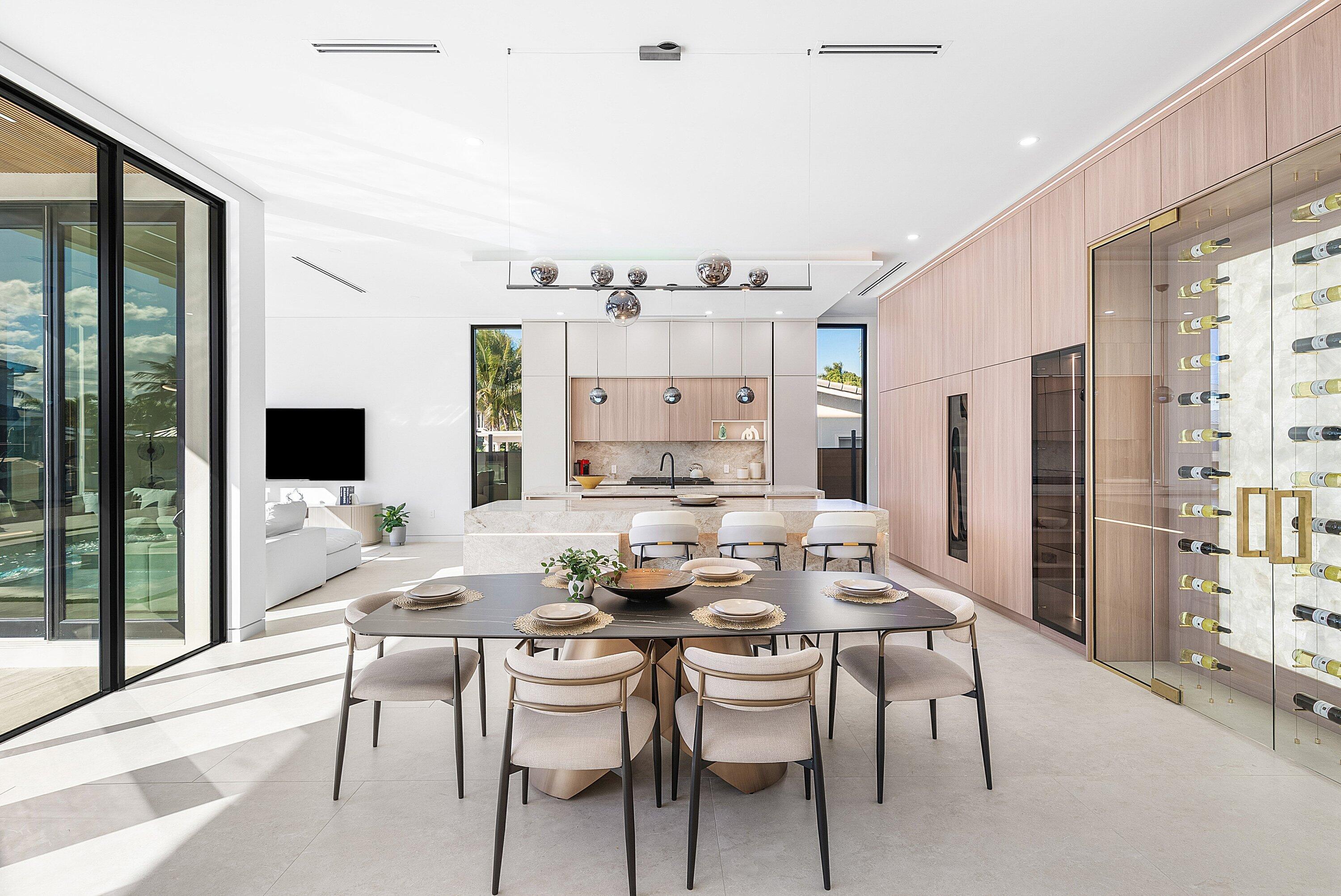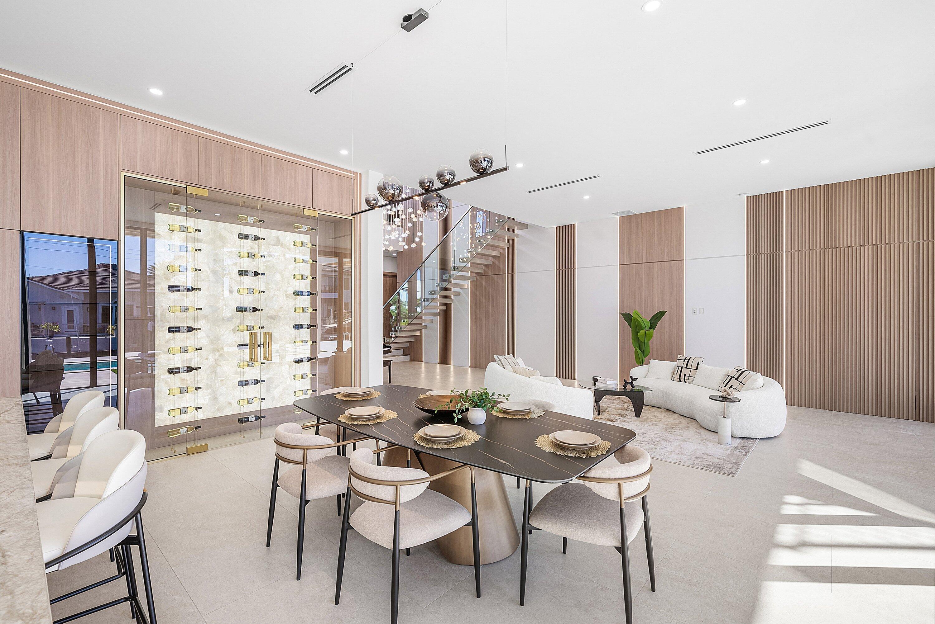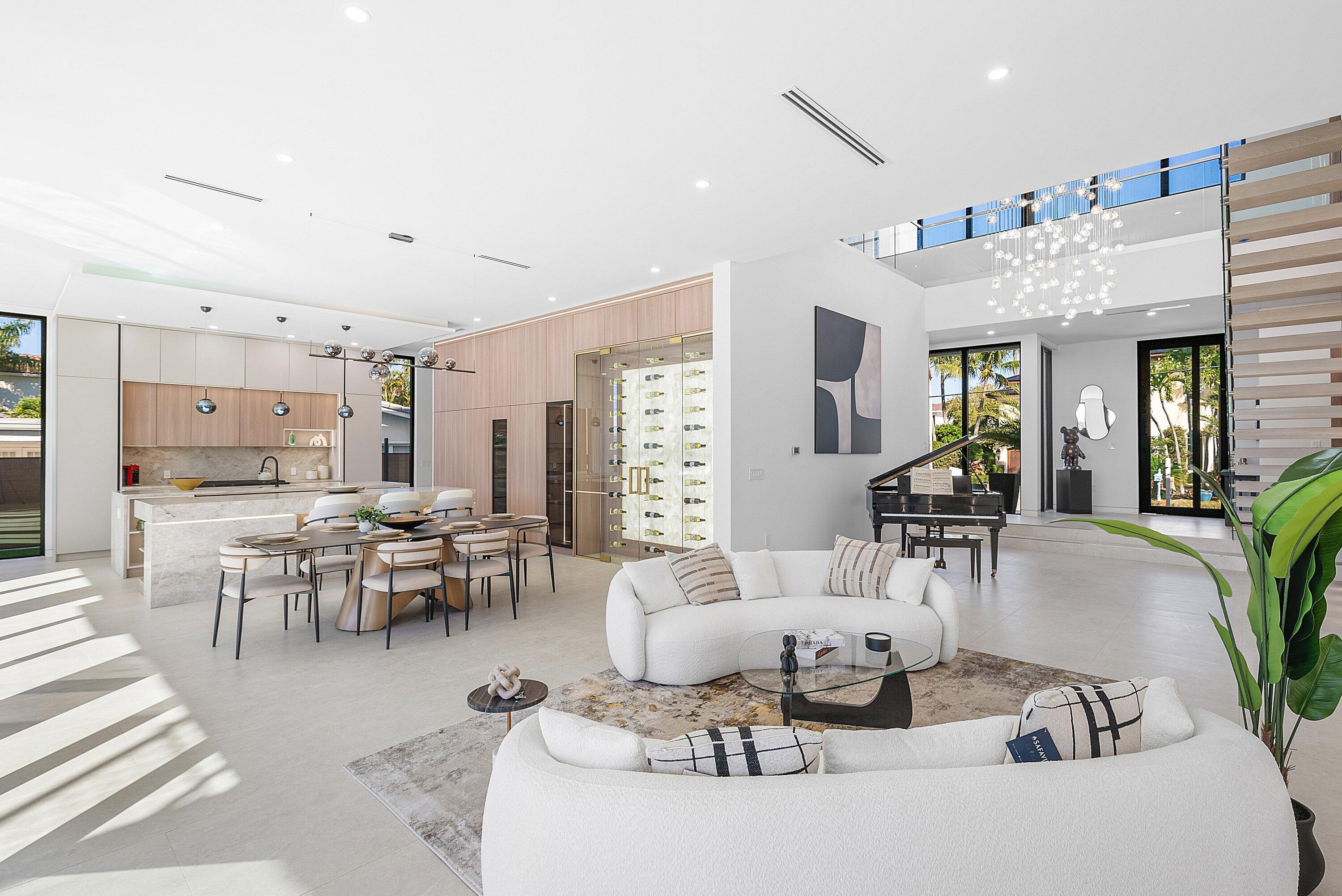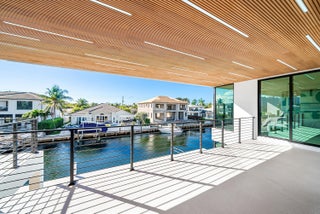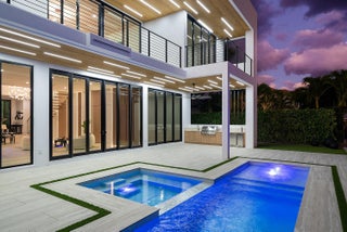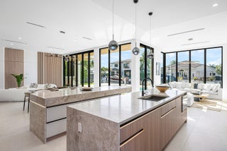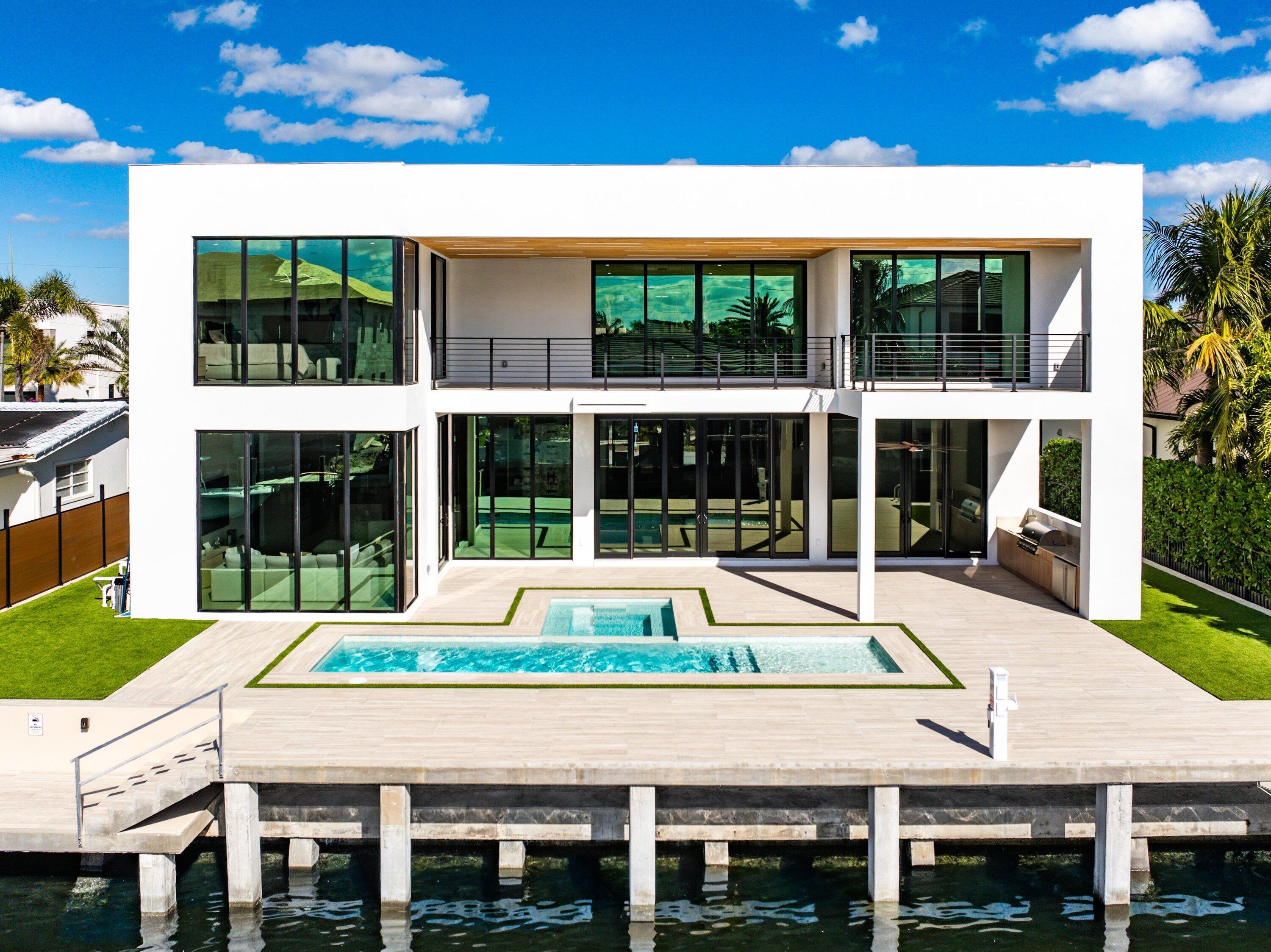 Now complete and move-in ready, 750 NE 69th Street is a striking modern waterfront residence located in Boca Harbor, Boca Raton's premier boating community, offering quick and direct access to the Boca Raton Inlet. This 5-bedroom, 5.5-bathroom estate features 85 feet of deep-water frontage, no fixed bridges, and coveted southern exposure, delivering an exceptional waterfront lifestyle. A dramatic floating staircase, accented by an artistic statement feature wall, creates an immediate architectural impact. Interiors are finished with wide-plank European oak flooring and enhanced by an extensive designer lighting package, including illuminated onyx countertops, LED strip lighting accenting ceiling details, and custom wall inlays that create a warm, architectural glow throughout the home.The modern European kitchen is designed for both form and function, featuring Thermador appliances, a built-in wine cooler, and an impressive double-island layoutperfectly complemented by the home's ambient lighting design. The first-floor clubroom/guest suite is thoughtfully designed with custom wood paneling and a concealed hidden door, offering a sophisticated and flexible space ideal for guests, a private lounge, or media room. The primary suite is a private retreat, highlighted by a spa-inspired wet-room shower, premium Hansgrohe fixtures, and expansive walk-in closets. All closets throughout the homeincluding the primaryhave been professionally built out, providing exceptional storage and organization. All additional bedrooms are ensuite, ensuring privacy and comfort for family and guests. Outdoors, enjoy true South Florida waterfront living with a heated pool and in-ground spa, enhanced by turf accents and luxury landscaping, all overlooking the serene waterway. A brand-new concrete dock with power and water completes the offeringideal for accommodating large vessels and embracing Boca Harbor's premier boating lifestyle. Just minutes from Boca Raton's beaches, dining, and premier amenities, this newly completed estate delivers modern design, superior craftsmanship, and an unmatched boating lifestyle.
