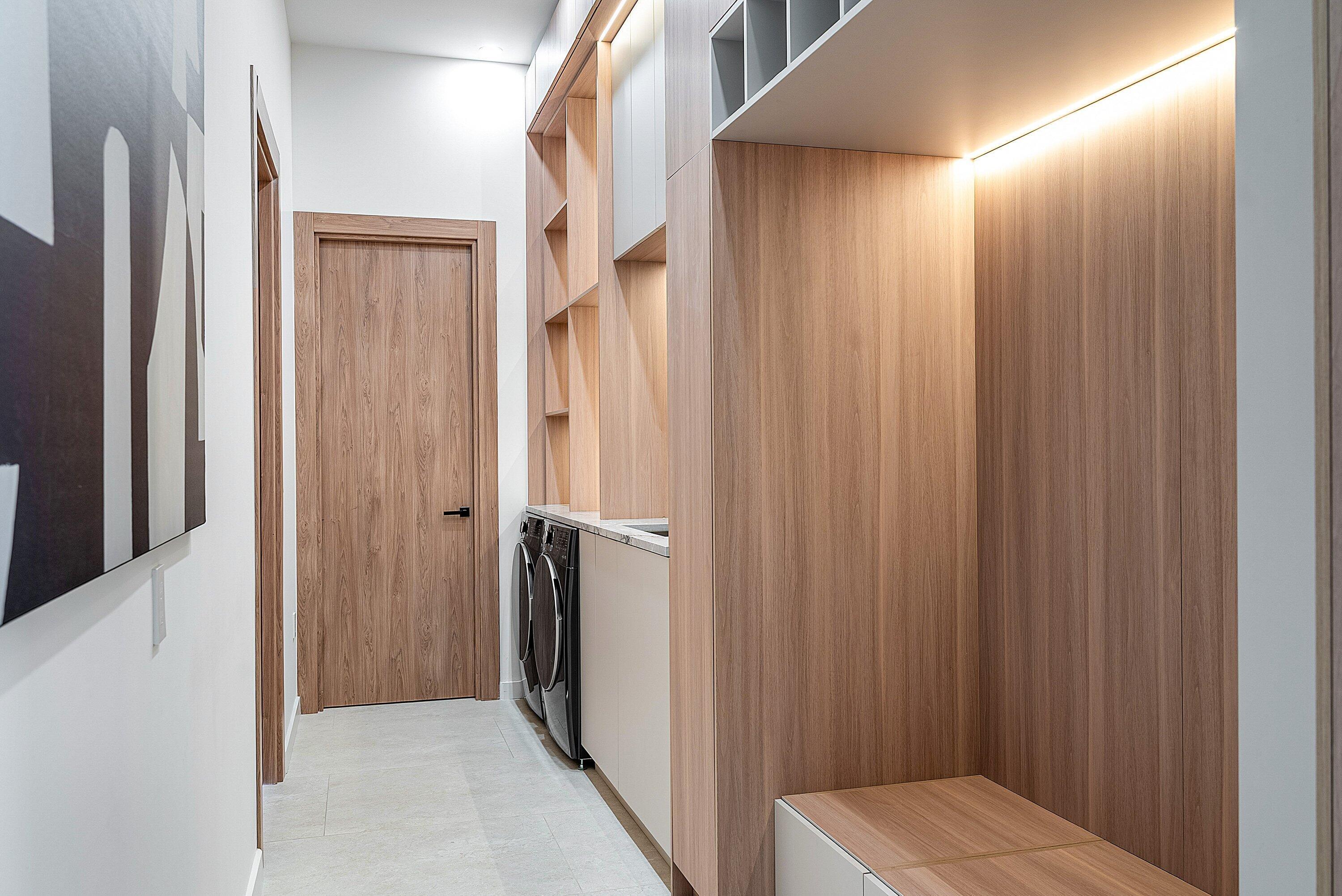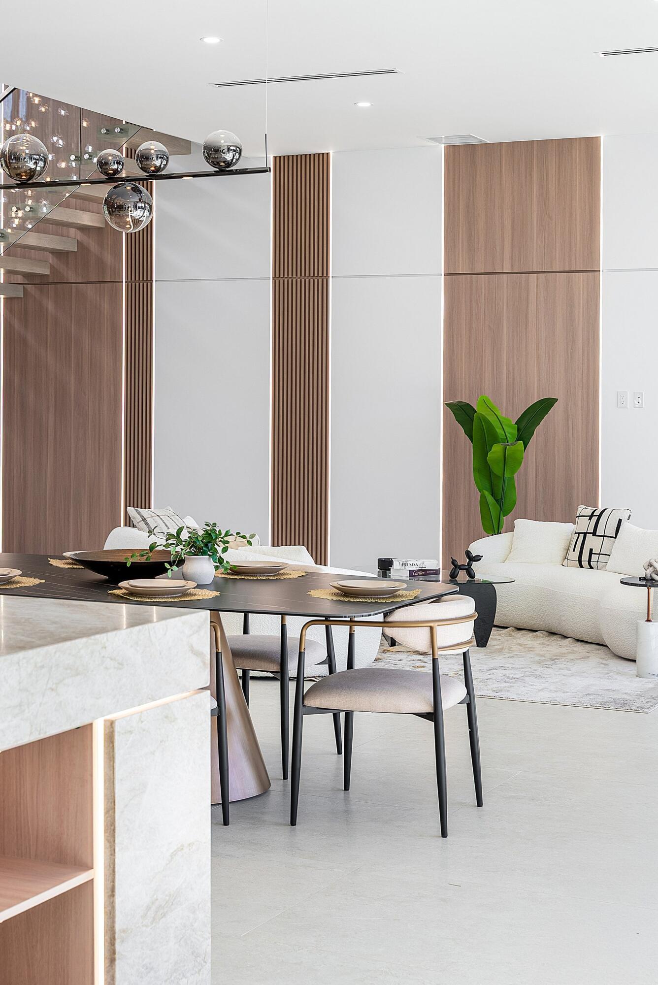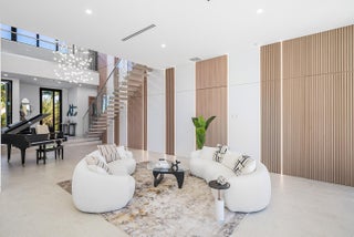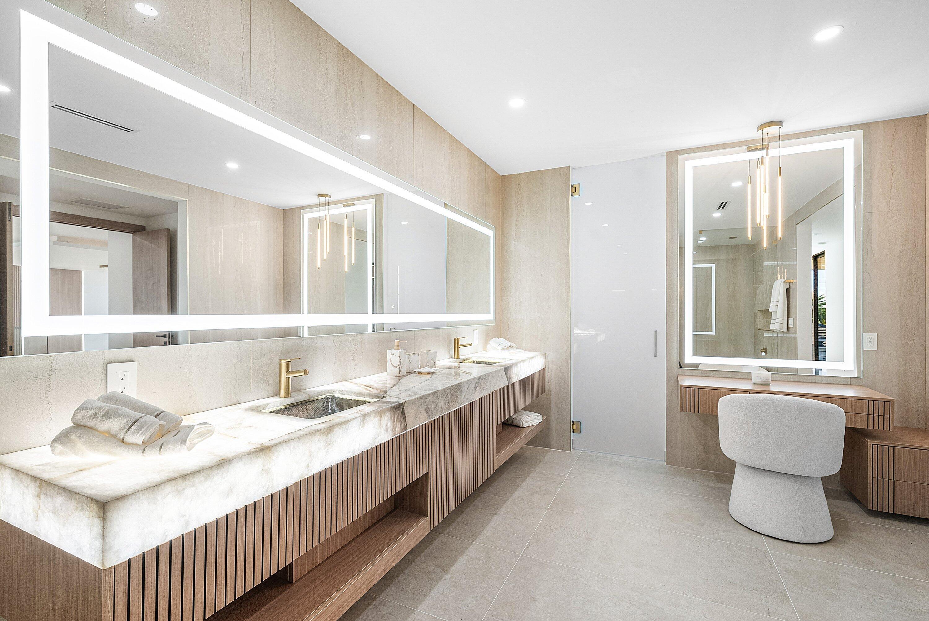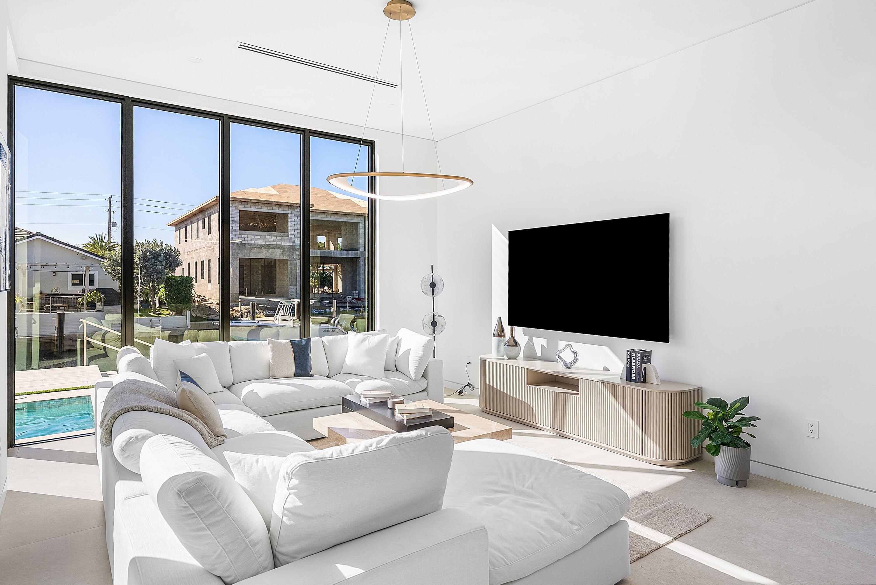 Now complete and move-in ready, 750 NE 69th Street is a striking modern waterfront residence located in Boca Harbor, Boca Raton's premier boating community, offering quick and direct access to the Boca Raton Inlet. This 5-bedroom, 5.5-bathroom estate features 85 feet of deep-water frontage, no fixed bridges, and coveted southern exposure, delivering an exceptional waterfront lifestyle. A dramatic floating staircase, accented by an artistic statement feature wall, creates an immediate architectural impact. Interiors are finished with wide-plank European oak flooring and enhanced by an extensive designer lighting package, including illuminated onyx countertops, LED strip lighting accenting ceiling details, and custom wall inlays that create a warm, architectural glow throughout the home.The modern European kitchen is designed for both form and function, featuring Thermador appliances, a built-in wine cooler, and an impressive double-island layoutperfectly complemented by the home's ambient lighting design. The first-floor clubroom/guest suite is thoughtfully designed with custom wood paneling and a concealed hidden door, offering a sophisticated and flexible space ideal for guests, a private lounge, or media room. The primary suite is a private retreat, highlighted by a spa-inspired wet-room shower, premium Hansgrohe fixtures, and expansive walk-in closets. All closets throughout the homeincluding the primaryhave been professionally built out, providing exceptional storage and organization. All additional bedrooms are ensuite, ensuring privacy and comfort for family and guests. Outdoors, enjoy true South Florida waterfront living with a heated pool and in-ground spa, enhanced by turf accents and luxury landscaping, all overlooking the serene waterway. A brand-new concrete dock with power and water completes the offeringideal for accommodating large vessels and embracing Boca Harbor's premier boating lifestyle. Just minutes from Boca Raton's beaches, dining, and premier amenities, this newly completed estate delivers modern design, superior craftsmanship, and an unmatched boating lifestyle.