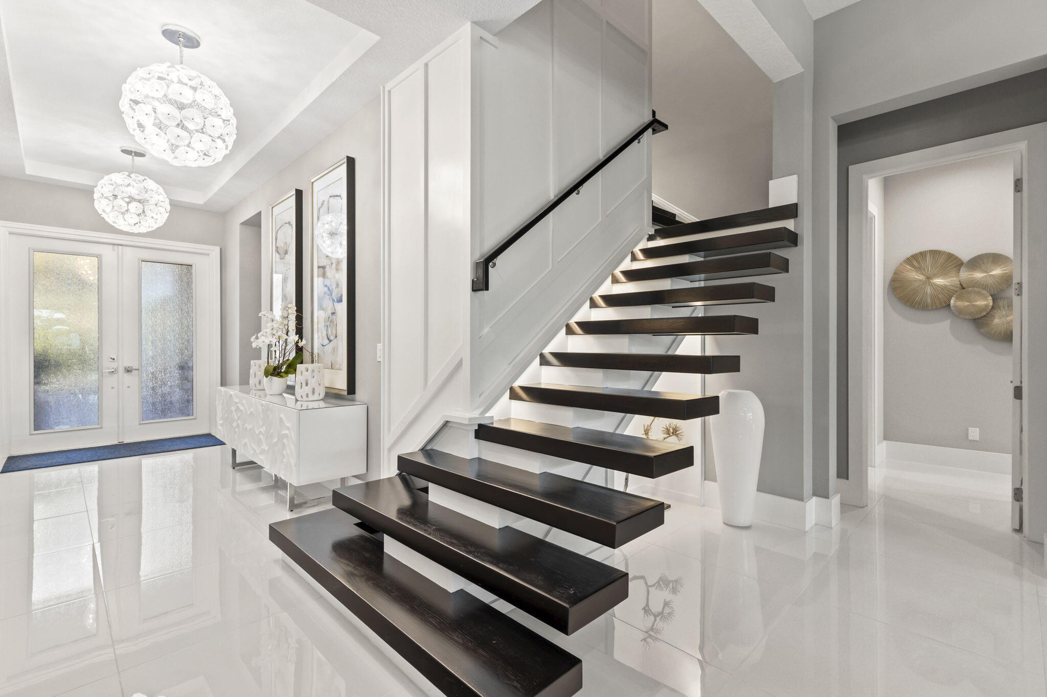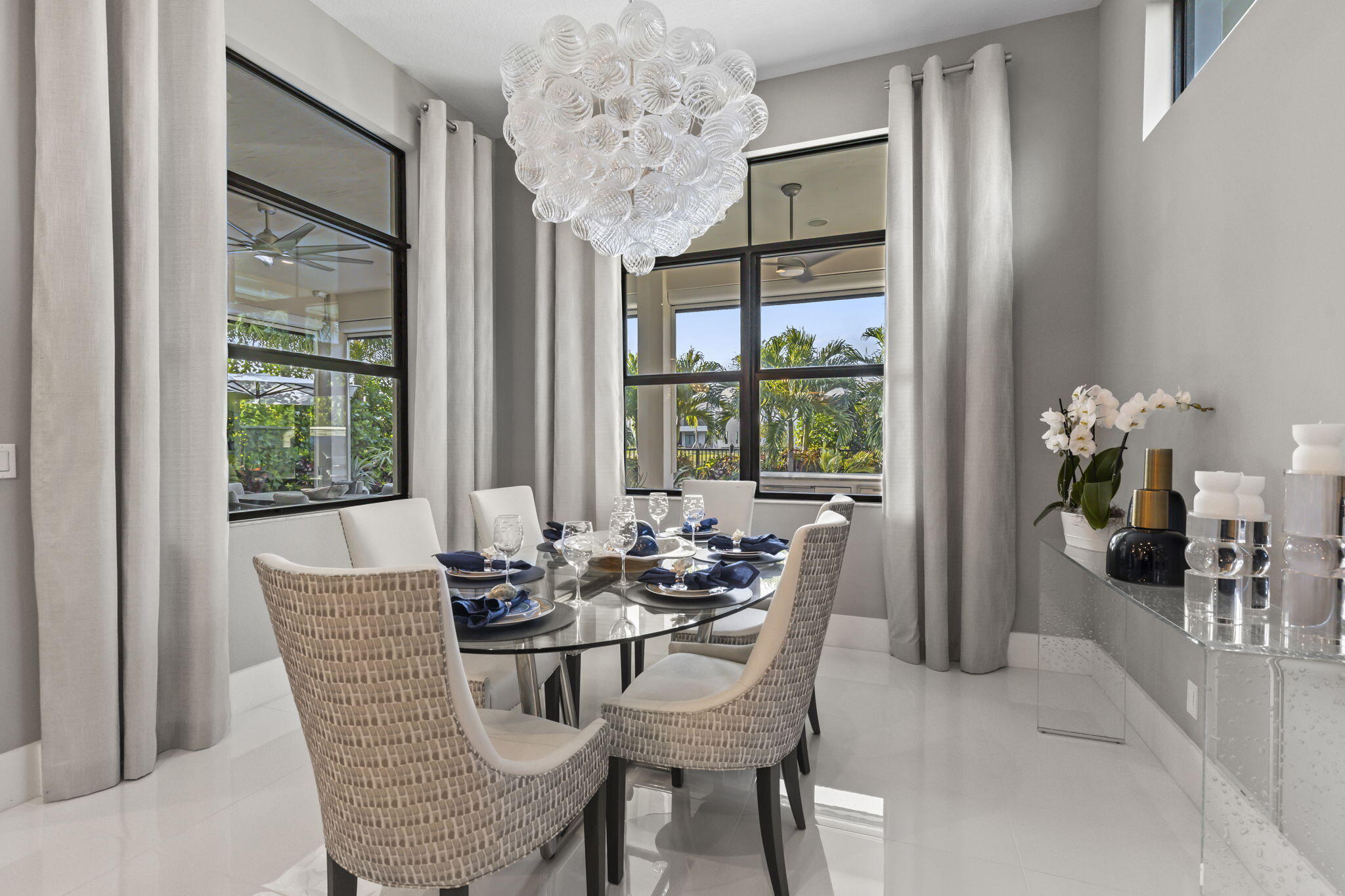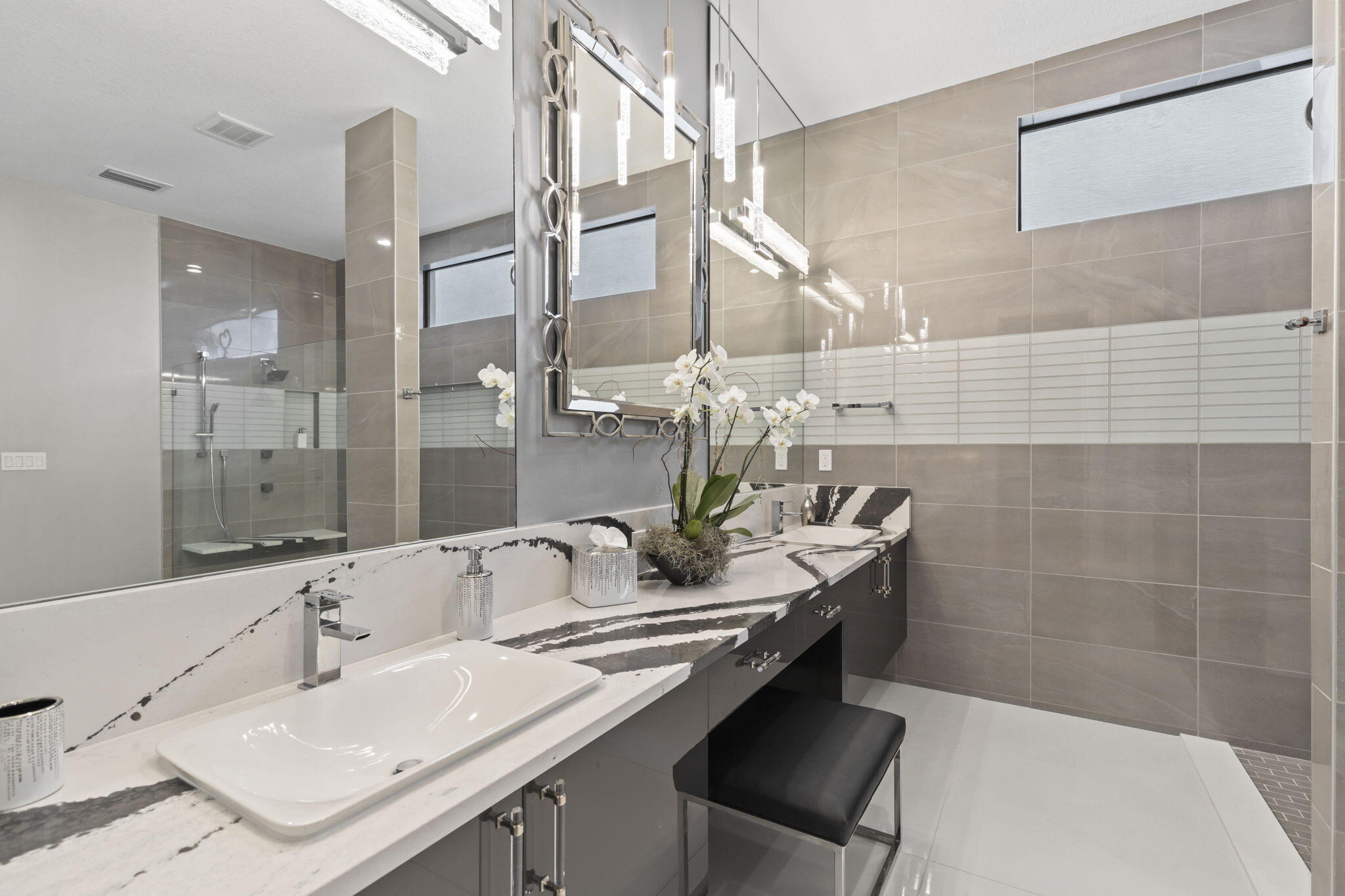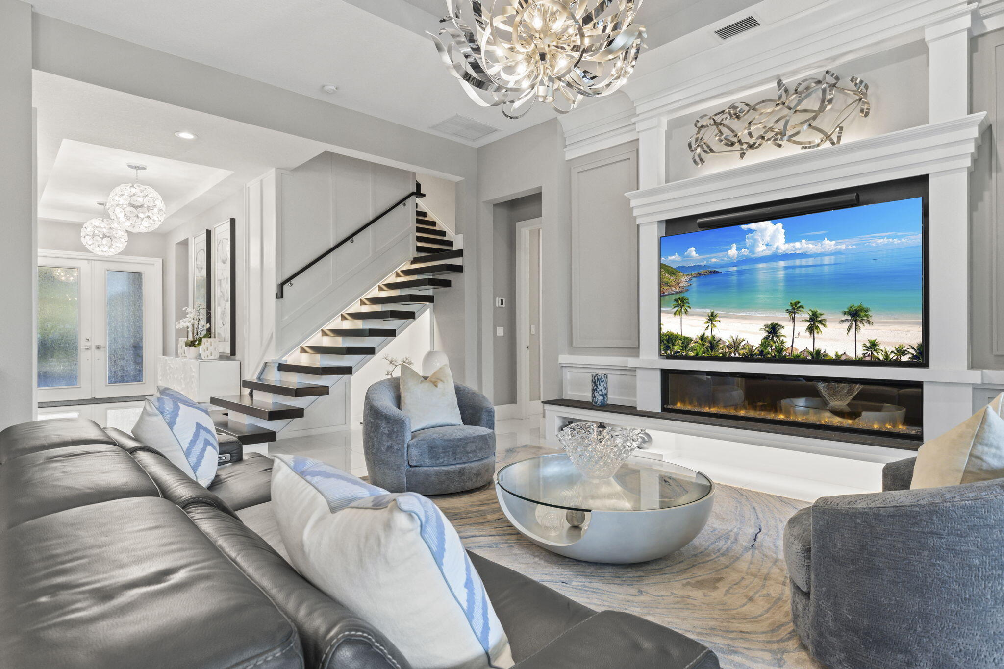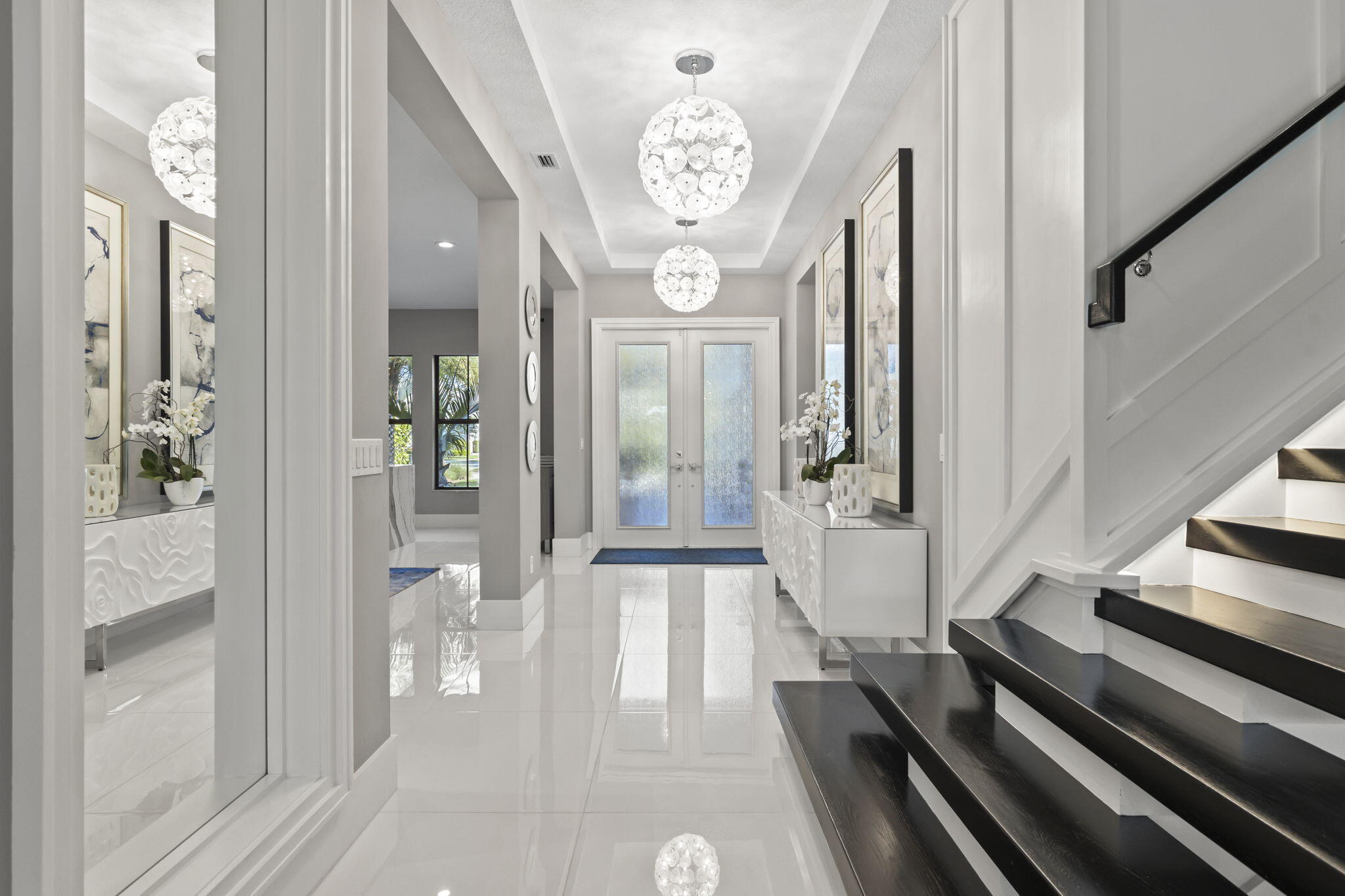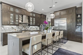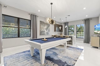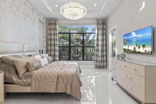 Stunning 4-bedroom, 5-bathroom lakefront estate home in prestigious gated Artistry. Meticulously upgraded and professionally designed with entertaining in mind, this luxurious residence seamlessly blends modern elegance with functional living. This home makes a bold impression. The main-level entertainment room features a sleek waterfall-edge wet bar with a wine refrigerator, perfect for hosting guests. The open-concept chef's kitchen is the heart of the home, showcasing an oversized island, gas range with pot filler, side-by-side refrigerator and freezer, and top of the line wall ovens, designed for culinary performance and style. The family room is anchored by a dramatic floating staircase and a custom fireplace wall with rich millworkThe first-floor master suite is a peaceful retreat with a spa-inspired bathroom, an oversized shower, double vanities and his and hers walk in closets. A first-floor office/den offers flexible space and could easily function as a fifth bedroom. On the second floor, three generous sized bedrooms with en-suite baths, and walk-in closets, while additional flex space for media room, play room provide comfort and privacy for family and guests. Expansive sliding glass doors open to a covered Lanai and tropical backyard oasis centered around a resort-style pool and spa, brand-new custom fire pit, a gourmet summer kitchen, powered screens creating effortless indoor outdoor entertaining year round. Enjoy serene lake views in complete comfort and privacy. No expense has been spared, designer upgrades featuring impressive chandeliers, unique wallcoverings and custom window treatments. Enjoy the three air-conditioned garages with a fitness room. Situated on an oversized lakefront corner lot and surrounded by lush landscaping, this home offers privacy in a vibrant, amenity-rich community. Community amenities include a state-of-the-art clubhouse, fitness center, resort-style pool with cabanas, indoor/outdoor social space, basketball court, bocce ball, a shaded playground, scenic walking trails, and 24/7 manned gate. Ideally located just minutes from top-rated schools, premier shopping, dining, and beautiful beaches, Artistry combines modern living with an active community atmosphere.