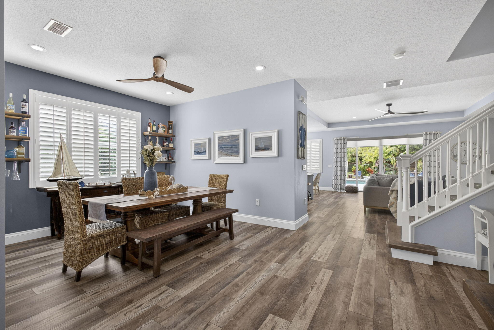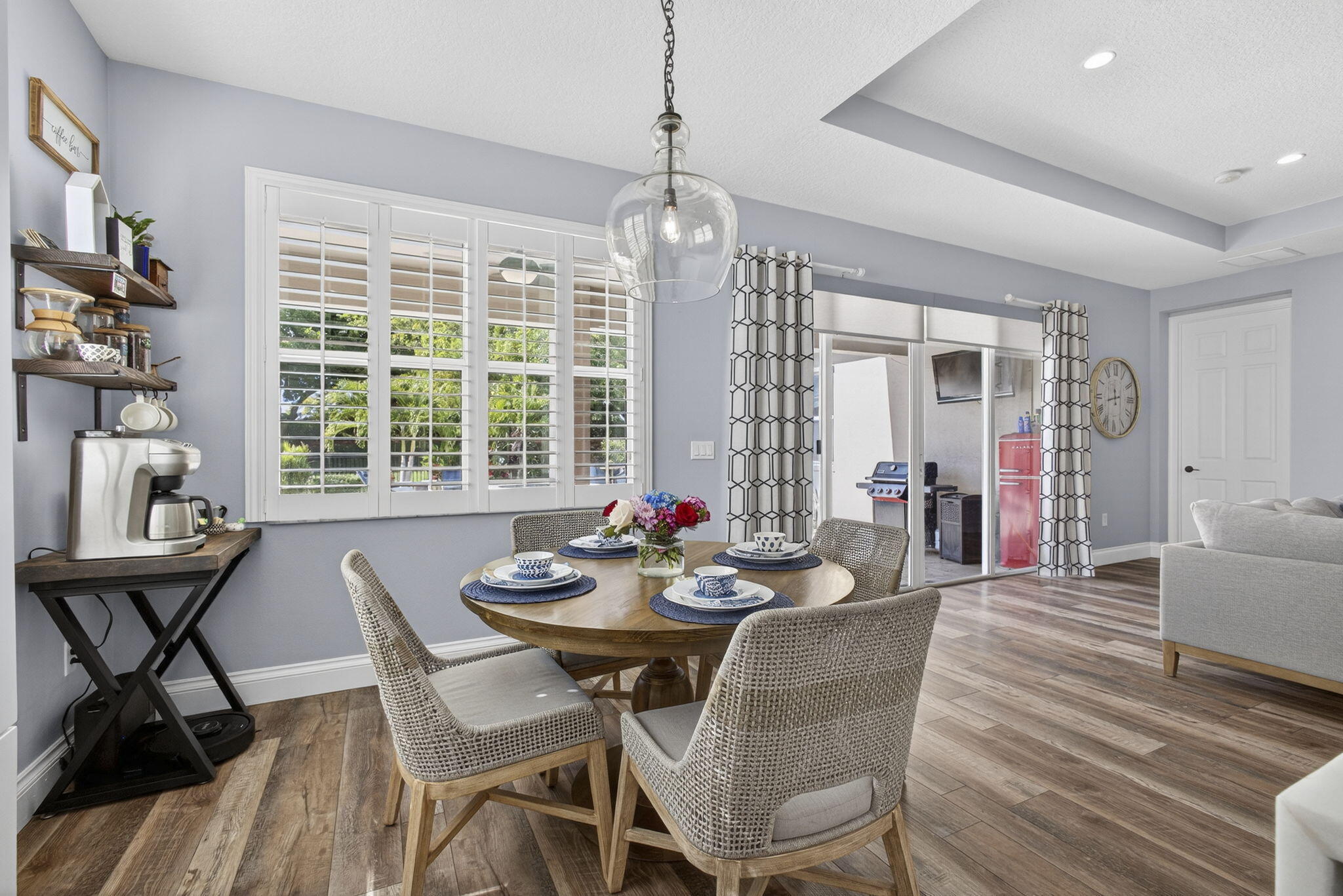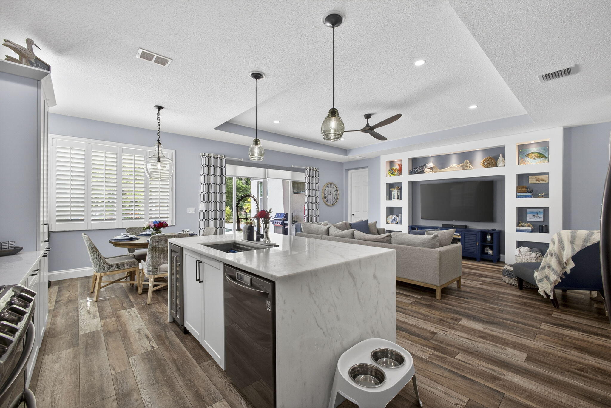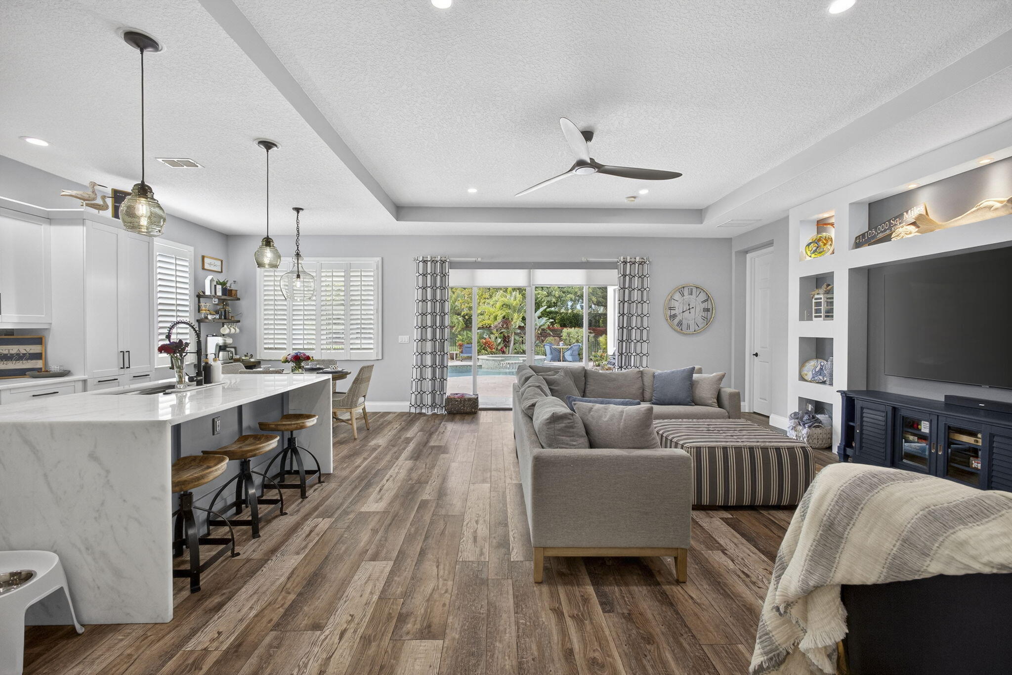 Situated on one of the largest and most private cul-de-sac lots in Portosol, this move-in-ready 4/3 home offers exceptional space and privacy with no rear neighbors and an expansive fenced yard. Coastal design, LVP flooring throughout, and numerous renovations create a warm, turnkey feel. The first floor features a spacious primary suite and guest bedroom, with two additional bedrooms and bath upstairs. The kitchen boasts quartz countertops, large island, pantry, wine chiller, and coffee bar overlooking the heated saltwater pool and spa. Outdoor TV conveys. Retractable awning, ample deck and grass space. Resort-style amenities, great schools, and close to shopping, dining, Wellington horse farms, and Loxahatchee nurseries.