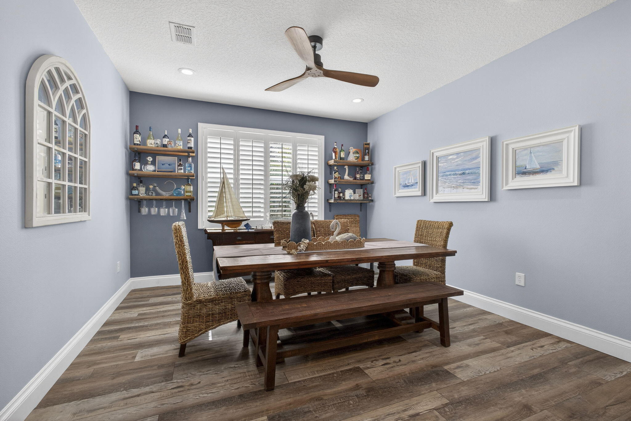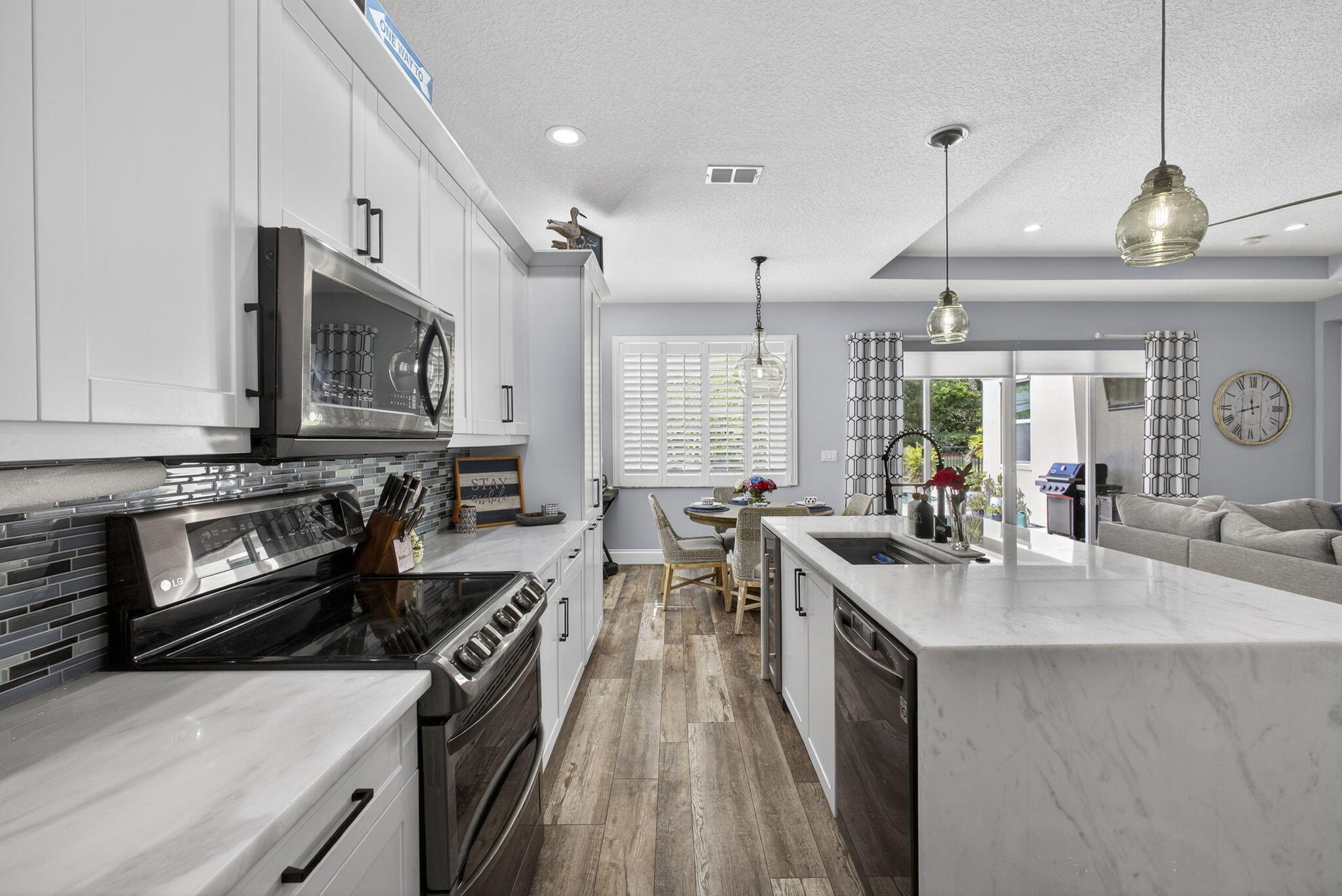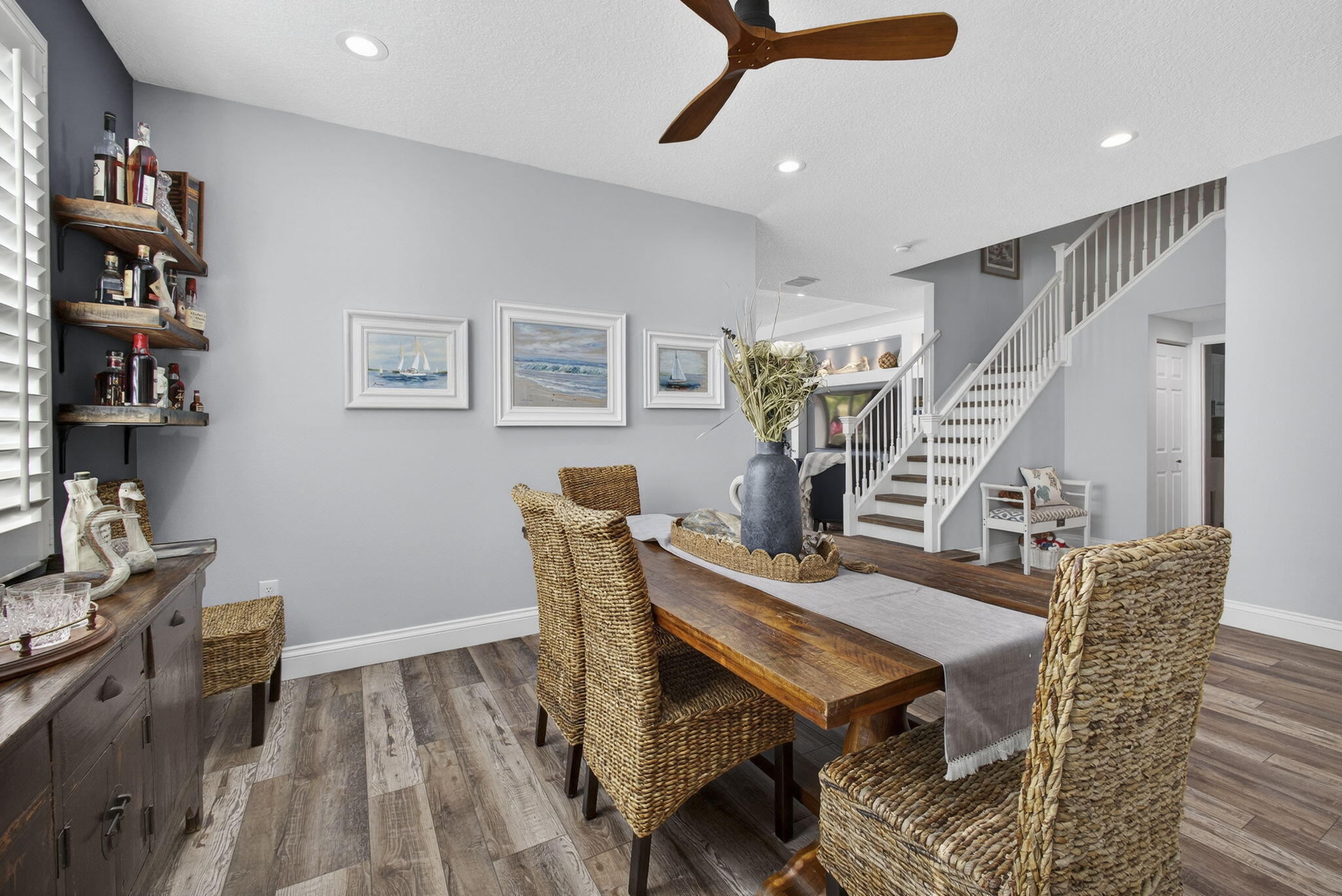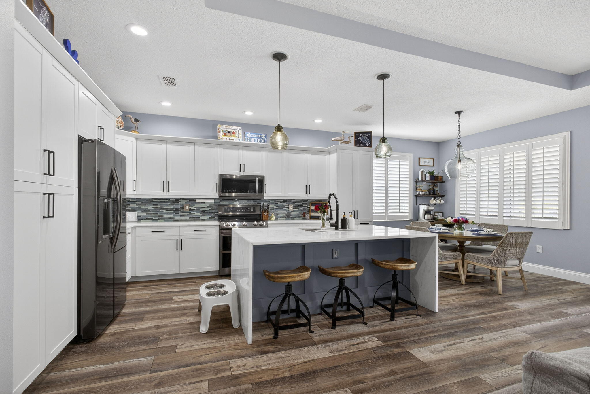 Situated on one of the largest and most private cul-de-sac lots in Portosol, this move-in-ready 4/3 home offers exceptional space and privacy with no rear neighbors and an expansive fenced yard. Coastal design, LVP flooring throughout, and numerous renovations create a warm, turnkey feel. The first floor features a spacious primary suite and guest bedroom, with two additional bedrooms and bath upstairs. The kitchen boasts quartz countertops, large island, pantry, wine chiller, and coffee bar overlooking the heated saltwater pool and spa. Outdoor TV conveys. Retractable awning, ample deck and grass space. Resort-style amenities, great schools, and close to shopping, dining, Wellington horse farms, and Loxahatchee nurseries.