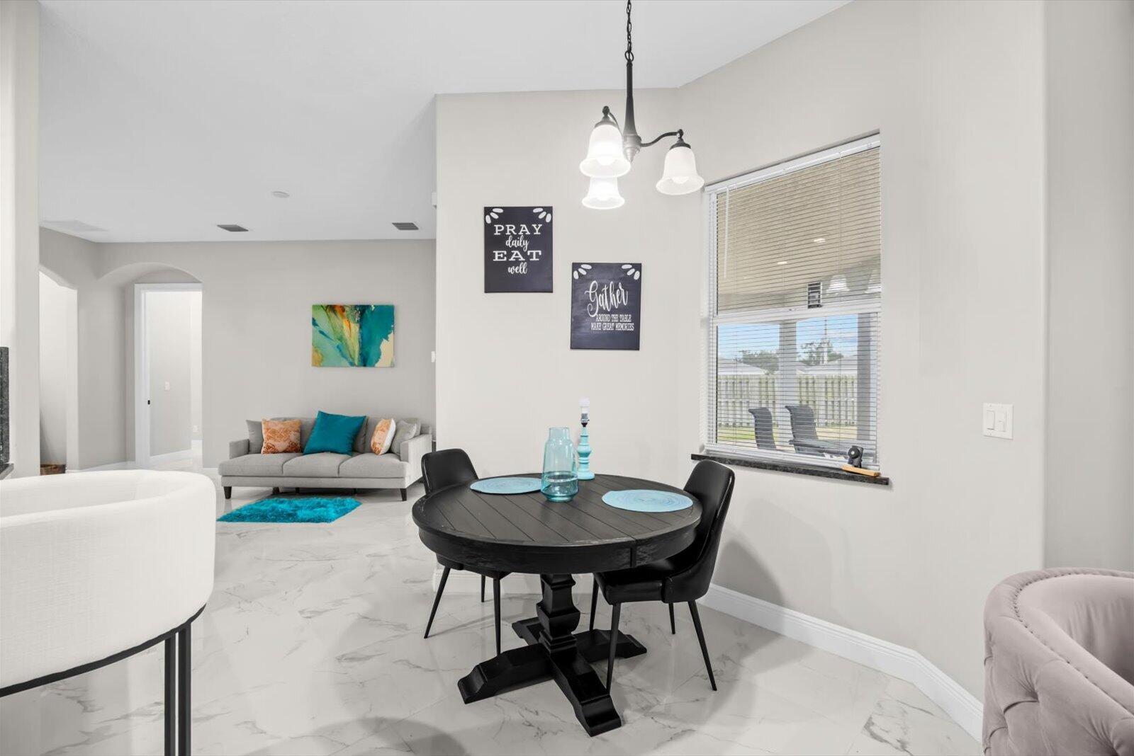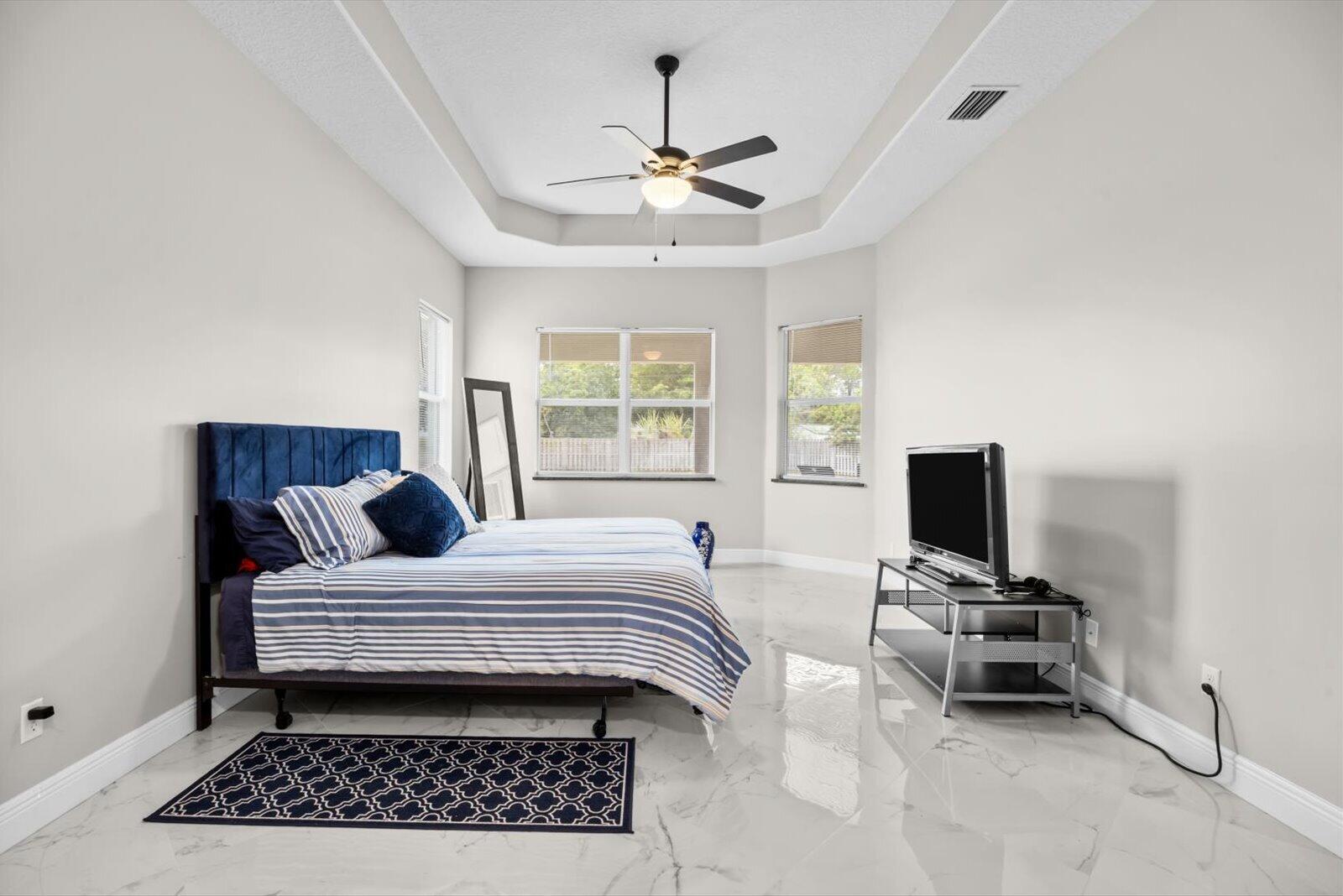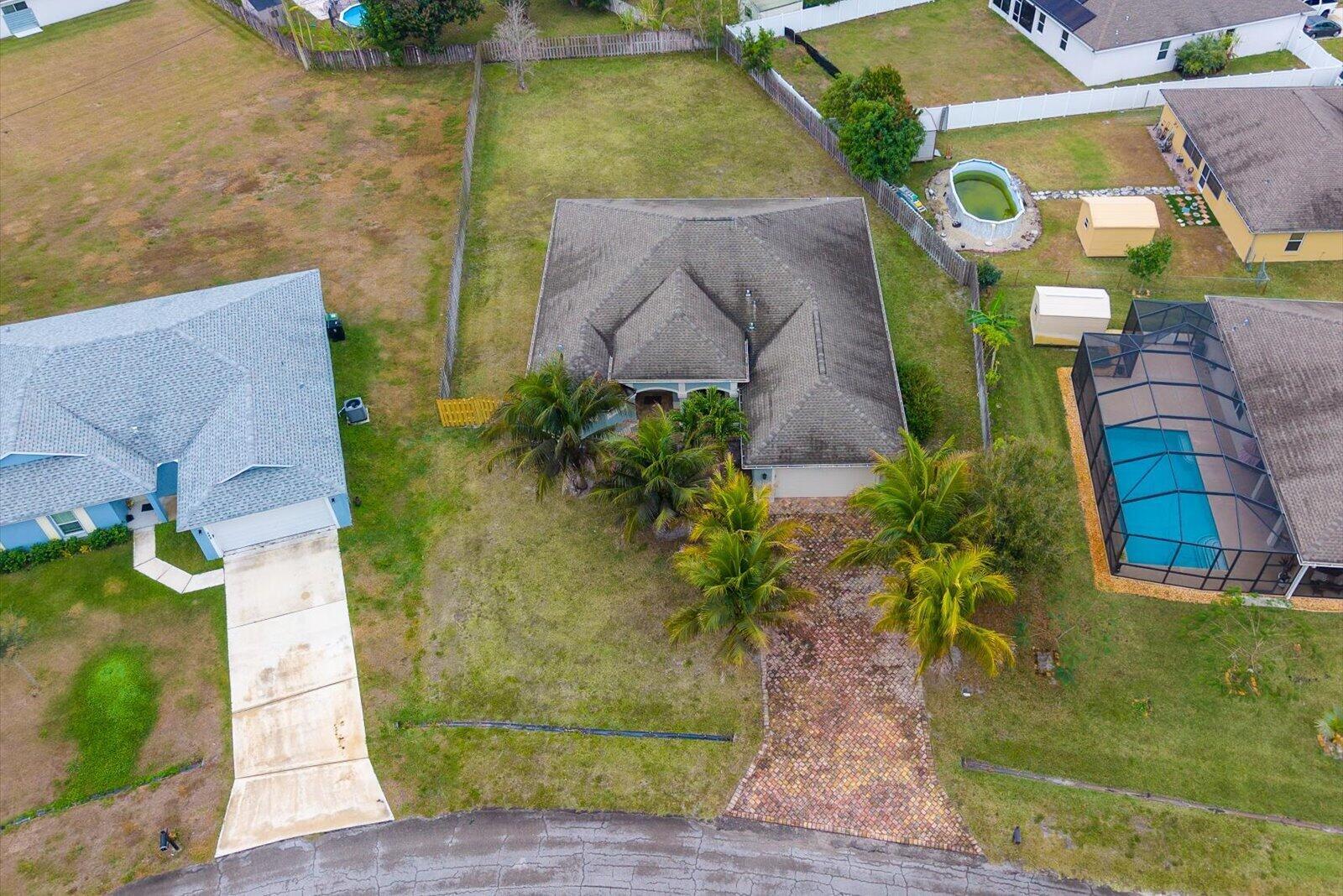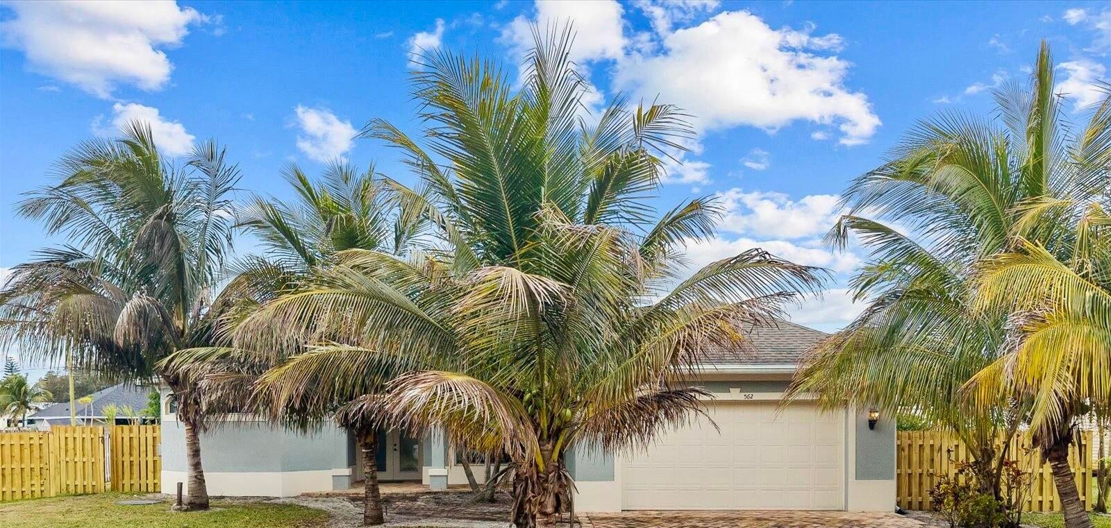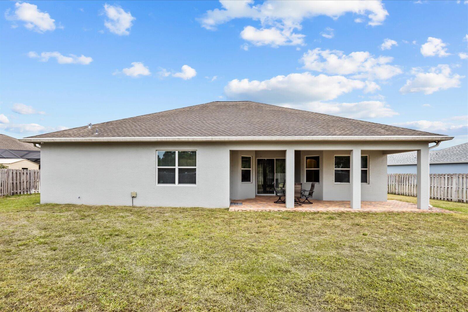 Experience refined Florida living in this elegant 2020 CBS contemporary residence set on a generous 0.29-acre lot in a peaceful Port St. Lucie neighborhood with no HOA. This impeccably maintained single-story home offers 4 bedrooms, 3 baths, and 2,536 sq ft of thoughtfully designed living space with a desirable split-bedroom layout. The open-concept interior features ceramic tile flooring, a chef-inspired kitchen and breakfast area, and expansive living and family spaces ideal for entertaining. The primary suite is a private retreat with dual vanities, a spa tub, and a separate shower. Outdoors, enjoy a fenced backyard with fruit trees, a covered patio, garden views, and ample room for a pool. Enhanced by a metal roof, full panel shutters, a security system, and a 2-car garage.