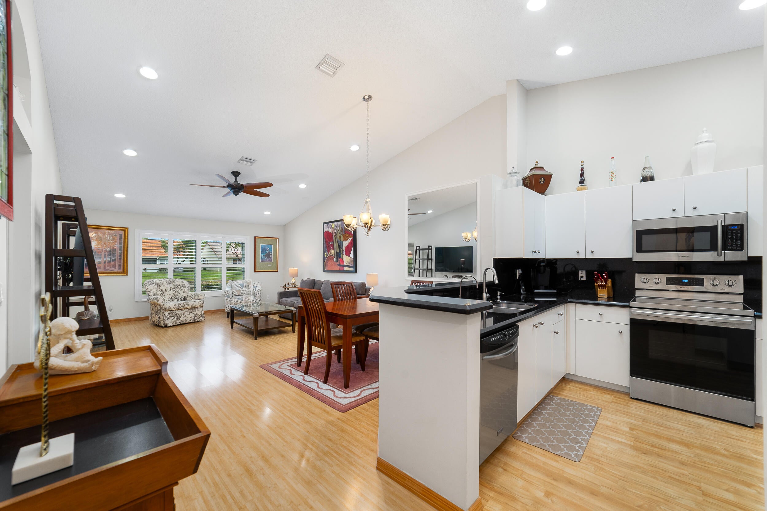 Welcome to this bright 2-bedroom, 2-bath townhouse in 55+ Floral Lakes, offering 1,378 sq ft of well-designed living space with abundant natural light, high-hat lighting, and ceiling fans throughout. The open kitchen anchors the home and features stainless steel appliances, including a refrigerator, stove, built-in microwave, dishwasher, and a double stainless steel sink, flowing seamlessly into the dining and living areas for easy everyday living and entertaining. The primary suite includes a renovated bathroom, while washer and dryer are conveniently located in the home. Head out to the extended screened lanai with birdcage enclosure and enjoy peaceful water views--an ideal spot to relax and unwind.Additional highlights include a one-car garage and hurricane shutters. Floral Lakes is a gated community offering a clubhouse, fitness center, pool and spa, tennis courts, library, game room, business center, sauna, putting green, bike and scenic paths, sidewalks, and on-site management. A well-maintained home with thoughtful updates in a beautifully kept setting.