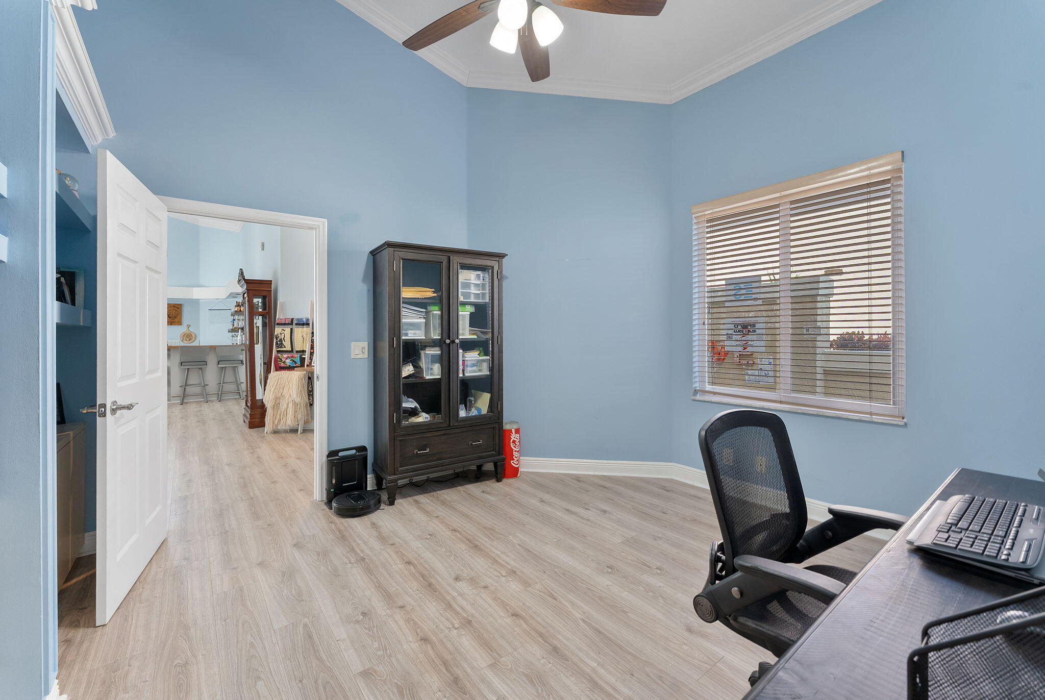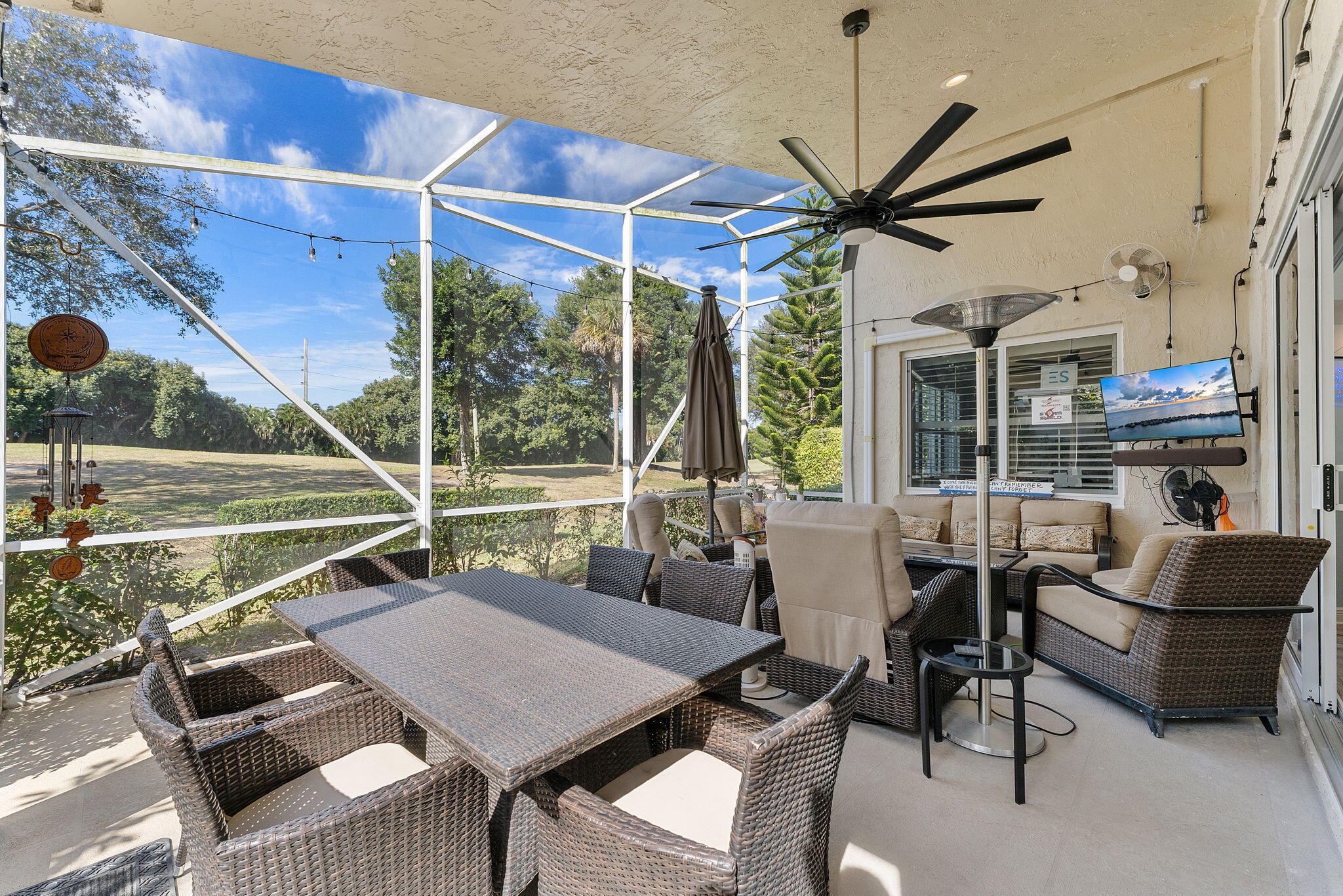 Live the Florida lifestyle in this updated 3-bed, 2-bath home with golf course views in the gated community of Hampton Fairways at Indian Spring. Thoughtfully redesigned, this home features an open floor plan ideal for everyday living and entertaining. Updates include new vinyl flooring, smooth ceilings, plantation shutters, and abundant natural light throughout. A custom live-edge epoxy resin bar creates a striking focal point. The kitchen offers updated appliances and custom shelving, while both bathrooms have been fully renovated with contemporary finishes. The spacious primary suite includes a spa-like ensuite. Enjoy the screened lanai overlooking golf views. Impact windows and a hurricane-rated garage door provide peace of mind. Pet-friendly community with pool. Optional Membership.