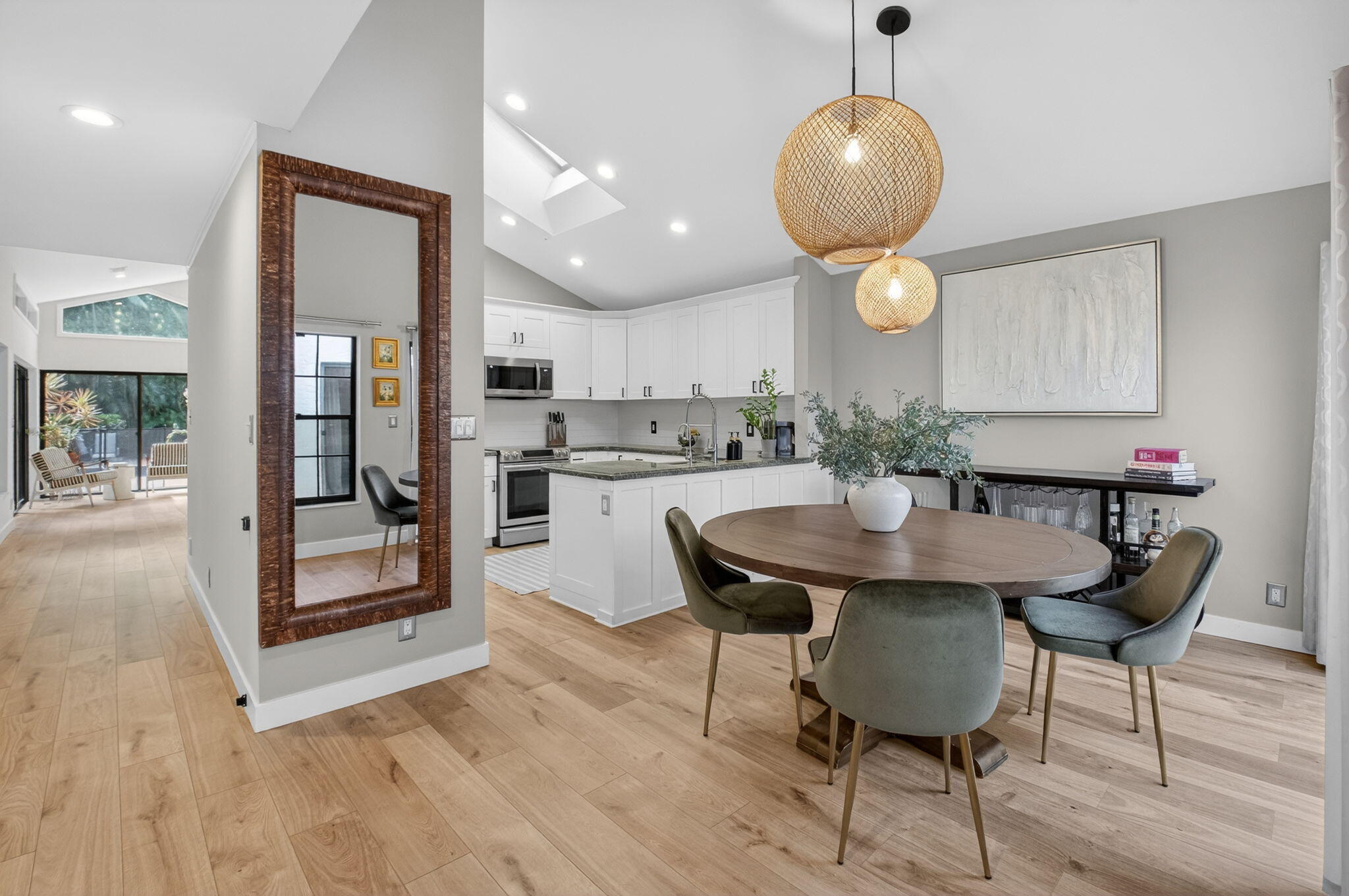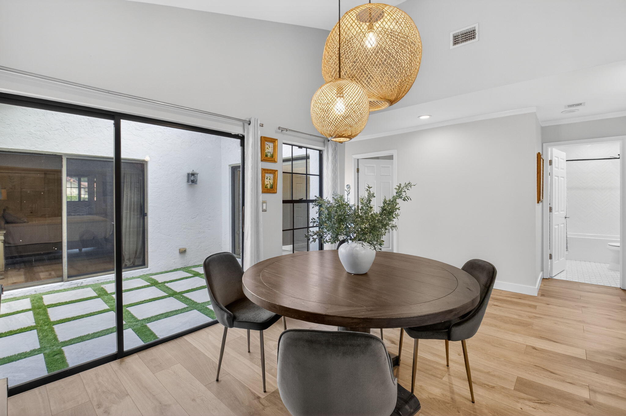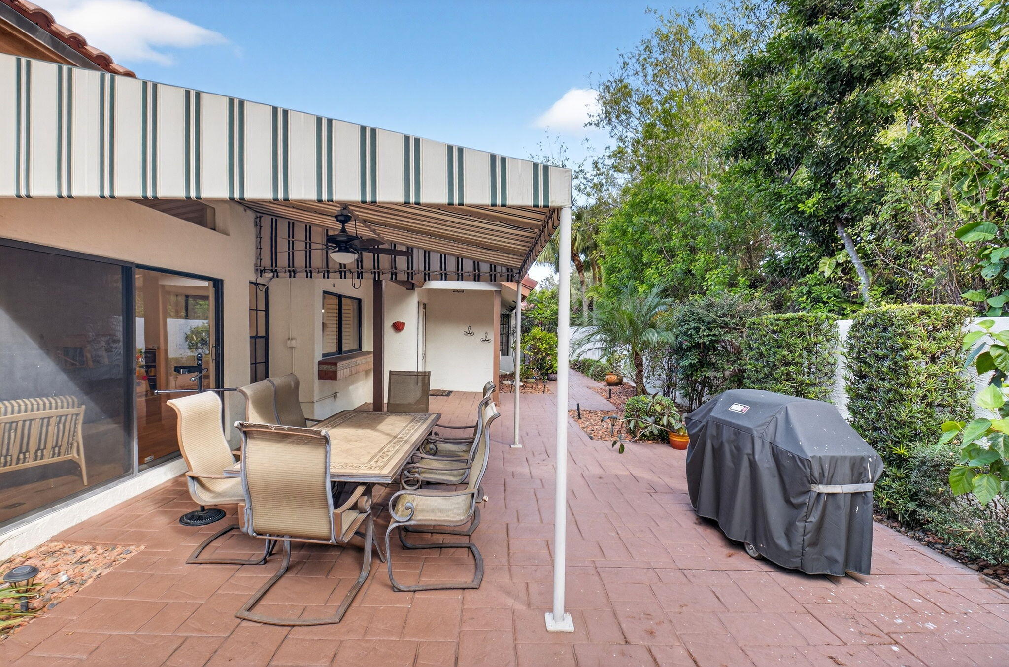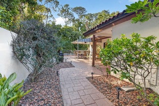Beautifully updated large corner lot residence offers two bedrooms plus flexible third bedroom/office space. Tropical private oversized backyard oasis complete with sparkling pool, open and covered spaces perfect for entertaining, dining alfresco or just relaxing. Inviting light filled open floorplan with wide plank flooring and vaulted ceilings. Updated white kitchen w/skylight, granite countertops, eat-in area and stainless appliances. Primary suite offers vaulted ceilings, views of tranquil atrium, walk-in closet, updated bath with dual sinks vanity, soaking tub and separate shower. Oversized 2CG. . Residents enjoy a heated community pool & spa and 24 hour guard. City owned Tennis/Swim Club across the street. Closet to Town Center Mall, Publix, Walgreens & the best schools. A must se