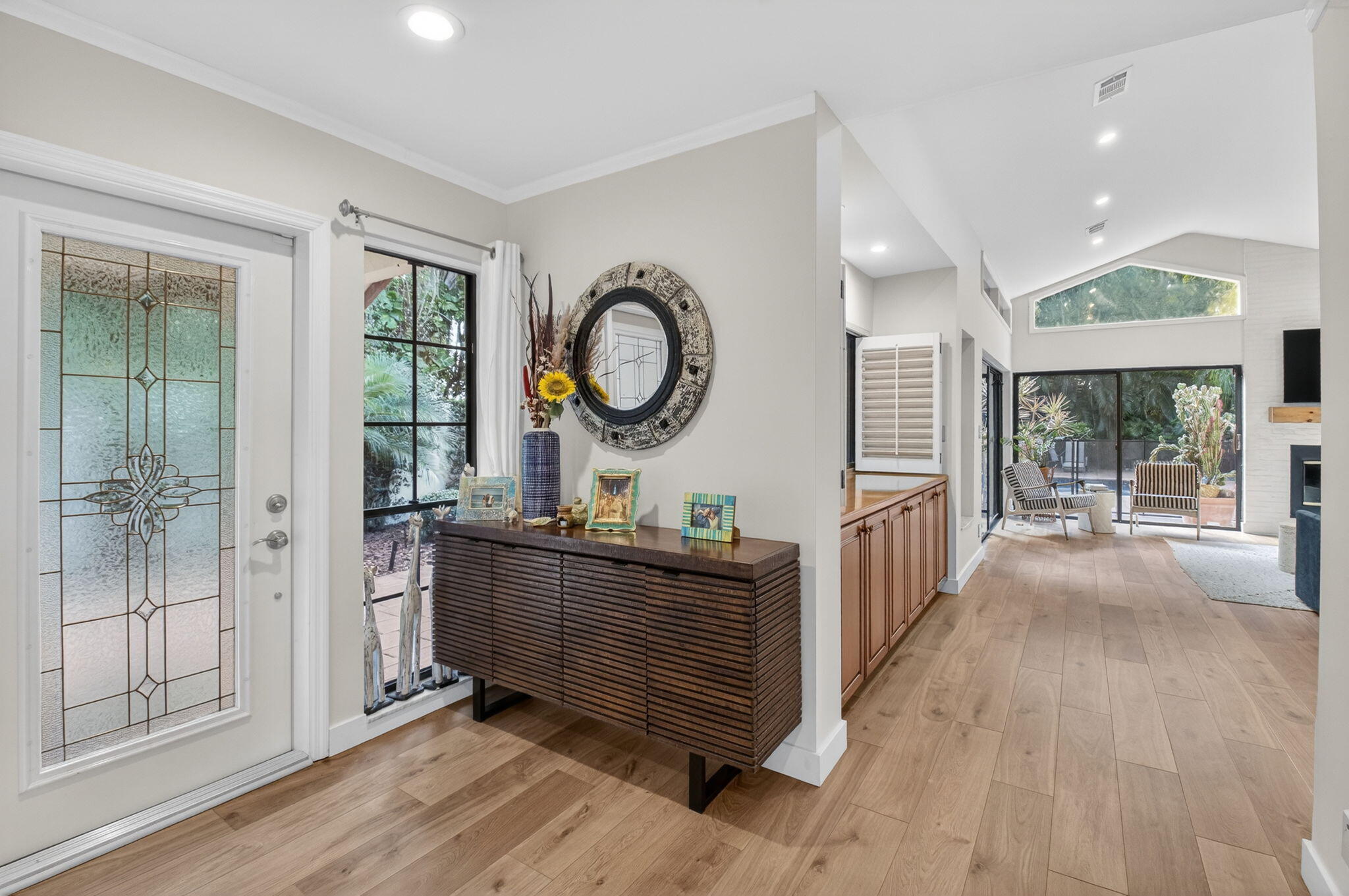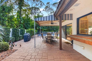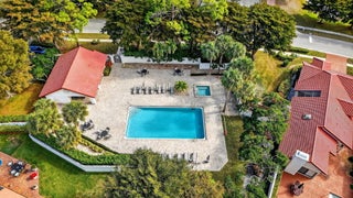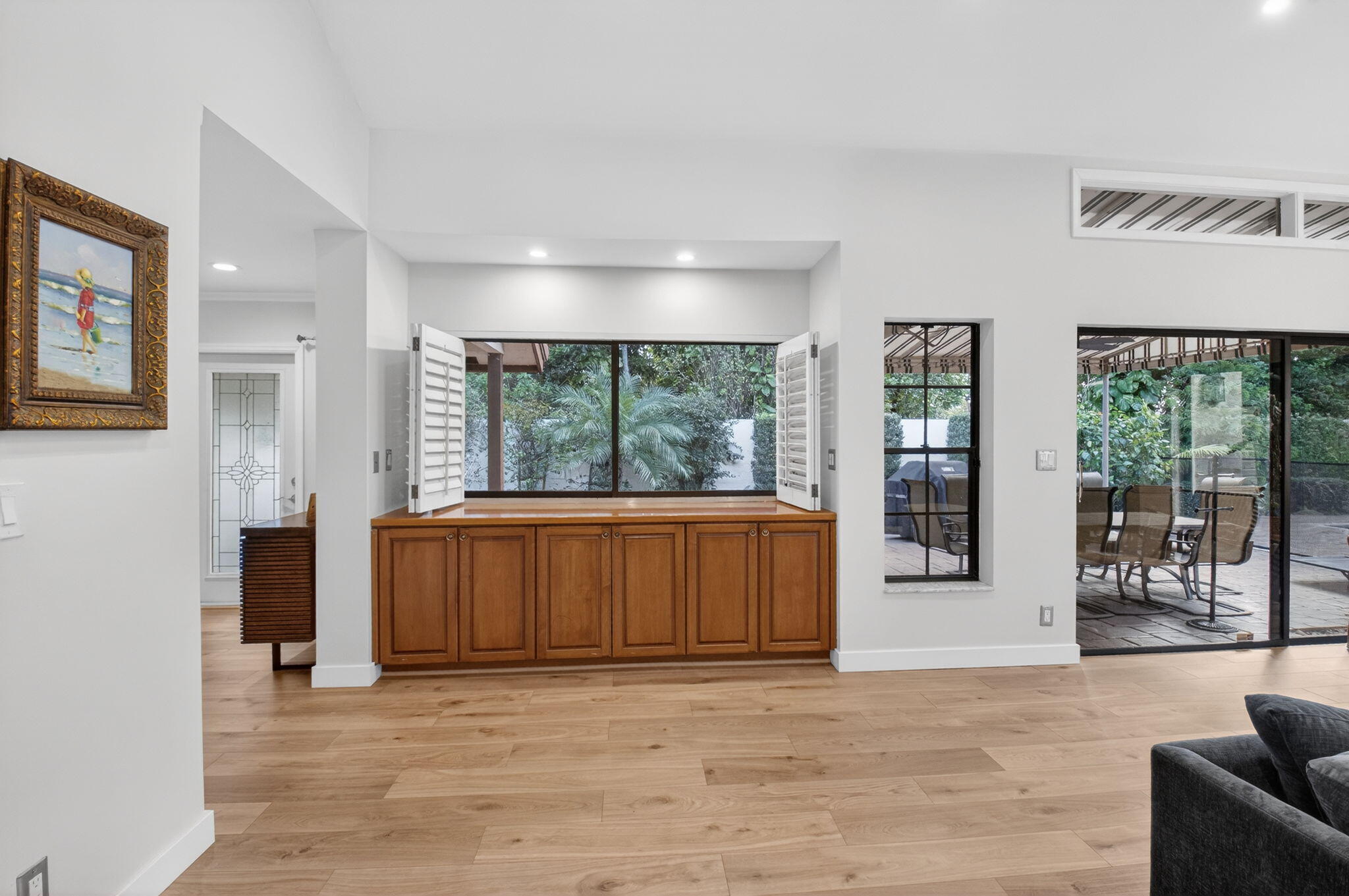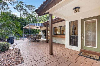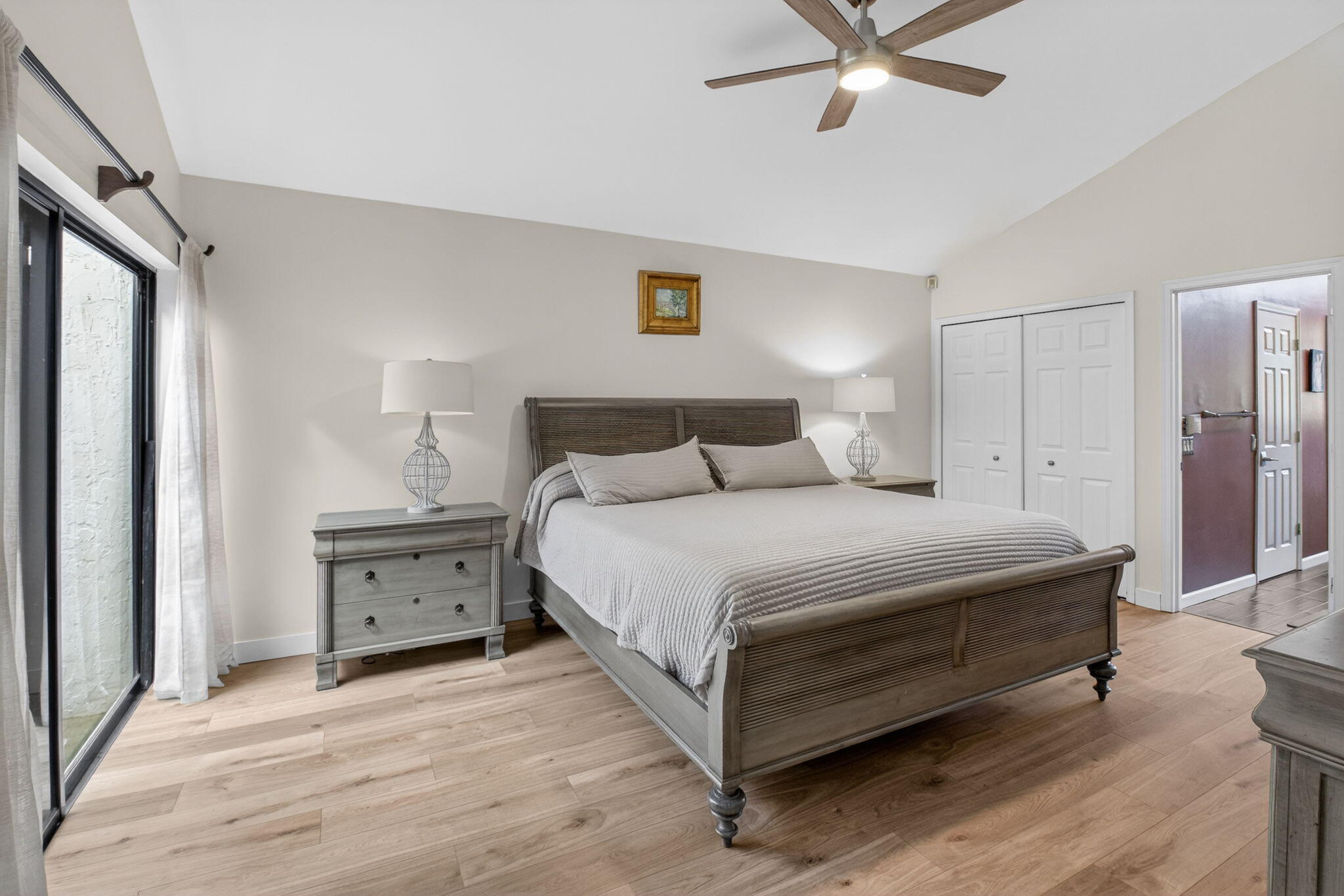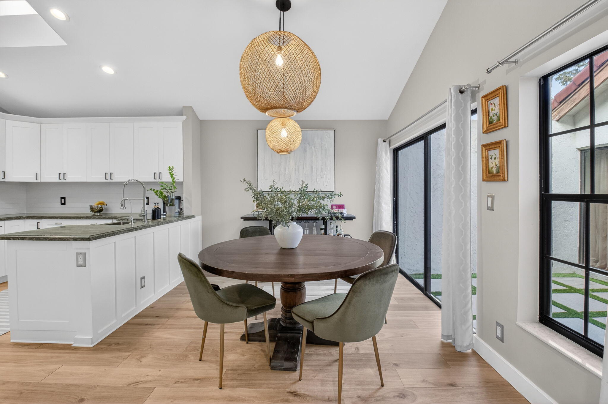 Beautifully updated large corner lot residence offers two bedrooms plus flexible third bedroom/office space. Tropical private oversized backyard oasis complete with sparkling pool, open and covered spaces perfect for entertaining, dining alfresco or just relaxing. Inviting light filled open floorplan with wide plank flooring and vaulted ceilings. Updated white kitchen w/skylight, granite countertops, eat-in area and stainless appliances. Primary suite offers vaulted ceilings, views of tranquil atrium, walk-in closet, updated bath with dual sinks vanity, soaking tub and separate shower. Oversized 2CG. . Residents enjoy a heated community pool & spa and 24 hour guard. City owned Tennis/Swim Club across the street. Closet to Town Center Mall, Publix, Walgreens & the best schools. A must se