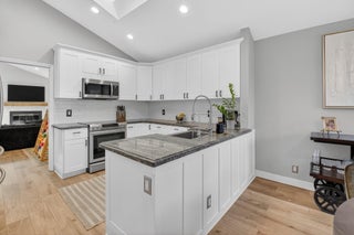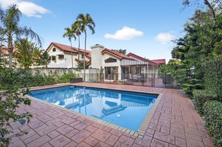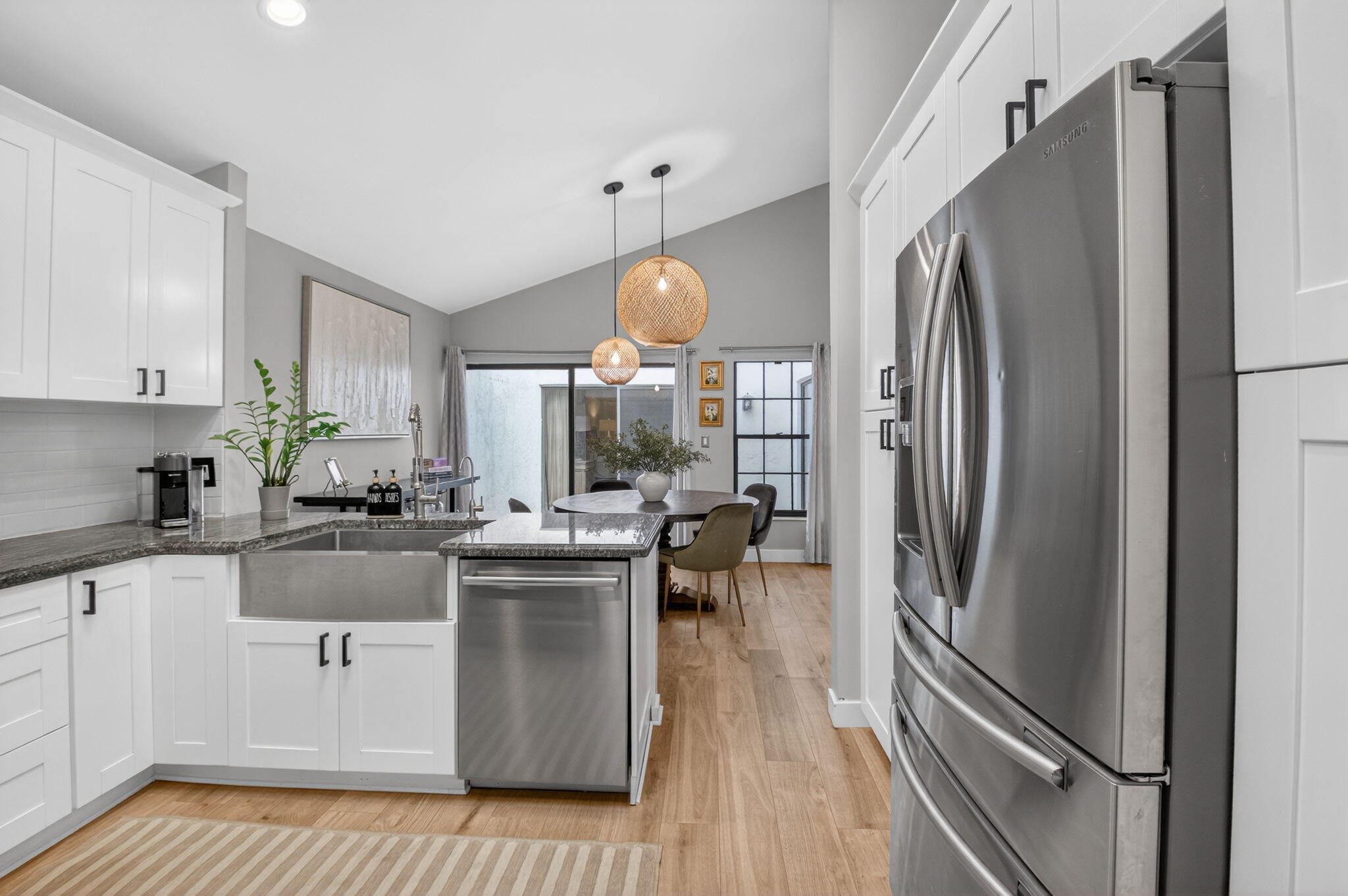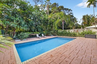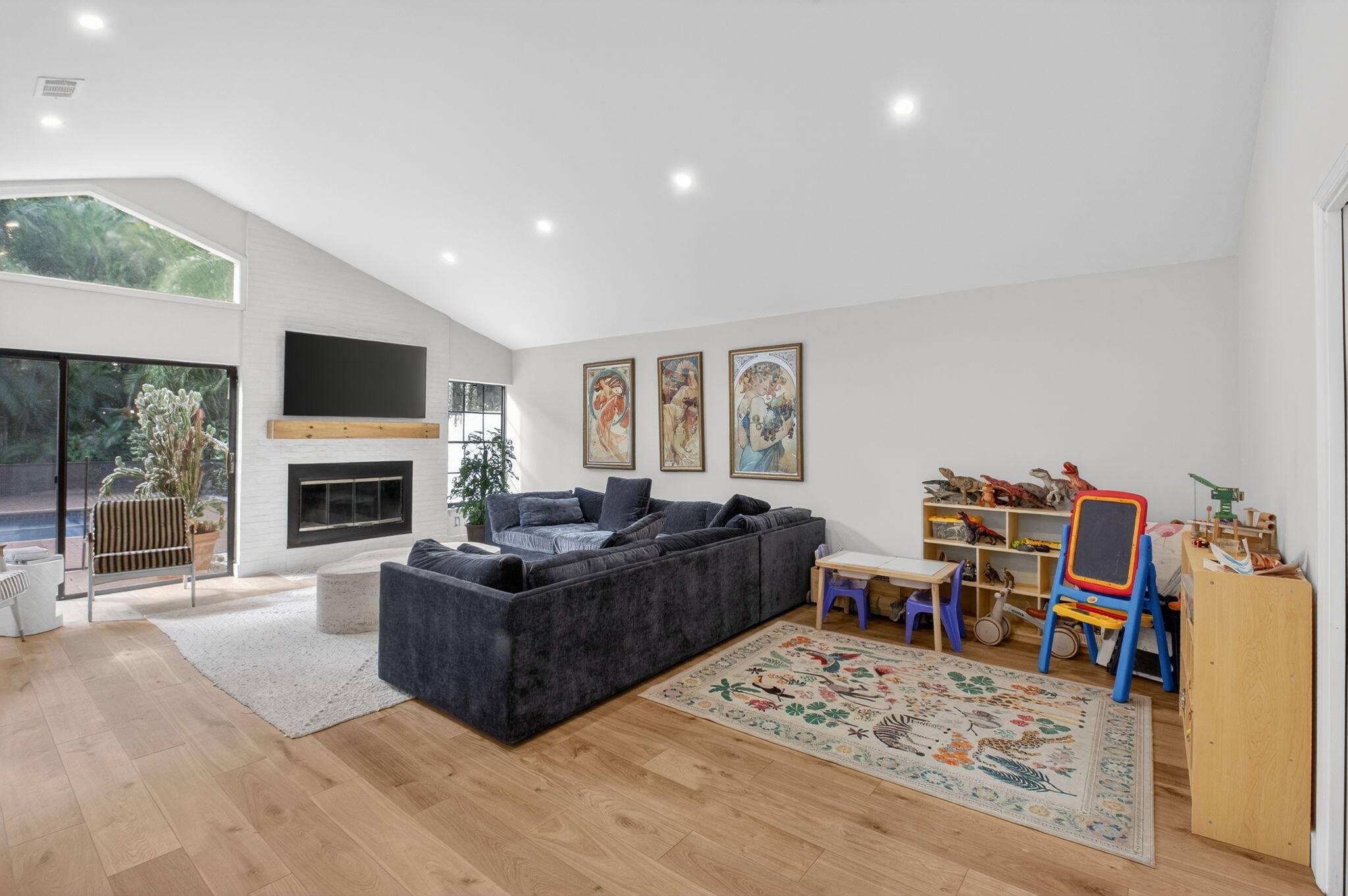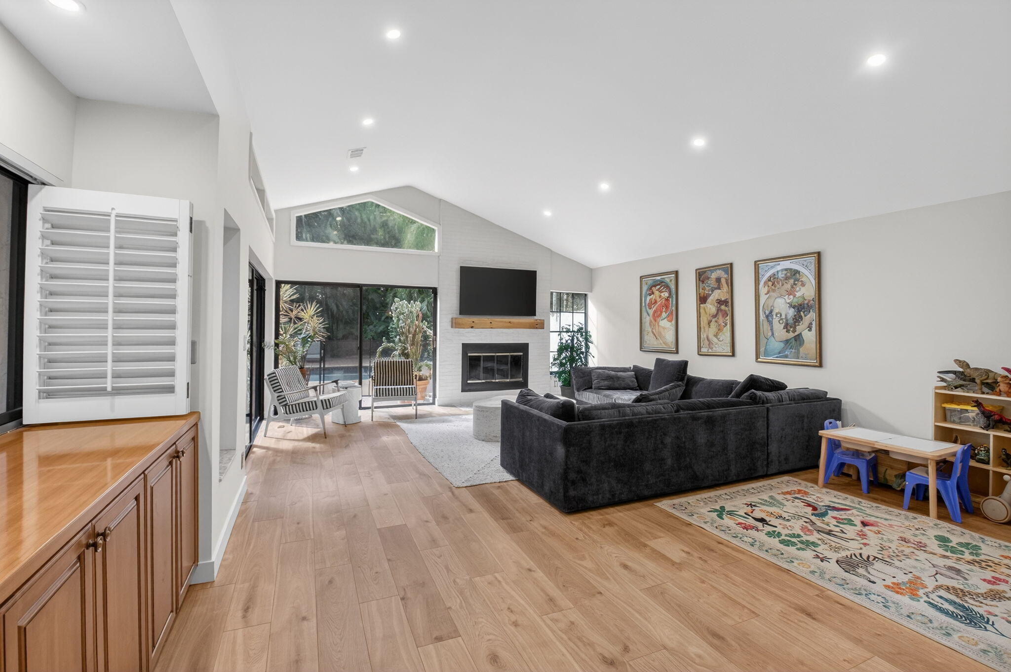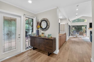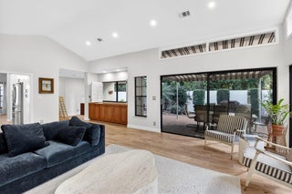 Beautifully updated large corner lot residence offers two bedrooms plus flexible third bedroom/office space. Tropical private oversized backyard oasis complete with sparkling pool, open and covered spaces perfect for entertaining, dining alfresco or just relaxing. Inviting light filled open floorplan with wide plank flooring and vaulted ceilings. Updated white kitchen w/skylight, granite countertops, eat-in area and stainless appliances. Primary suite offers vaulted ceilings, views of tranquil atrium, walk-in closet, updated bath with dual sinks vanity, soaking tub and separate shower. Oversized 2CG. . Residents enjoy a heated community pool & spa and 24 hour guard. City owned Tennis/Swim Club across the street. Closet to Town Center Mall, Publix, Walgreens & the best schools. A must se