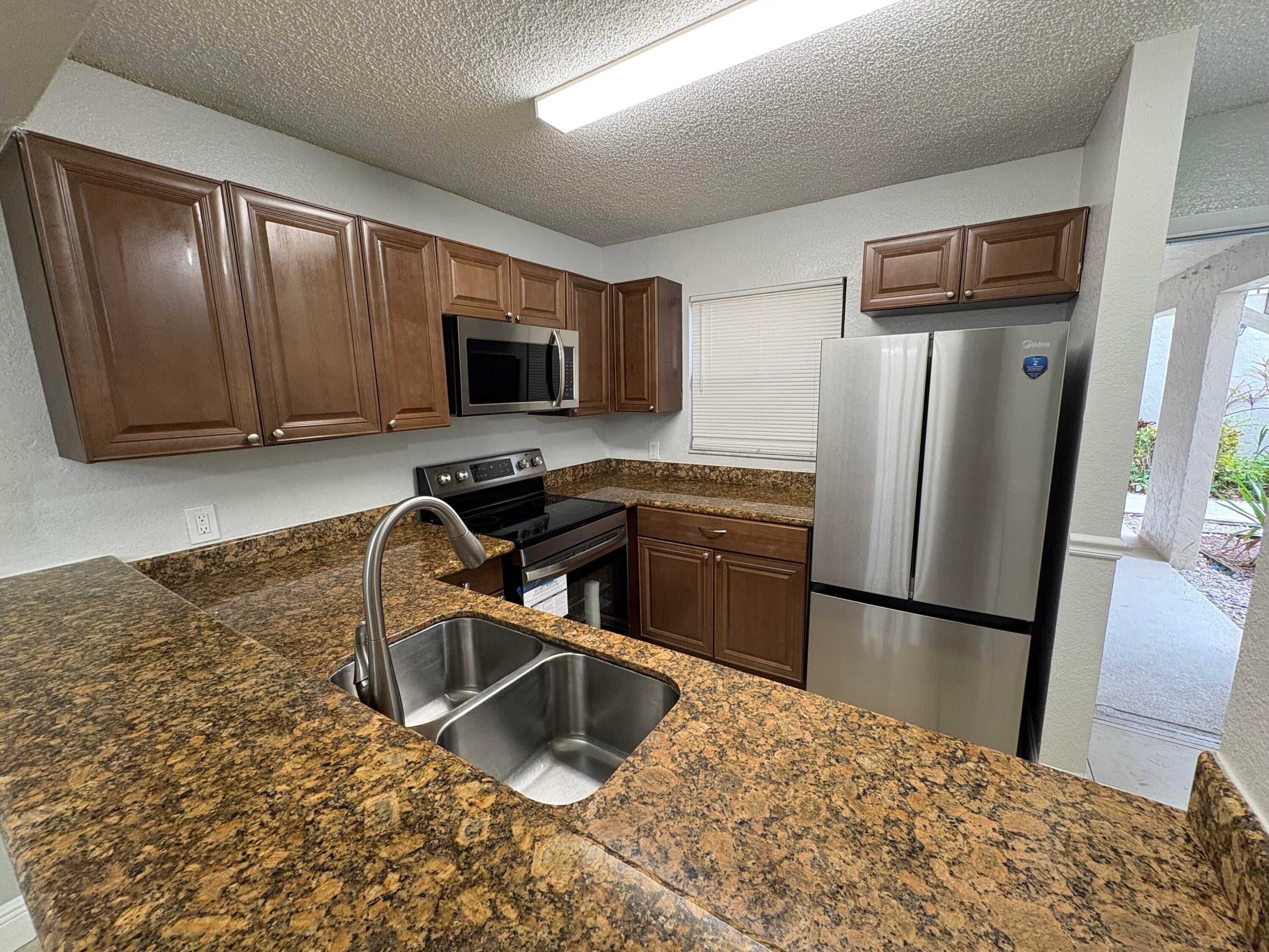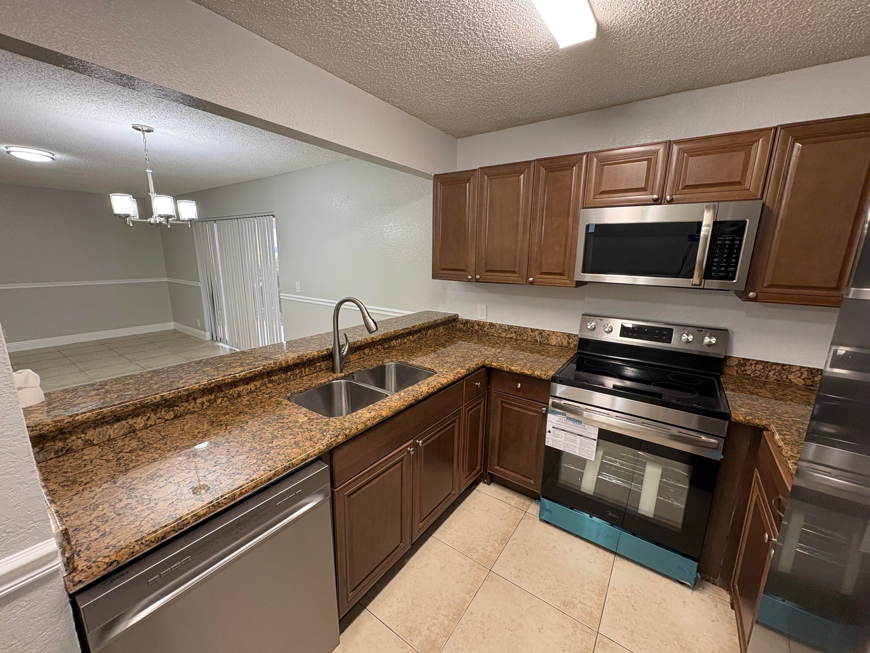 Spacious 2-bedroom, 2-bath condo located in Palm Beach Place. Recently painted and renovated - NEW KITCHEN APPLIANCES. This unit features tile and vinyl flooring throughout with no carpet. The kitchen and bathrooms have been updated, and the unit includes a convenient in-unit washer and dryer. The primary bedroom includes an en-suite bathroom and a walk-in closet. Step outside to a patio for extra living space. The community is surrounded by lakes and fountains, well maintained landscaping, and offers amenities such as a swimming pool, tennis courts, clubroom, and fitness center. Centrally located in West Palm Beach near schools, major highways, and thoroughfares for easy commuting. A solid rental opportunity in a great location. Schedule a showing today!