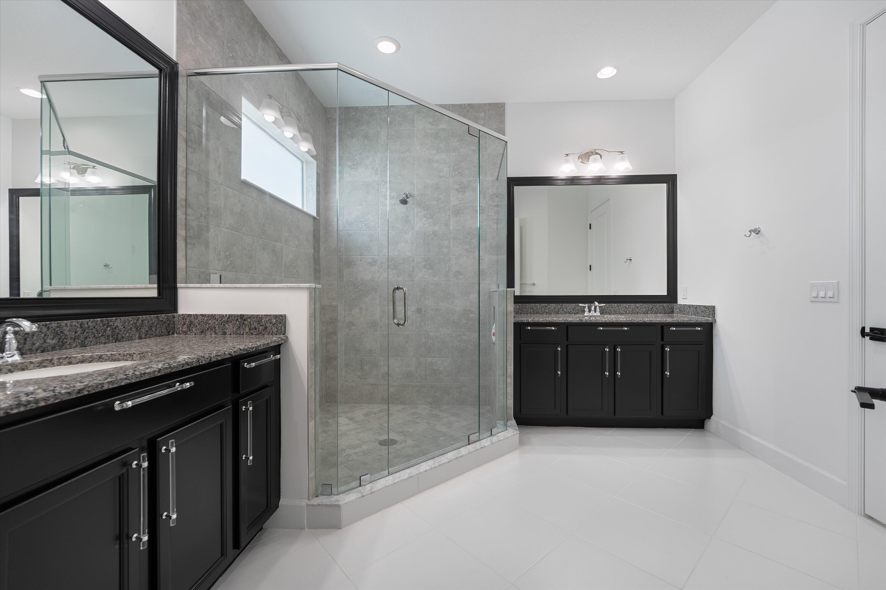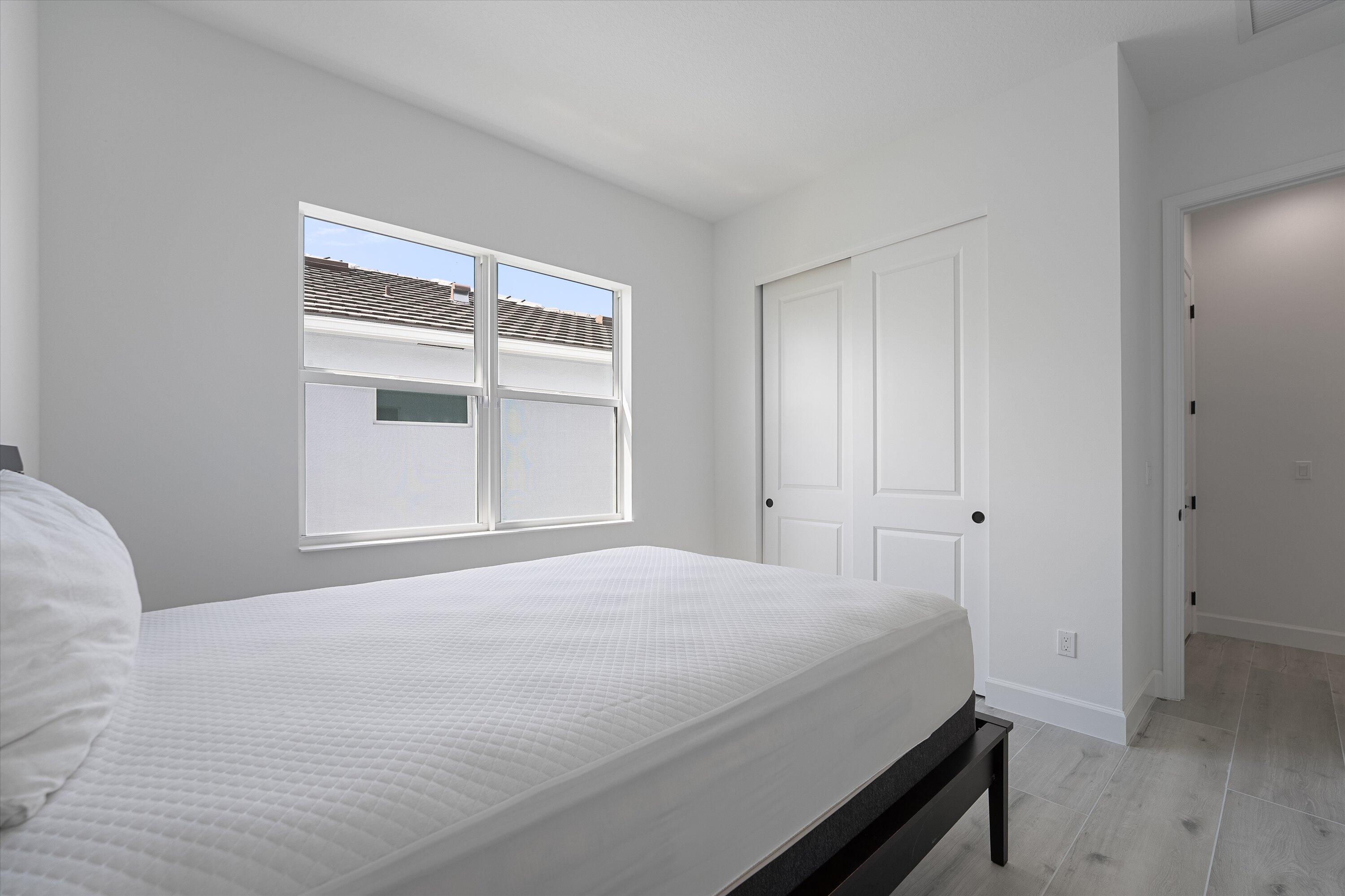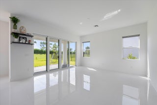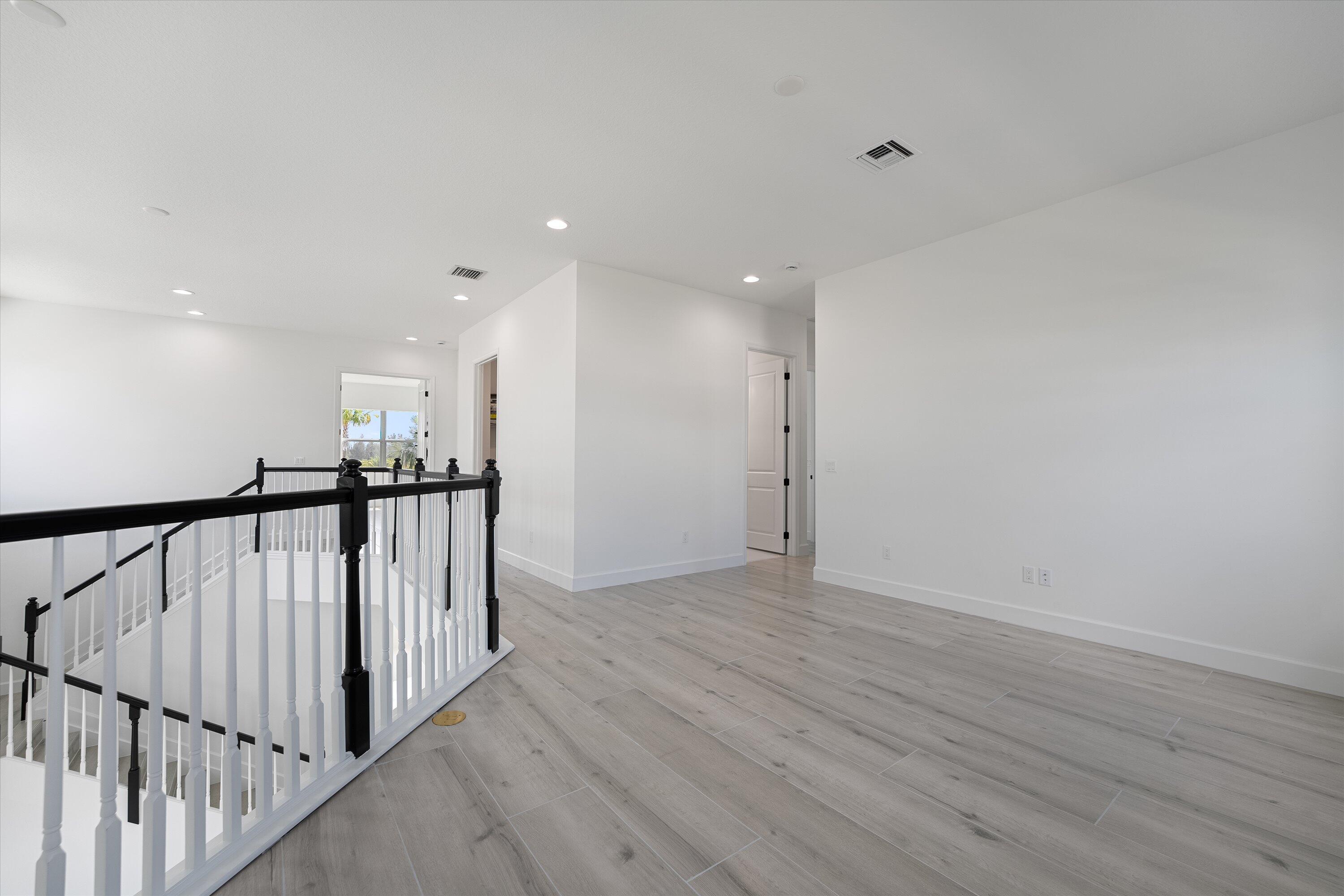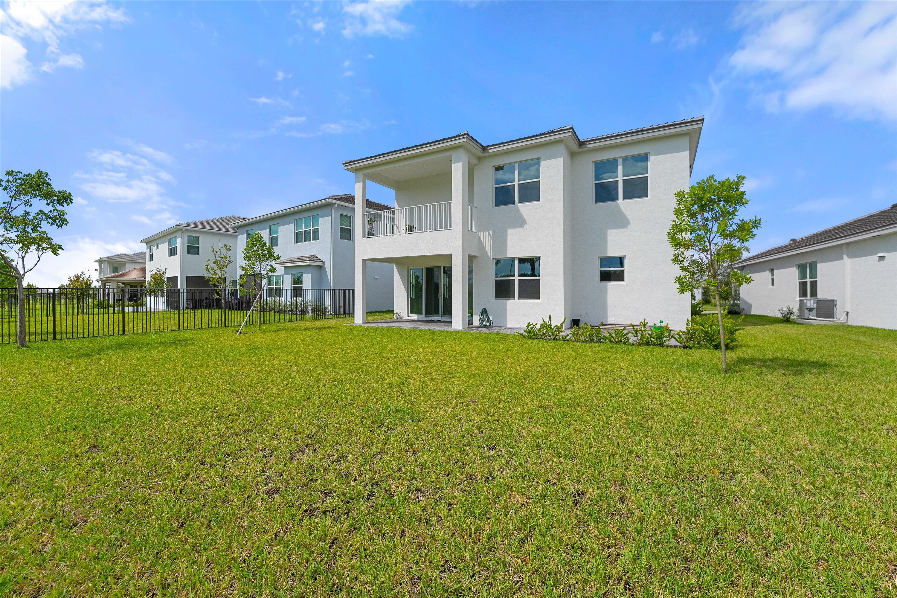 Welcome to this stunning Laurel Model two-story home with a balcony in the highly sought-after Orchards community in Westlake, Florida. With four bedrooms + Loft , three bathrooms and a three-car garage, this residence is filled with numerous upgrades and exudes a clean, modern aesthetic. As you approach the striking black double entry doors, the sense of luxury is immediate. Inside, the living area greets you with glossy white floors, soaring ceilings, and an abundance of natural light, enhancing the open and airy feel.The kitchen is a chef's dream, featuring white shaker cabinets with sleek white quartz countertops along the perimeter, a large closet pantry, and black shaker cabinets on the island for a dramatic contrast. Equipped with all-new stainless steel appliances, including a double wall oven and microwave complemented by a striking black hood, it epitomizes modern elegance. A spacious kitchen island, topped with a contemporary black and white quartz countertop, offers additional seating, while the kitchen also allows for a cozy breakfast area with a window view. The ample dining space and large family room with sliding glass doors provide seamless indoor-outdoor living, overlooking a vast backyard with extended pavers, perfect for relaxation or entertaining. Downstairs, you'll find a spacious bedroom with a walk-in closet, offering flexibility for guests or home office needs. Adjacent to this bedroom is a well-appointed full bathroom featuring black cabinets with upgraded pulls, a granite countertop with sleek silver fixtures, a beautifully framed mirror, and a seamless glass shower with elegant white tiles. Upstairs, grey wood grain ceramic tile extends throughout the entire level, leading you to a versatile loft area and the luxurious master suite. The master bedroom, with a tray ceiling, boasts a sitting area with impressive 10-foot ceilings. From the master suite, step out onto a covered balcony that overlooks the serene backyard. The master bathroom is spacious and stylish, offering dual sinks separated by a corner shower, black cabinets, sleek silver fixtures, and gray shower tiles with matching floor tiles. Its clean white tile flooring adds a touch of sophistication. Two additional bedrooms upstairs include a walk-in closet and another with a standard closet, both offering comfort and ample space. The upstairs bathroom features white shaker cabinets, gray granite countertops with black pulls, silver fixtures, and a white framed mirror, with a separate tub and toilet room. The shower is beautifully tiled in a horizontal pattern, with a clean white tile floor. The conveniently located laundry room includes brown shaker cabinets, granite countertops, and an upgraded washer and dryer. Experience the perfect blend of modern design and comfortable living in this exceptional rental home.