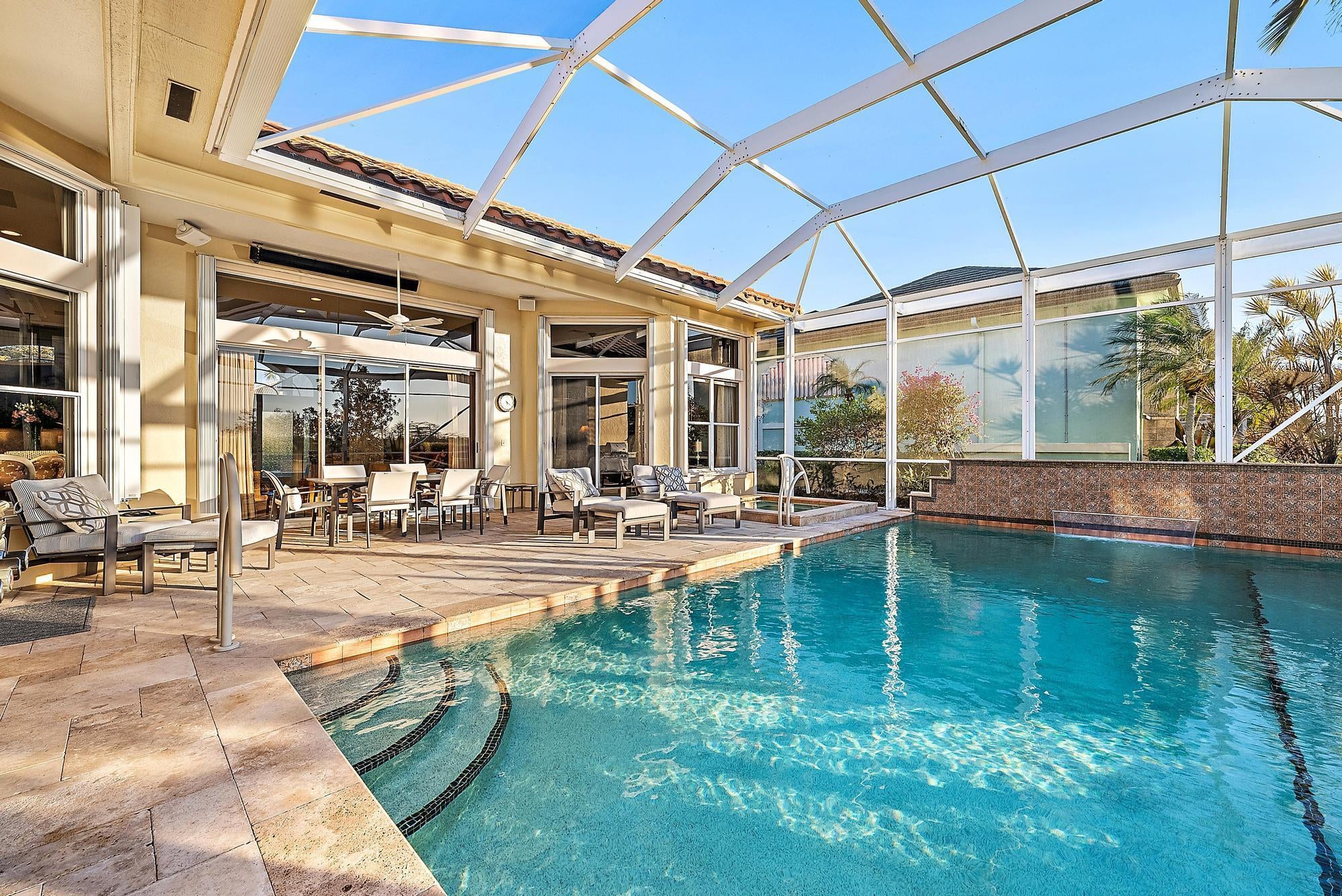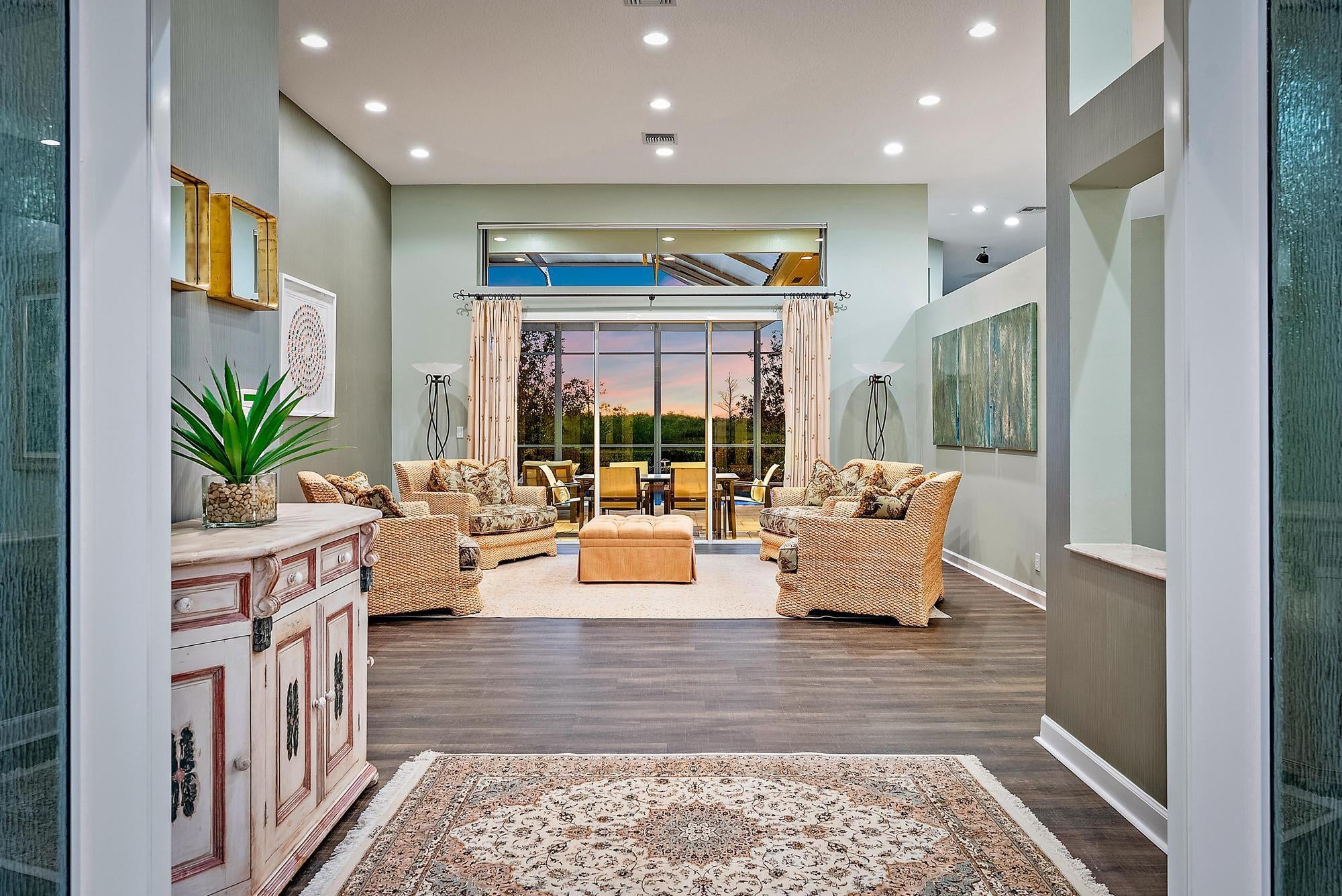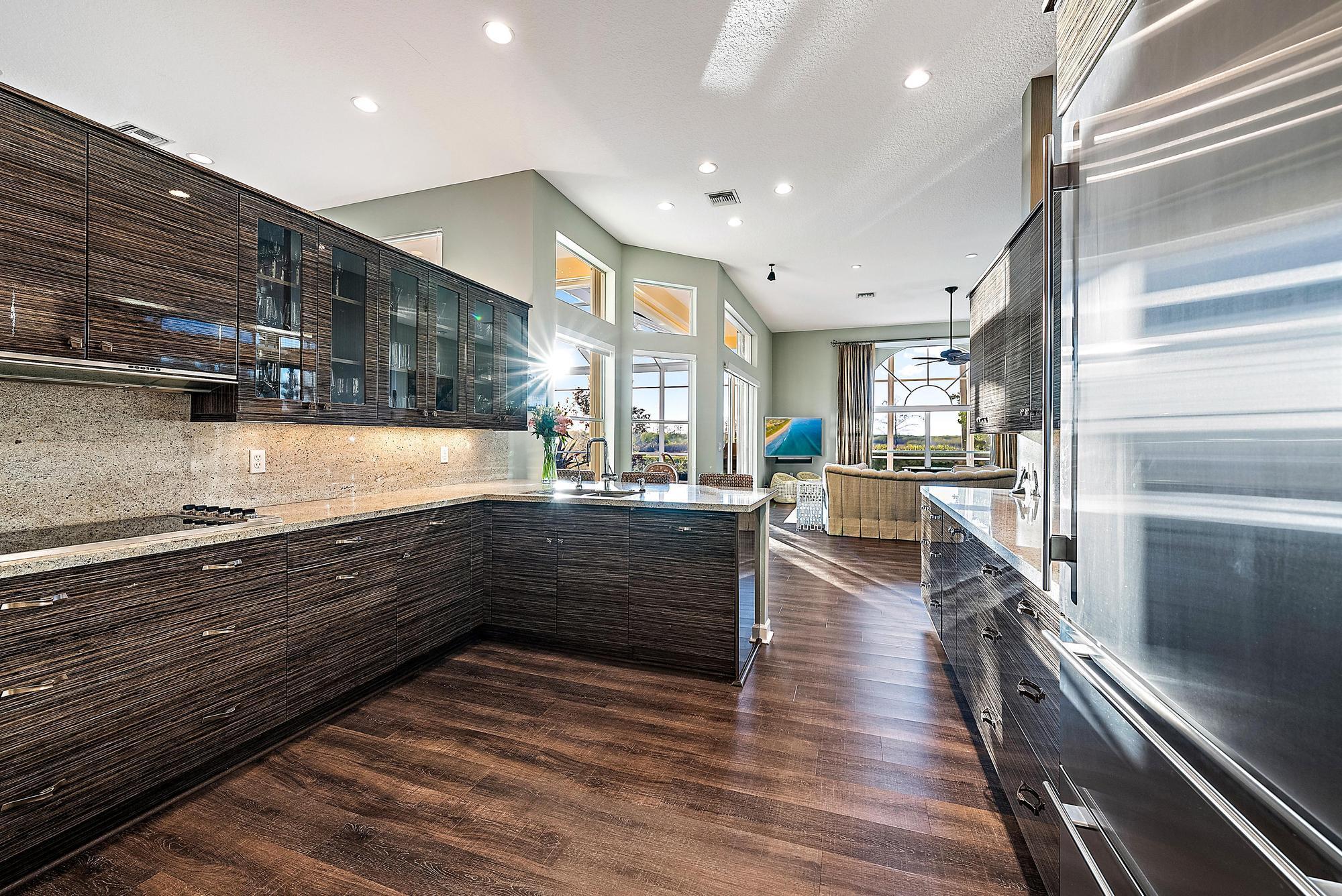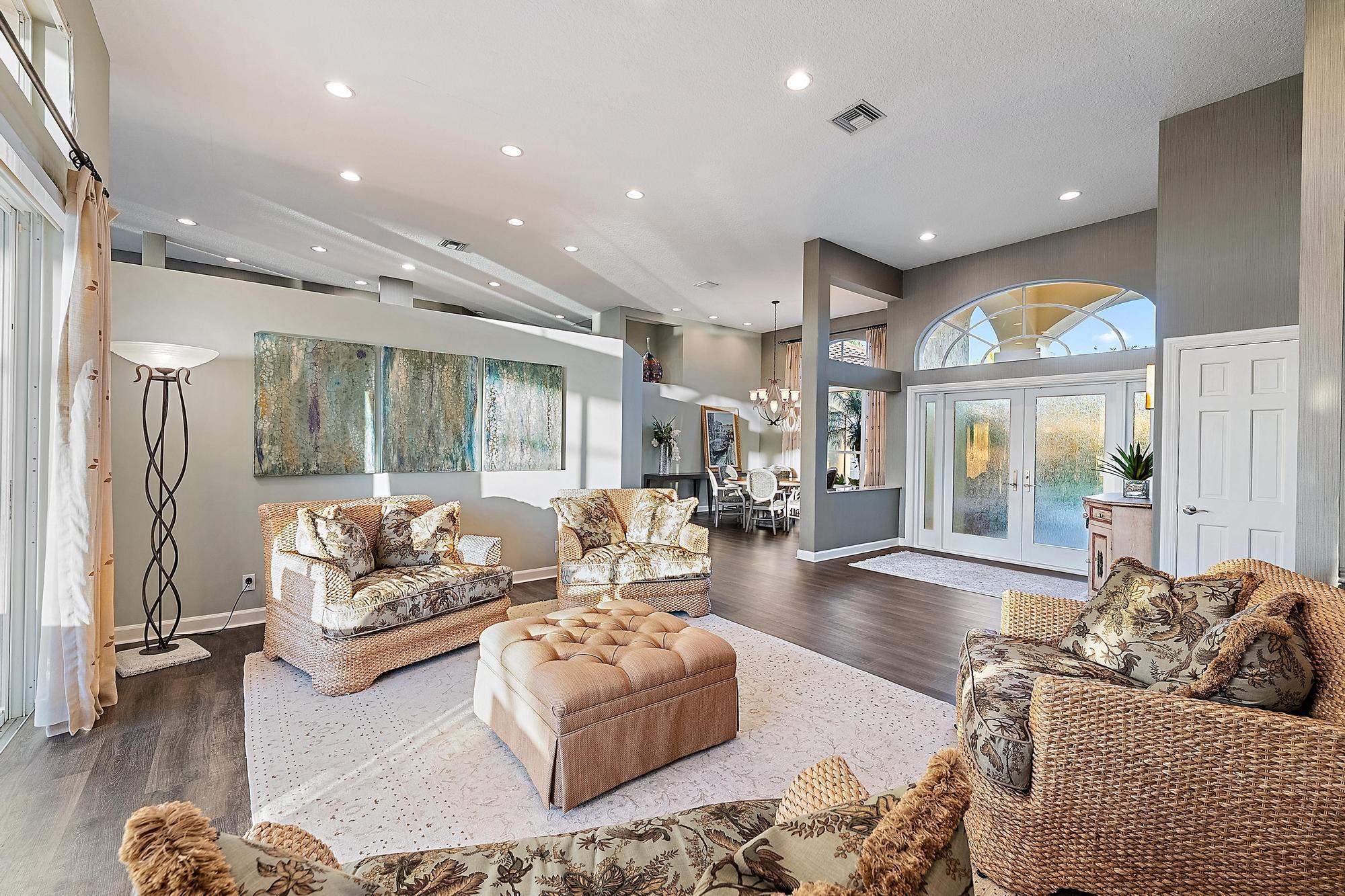 Nestled within the exclusive gated community of The Island in the prestigious PGA National golf community, this elegant residence embodies refined Florida living with a seamless blend of luxury, comfort, and style. Offering just under 3,000 square feet of thoughtfully designed living space, the home features four spacious bedrooms, three full bathrooms, and a two-car garage, all set on an exceptional quarter-acre lot with sweeping preserve views and breathtaking sunsets that create a serene, private backdrop. Grand double doors open into a light-filled interior defined by soaring 12-foot ceilings, a functional open floor plan, and luxury vinyl flooring throughout. Furniture is negotiable for a truly turnkey experience.At the heart of the home, the beautifully updated chef's kitchen showcases top-of-the-line stainless steel appliances, including a Sub-Zero refrigerator and Viking oven and cooktop, complemented by granite countertops and sleek modern soft-close cabinetry. An inviting eat-in kitchen and breakfast café provide casual dining options, while the adjoining family room creates an effortless flow for entertaining. Expansive sliding glass doors extend the living space outdoors to a covered lanai and screened-in pool area, delivering the ideal indoor-outdoor lifestyle Florida is known for. The luxurious primary suite serves as a private retreat, complete with a spacious walk-in closet and a spa-inspired bath featuring dual vanities, a glass-enclosed shower with floor-to-ceiling tile, and an oversized Jacuzzi tub designed for relaxation. Additional enhancements include a newer roof installed in 2023, quartzite counters and updated vanities in the bathrooms, electric blinds throughout, elegant accent wallpaper, and an oversized garage with built-in storage cabinets for added convenience. Step outside to a resort-style backyard oasis surrounded by lush tropical landscaping. Travertine marble decking leads to a covered lanai and an updated pool and hot tub featuring a PebbleTec surface, creating the perfect setting for entertaining or unwinding in total privacy. A convenient cabana bath provides seamless access from the patio and pool area, enhancing both comfort and functionality. Residents of The Island enjoy access to the world-class lifestyle of PGA National, with optional memberships available for championship golf, tennis, fine dining, and a luxurious spa experience. Ideally located near I-95 and the Florida Turnpike, the home offers effortless access to premier shopping, dining, and entertainment, delivering an exceptional balance of tranquility and convenience in one of Palm Beach County's most sought-after communities.