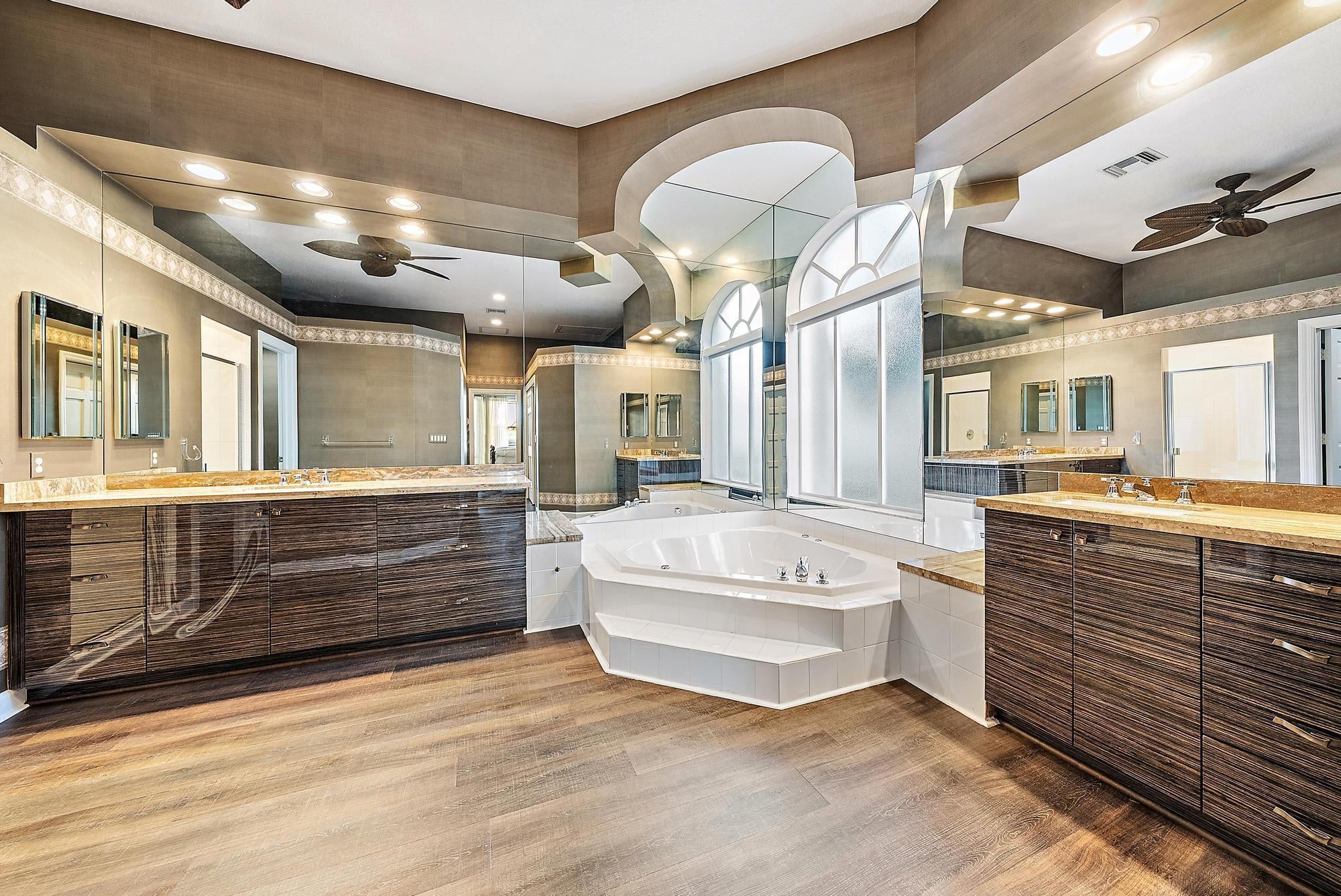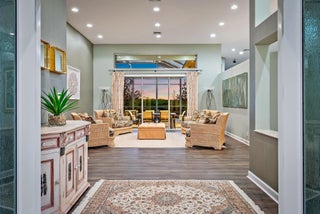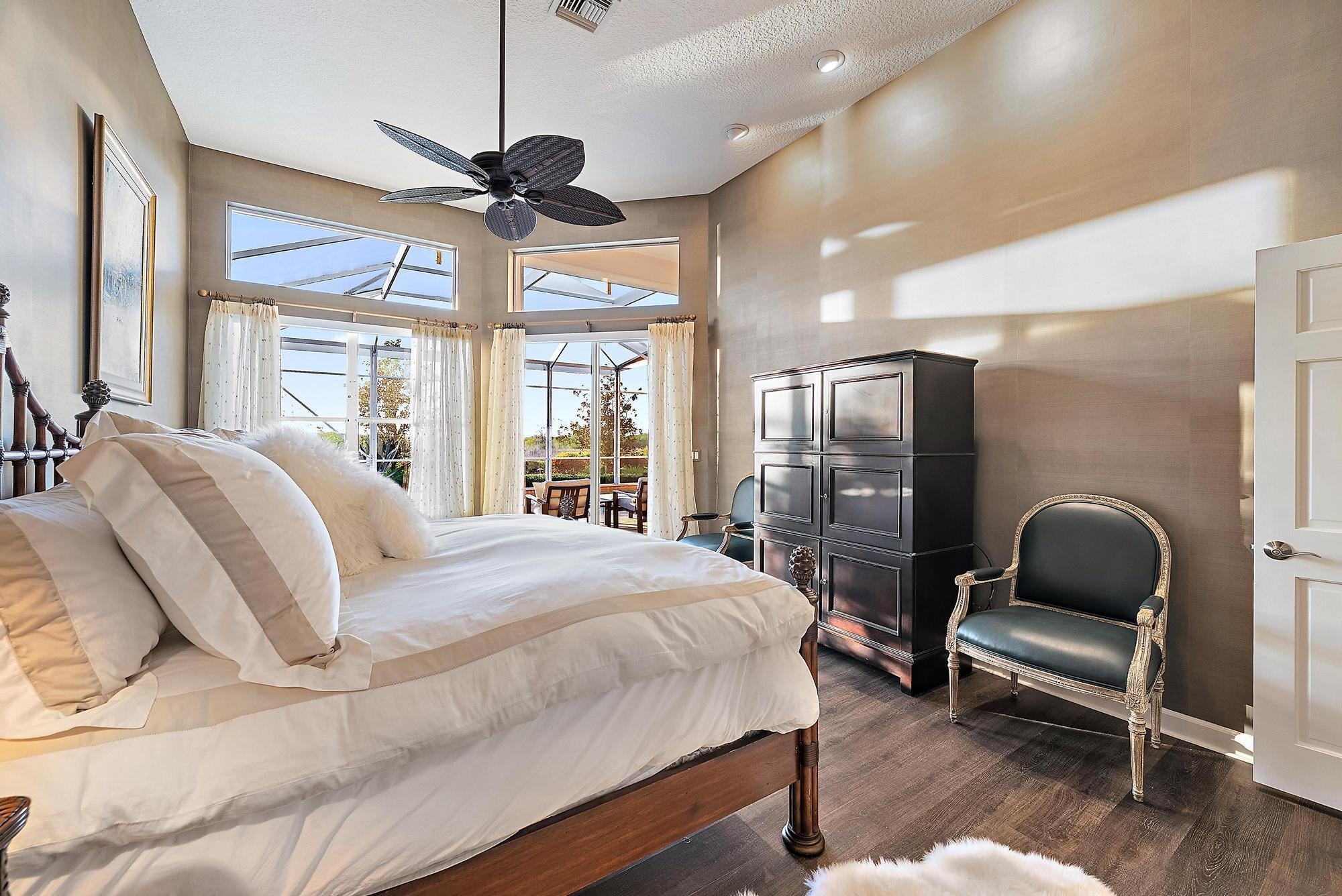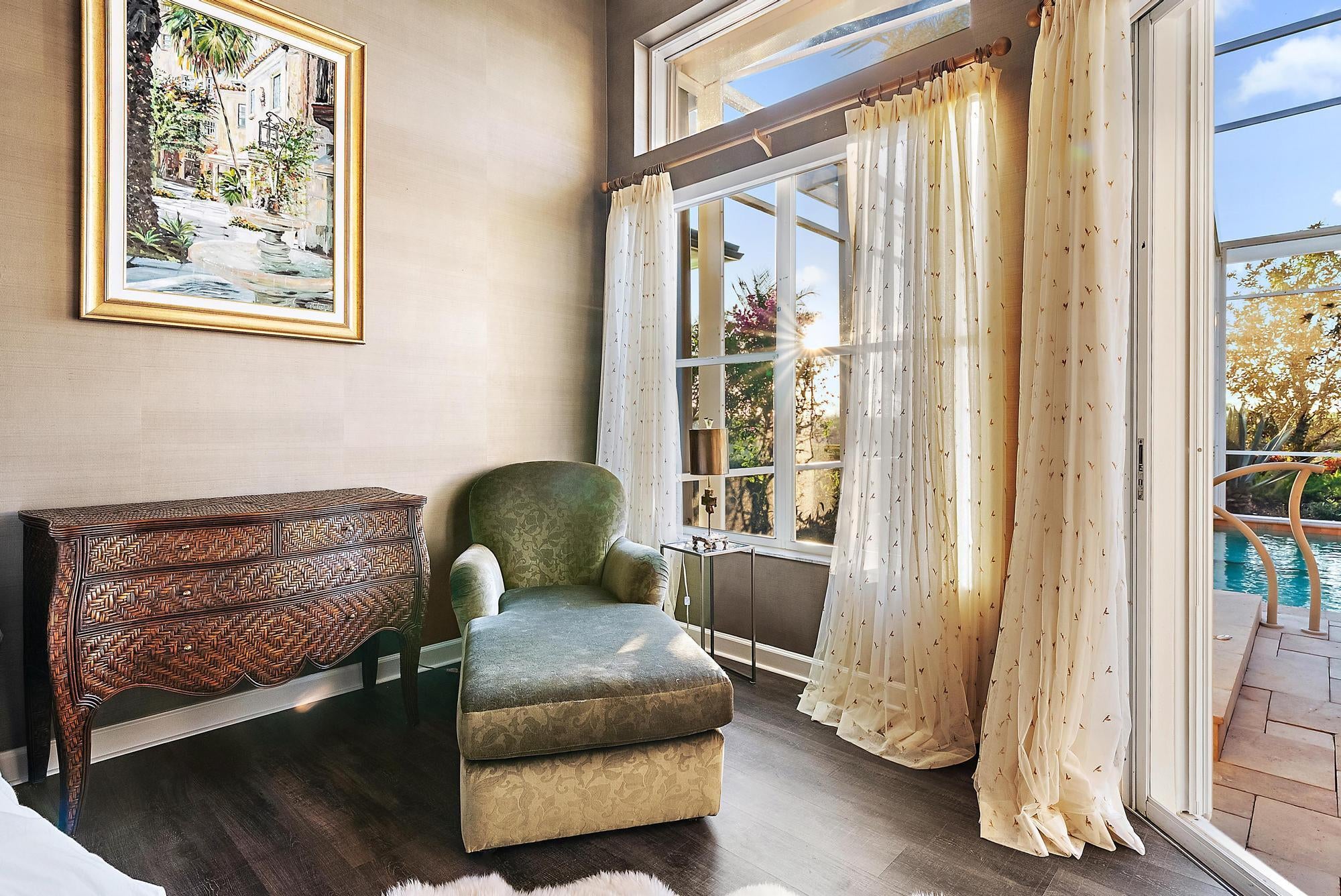 Nestled within the exclusive gated community of The Island in the prestigious PGA National golf community, this elegant residence embodies refined Florida living with a seamless blend of luxury, comfort, and style. Offering just under 3,000 square feet of thoughtfully designed living space, the home features four spacious bedrooms, three full bathrooms, and a two-car garage, all set on an exceptional quarter-acre lot with sweeping preserve views and breathtaking sunsets that create a serene, private backdrop. Grand double doors open into a light-filled interior defined by soaring 12-foot ceilings, a functional open floor plan, and luxury vinyl flooring throughout. Furniture is negotiable for a truly turnkey experience.At the heart of the home, the beautifully updated chef's kitchen showcases top-of-the-line stainless steel appliances, including a Sub-Zero refrigerator and Viking oven and cooktop, complemented by granite countertops and sleek modern soft-close cabinetry. An inviting eat-in kitchen and breakfast café provide casual dining options, while the adjoining family room creates an effortless flow for entertaining. Expansive sliding glass doors extend the living space outdoors to a covered lanai and screened-in pool area, delivering the ideal indoor-outdoor lifestyle Florida is known for. The luxurious primary suite serves as a private retreat, complete with a spacious walk-in closet and a spa-inspired bath featuring dual vanities, a glass-enclosed shower with floor-to-ceiling tile, and an oversized Jacuzzi tub designed for relaxation. Additional enhancements include a newer roof installed in 2023, quartzite counters and updated vanities in the bathrooms, electric blinds throughout, elegant accent wallpaper, and an oversized garage with built-in storage cabinets for added convenience. Step outside to a resort-style backyard oasis surrounded by lush tropical landscaping. Travertine marble decking leads to a covered lanai and an updated pool and hot tub featuring a PebbleTec surface, creating the perfect setting for entertaining or unwinding in total privacy. A convenient cabana bath provides seamless access from the patio and pool area, enhancing both comfort and functionality. Residents of The Island enjoy access to the world-class lifestyle of PGA National, with optional memberships available for championship golf, tennis, fine dining, and a luxurious spa experience. Ideally located near I-95 and the Florida Turnpike, the home offers effortless access to premier shopping, dining, and entertainment, delivering an exceptional balance of tranquility and convenience in one of Palm Beach County's most sought-after communities.