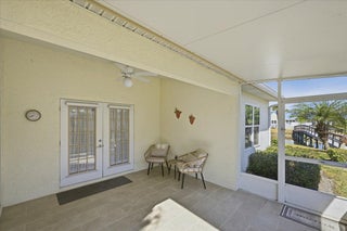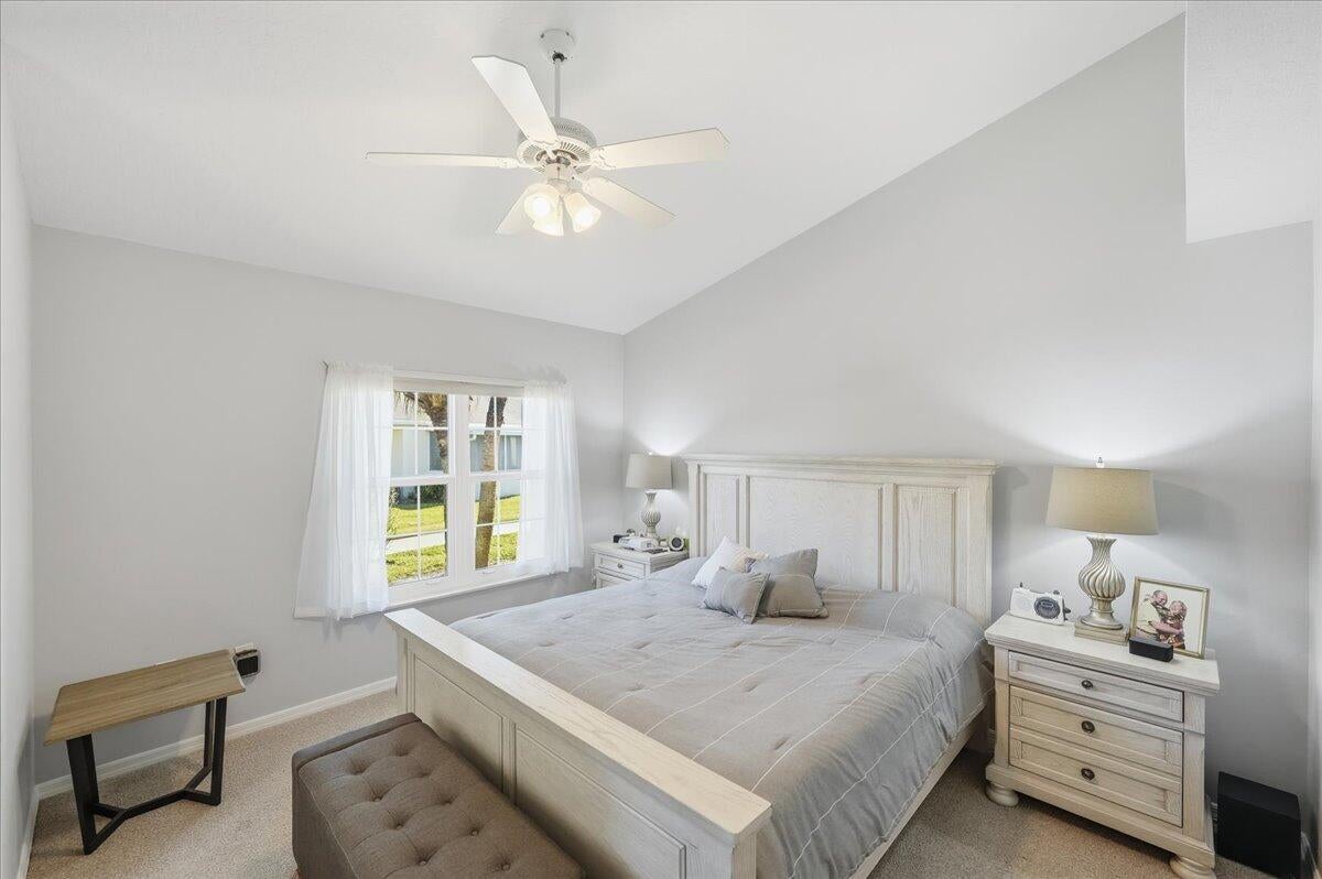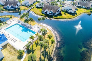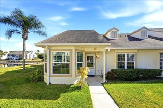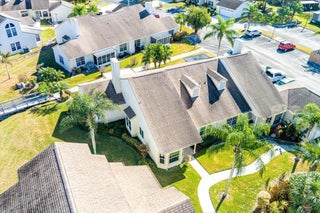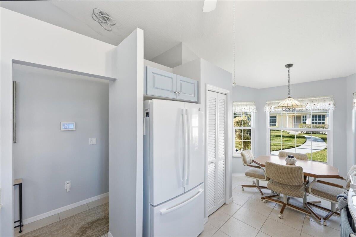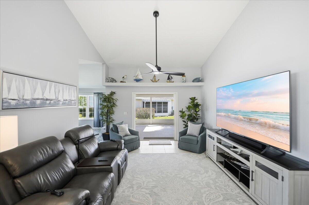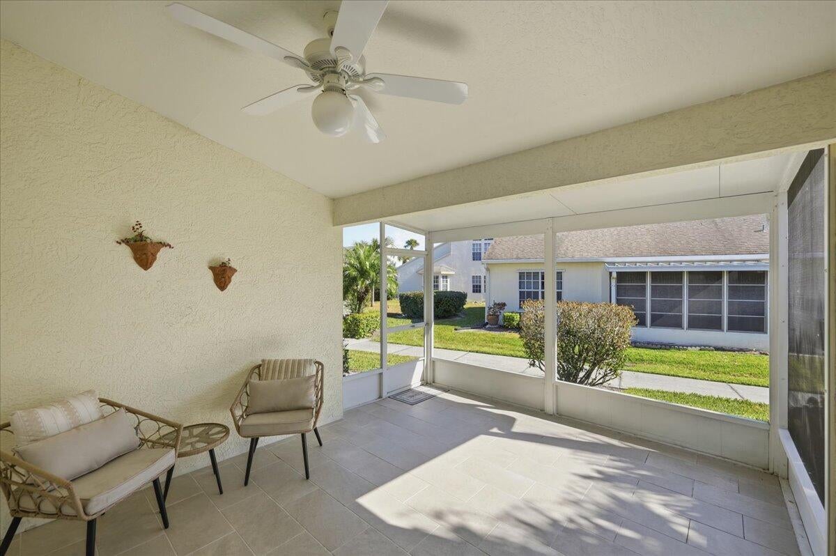 Welcome to this beautifully maintained 2-bedroom, 2-bath lakeside villa with a private garage and versatile den, offering a light-filled, open layout. High vaulted ceilings enhance the sense of space, while the inviting eat-in kitchen overlooks the lake and garden courtyard and features pull-out cabinetry, pantry storage, and ample workspace. Recent updates include a newly tiled lanai and fresh interior paint throughout, adding to the home's bright, move-in-ready appeal. Enjoy peace of mind with major improvements including A/C (2019), roof (2017), water re-pipe (2023), impact PGT windows (2022), and storm panels for doors.Additional highlights include pull-down attic access under air, top-down/bottom-up blinds, and a spacious den/family room with serene lake and clubhouse views. The large screened porch offers a full-size laundry closet and comfortable outdoor living space. The low HOA covers the roof and exterior maintenance, helping keep insurance costs affordable. Residents enjoy resort-style amenities including a heated pool and spa, tennis and pickleball courts, and a fitness center. Conveniently located near shopping, I-95, and golf, and just 8 miles to the beach, this exceptional villa offers comfort, value, and the best of Florida living.