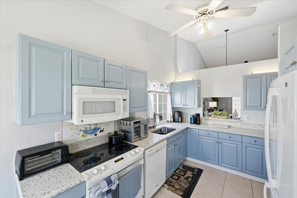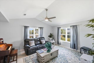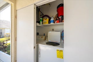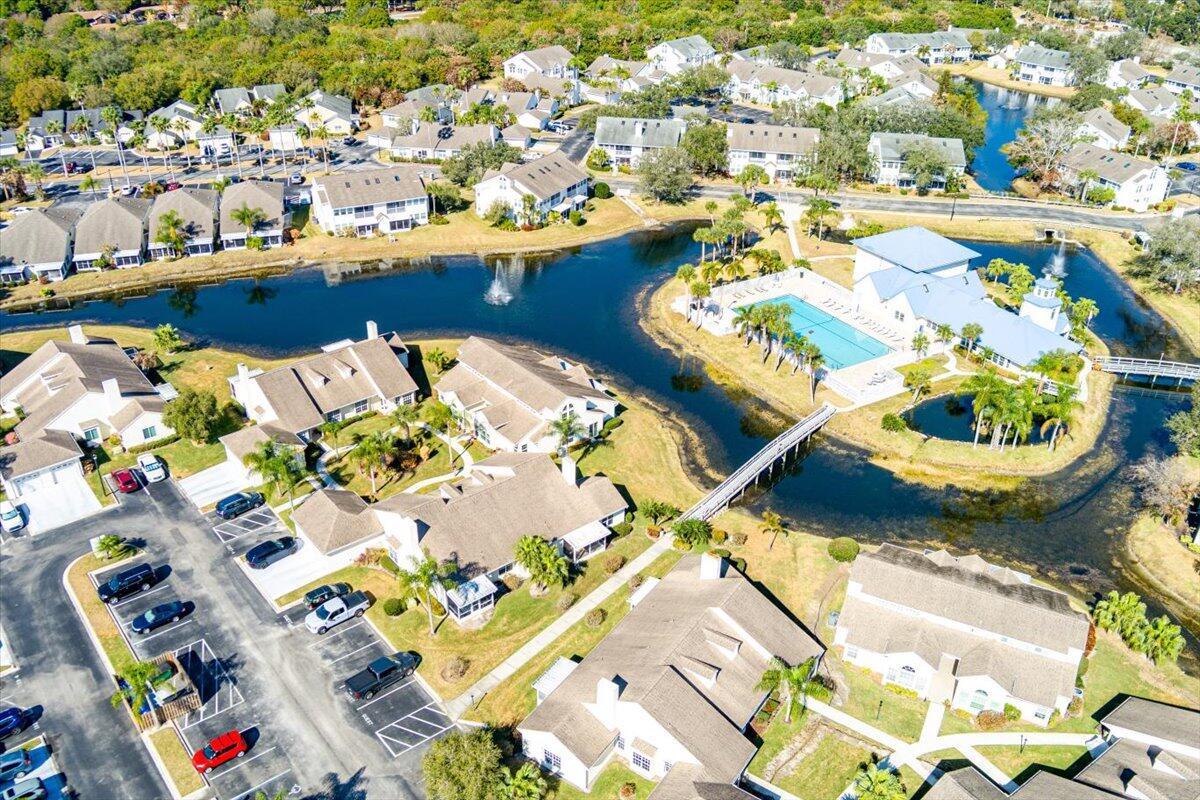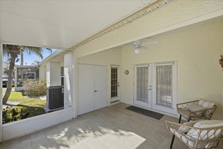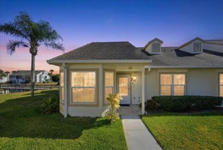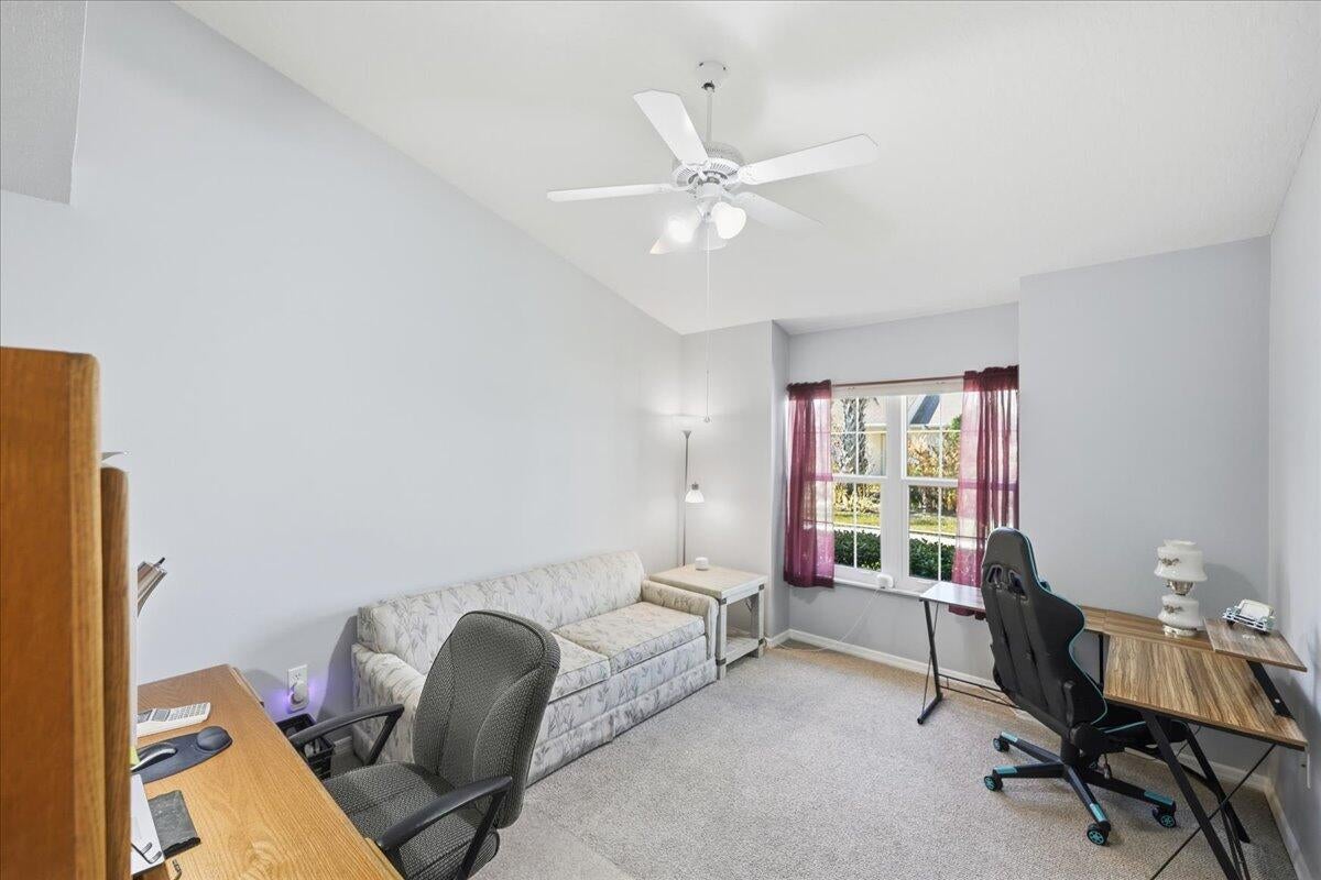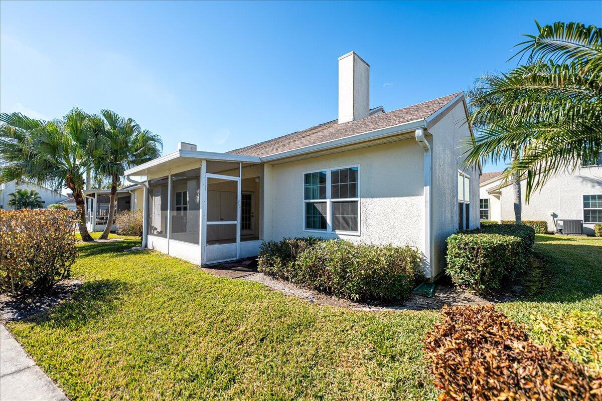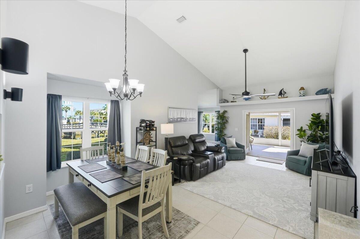 Welcome to this beautifully maintained 2-bedroom, 2-bath lakeside villa with a private garage and versatile den, offering a light-filled, open layout. High vaulted ceilings enhance the sense of space, while the inviting eat-in kitchen overlooks the lake and garden courtyard and features pull-out cabinetry, pantry storage, and ample workspace. Recent updates include a newly tiled lanai and fresh interior paint throughout, adding to the home's bright, move-in-ready appeal. Enjoy peace of mind with major improvements including A/C (2019), roof (2017), water re-pipe (2023), impact PGT windows (2022), and storm panels for doors.Additional highlights include pull-down attic access under air, top-down/bottom-up blinds, and a spacious den/family room with serene lake and clubhouse views. The large screened porch offers a full-size laundry closet and comfortable outdoor living space. The low HOA covers the roof and exterior maintenance, helping keep insurance costs affordable. Residents enjoy resort-style amenities including a heated pool and spa, tennis and pickleball courts, and a fitness center. Conveniently located near shopping, I-95, and golf, and just 8 miles to the beach, this exceptional villa offers comfort, value, and the best of Florida living.