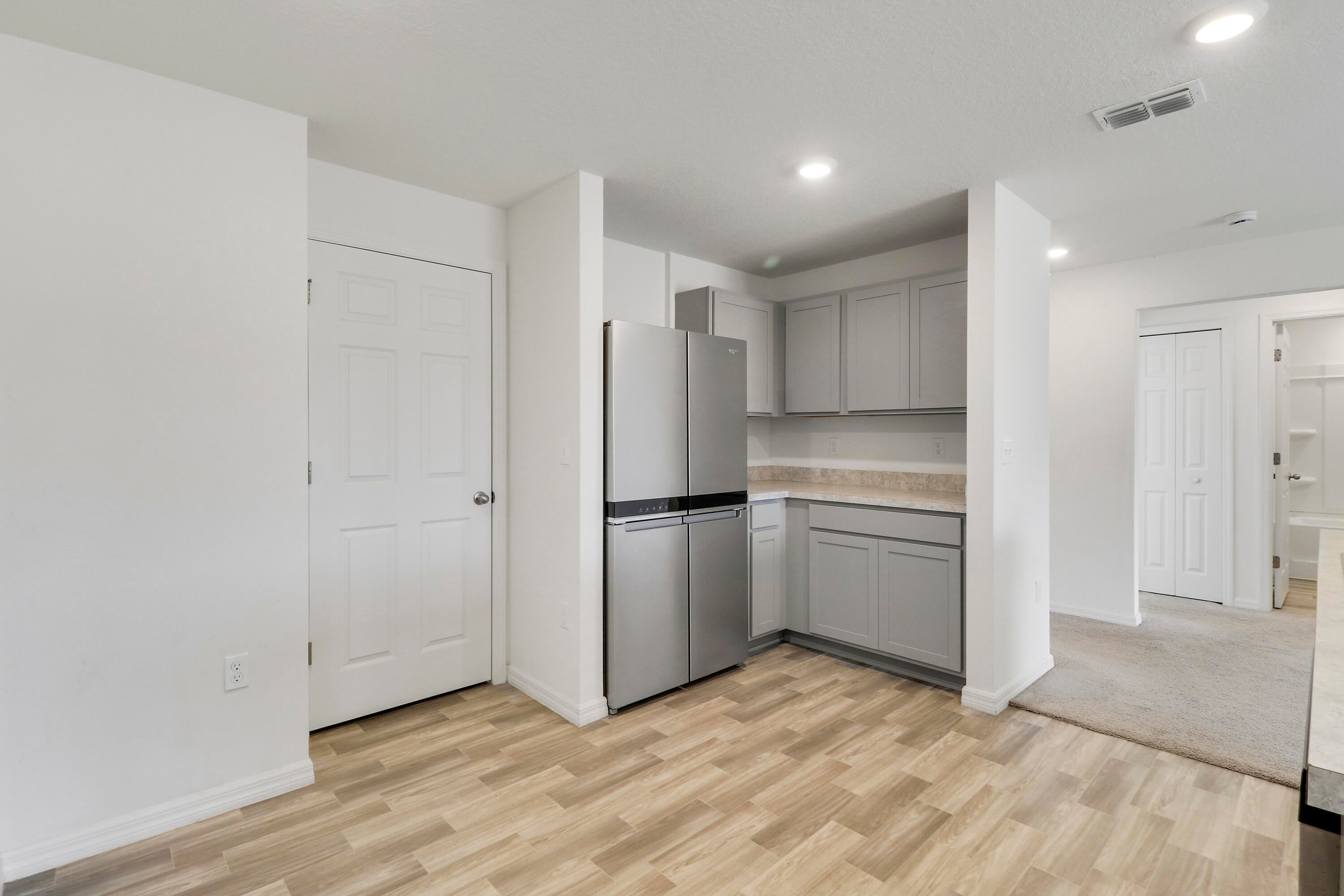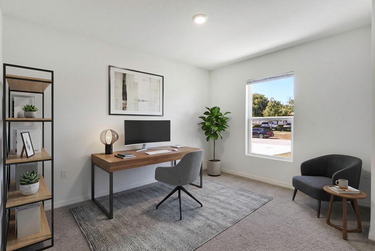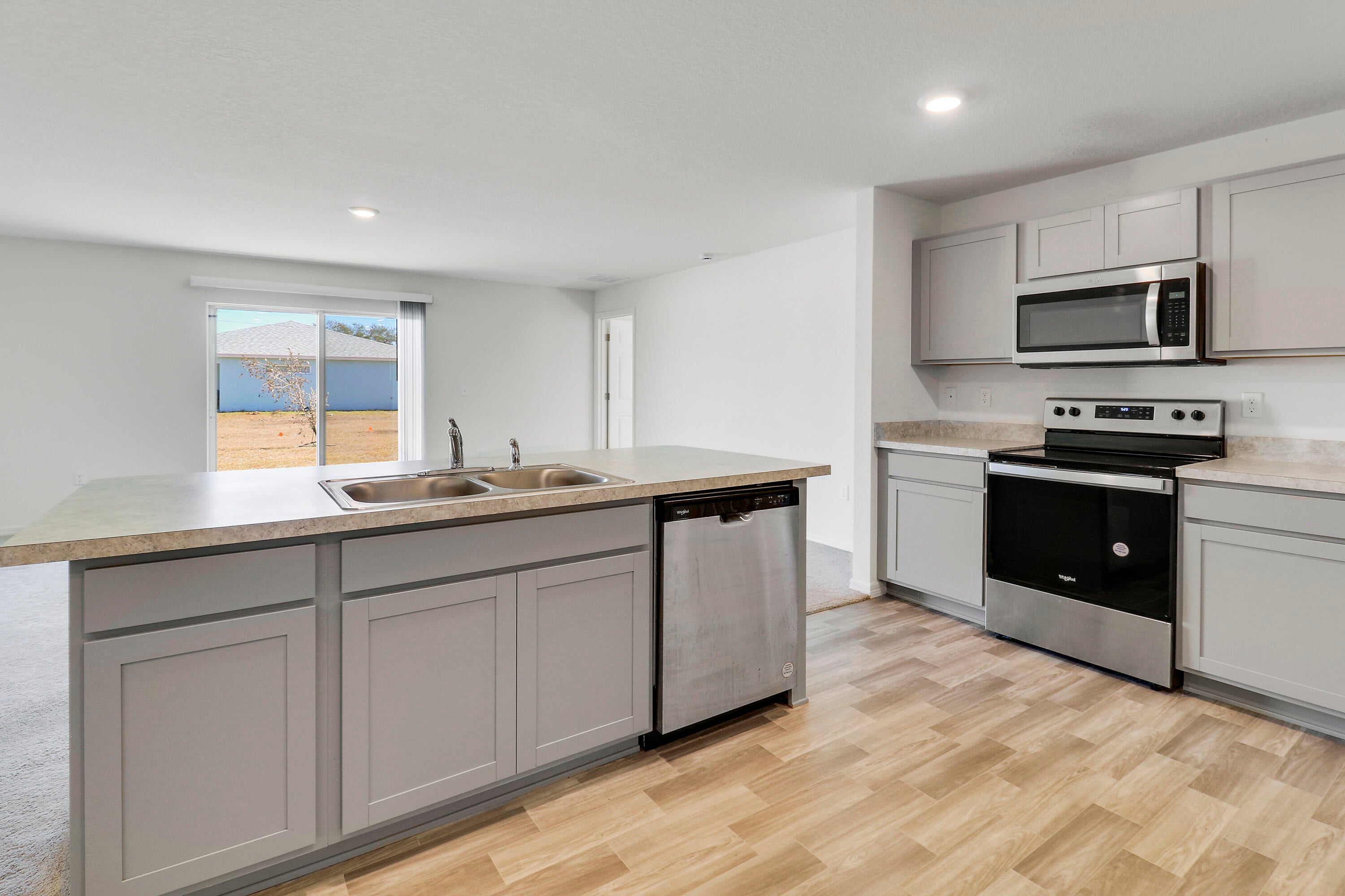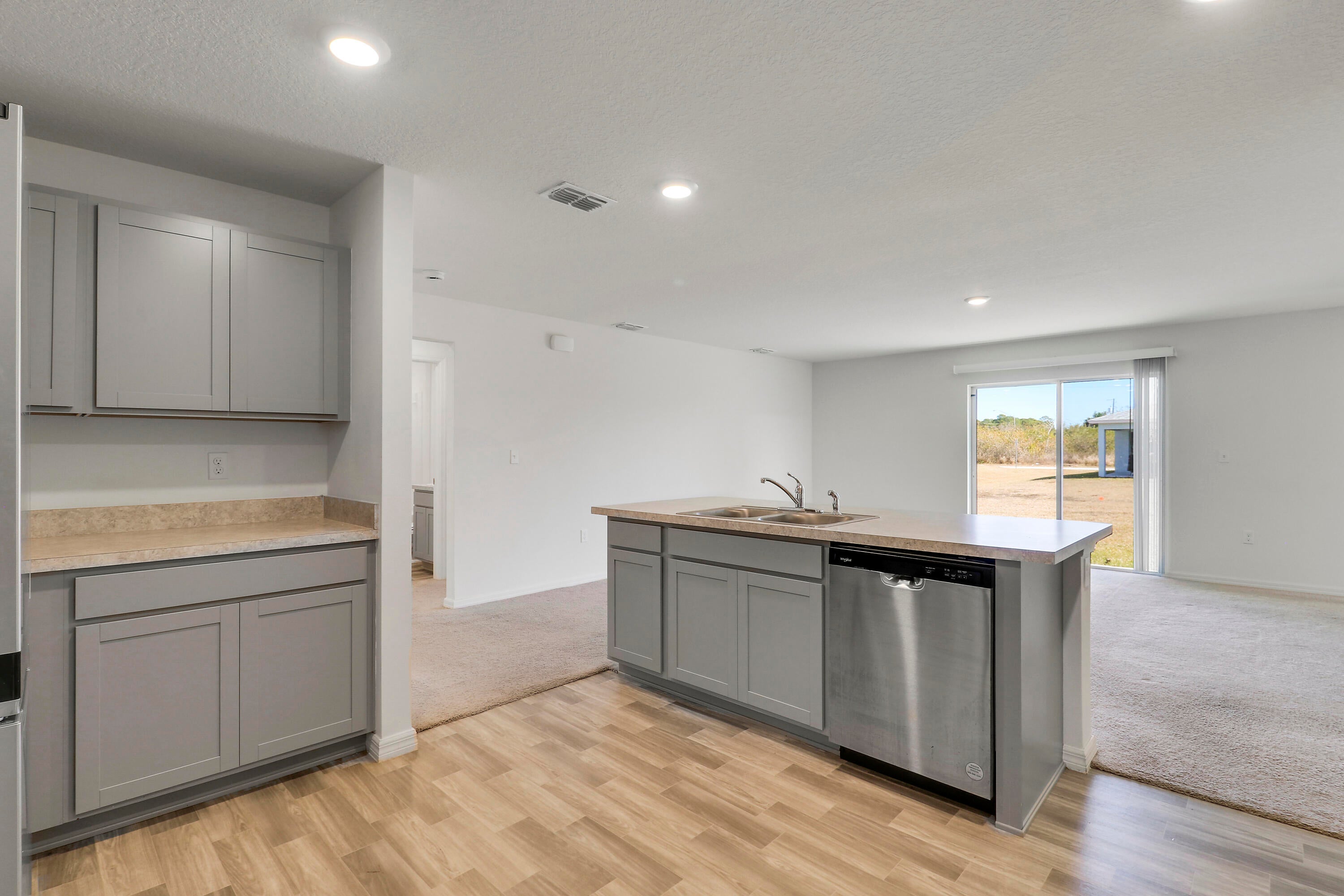 Move-in ready 2023-built home featuring 4 bedrooms, 2 bathrooms, and a 3-car garage. Bright open floor plan with a spacious living area, modern recessed lighting, and neutral finishes throughout. Kitchen offers stainless steel appliances, ample cabinetry, and a large island overlooking the main living space. Indoor laundry room, and waterproof vinyl flooring in main areas with carpeted bedrooms. Large backyard and convenient Port St. Lucie location near the Florida Turnpike, shopping, dining, & schools. No deed restrictions or HOA!