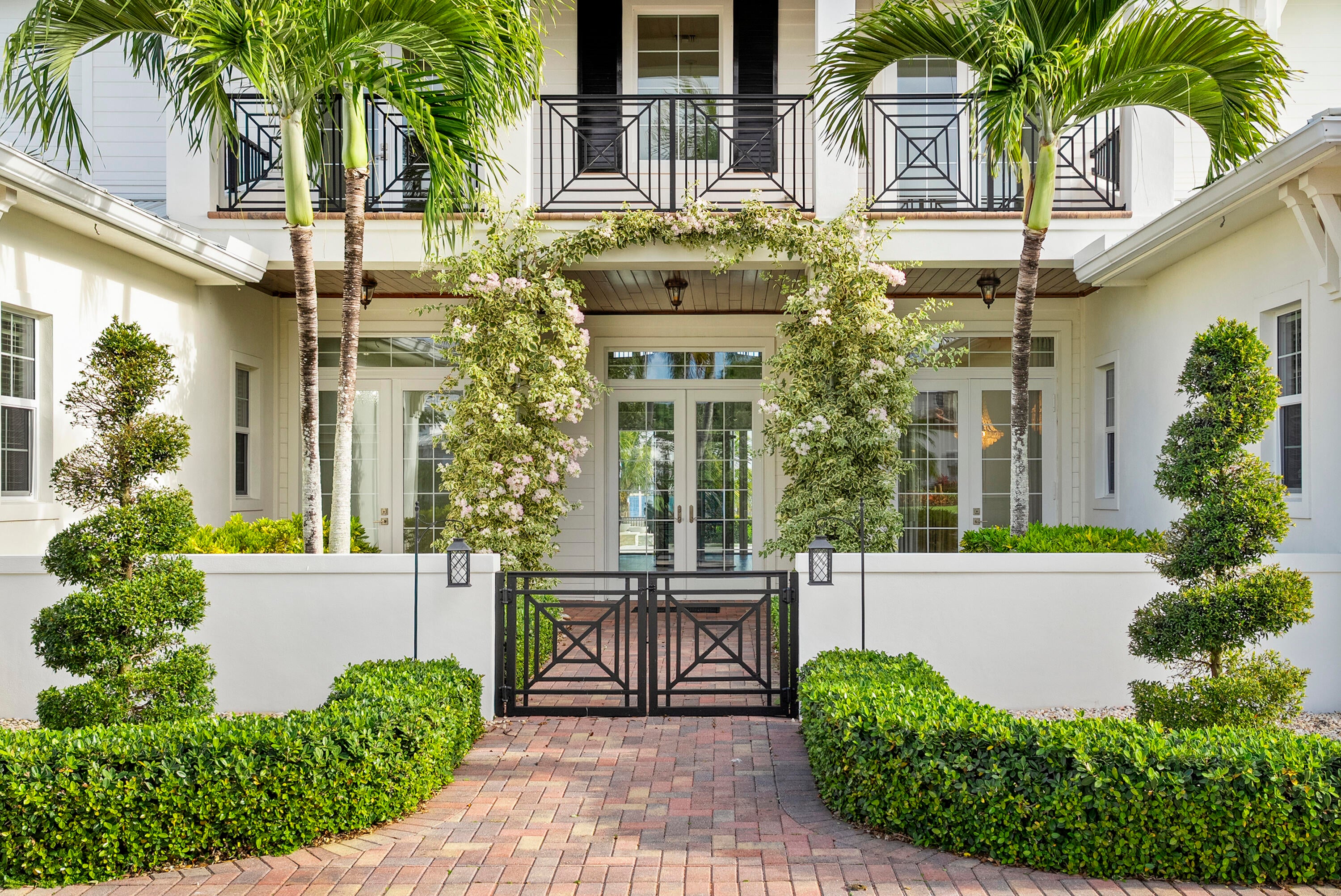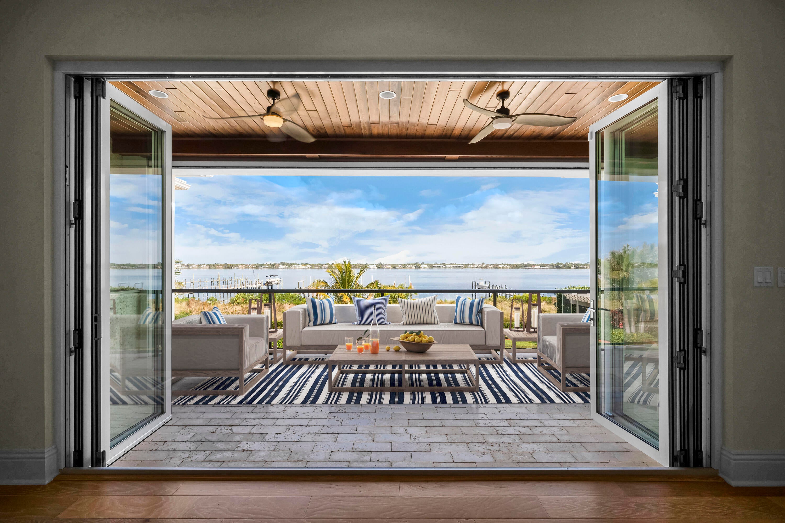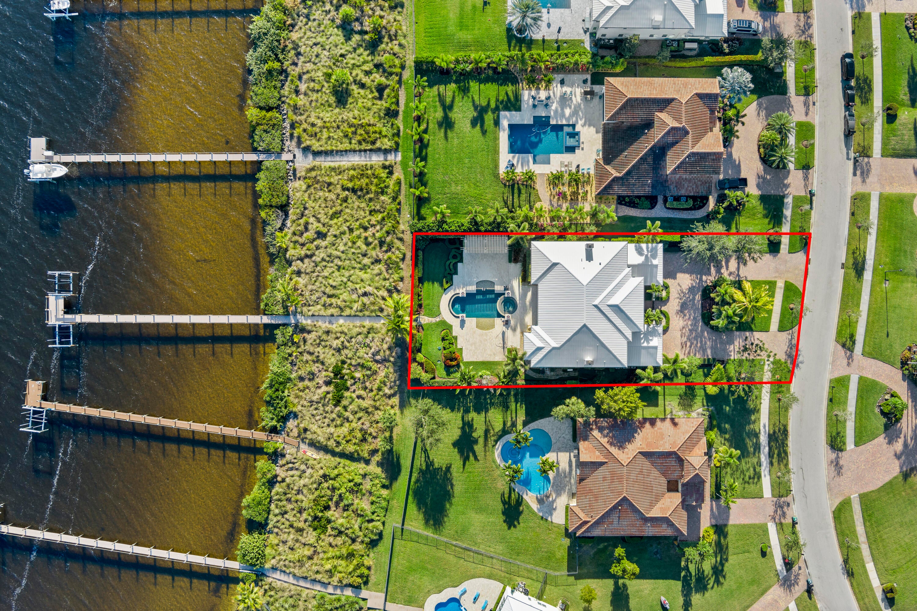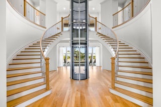 WIDE WATERFRONT - Experience waterfront luxury in this Riverbend original model estate, set farther back than neighboring homes for enhanced privacy. Nearly 6,000 sq ft with 5 bedrooms, 6 full and 2 half baths, and a 4-car garage, located in Martin County school district. A grand French door entry opens to soaring ceilings, a double staircase, and private elevator. The chef's kitchen features Sub-Zero and Wolf appliances, a Butler's pantry, and island. The great room captures wide water views. The primary suite offers a spa-style bath and custom closets. Upper and lower porches include automated screens, fireplace, and TV. Outdoor living includes a heated saltwater pool, deep-water dock, and two 16,000-lb boat lifts with ocean access and no fixed bridges. Located in a gated community.