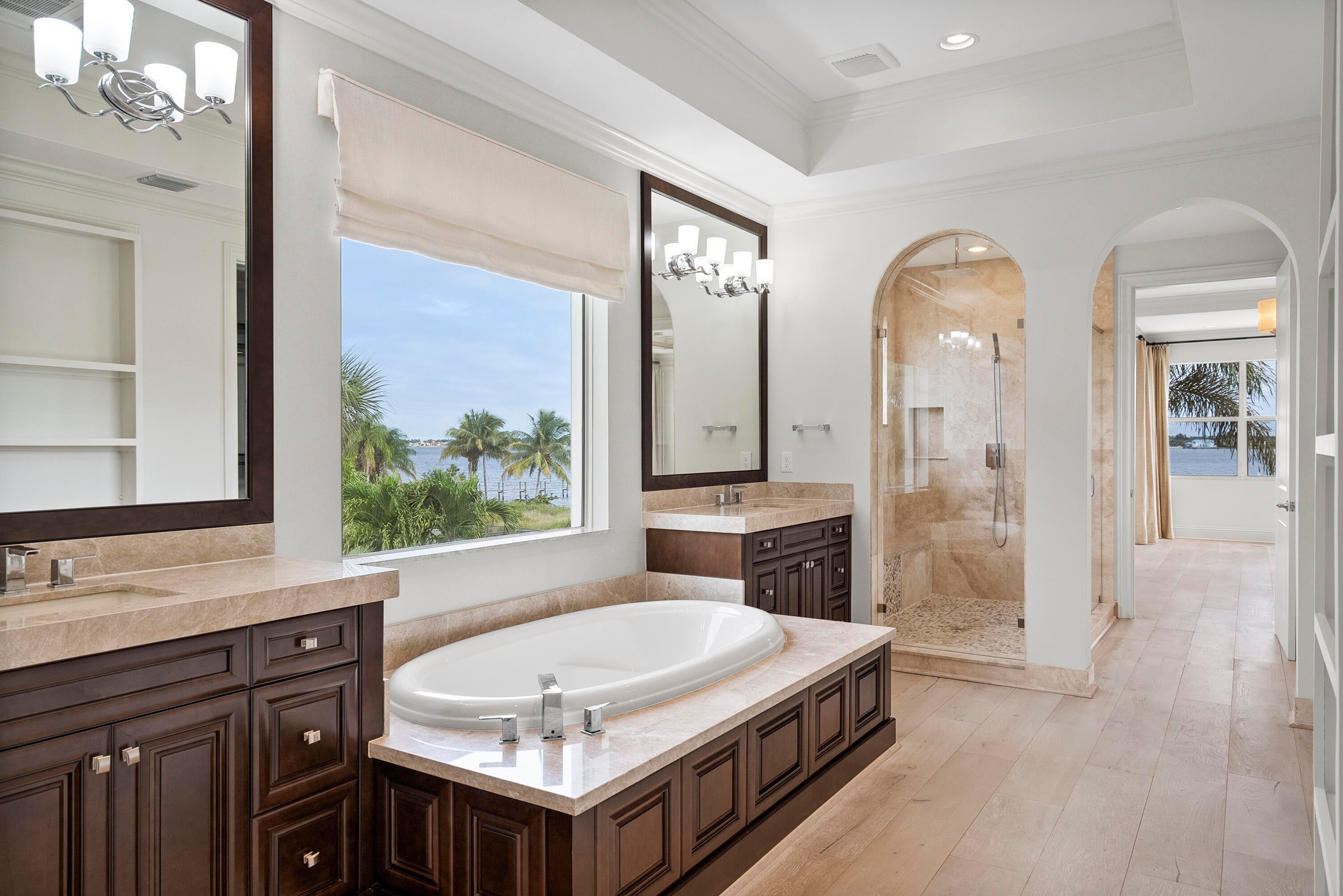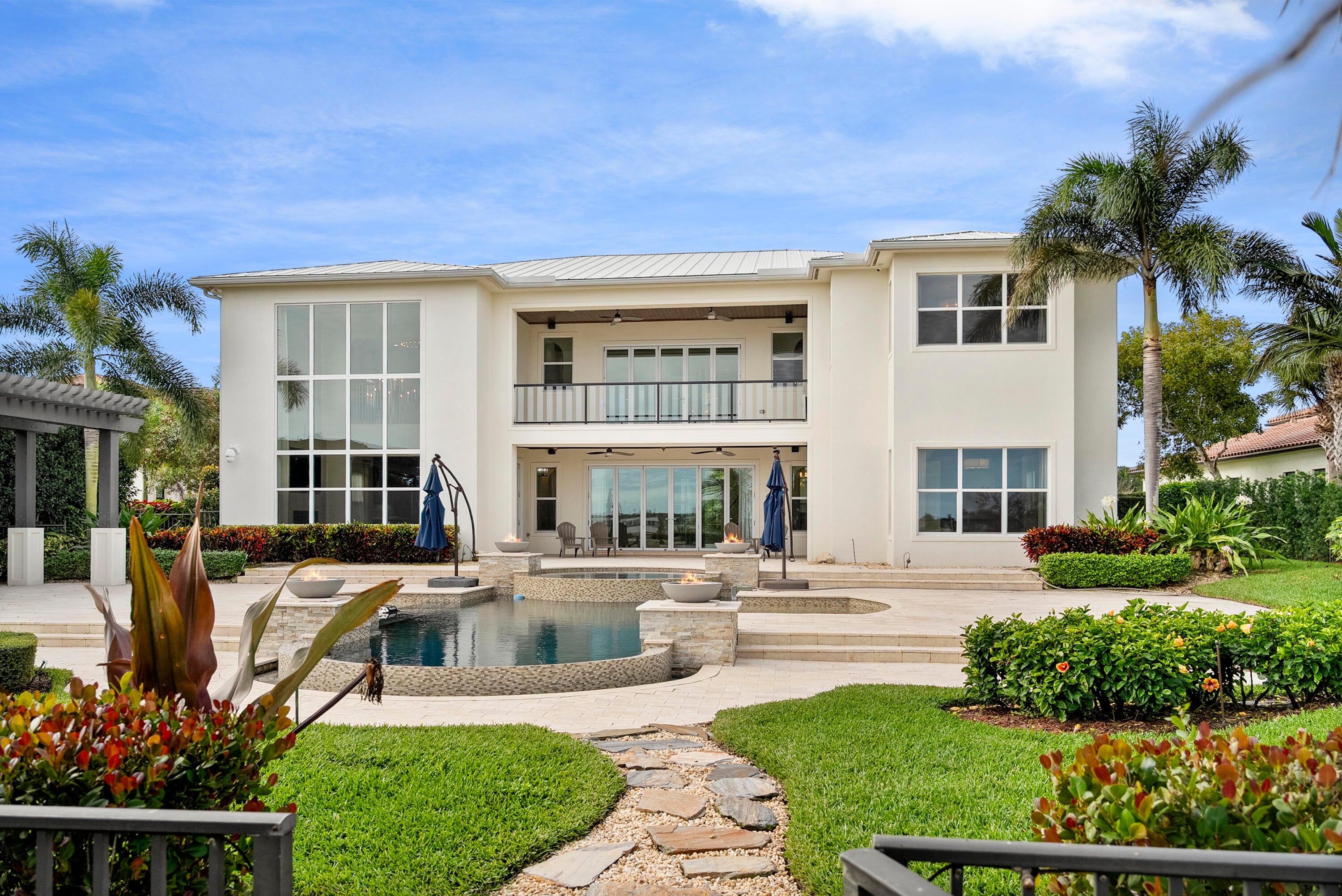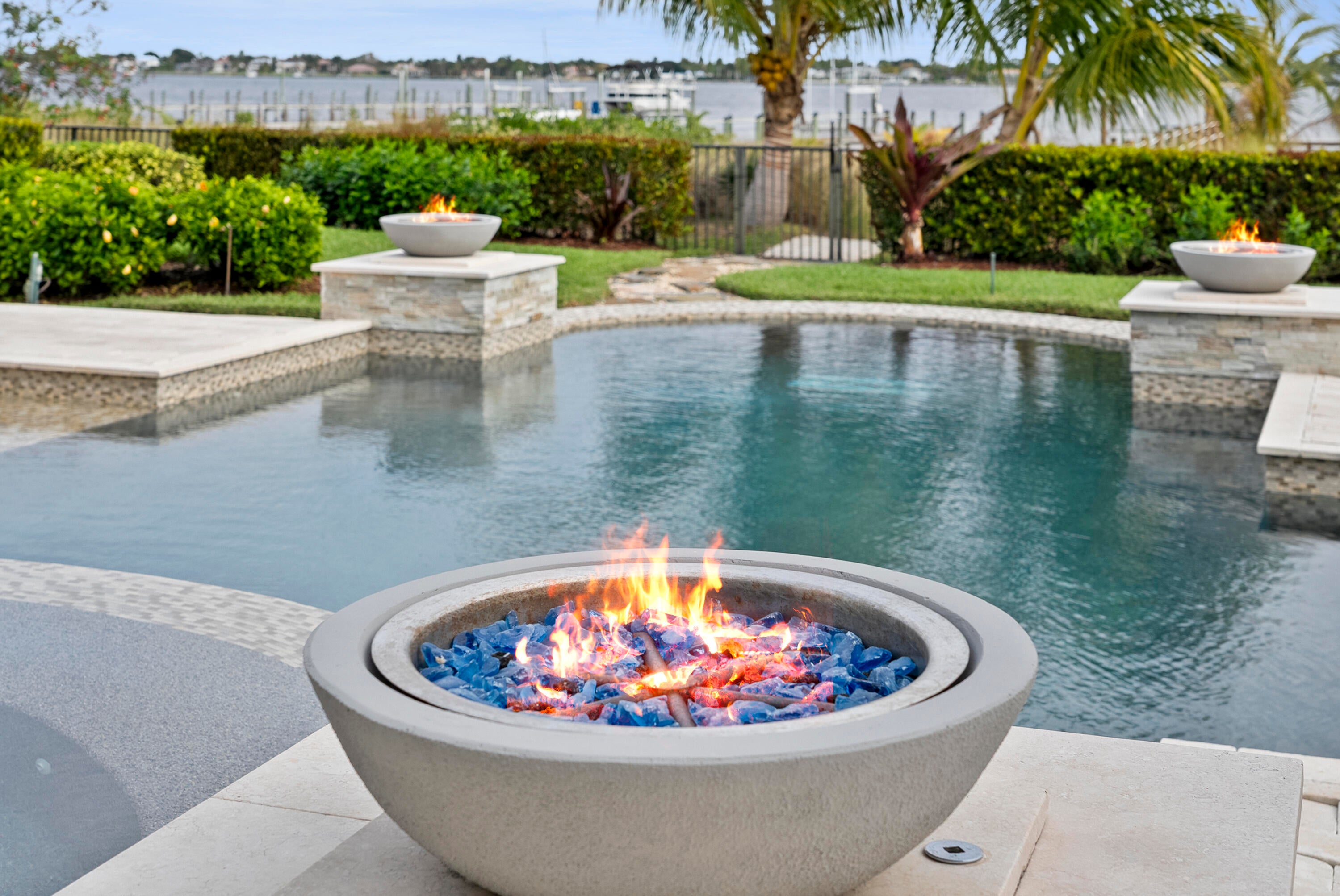 WIDE WATERFRONT - Experience waterfront luxury in this Riverbend original model estate, set farther back than neighboring homes for enhanced privacy. Nearly 6,000 sq ft with 5 bedrooms, 6 full and 2 half baths, and a 4-car garage, located in Martin County school district. A grand French door entry opens to soaring ceilings, a double staircase, and private elevator. The chef's kitchen features Sub-Zero and Wolf appliances, a Butler's pantry, and island. The great room captures wide water views. The primary suite offers a spa-style bath and custom closets. Upper and lower porches include automated screens, fireplace, and TV. Outdoor living includes a heated saltwater pool, deep-water dock, and two 16,000-lb boat lifts with ocean access and no fixed bridges. Located in a gated community.