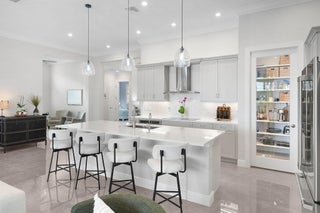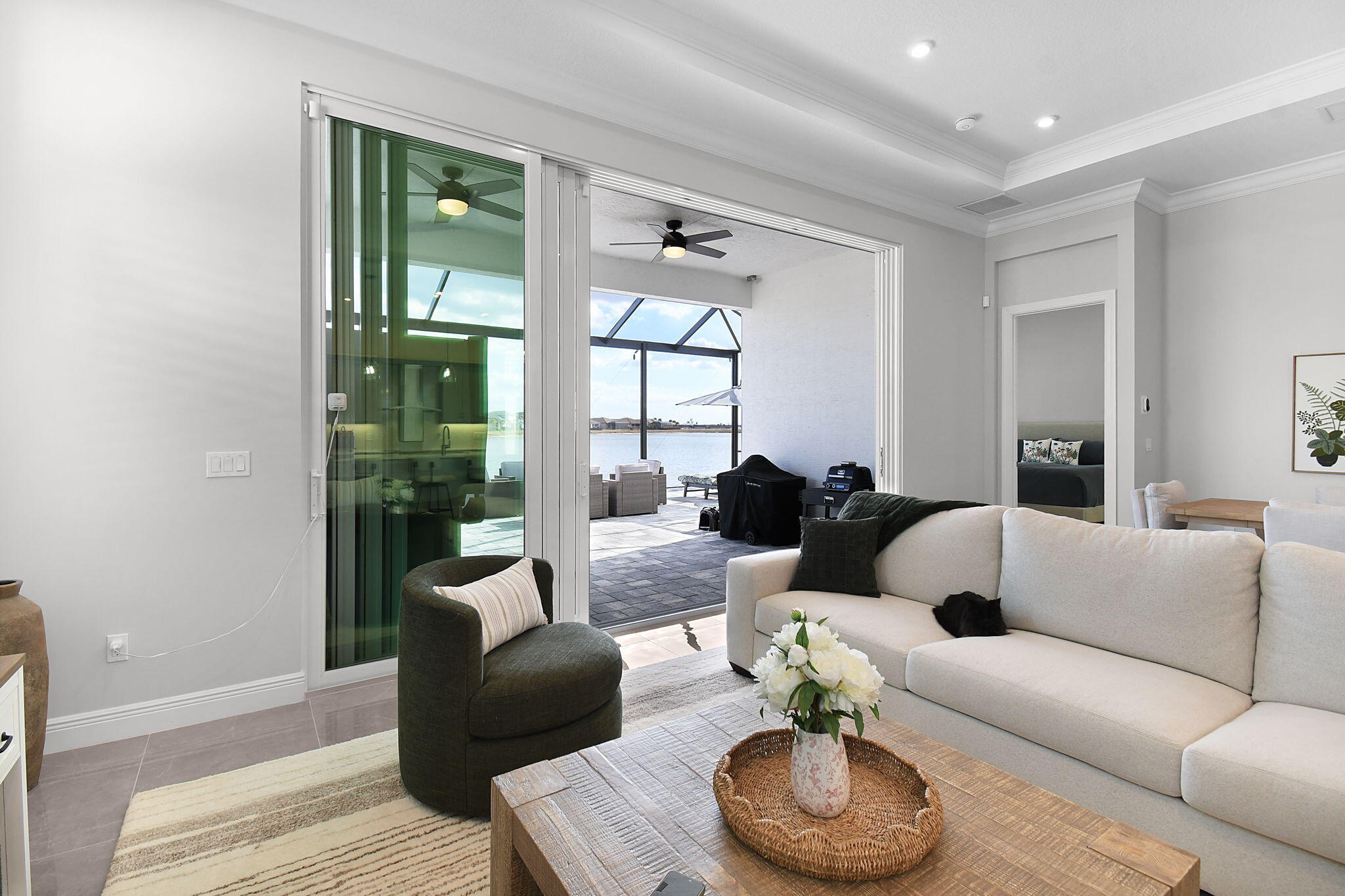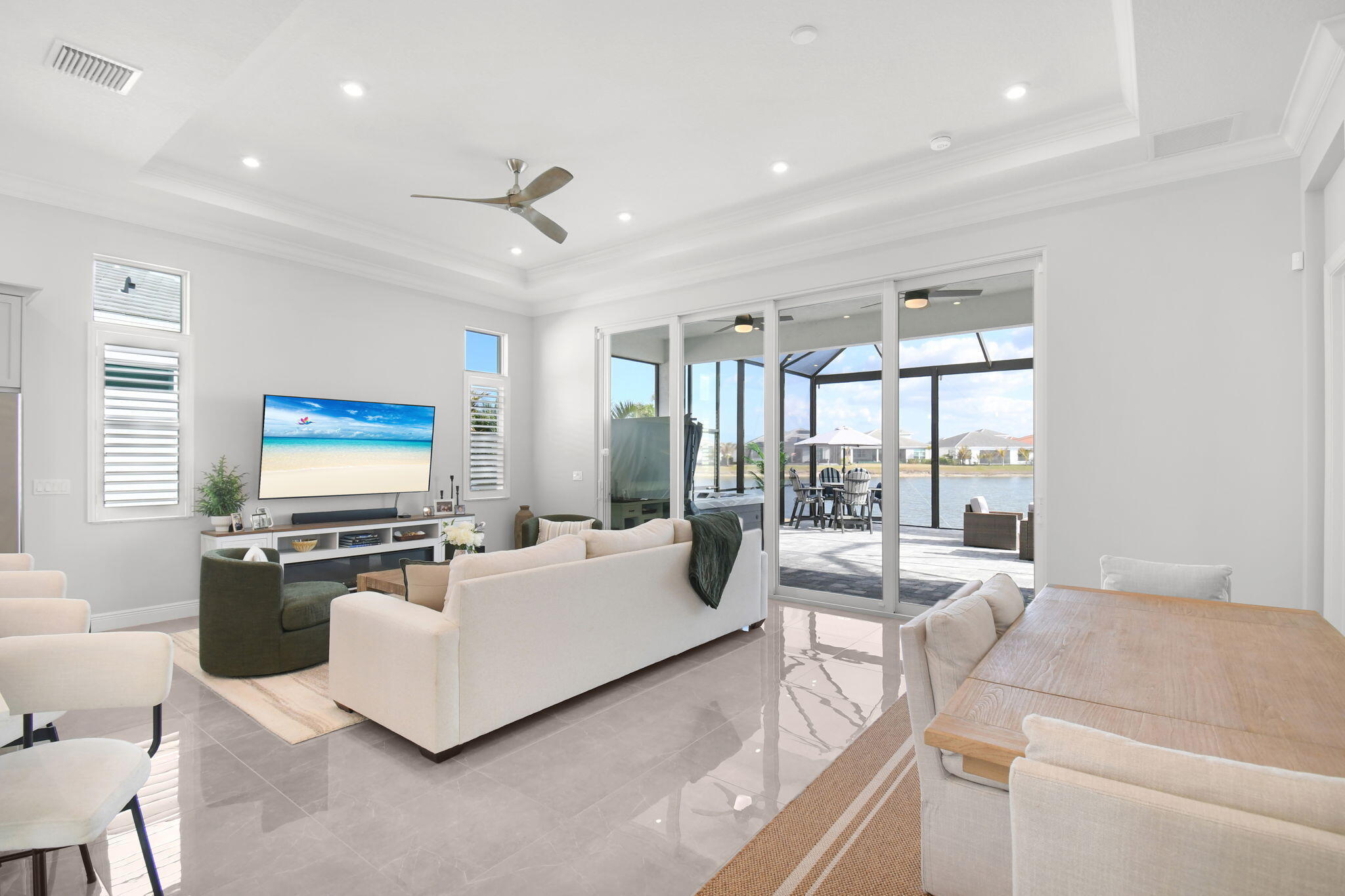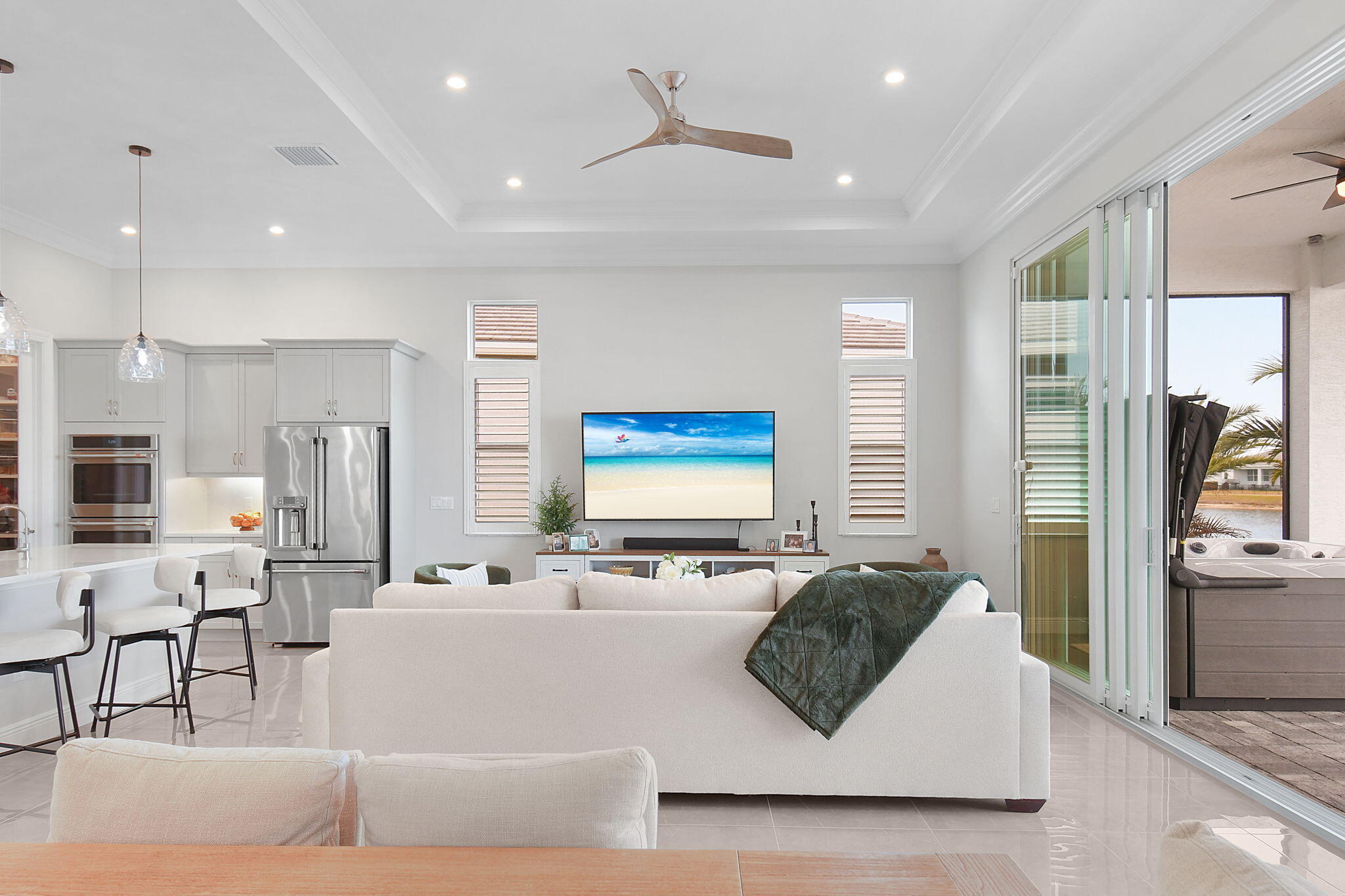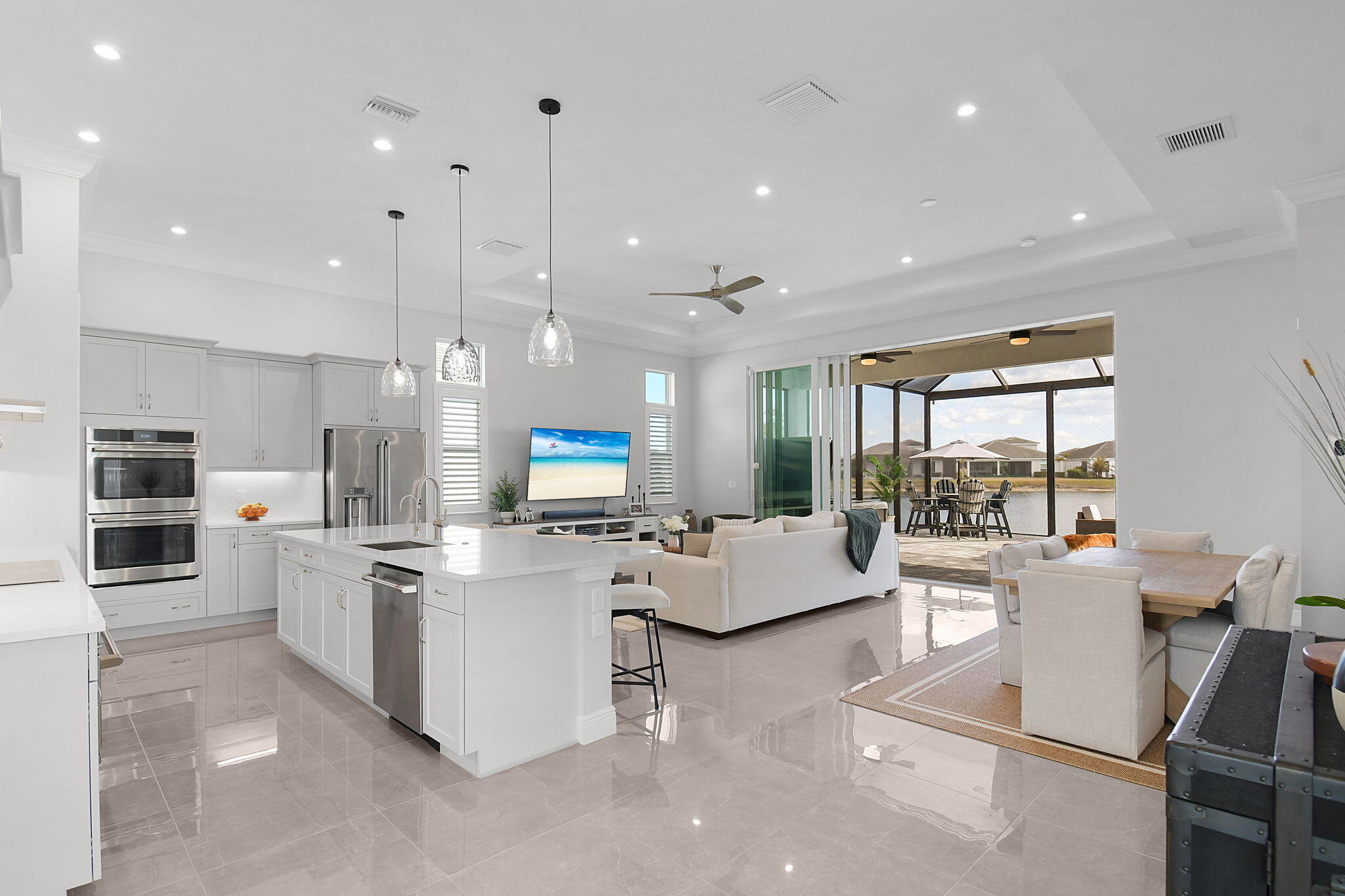 Experience the pinnacle of resort-style living in PGA Village Verano with this highly upgraded 2024 Kolter-built lakefront residence set on a premium wide-water homesite with ideal southern exposure. Designed for the most discerning buyer, this 3-bedroom, 3-bath home with a 3-car garage showcases over $200,000 in builder and post-closing upgrades, offering a move-in-ready luxury lifestyle without the wait to build.From the moment you enter, the home impresses with 24x24 high-gloss tile flooring throughout, upgraded solid-core interior doors, custom moulding, and a stunning Therma-Tru privacy glass entry.The open-concept design is enhanced by oversized sliding glass doors that seamlessly connect indoor and outdoor living while framing breathtaking long lake views and all-day southern light. The chef's kitchen was thoughtfully upgraded with GE Café appliances including a 36" induction cooktop, double ovens, chimney hood, and expanded cabinetry, complemented by full-height backsplash, glass pantry door, designer lighting, and extensive storage, ideal for entertaining and everyday luxury. Spa-inspired baths feature floor-to-ceiling tile, frameless showers, upgraded vanities, and extended mirrors, creating a true retreat feel in every space. Step outside to a dramatically expanded 20x40 screened lanai with pavers overlooking wide water, perfect for sunrise coffee, evening gatherings, and enjoying Florida's indoor-outdoor lifestyle year-round. A premium hot tub, additional exterior lighting, and full-home gutters further enhance comfort and functionality. Additional highlights include: Custom closet systems throughout Plantation shutters in all rooms including garage Designer lighting and ceiling fans Whole-home paint upgrades Reverse osmosis water system Insulated garage with mini-split A/C Tesla charger service + additional dedicated electrical upgrades Added attic flooring and overhead storage Located in PGA Village Verano, residents enjoy a resort-caliber lifestyle with a spectacular clubhouse campus, fitness center, indoor and outdoor pools, tennis, pickleball, social clubs, dining (PGA Village), and year-round activities, all within a gated, beautifully maintained community. This is a rare opportunity to own a nearly new, extensively upgraded waterfront home on one of Verano's most desirable lots, where luxury, lifestyle, and location come together seamlessly.