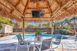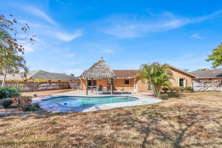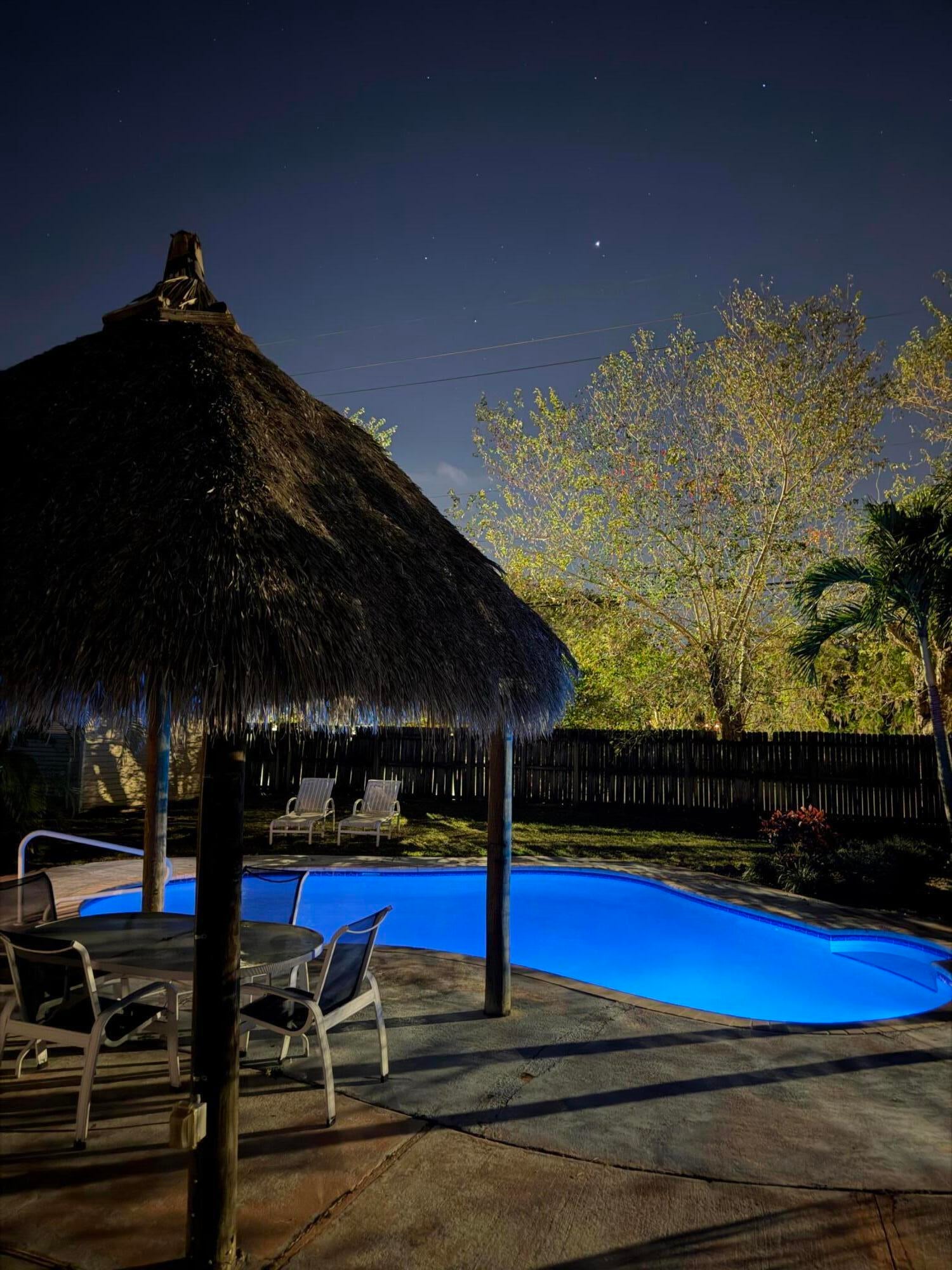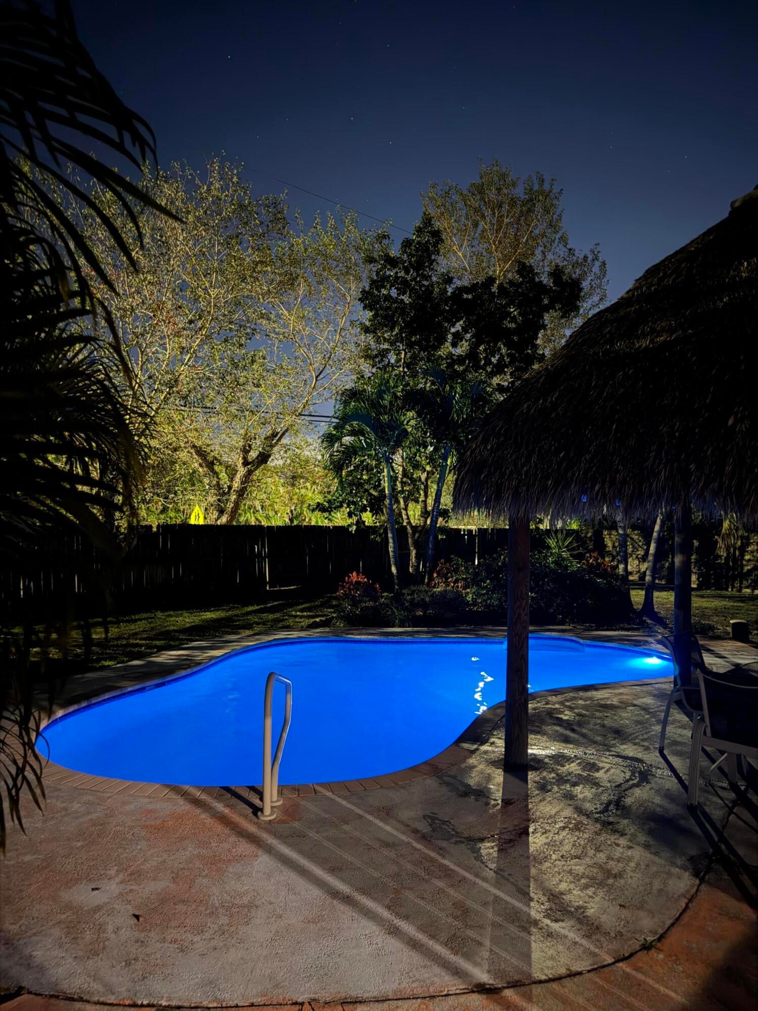 This beautifully maintained 3 bedroom, 2 bathroom home with a 2 car garage offers the perfect blend of comfort, functionality, and outdoor living with no HOA. Featuring a brand new AC (2025) and located in a highly desirable area, this move in ready home is ideal for relaxing and entertaining.Step outside to your private backyard oasis with a sparkling inground pool, tiki hut with TV, outdoor shower, and a shed for extra storage. Mature mango and avocado trees add charm and a true Florida lifestyle feel.