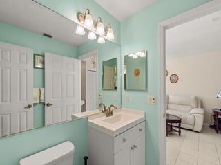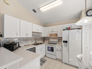 Charming villa located in Kings Isle, a desirable 55+ community. This well-maintained home offers 2 bedrooms, 2 bathrooms, and a convenient carport at the entrance of courtyard. Features title flooring throughout, updated kitchen with white cabinets, quartz countertops and beautiful backsplash. Additional improvements include newer LG washer and dryer, 2023 W/H. freshly painted interior, and partial hurricane shutters for front windows and door. Villa has been fully re-piped for added peace of mind. Relax and unwind in the spacious screened and enclosed patio perfect for relaxing or entertaining. Hassle free HOA includes Lawn Care, internet, cable, and manned guard gate Welcoming Resort style Clubhouse with recreational facilities and over 30 interesting clubs and many events to choose.Conveniently located near shopping, medical center, golf course, and I-95