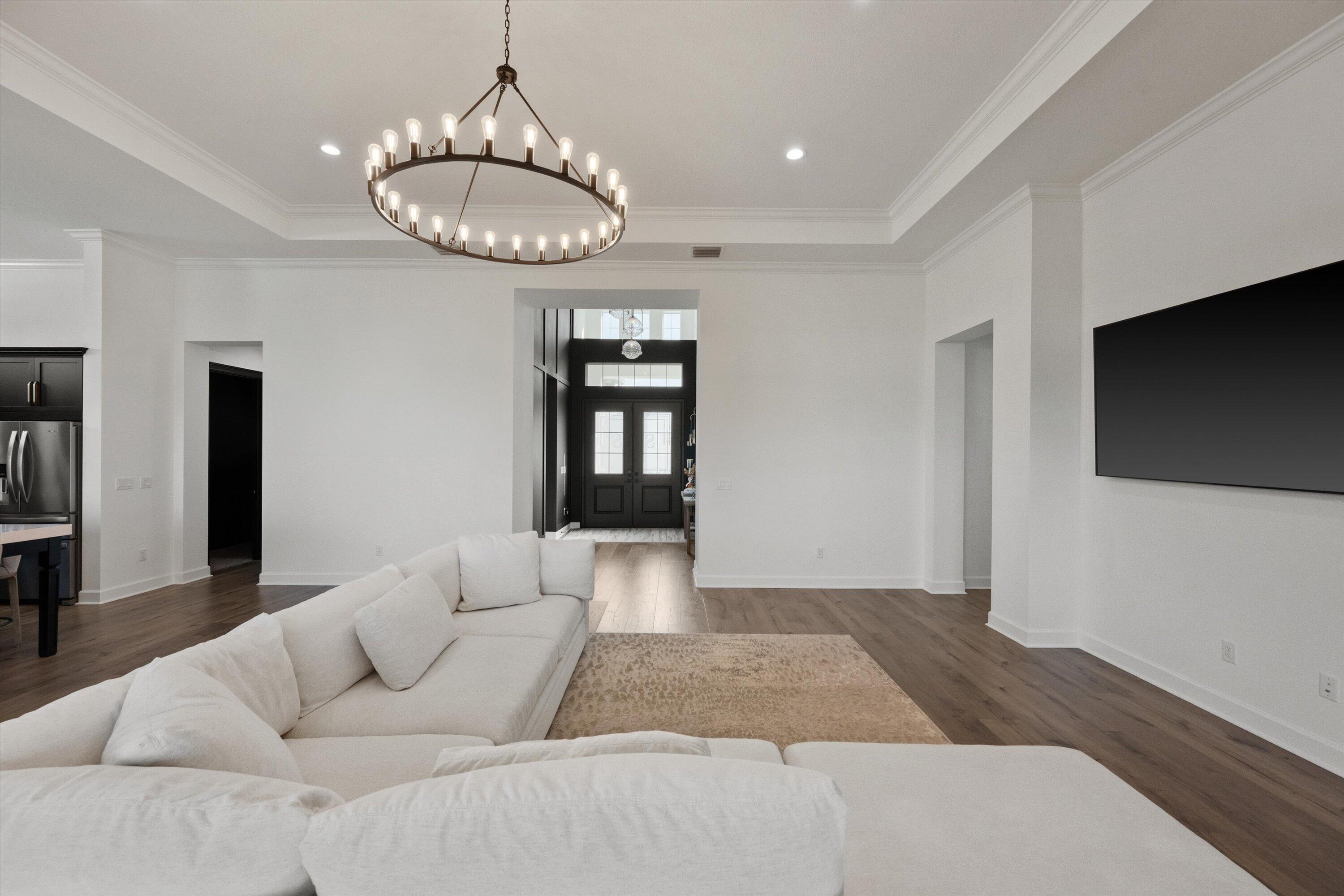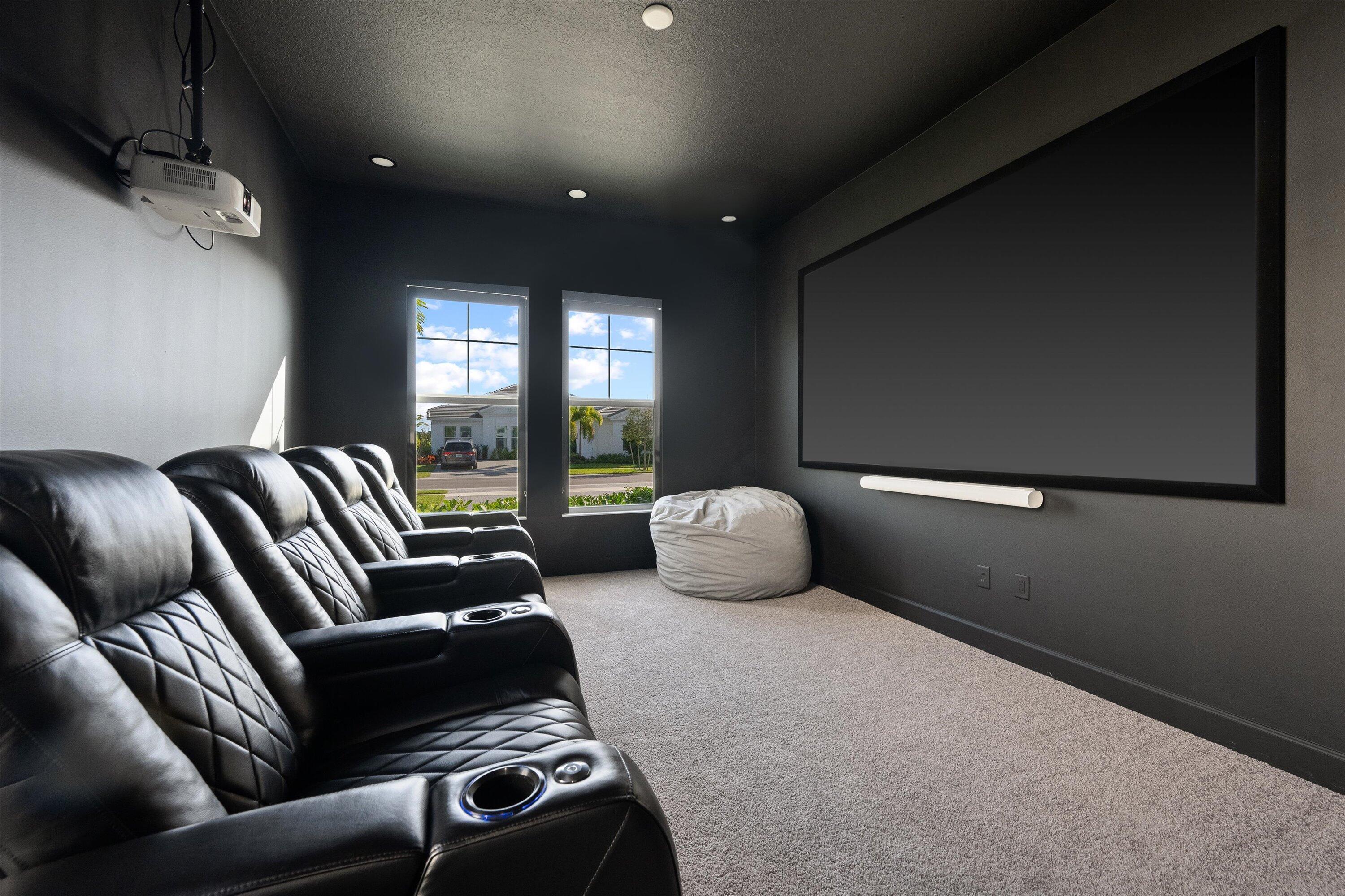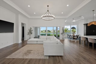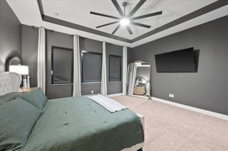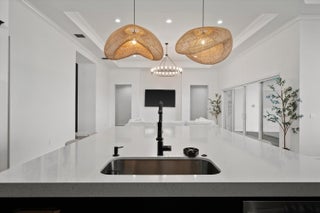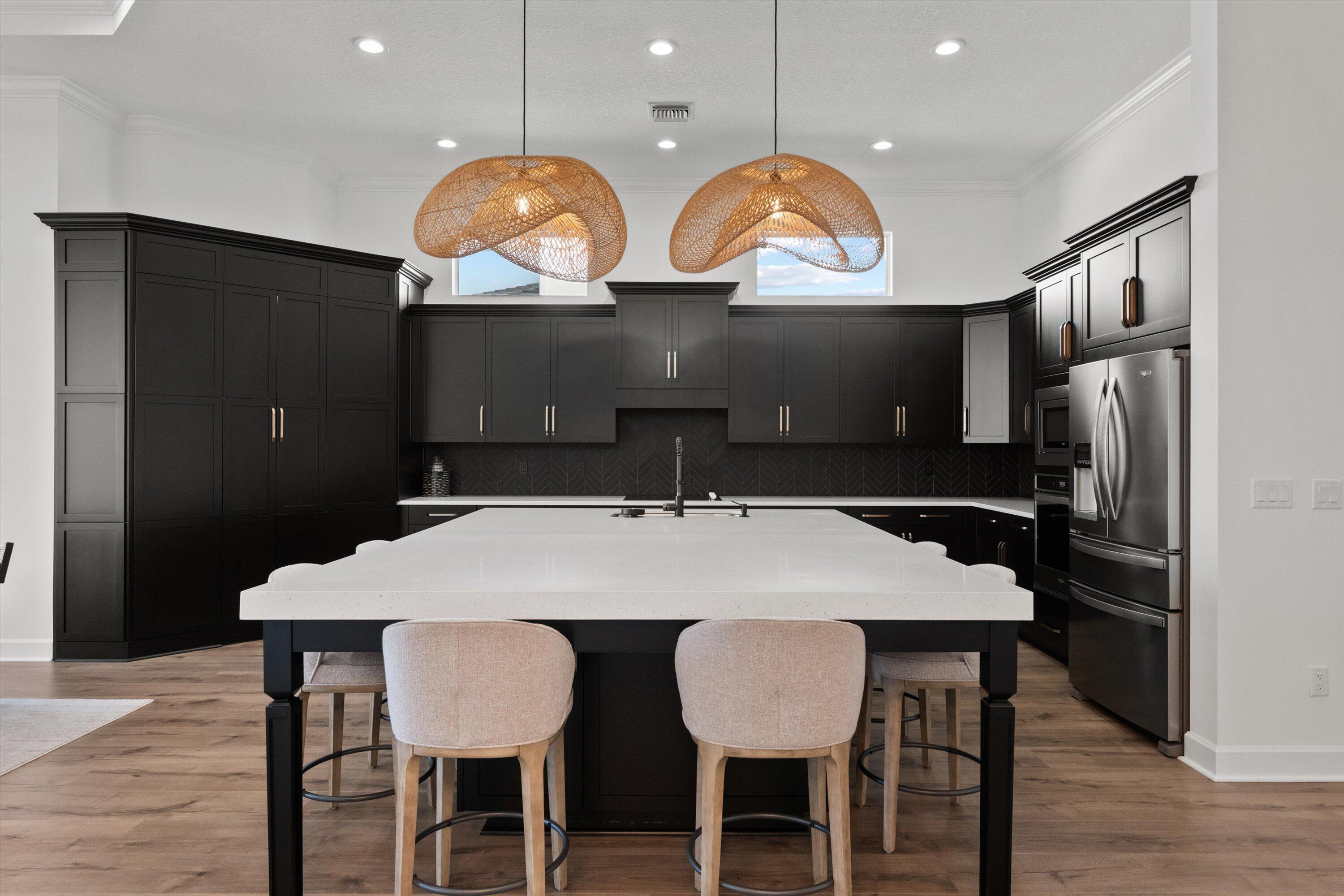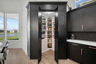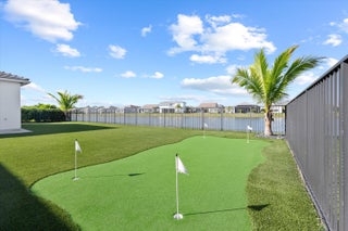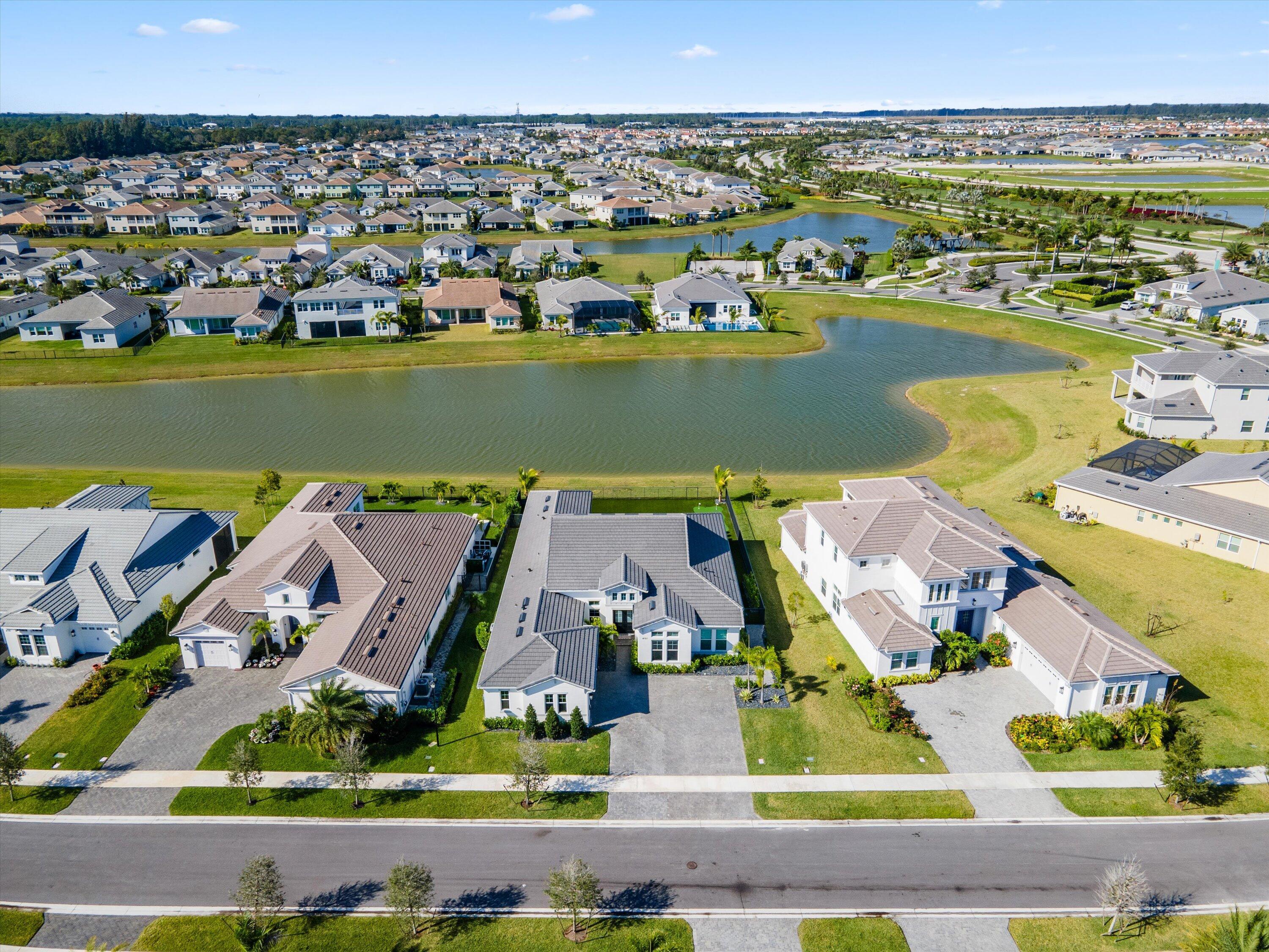 Introducing the magnificent Jupiter Grand Model in the highly sought-after Estates Community of Westlake! This exceptional residence boasts an impressive 6 bedrooms and 4.5 baths, artfully designed to encapsulate luxury living. From the curb, the home's majestic presence is evident with its extended driveway and pathway leading elegantly to the backyard oasis. Step through the luxurious black French doors into a 17'4'' tray ceiling foyer, a masterpiece featuring sleek board and batten design adorned in sophisticated black, complemented by a chic ceiling light fixture. The main areas of this home are graced with stunning wood laminate flooring, providing an elegant warmth and cohesion throughout.The heart of the home, the kitchen, will leave you breathless. With towering 12 to 13-foot ceilings, it showcases black shaker soft-close cabinets accented by striking gold hardware, black plumbing and exquisite white sparkle quartz countertops. The substantial island with a 3" slab accommodates up to seven comfortably, surrounded by additional cabinetry for optimal storage. Enhancing your culinary experience are top-of-the-line stainless steel appliances, including a French door refrigerator, a decorative pantry panel and custom-built closet storage. The herringbone black backsplash paired with black plumbing fixtures brings a touch of sophistication, while two eye-catching rattan light fixtures artfully illuminate the space. Adjacent to the kitchen, the dining area is a visual delight with a stunning bay window complete with roller shades, offering breathtaking views of the lake and unforgettable sunsets, all beneath a pendant light fitting. Nearby, the expansive great room (21'2 x 22) beckons with its impact glass sliders and roller shades, ideal for seamless indoor-outdoor living and is adorned with a magnificent chandelier. Retreat to the master suite, a peaceful haven featuring plush carpeting and panoramic lake views. Its ample dimensions (16 x 16'11) are accentuated by a trio of windows, anchored by a picturesque middle pane, complete with blackout shades and a stylish ceiling fan. Relish in the lavish master bath, showcasing a double showerhead, marble-like wall tiles with sleek black hardware, and an open glass enclosure concept that redefines relaxation. The elegant light wood shaker cabinets, soft closing with sparkling white quartz countertops, provide quaint sophistication alongside two generous custom walk-in closets. The additional bedrooms in this illustrious dwelling have been thoughtfully designed with comforts in mind. Plush carpeting, blackout blinds, custom closets and an array of Jack and Jill style bathrooms. No detail has been overlooked, from the freestanding sinks, timeless white shaker cabinets with gray quartz tops, contemporary black hardware and chrome plumbing, to the luxurious light gray subway tiles and handy linen closets. Bedroom 4 offers extra space with two closets, high ceilings, and windows equipped with blinds. Bedroom 5's flexibility is its charm, currently fitted as an office with impeccable custom woodwork, easily converted back to a standard guest room. Its adjoining bathroom is a classic symphony of vertically stacked white tiles, complemented by timeless white cabinetry and black hardware. Bedroom 6 offers a unique twist, transformed into a plush theater room with all-black decor and blackout shades, with en-suite facilities echoing the home's sophisticated design language of white cabinets, quartz counters, and wood-like tile flooring. Not to miss are the strategic storage solutions sprinkled throughout the home, including an impressively sized laundry room equipped with a laundry tub, black shaker cabinets, and gold touches. And yes, a convenient powder bath further enhances the functionality and style of this dream home. Additional highlights include a mini-split A/C system in the garage perfect for a home gym, workshop, or climate-controlled storage. The outdoor realm is sheer paradise with a 41x44" covered lanai boasting 12" soaring ceilings to entertain or unwind. The fully fenced backyard features a complete astro-turf transformation for easy maintenance, inclusive of a delightful putting green and sandpit for endless enjoyment. An outdoor built in BBQ setup completes the backyard experience ideal for hosting, grilling, and enjoying Westlake's indoor-outdoor lifestyle. This extraordinary estate offers an unmatched combination of luxury, functionality, and style, making it truly worth a million dollars. Don't miss out on this exclusive opportunity to live in one of Westlake's finest homes schedule your private tour today!