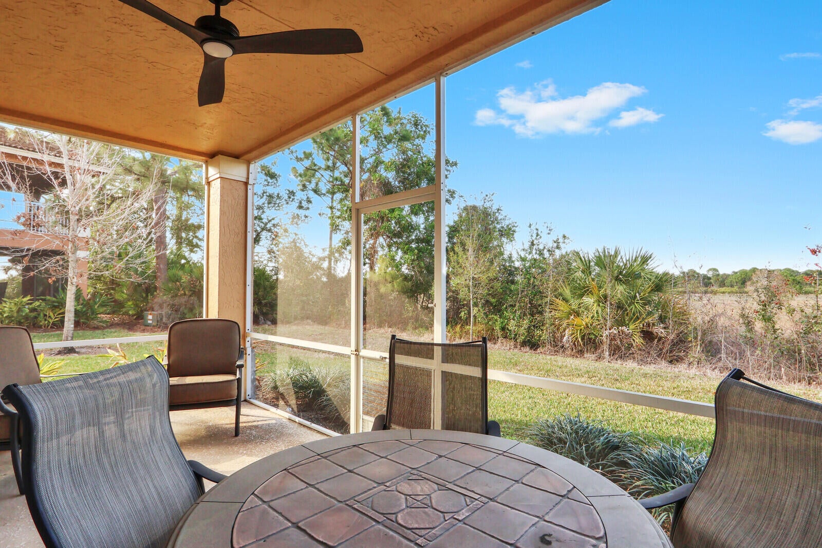 Whether you're seeking a smart investment, a vacation getaway or a versatile primary residence, this golf villa delivers unmatched adaptability in a beautiful, resort-style setting. This ground-floor corner unit offers privacy & serene preserve views backing to the Pete Dye golf course. HURRICANE IMPACT WINDOWS & DOORS provide peace of mind, while newer appliances, A/C & water heater ensure modern comfort & efficiency. Offered fully furnished, this 2 BR, 2.5 bath villa is tastefully decorated, meticulously cared for & truly move-in ready. Castle Pines residents enjoy their own resort-style pool & hot tub, adding to the stress-free, low-maintenance lifestyle this community is known for.Located in a true golfer's haven, PGA Village is home to three world-class PGA golf courses & the Legacya premier private club offering exceptional golf and tennis experiences. Discover the perfect blend of flexibility, comfort, and investment potential in this thoughtfully designed golf villa--truly two residences in one. The main unit offers a spacious and inviting layout, featuring a large primary bedroom retreat and 1.5 baths for added convenience. The full kitchen is ideal for preparing everything from casual breakfasts to elegant dinners, flowing seamlessly into the dining and living areas--perfect for entertaining after a day on the course. Generous natural light and open-concept living create a bright, welcoming atmosphere throughout. Adjoining the main residence is a fully self-sufficient efficiency suite that functions as a private unit of its own. Complete with a separate entrance, its own A/C system, a comfortable bed-sitting area, full bath, and convenient kitchenette, this space provides independence and privacy for guests or tenants. The unique double locking doors between the two units allow you to customize the layout to suit your needs. Keep them closed to rent both sides individually for maximum income potential. Live comfortably in one unit while generating revenue from the other. Or simply unlock the doors to create an expansive combined retreat--ideal for extended family, visiting friends, or multi-generational living. Homeownership also includes access to The Island Club, a vibrant community clubhouse featuring a resort-style pool, fitness center, pickleball, tennis, and a full calendar of social activities. Just outside the gates enjoy everything Florida Living at it's finest has to offer including The Met's Spring Training, dining, shopping, entertainment & everything you need for daily living. Florida's beautiful beaches are just a short car ride away. HOA FEES INCLUDE EXTERIOR MAINTENANCE OF THE BUILDING AND LANDSCAPPING, COMMON AREAS, GUARD GATE AND ROOVING SECURITY, INTERNET, CABLE, WATER, SEWER, POOL AND HOT TUB IN CASTLEPINES NEIGHBORHOOD AND USE OF THE ISLAND CLUB AND ALL IT'S AMENITIES! Whether you're looking to live where you play, escape the winter chill, or capitalize on a desirable rental opportunity, this exceptional property delivers the best of Florida living!