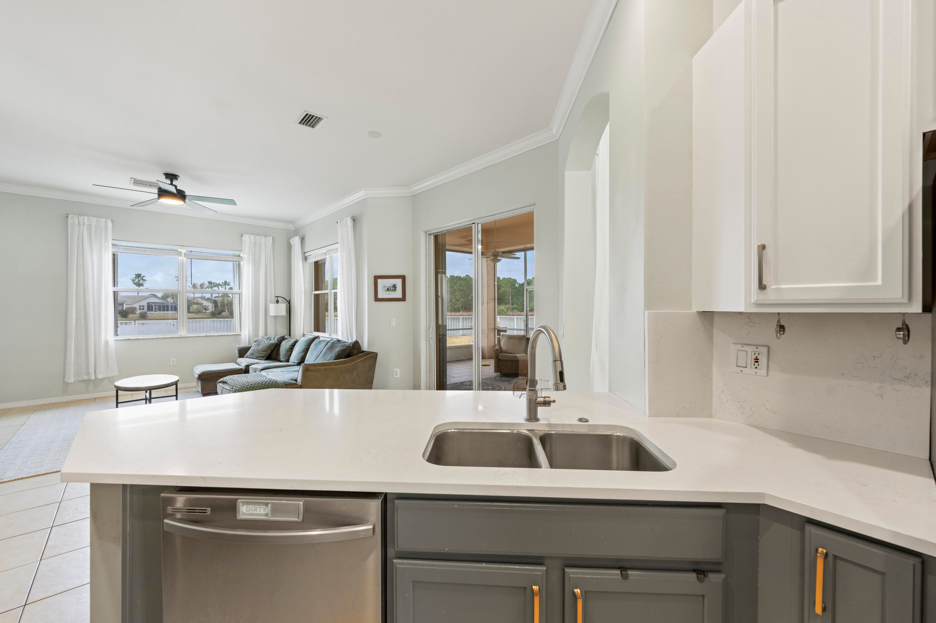 Stunning 3BR/2BA/2CG lakefront home with den in sought-after Lake Forest! Bright open floor plan with separate living & family rooms and welcoming foyer. Updated kitchen features quartz countertops, 42'' wood cabinets, stainless steel appliances & walk-in pantry. Crown molding throughout. Private den with French doors. Spacious primary suite with tray ceiling. Tile in main areas, laminate/newer carpet in bedrooms. Large laundry room with utility tub. Accordion shutters + whole-house generator. Enjoy serene lake views from screened lanai and fenced yard. Close to St. Lucie West dining, shopping & I-95.