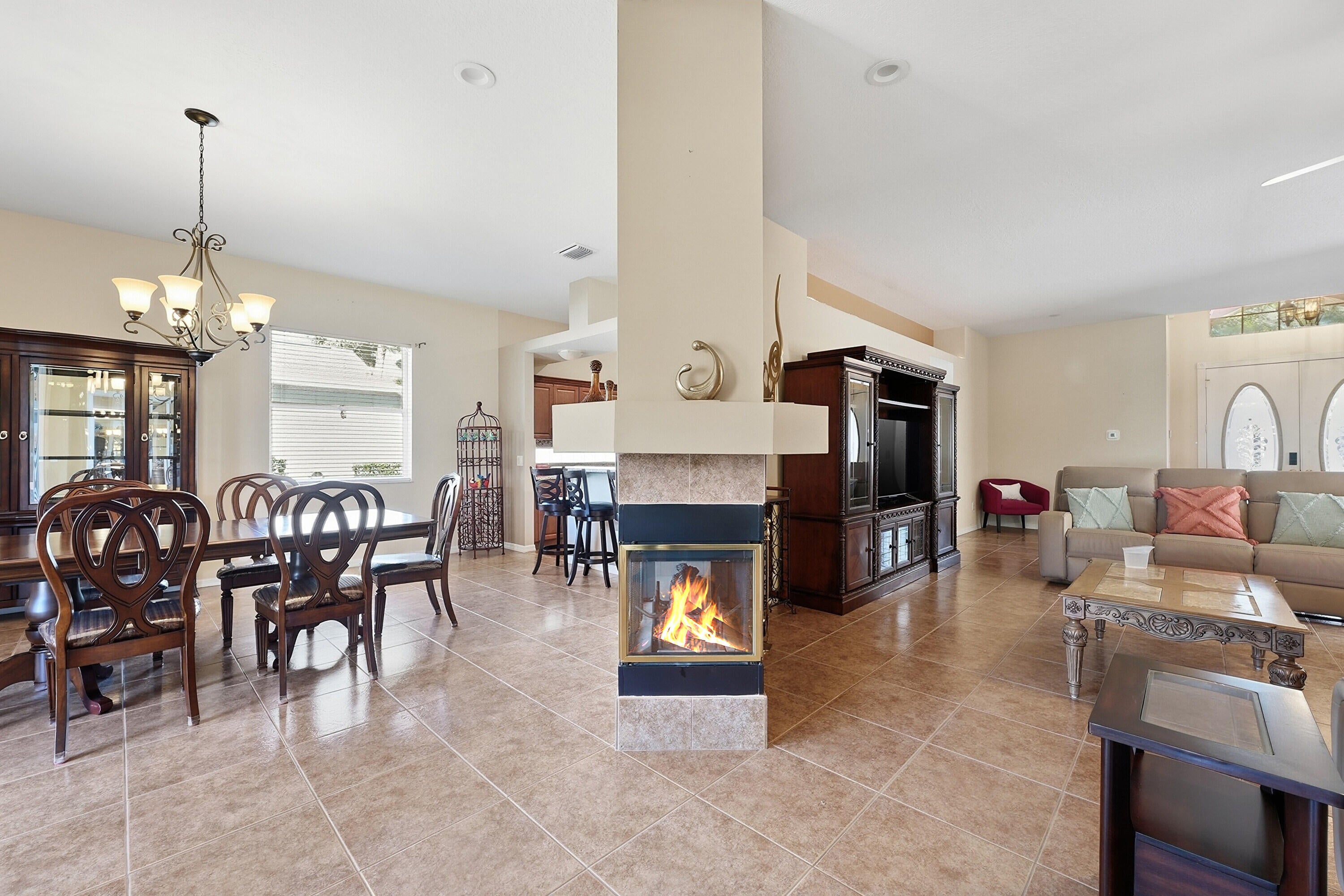 Welcoming double-door entry and open layoutBright kitchen, Stainless Steel appliances, and ample crown molding cabinetryLarge family room with double-sided fireplace shared with the dining area, leading to a spacious screened patio, perfect for relaxing or entertainingPrimary suite with dual-vanity bath, stand-up shower, and luxurious Roman tub under a large block glass window allowing natural light in while maintaining privacyGarage loaded with shelving and cabinets for abundant storage. GuttersThis home has been very lightly lived in and shows pride of ownership throughout. Move in and start enjoying the vibrant, active adult lifestyle Kings Isle residents love!